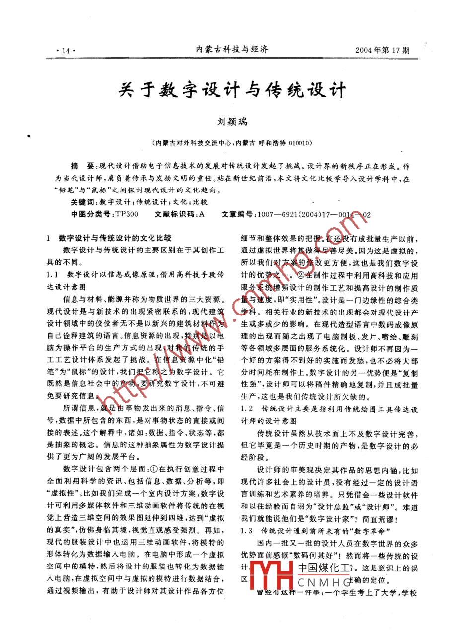 ●14●內(nèi)蒙古科技與經(jīng)濟(jì)2004年第17期.關(guān)于數(shù)字設(shè)計(jì)與傳統(tǒng)設(shè)計(jì)劉穎瑞(內(nèi)蒙古對外科技交流中心,內(nèi)蒙古呼和浩特010010)摘要:現(xiàn)代設(shè)計(jì)借助電子信息技術(shù)的發(fā)展對傳統(tǒng)設(shè)計(jì)發(fā)起了挑戰(zhàn)。 設(shè)計(jì)界的新秩序正在形成。作.為當(dāng)代設(shè)計(jì)師,肩負(fù)著傳承與發(fā)揚(yáng)文明的重任。站在新世紀(jì)前沿,本文將文化比較學(xué)導(dǎo)入設(shè)計(jì)學(xué)科中,在“鉛筆”與“鼠標(biāo)”之間探討現(xiàn)代設(shè)計(jì)的文化趨向。關(guān)鍵詞:數(shù)宇設(shè)計(jì);傳統(tǒng)設(shè)計(jì);文化;比較中圖分類號(hào):TP300文獻(xiàn)標(biāo)識(shí)碼:A文章編號(hào):1007- 6921 (2004)17- -0014- -021數(shù)字設(shè)計(jì) 與傳統(tǒng)設(shè)計(jì)的文化比較細(xì)節(jié)和整體效果的把握。在還沒有成批量生產(chǎn)以前,數(shù)字設(shè)計(jì)與傳統(tǒng)設(shè)計(jì)的主要區(qū)別在于其創(chuàng)作工通過虛擬世界將其做得盡善盡美。因?yàn)檫@是虛擬的,具的不同。所以我們對方案的修改更方便,這也是我們數(shù)字設(shè).1.1 數(shù)字設(shè)計(jì)以信息成像原理,借用高科技手段傳計(jì)的優(yōu)勢之一。②在制作過程中利用高科技和應(yīng)用達(dá)設(shè)計(jì)意圖服務(wù)系統(tǒng)增強(qiáng)設(shè)計(jì)的制作工藝和提高設(shè)計(jì)的制作質(zhì)信息與材料、能源并稱為物質(zhì)世界的三大資源。量與速度,即“實(shí)用性”。設(shè)計(jì)是一門邊緣性的綜合類現(xiàn)代設(shè)計(jì)是與新技術(shù)的出現(xiàn)緊密聯(lián)系的,現(xiàn)代建筑.學(xué)科。相關(guān)行業(yè)的新技術(shù)的出現(xiàn)都會(huì)對現(xiàn)代設(shè)計(jì)產(chǎn)設(shè)計(jì)領(lǐng)域中的佼佼者無不是以新興的建筑材料作為生或多或少的影響。在現(xiàn)代造型語言中數(shù)碼成像原自己詮釋建筑的語言。信息資源的出現(xiàn),特別是以電理的出現(xiàn)而隨之出現(xiàn)了電腦制板、發(fā)片、噴繪、雕刻腦為操作平臺(tái)的生產(chǎn)方式的出現(xiàn),對我們傳統(tǒng)的手等各領(lǐng)域多層面的服務(wù)系統(tǒng)化。設(shè)計(jì)師不再因?yàn)橐还すに囋O(shè)計(jì)體系發(fā)起了挑戰(zhàn)。在信息資源中化“鉛個(gè)好的方案得不到好的實(shí)施而發(fā)愁,也不必將大部筆”為“鼠標(biāo)”的設(shè)計(jì),我們把它稱之為數(shù)字設(shè)計(jì)。它分時(shí)間耗在制作上。數(shù)字設(shè)計(jì)的另一優(yōu)勢便是“復(fù)制既然是信息社會(huì)中的產(chǎn)物,要研究數(shù)字設(shè)計(jì),不可避性強(qiáng)”,設(shè)計(jì)師可以將稿件精確地復(fù)制,并且成批量免要研究信息。生產(chǎn),這也是我們傳統(tǒng)設(shè)計(jì)所欠缺的。所謂信息,就是由事物發(fā)出來的消息、指令、信1.2 傳統(tǒng)設(shè)計(jì)主要是指利用傳統(tǒng)繪圖工具傳達(dá)設(shè)號(hào),數(shù)據(jù)中所包含的東西,是對事物狀態(tài)的直接或間計(jì)師的設(shè)計(jì)意圖接的表述.這個(gè)解釋中,諸如:數(shù)據(jù)、指令、狀態(tài)等,都.傳統(tǒng)設(shè)計(jì)雖然從技術(shù)面上不及數(shù)字設(shè)計(jì)完善,是抽象的概念。信息的這種抽象屬性為數(shù)字設(shè)計(jì)提但它畢竟是一個(gè)歷史時(shí)期的產(chǎn)物,是數(shù)字設(shè)計(jì)的必供了更為廣闊的發(fā)展平臺(tái)。經(jīng)階段。數(shù)字設(shè)計(jì)包含兩個(gè)層面:①在執(zhí)行創(chuàng)意過程中設(shè)計(jì)師的審美觀決定其作品的思想內(nèi)涵,比如全面利用科學(xué)的資訊、包括信息、數(shù)據(jù)、分析等,即.現(xiàn)代許多社會(huì)上的設(shè)計(jì)員,沒有經(jīng)過一定的設(shè)計(jì)語“虛擬性”。比如我們完成一個(gè)室內(nèi)設(shè)計(jì)方案,數(shù)字設(shè)盲訓(xùn)練和藝術(shù)素養(yǎng)的培養(yǎng)。只憑借會(huì)-些設(shè)計(jì)軟件計(jì)可利用多媒體軟件和三維動(dòng)畫軟件將傳統(tǒng)的在視和以往經(jīng)驗(yàn)而自詡為“設(shè)計(jì)總監(jiān)”或“設(shè)計(jì)師”。難道覺上營造三維空間的效果圖延伸到四維,達(dá)到“虛擬我們就能說他們是“數(shù)字設(shè)計(jì)家”?簡直荒謬!的真實(shí)”,仿佛身臨其境,視覺直觀感受強(qiáng)烈。再如,1.3 傳統(tǒng)設(shè)計(jì)遭到前所未有的“數(shù)字革命”現(xiàn)代的服裝設(shè)計(jì)中也運(yùn)用三維動(dòng)畫軟件,將模特的國內(nèi)-批又-批的設(shè)計(jì)人員在數(shù)字世界的眾多形體轉(zhuǎn)化為數(shù)據(jù)輸人電腦。在電腦中形成- -個(gè)虛擬優(yōu)勢面前感慨“數(shù)碼何其好”!然而將一些傳統(tǒng)的設(shè)空間中的模特,然后將設(shè)計(jì)的服裝也轉(zhuǎn)化為數(shù)據(jù)輸中國煤化工。這是意識(shí)上的誤人電腦,在虛擬空間中與虛擬的模特進(jìn)行數(shù)據(jù)結(jié)合,CNMH C確的定位。通過視頻輸出,有助于設(shè)計(jì)師對其設(shè)計(jì)作品各方位曾經(jīng)有這樣一件事:一個(gè)學(xué)生考上了大學(xué),學(xué)校2004年第17期"劉穎瑞關(guān)于數(shù)字設(shè)計(jì)與傳統(tǒng)設(shè)計(jì)●15●分專業(yè)時(shí)將他分到了平面設(shè)計(jì)專業(yè),而他