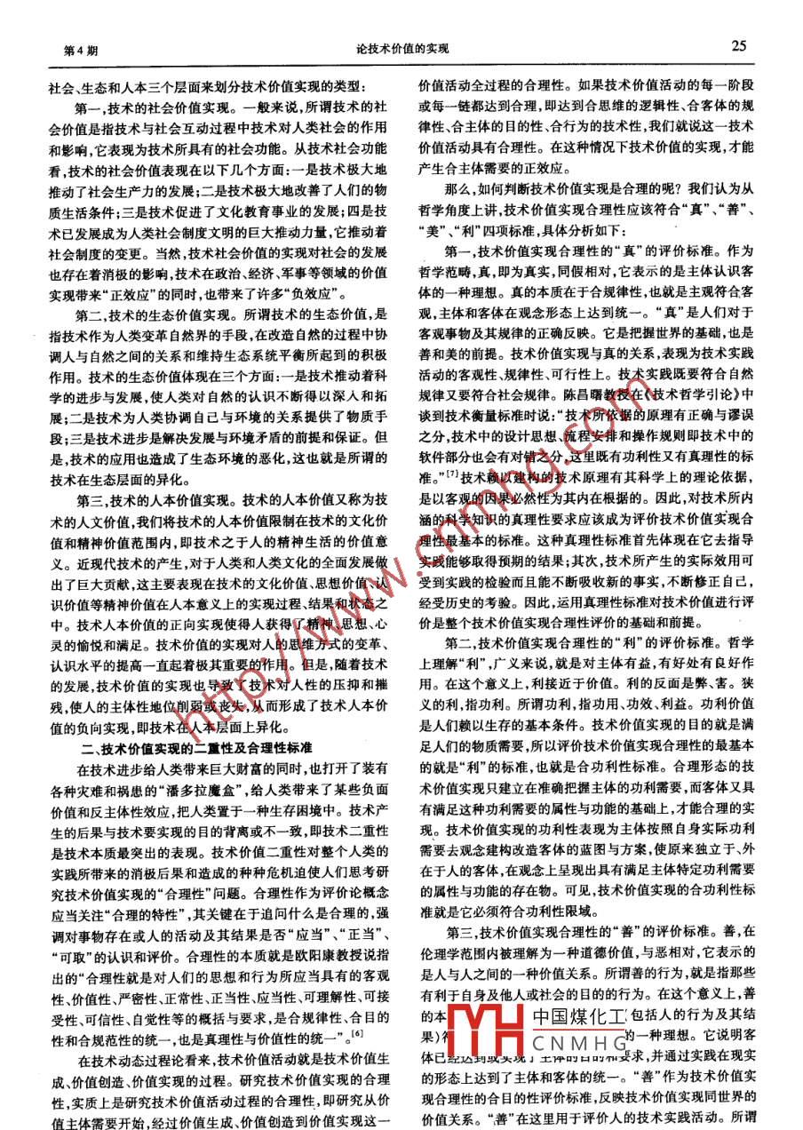 《齊齊哈爾大學(xué)學(xué)報》(哲學(xué)社會科學(xué)版)、2006年7月Jourmal of Qiqihar University( Phi& Soc Sci)July 2006論技術(shù)價值的實現(xiàn)王兵,王樹松,秦立新(齊齊哈爾大學(xué) 人文學(xué)院,黑龍江齊齊哈爾161006)[關(guān)鍵詞]技術(shù)價值;技術(shù)價值實現(xiàn);價值二重性;合理性[摘 要]技術(shù)負(fù)荷價值,技術(shù)價值實現(xiàn)具有二重性,因此討論技術(shù)價值實現(xiàn)的合理性越來越受到普遍的關(guān)注,文章旨在從哲學(xué)層面討論技術(shù)價值實現(xiàn)合理性的標(biāo)準(zhǔn)和途徑。[中圖分類號]NO2[文獻(xiàn)標(biāo)識碼]A [ 文章編號] 1008 - 2638(2006)04 -0024 -03Ideas on the Realization of Technical ValueWANG Bing, WANG Shu - song, QN Li -xin(School of Humanities, Qiqihar University ,Qiqihar 161006 ,China)Key words: technical value; the realization of technical value ; tworess of value duality ;rationalityAbstract:Technology is loadde with value and the realization of technical value have. duality. they are :one side is benificial forhuman being while the otber is harmful paid to rationality of the realization of technical value. This essay analyzes the standards for andapproaches to rationality of the realization of technical value in a philosophical perspective.自人類社會進(jìn)入工業(yè)時代以來,技術(shù)神話般的一再證明和手段的統(tǒng)- -。[”本文就是在這個技術(shù)動態(tài)過程論的基礎(chǔ)上其強(qiáng)大社會作用。然而,當(dāng)人們對技術(shù)項禮膜拜時,卻發(fā)現(xiàn)探討技術(shù)價值實現(xiàn)的。它已變成了支配人的怪物,給人類帶來了意想不到的災(zāi)難。那么什么是價值、什么是技術(shù)價值呢?這里,我們同意這就使人們不得不關(guān)注技術(shù)價值實現(xiàn)的問題,因此,對技術(shù)李德順教授在其《價值論》中關(guān)于“價值"的定義:“在主客體價值實現(xiàn)及其合理性問題的研究具有重要理論和現(xiàn)實意義。相互關(guān)系中,客體是否按照主體的尺度滿足主體需要,是否一、技術(shù)價值實現(xiàn)的實質(zhì)及形式對主體的發(fā)展具有肯定的作用,這種作用或關(guān)系的表現(xiàn)就成探討技術(shù)價值實現(xiàn)的問題,離不開對“技術(shù)"和“價值"為價值”[4)。按照這個定義,客體使主體需要得到滿足,對概念的理解和把握。關(guān)于技術(shù)的定義很多,很難說哪- -個技主體的發(fā)展具有肯定作用,就是正價值;反之,就是負(fù)價值。術(shù)定義涵蓋了所有的技術(shù)意義而獲得一致的公認(rèn)。 古希臘價值不是客體本身,也不是客體屬性,而是-一個關(guān)系范疇,是哲學(xué)家亞里士多德首先將科學(xué)與技術(shù)加以區(qū)別,“他認(rèn)為科客體與主體間相互作用的表現(xiàn)。正像馬克思所說:“一物的學(xué)是知識,而把技術(shù)和人們的實際活動聯(lián)系起來,定義技術(shù)屬性不是由該物的關(guān)系產(chǎn)生,而只是在這種關(guān)系中表現(xiàn)出為人類活動的技能(kill)。這個定義在古希臘很有代表來"[S??腕w的價值只能表現(xiàn)在與主體的關(guān)系中,并由主體性”川。而在現(xiàn)代有代表性的技術(shù)定義是:技術(shù)是“人類為的需要具體確定。而技術(shù)價值,就是技術(shù)與主體之間的一種了滿足社會需要而依靠自然規(guī)律和自然界的物質(zhì)、能量和信關(guān)系,它表達(dá)著技術(shù)對人的需要、發(fā)展的肯定或否定的性質(zhì)、息,來創(chuàng)造、控制、應(yīng)用和改進(jìn)人工自然系統(tǒng)的手段和方程度,并在技術(shù)與人的相互作用過程中不斷展現(xiàn)開來。技術(shù)法”[2]。從本質(zhì)上說,技術(shù)是- -種勞動的形態(tài),是人類自身價值不同于技術(shù)的某方面特殊價值(如技術(shù)的經(jīng)濟(jì)價值、技功能的對象化的產(chǎn)物,是人類的基本實踐活動。遠(yuǎn)德玉、陳術(shù)的政治價值) ,而是技術(shù)對于主體整體的一般價值。昌曙教授提出的技術(shù)動態(tài)過程論對于我們理解技術(shù)是具有通過以上分析,我們可得出所謂技術(shù)價值實現(xiàn)是指在一啟發(fā)性的,這個技術(shù)動態(tài)過程論包括四方面的含義:一是指定的社會現(xiàn)實條件下或社會建制下,技術(shù)內(nèi)在價值轉(zhuǎn)變?yōu)榧技夹g(shù)發(fā)明、設(shè)計本身就是一一個從無形技術(shù)向有形技術(shù)轉(zhuǎn)化、術(shù)現(xiàn)實價值的過程,當(dāng)然也是由潛在價值到內(nèi)在價值到現(xiàn)實從潛在技術(shù)向現(xiàn)實技術(shù)轉(zhuǎn)化的過程。二是技術(shù)軟件和技術(shù)價值的過程。技術(shù)的現(xiàn)實價值是相對于技術(shù)的潛在價值和硬件只有在動態(tài)過程中才能結(jié)合起來。三是現(xiàn)實技術(shù)的發(fā)內(nèi)在七中國煤化工技術(shù)價值實現(xiàn)的結(jié)果。展是知識、能力、物質(zhì)手段更新的過程。四是技術(shù)還是目的對于的分法,在這里我們從TYHCNMHG[收稿日期]2006-04 -01[作者簡介]王兵(1979-),男,齊齊哈爾大學(xué)人文學(xué)院碩士研究生,主要從事技術(shù)哲學(xué)研究。[基金項目]黑龍江省教育廳2005年度社會科學(xué)研究項目(10554191)。26齊齊哈爾大學(xué)學(xué)報(哲學(xué)社會科學(xué)版)規(guī)范,一般說來是指約定俗成或明文規(guī)定的標(biāo)準(zhǔn)或準(zhǔn)則。這何應(yīng)用科學(xué)技術(shù),取決于人的發