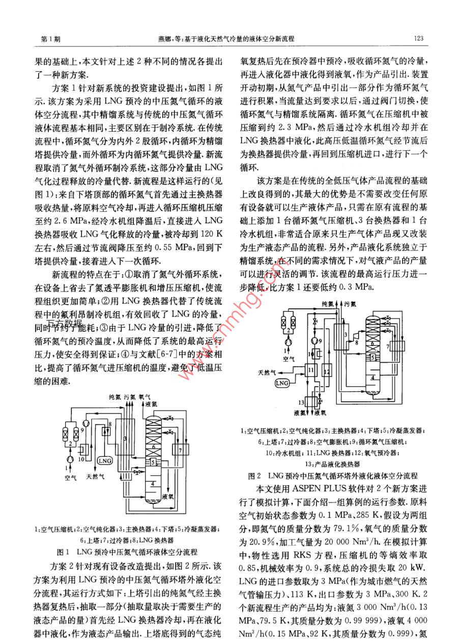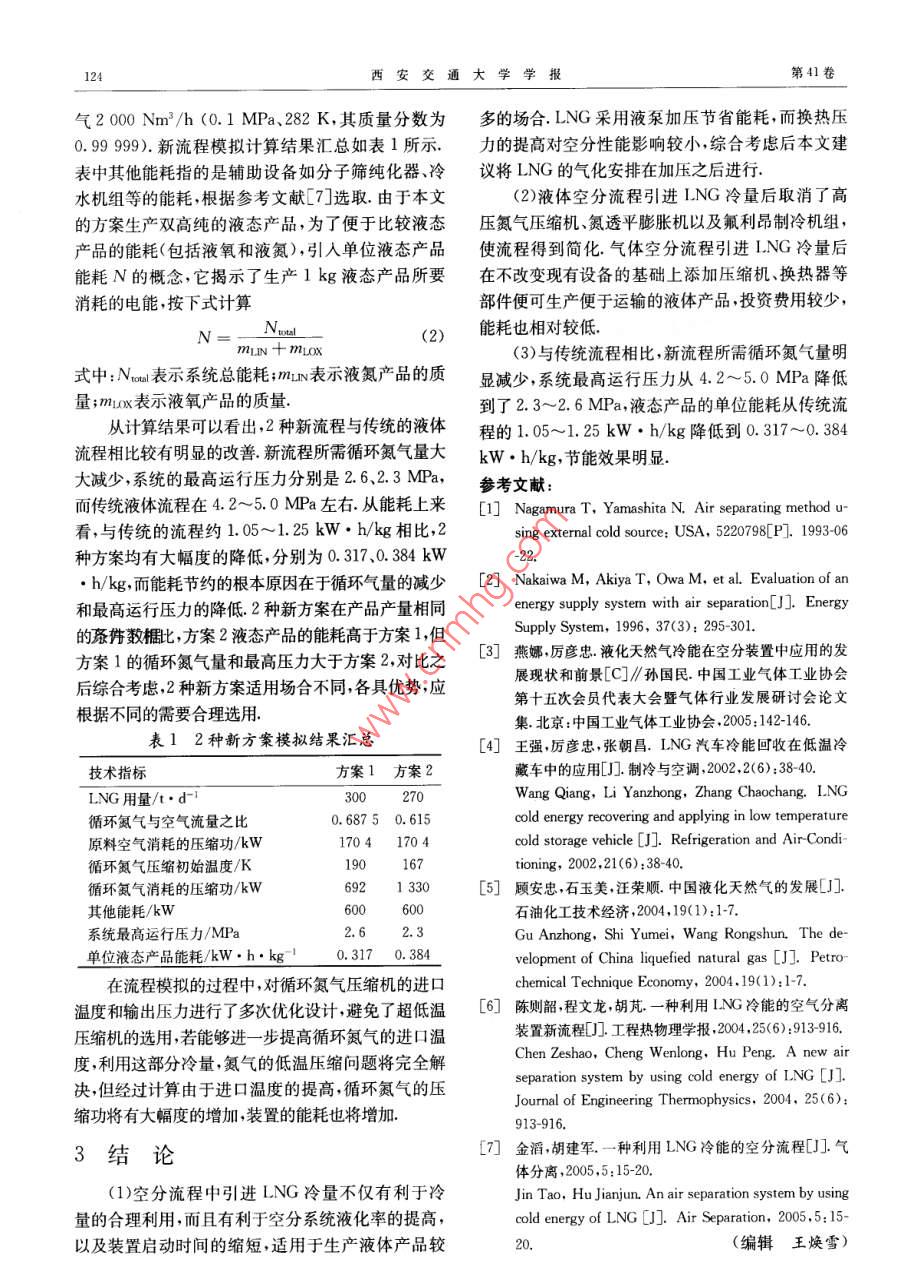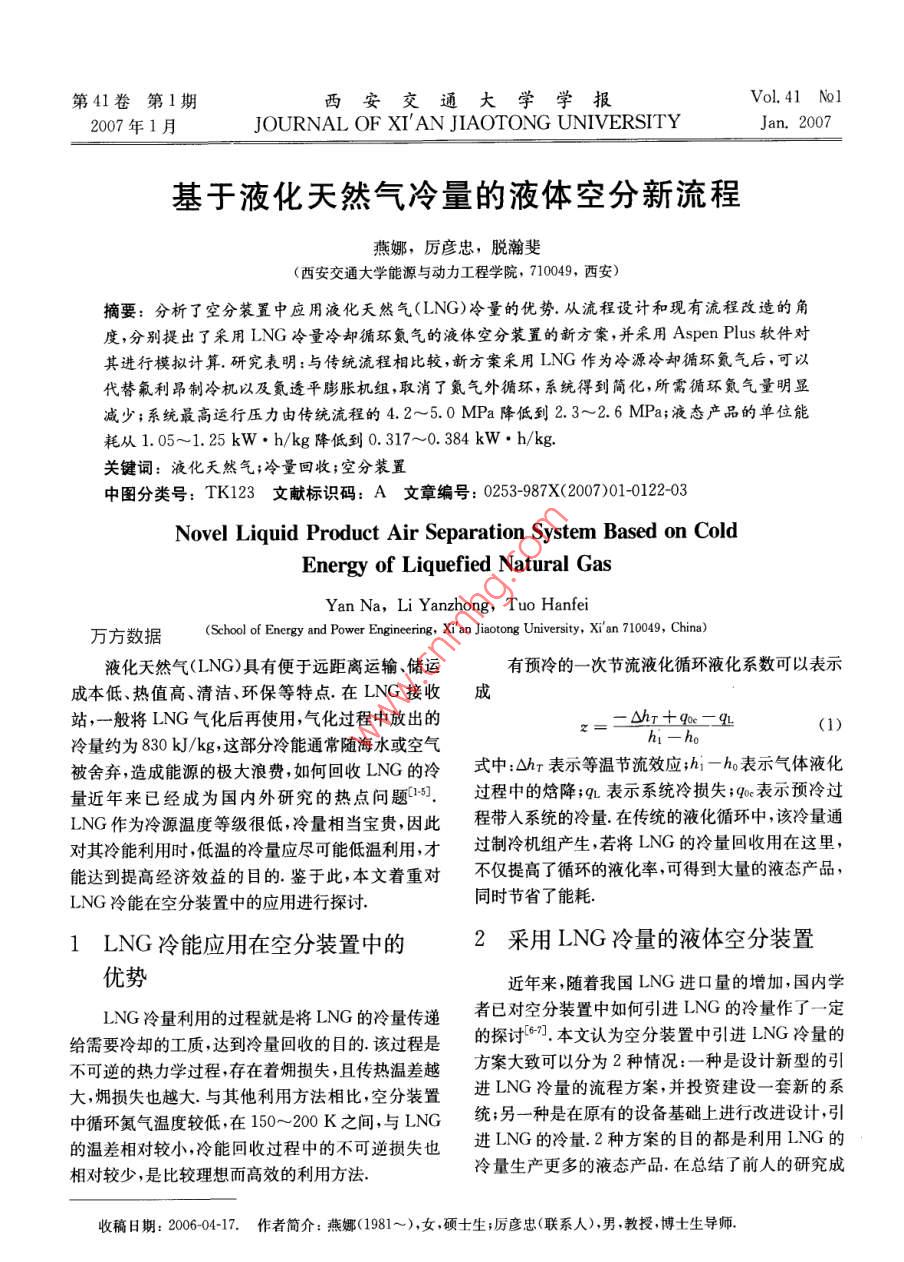第41卷第1期西安交通大學學報Vol 41 Nol2007年1月JOURNAL OF XI'AN JIAOTONG UNIVERSITYJan.2007基于液化天然氣冷量的液體空分新流程燕娜,厲彥忠,脫瀚斐(西安交通大學能源與動力工程學院,710049,西安)摘要:分析了空分裝置中應(yīng)用液化天然氣(LNG)冷量的優(yōu)勢.從流程設(shè)計和現(xiàn)有流程改造的角度,分別提出了采用LNG冷量冷卻循環(huán)氮氣的液體空分裝置的新方案,并采用 Aspen Plus軟件對其進行模擬計算.研究表明:與傳統(tǒng)流程相比較,新方案采用LNG作為冷源冷卻循環(huán)氪氣后,可以代替氟利昂制冷機以及氦透平膨脹機組,取消了氮氣外循環(huán),系統(tǒng)得到簡化,所需循環(huán)氮氣量明顯減少;系統(tǒng)最高運行壓力由傳統(tǒng)流程的42~5.0MPa降低到2.3~2.6MPa;液態(tài)產(chǎn)品的單位能耗從1.05~1.25kW·h/kg降低到0.317~0.384kW·h/kg關(guān)鍵詞:液化天然氣;冷量回收;空分裝置中圖分類號:TK123文獻標識碼:A文章編號:0253-987X(2007)01-012203Novel Liquid Product Air Separation System Based on ColdEnergy of Liquefied Natural GasYan Na, Li Yanzhong, Tuo hanfe(School of Energy and Power Engineering, Xi'an Jiaotong University, Xi' an 710049, China)液化天然氣(LNG)具有便于遠距離運輸儲運有預(yù)冷的一次節(jié)流液化循環(huán)液化系數(shù)可以表示成本低、熱值高、清潔、環(huán)保等特點在LNG接收成站,一般將LNG氣化后再使用,氣化過程中放出的-WhT+qoe-qL(1)冷量約為830kJ/kg,這部分冷能通常隨海水或空氣被舍棄,造成能源的極大浪費如何回收LNG的冷式中:△hr表示等溫節(jié)流效應(yīng);hi-h表示氣體液化量近年來已經(jīng)成為國內(nèi)外研究的熱點問題1.過程中的焓降;q表示系統(tǒng)冷損失;qe表示預(yù)冷過LNG作為冷源溫度等級很低,冷量相當寶貴,因此程帶入系統(tǒng)的冷量在傳統(tǒng)的液化循環(huán)中,該冷量通對其冷能利用時低溫的冷量應(yīng)盡可能低溫利用,才過制冷機組產(chǎn)生,若將LNG的冷量回收用在這里,能達到提高經(jīng)濟效益的目的鑒于此,本文著重對不僅提高了循環(huán)的液化率,可得到大量的液態(tài)產(chǎn)品LNG冷能在空分裝置中的應(yīng)用進行探討同時節(jié)省了能耗.1LNG冷能應(yīng)用在空分裝置中的2采LNG冷量的液體空分裝置優(yōu)勢近年來,隨著我國LNG進口量的增加,國內(nèi)學LNG冷量利用的過程就是將LNG的冷量傳遞者已對空分裝置中如何引進LNG的冷量作了一定給需要冷卻的工質(zhì),達到冷量回收的目的該過程是的探討.本文認為空分裝置中引進LNG冷量的不可逆的熱力學過程存在著煙損失,且傳熱溫差越方案大致可以分為2種情況:一種是設(shè)計新型的引大,傭損失也越大與其他利用方法相比,空分裝置進LNG冷量的流程方案并投資建設(shè)一套新的系中循環(huán)氮氣溫度較低在150~200K之間與LNG統(tǒng);另一種是在原有的設(shè)備基礎(chǔ)上進行改進設(shè)計,引的溫差相對較小,冷能回收過程中的不可逆損失也進LNG的冷量.2種方案的目的都是利用LNG的相對較少,是比較理想而高效的利用方法冷量生產(chǎn)更多的液態(tài)產(chǎn)品在總結(jié)了前人的研究成收稿日期:200604-17.作者簡介:燕娜(1981~),女,碩士生;厲彥忠(聯(lián)系人),男教授,博士生導(dǎo)師第1期燕娜等:基于液化天然氣冷量的液體空分新流程果的基礎(chǔ)上,本文針對上述2種不同的情況各提出氧復(fù)熱后先在預(yù)冷器中預(yù)冷,吸收循環(huán)氮氣的冷量,了一種新方案再進入液化器中液化得到液氧,作為產(chǎn)品引出,裝置方案1針對新系統(tǒng)的投資建設(shè)提出,如圖1所開動初期,從氮氣產(chǎn)品中引出一部分作為循環(huán)氮氣示.該方案為采用LNG預(yù)冷的中壓氮氣循環(huán)的液進行積累,當流量達到要求以后,通過閥門切換,使體空分流程,其中精餾系統(tǒng)與傳統(tǒng)的中壓氮氣循環(huán)循環(huán)氮氣與精餾系統(tǒng)隔離.循環(huán)氮氣在壓縮機中被液體流程基本相同,主要區(qū)別在于制冷系統(tǒng)在傳統(tǒng)壓縮到約23MPa,然后通過冷水機組冷卻并在流程中,循環(huán)氮氣分為內(nèi)外2股循環(huán)內(nèi)循環(huán)為精餾LNG換熱器中液化,此高壓低溫循環(huán)氮氣經(jīng)節(jié)流后塔提供冷量,而外循環(huán)為內(nèi)循環(huán)氮氣提供冷量新流換熱器提供冷量,再回到壓縮機進口,進行下一個程取消了氮氣外循環(huán)制冷系統(tǒng),這部分冷量由LNG循環(huán)氣化過程釋放的冷量代替新流程是這樣運行的(見該方案是在傳統(tǒng)的全低壓氣體產(chǎn)品流程的基礎(chǔ)圖1):來自下塔頂部的循環(huán)氮氣首先通過主換熱器上改良得到的其最大的優(yōu)勢是不需要改變?nèi)魏卧諢崃繉⒃峡諝饫鋮s,再進入循環(huán)壓縮機壓縮有設(shè)備就可以生產(chǎn)液體產(chǎn)品,只需在原有流程的基至約26MPa,經(jīng)冷水機組降溫后,直接進入LNG礎(chǔ)上添加1臺循環(huán)氮氣壓縮機、3臺換熱器和1臺換熱器吸收LNG氣化釋放的冷量被冷卻到120K冷水機組非常適合原來只生產(chǎn)氣體產(chǎn)品現(xiàn)又改裝左右,然后通過節(jié)流閥降壓至約0.55MPa回到下為生產(chǎn)液態(tài)產(chǎn)品的流程.另外,產(chǎn)品液化系統(tǒng)獨立于塔提供冷量,接著進入下一次循環(huán)精餾系統(tǒng),在不同的需求情況下,對氣液產(chǎn)品的產(chǎn)量新流程的特點在于:①取消了氮氣外循環(huán)系統(tǒng),可以進行靈活的