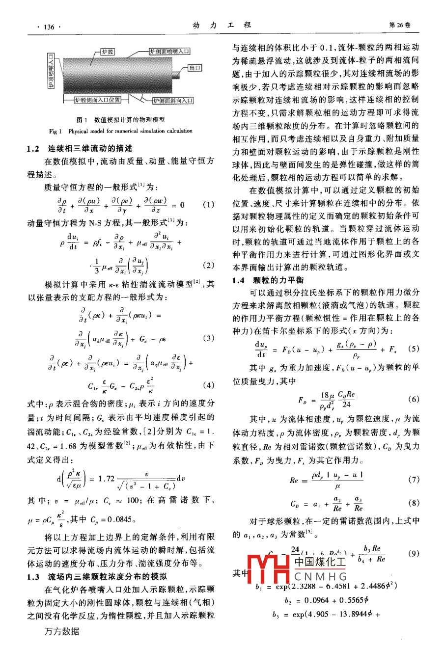 第26卷第1期動力工程206年2月of power eFeb.2006文章編號:10006761(2006)01-135-06噴嘴位置對新型水煤漿氣化爐內流場的影響于海龍,劉建忠2,張桂芳,岑可法2(1.中原工學院能源與環(huán)境學院,鄭州4500072浙江大學能源潔凈利用與環(huán)境工程國家重點實驗室,杭州310027)摘要:為了考察氣化爐爐側噴嘴入射角對爐內流場分布、壓力分布和顆粒濃度分布的影響,對種600kgh的新型水煤漿氣化爐爐內三維流場進行了冷態(tài)數值模擬。結果表明,噴嘴距氣化爐頂部0.9m時,氣化爐爐內流場分布最合理,壓力分布和顆粒濃度分布最均勻。分析結果為氣化爐的設計和運行提供了參考。圖6表1參5關鍵詞:工程熱物理;氣化爐;水渫漿;三維流場;數值模擬中圖分類號:TQ5344文獻標識碼:AEffect of NozZles Position on the flow Field in aNew Type Coal Water Slurry GasifierYU Hai-long, LIU Jian-zhong, ZHANG Gui-fang, CEN Ke- fa2(1. School of Energy Environment, Zhongyuan University, Zhengzhou 450007, China;2. National Key Lab. of Clean Energy and Environment Engineering, Zhejiang University, Hangzhou 310027, China)Abstract: For the purpose of clarifying the effect of injection angles of gasifier fumaces side nozzles on the flow fieldoressure distribution and particle concentration, a cold state numerical simulation study of the 3-dimensional flow field ina 600 kg/h new type coal water slurry gasified has been conducted. Results show that, with the nozzles positioned.9melow the furnaces top, the flow field distribution gets most rational, pressure and particle concentration distribution alsomost uniform. The analysis results may serve as a reference for designing and operation of gasifiers. Figs 6, Table 1 andrefs 5Keywords: engineering thermophysics; gasifier; coal water slurry 3-D flow field; numerical simulation鑒于水煤漿氣化爐內湍流流場和顆粒濃度分布的復雜性,也為了更加直觀地描述和了解氣化爐內1數值模擬的控制流場分布和顆粒濃度分布狀態(tài),分析并借鑒前人的1.1物理模型的描述研究成果”,對新型水煤漿氣化爐進行了冷模數本章進行數值模擬的物理模型為600kg/h的新值模擬計算,以期獲得噴嘴位置對爐內流場和顆粒型水煤漿氣化爐爐內三維空間。氣化爐內徑為0.5濃度分布的影響規(guī)律,為水煤漿氣化爐的開發(fā)和設m,凈高15m,高徑比為3(圖1)計找到了更加便捷和有效的方法此模型對實際氣化爐進行了適當的簡化處理收稿日期:20050905將氣中國煤化工員角部分去掉,而將CNMHG簡化了模型網格劃基金項目:國家重點基礎研充發(fā)展計劃資助(2004c21701)分的麻煩和限制,而對實際數值模擬又不致產生較作者簡介:于海龍(1975-),男,吉林人,博上,副教授。主要從事水煤漿氣化爐、CFB鍋爐燃燒和污染物排放控制研究大的影響。物理模型決定以后,利用四面體和六面體對此模型進行了混合網格劃分136動力工程卷側面噴嘴入口與連續(xù)相的體積比小于0.1,流體顆粒的兩相運動為稀疏懸浮流動,這就涉及到流體粒子的兩相流問畫題,由于加入的示蹤顆粒很少,其對連續(xù)相流場的影響極少,若只考慮連續(xù)相對示蹤顆粒的影響而忽略側面入口位置爐血斜阿入口示蹤顆粒對連續(xù)相流場的影響,這樣連續(xù)相的控制方程不變,只需求解顆粒相的運動方程即可求得流圖1數值模擬計算的物理模型Fig 1 Physical model for numerical simulation calculation場內三維顆粒濃度的分布。在計算時忽略顆粒間的相互作用,而只考慮連續(xù)相以及自身重力、附加質量1.2連續(xù)相三維流動的描述力和壁面對顆粒運動的影響,出于示蹤顆粒是剛性在數值模擬中,流動由質量、動量、能量守恒方球體,因此與壁面間發(fā)生的是彈性碰撞,做這樣的簡程描述化處理后,顆粒相的運動方程可以簡單的求解。質量守恒方程的一般形式山為在數值模擬計算中,可以通過定義顆粒的初始3+(p)+3(pm)+(p)=0(1)位置速度、尺寸來計算顆粒在連續(xù)相中的分布。依據對顆粒物理屬性的定義而確定的顆粒初始條件可動量守恒方程為NS方程,其一般形式山為:以用來初始化顆粒的軌道。當顆粒穿過流體運動d3p+μ時,顆粒的軌道可通過當地流體作用于顆粒上的各種平衡作用力來進行計算,可通過圖形化界面或文本界面輸出計算出的顆粒軌道模擬計算中采用ke粘性湍流流動模型,其1.4顆粒的力平衡以張量表示的支配方程的一般形式為:可以通過積分拉氏坐標系下的顆粒作用力微分a方程來求解離散相顆粒(液滴或氣泡)的軌道。顆粒的作用力平衡方程(顆粒慣性=作用在顆粒上的各Dx, aa/lef axG(3)種力)在笛卡爾坐標系下的形式(x方向)為:Fo(其中g.為重力加速度,Fn(u-un)為顆粒的單CI -G -C2(4)位質量曳力,其中式中:p表示混合物的密度;表示i方向的速度分Fo=i8A CoRe量;t為時間間隔;G。表示由平均速度梯度引起的其中,u為流體相速度,ur為顆粒速度,為流湍流動能;Cn、C2為經驗常數,[2】分別為Cn=1.體動力粘度,p為流體密度,P為顆粒密度,d為顆42、C2=1.68為模型常數2;pm為有效粘性,由下粒直徑,Re為相對雷諾數(顆粒雷諾數),C為曳力式定義得出:系數,F為曳力,F,為其它作用力。P1.72duυ3-1+Cn)其中;υ=μnm/;C.≈100;在高雷諾數下,D=a1+8pC.,其中C2=0.0845對于球形顆粒,在一定的雷諾數范圍內,上式中將以上方程加上邊界上的定解條件,利用有限的a1,a2,a3為常數元方法可以求得流場內流體運動的瞬時解,包括流體運動的速度分布、壓力分布湍流強度分布等。中國煤化工1.3流場內三維顆粒濃度分布的模擬其中CNMHG在氣化爐各噴嘴入口處