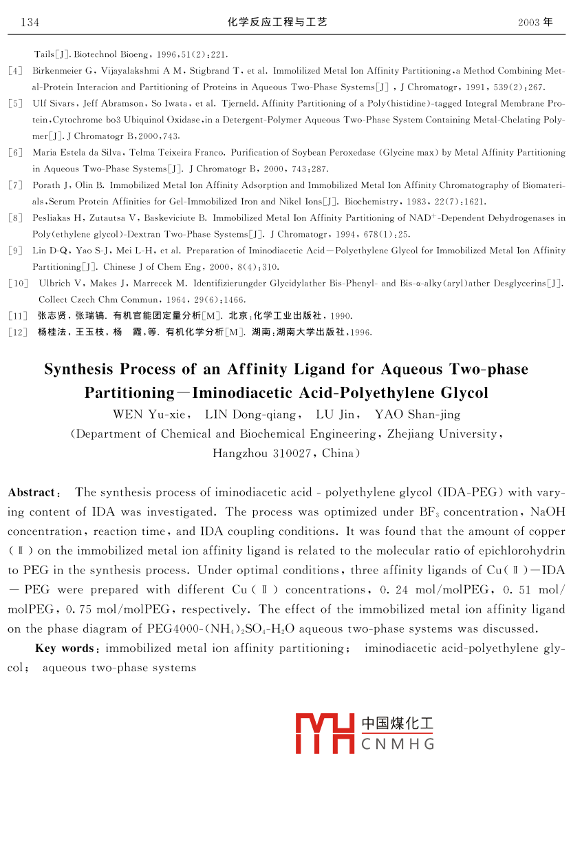 第19卷第2期化學(xué)反應(yīng)工程與工藝Vol 19, No 22003年6月Chemical Reaction Engineering and TechnologyJun,2003文章編號: 1001 - 7631(2003)02 - 0129 - 06一種雙水相親和分配配基的制備過程優(yōu)化亞氨基二乙酸一聚乙二醇文禹擷,林東強,陸瑾,姚善涇(浙江大學(xué)化學(xué)工程與生物工程系,浙江杭州310027)摘要:考察了不同亞氨基二乙酸(IDA)取代度的亞氨基二乙酸一聚乙=醇(IDA- PEG)的制備,并進行了條件優(yōu)化(BFs濃度,NaOH濃度.反應(yīng)時間,IDA結(jié)合條件等)。通過控制環(huán)氧氯丙烷與聚乙二醇的摩爾配比,得到了不同Cu( I )含量的固定化金屬親和配基:Cu(I )- IDA- PEG(A)(0. 24 molCu2+ /molPEG).Cu( 1 )-IDA- PEG (B)(0. 51 molCu2+ /molPEG) .Cu( I )- IDA- PEG(C) (0. 75molCu2+ /molPEG),并初步探討了固定化金屬親和配基的添加對PEG4000-(NH4)2SO,-H2O雙水相系統(tǒng)相圖的影響。關(guān)鍵詞:固定化金屬親和分配,亞氨基二乙酸- 聚乙二醇;雙水相系統(tǒng)中圖分類號: Q819.文獻標(biāo)識碼: A1前言固定化金屬離子親和層析(immobilized metal ion affinity chromatography,IMAC)是-種高效分離蛋白質(zhì)的方法1.2] ,利用過渡金屬離子對蛋白質(zhì)表面的富電子氨基酸殘基(如組氨酸、色氨酸、半胱氨酸等)的特異性相互作用可以達到親和分離的目的[3]。把金屬離子親和作用引入雙水相系統(tǒng),利用結(jié)合在成相聚合物上的金屬親和配基,可大大提高雙水相分配的選擇性。Birkenmeier 等[4利用PEG衍生物結(jié)合不同金屬離子,分離a2-巨球蛋白、過氧化物歧化酶和單克隆抗體等,結(jié)果表面固定化金屬離子親和分配對于分離蛋白質(zhì)很有潛力。Sivars 等5I利用含有金屬螯合聚合物(如Cu( I )-IDA-PEG和Cu(I)-IDA-葡聚糖)的表面活性劑/聚合物雙水相體系分離純化了輔酶Q、細胞色素,結(jié)果表明金屬親和分配可以有選擇性地分配含有聚組氨酸末端的膜蛋白,其分配系數(shù)從0.015增加到4.8。Maria等間利用金屬親和分配純化了粗大豆過氧化物酶,分配系數(shù)為24,酶收率達到64%。亞氨基二乙酸(IDA)是較強的金屬離子螯合劑,亞氨基二乙酸-聚乙=醇(IDA- PEG)則是雙水相分配中常見的固定金屬離子親和配基。通常,PEG上結(jié)合IDA需經(jīng)歷三步合成反應(yīng)5:(1)在氮氣環(huán)境中利用單甲氧基- PEG(M - PEG)與二氯亞砜反應(yīng)得到CI-M- PEG;(2)中間產(chǎn)物Cl一M- PEG與氨水反應(yīng)生成NH,- M一PEG;(3)NH2-M- PEG在堿性環(huán)境中與溴乙酸反應(yīng)生成IDA-PEG;該合成方法步驟繁雜,得率較低。借鑒Porat中國煤化工epharose.上結(jié)合IDA的方法,Pesliakas等[8報道了在水溶性聚合物上螯合YHCN MH GG與等量的環(huán)氧氯丙烷反應(yīng)生環(huán)氧活化PEG,然后與IDA反應(yīng)生成IDA- PEG。Lin等9對此合成條件進行了優(yōu)化,得到了收稿日期:2002- -07 - 12;修訂日期:2002 -01-18.作者簡介:文禹擷(1978-),男,碩士研究生;姚善涇(1957-),男,教授,博士生導(dǎo)師,通訊聯(lián)系人。基金項目:國家自然科學(xué)基金資助項目(編號:20076042)130化學(xué)反應(yīng)工程與工藝2003年Cu( I )含量為0.5 molCu2+ /molPEG的Cu( I )-IDA- PEG。本工作沿用Lin等[9]的合成路線,對IDA- PEG制備方法進行系統(tǒng)優(yōu)化,主要對催化劑BF3濃度、NaOH用量、反應(yīng)時間、反應(yīng)物初始配比、IDA結(jié)合條件等各種因素進行考察,以期得到不同Cu2+含量金屬離子親和配基,并對PEG4000- (NH)2SO,-H2O雙水相系統(tǒng)中添加Cu( I )-IDA- PEG時的相圖變化進行探討。2材料與方法2.1材料聚乙二醇(PEG ,浙江巨化集團生產(chǎn)),平均分子量為4000(3500- 4500) ;亞氨基二乙酸(IDA,中國醫(yī)藥集團上海化學(xué)試劑公司);環(huán)氧氯丙烷(中國化學(xué)試劑站中心化工廠);硫酸銨、氫氧化鈉、甲醛、乙醚等其它試劑均為市購分析純。2.2實驗部分2.2.1 Cu( I )- IDA-PEG的合成(1)PEG環(huán)氧活化采用 類似縮水甘油醚合成方法[10]。反應(yīng)包括2步:(a)無水酸性環(huán)境中,三氟化硼-乙醚催化環(huán)氧氯丙烷的環(huán)氧鍵開環(huán),與PEG上羥基反應(yīng)制得氯代PEG;(b)氯代PEG在氫氧化鈉作用下脫氯化氫生成環(huán)氧活化PEG。通過無水乙醚沉淀獲得環(huán)氧- PEG,得率一般為85%。(2)IDA的結(jié)合取 2mol/L的Na2CO3溶液,加入20倍于環(huán)氧- PEG摩爾數(shù)的亞氨基二乙酸溶解后,往其內(nèi)加入環(huán)氧-PEG。在65C下攪拌反應(yīng)24h,冷卻后,加入氯仿萃取2次,合并氯仿相加入無水Na2SO,脫水后,利用旋轉(zhuǎn)蒸發(fā)器蒸干氯仿,在4C下無水乙醚沉淀獲得IDA- PEG。該合成過程得率為80%。(3)金屬離子的螯合取 20g CuSO。●5H2O溶于125mL 50mmol/L的乙酸鈉溶液(pH4.0),加.入25g IDA-PEG。室溫下攪拌1h后,用氯仿萃取2次,合并氯仿相,蒸干氯仿,4C下無水乙醚沉淀,烘干獲得21g Cu( I )-IDA- PEG。2.2.2 雙水相相圖測定稱取不同量的Cu( I )-IDA- PEG配基、PEG4000母液(40%w)、(NH)2SO,母液(40%w)和水于刻度離心管中,加蓋,上下倒置50次,充分混合后,離心(5000r/min)5min,20C水浴靜置24h,待相界面穩(wěn)定后,讀出上下相體積數(shù),分別移取上下相溶液分析(NH4)2SO,和PEG的濃度。2.2.3檢測方法環(huán)氧基含量測定采用鹵化季 銨鹽- -高氯酸法111.IDA含量測定采用 凱氏定氮法[12]Cu含量測定采用原子吸收光譜法硫酸銨測定采用 甲醛滴定法。利用甲醛與銨鹽作用生成等摩爾的硫酸,用NaOH滴定。該法測定硫酸銨,相對誤差為0.35%。實驗結(jié)果表明,聚乙=醇的存在對甲醛法測定硫酸銨無影響。PEG