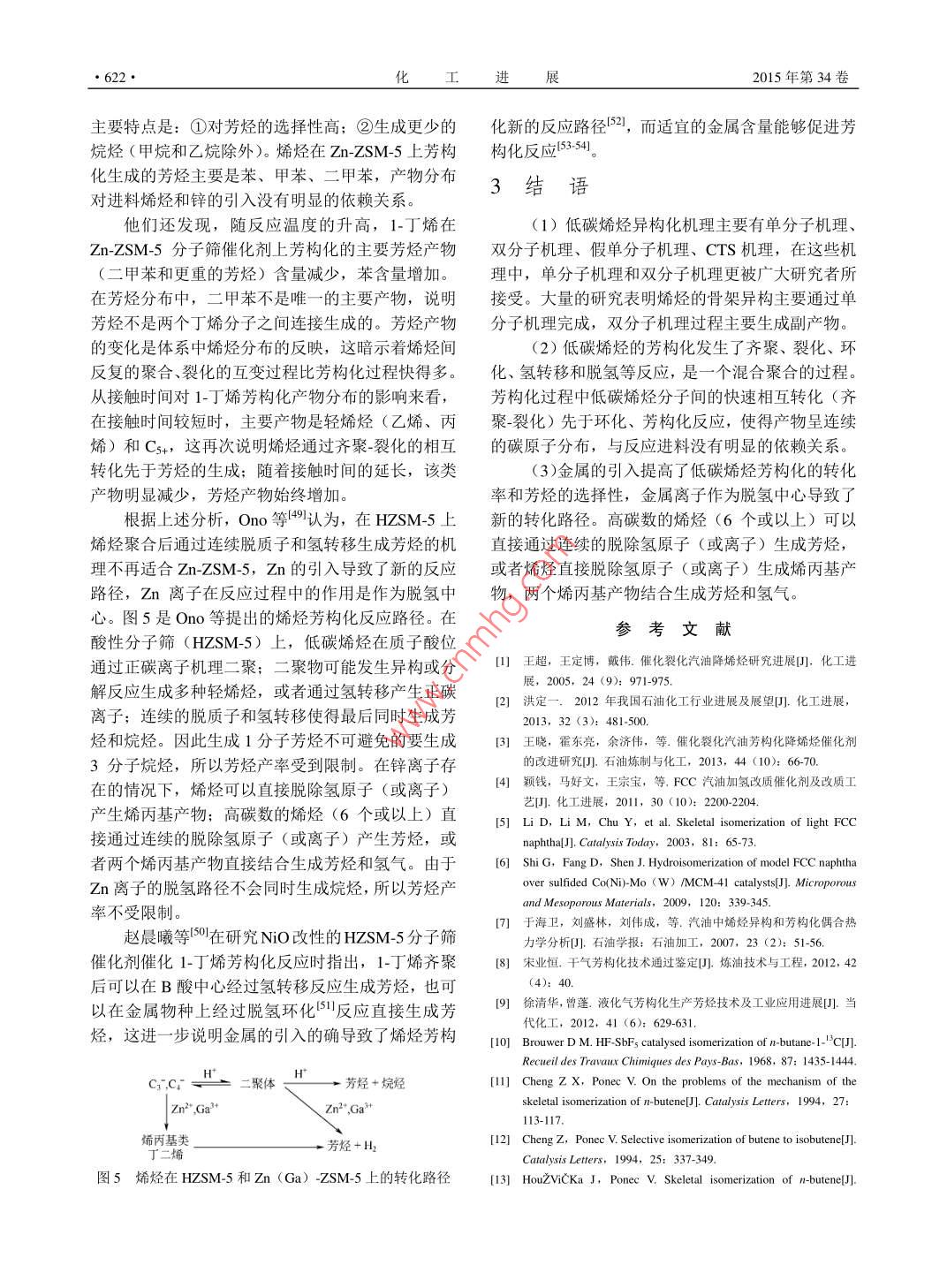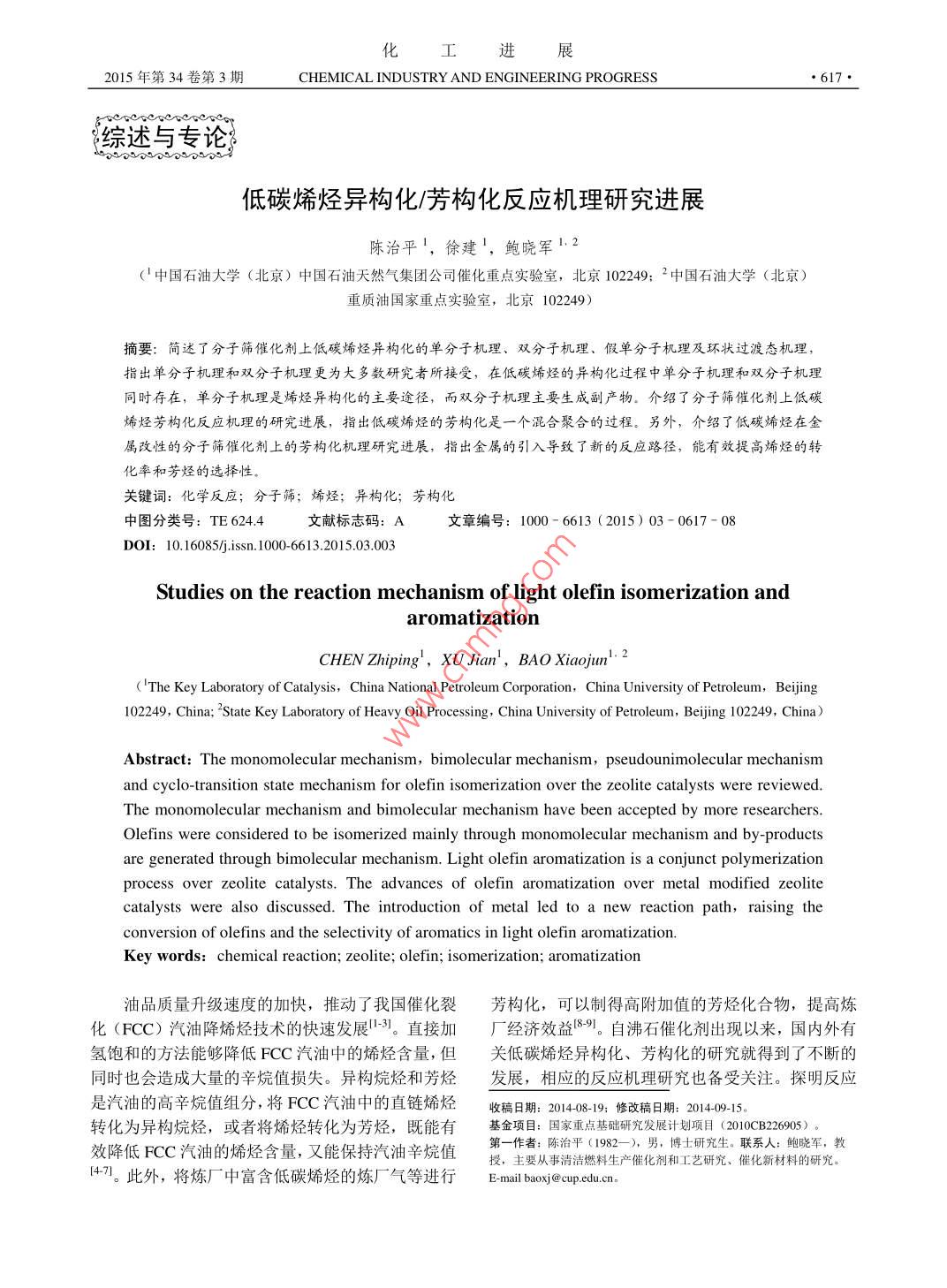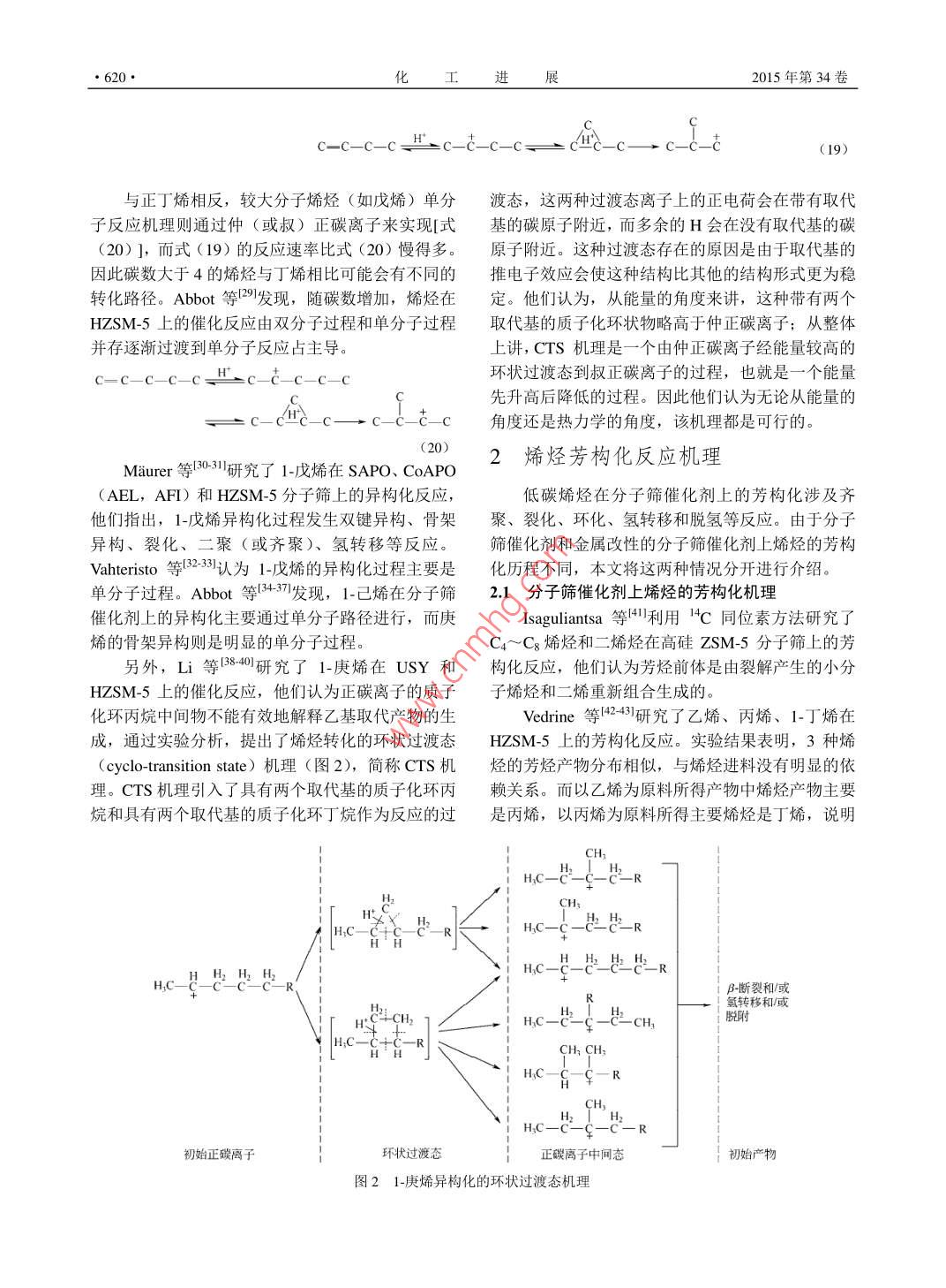 化工進(jìn)展2015年第34卷第3期CHEMICAL INDUSTRY AND ENGINEERING PROGRESS綜述與專(zhuān)論j低碳烯烴異構(gòu)化/芳構(gòu)化反應(yīng)機(jī)理研究進(jìn)展陳治平',徐建',鮑曉軍12(中國(guó)石油大學(xué)(北京)中國(guó)石油天然氣集團(tuán)公司催化重點(diǎn)實(shí)驗(yàn)室,北京102249; 2中國(guó)石油大學(xué)(北京)重質(zhì)油國(guó)家重點(diǎn)實(shí)驗(yàn)室,北京102249)摘要:簡(jiǎn)述了分子篩催化劑上低碳烯烴異構(gòu)化的單分子機(jī)理、雙分子機(jī)理、假單分子機(jī)理及環(huán)狀過(guò)渡態(tài)機(jī)理,指出單分子機(jī)理和雙分子機(jī)理更為大多數(shù)研究者所接受,在低碳烯烴的異構(gòu)化過(guò)程中單分子機(jī)理和雙分子機(jī)理同時(shí)存在,單分子機(jī)理是烯烴異構(gòu)化的主要途徑,而雙分子機(jī)理主要生成副產(chǎn)物。介紹了分子篩催化劑上低碳烯烴芳構(gòu)化反應(yīng)機(jī)理的研究進(jìn)展,指出低碳烯烴的芳構(gòu)化是-一個(gè)混合聚合的過(guò)程。另外,介紹了低碳烯烴在金屬改性的分子篩催化劑上的芳構(gòu)化機(jī)理研究進(jìn)展,指出金屬的引入導(dǎo)致了新的反應(yīng)路徑,能有效提高烯烴的轉(zhuǎn)化率和芳烴的選擇性。關(guān)鍵詞:化學(xué)反應(yīng);分子篩;烯烴;異構(gòu)化;芳構(gòu)化中圖分類(lèi)號(hào): TE 624.4文獻(xiàn)標(biāo)志碼: A文章編號(hào): 1000 - 6613 ( 2015) 03 - 0617- 08DOI: 10. 16085/j.issn.1000-6613.2015.03.003Studies on the reaction mechanism of light olefin isomerization andaromatizationCHEN Zhiping', XU Jian', BAO Xiaojun'( 'The Key Laboratory of Catalysis, China National Petroleum Corporation,China University of Petroleum,Bejing102249, China; State Key Laboratory of Heavy Oil Processing, China University of Petroleum, Bejing 102249, China)Abstract: The monomolecular mechanism, bimolecular mechanism, pseudounimolecular mechanismand cyclo-transition state mechanism for olefin isomerization over the zeolite catalysts were reviewed.The monomolecular mechanism and bimolecular mechanism have been accepted by more researchers.Olefins were considered to be isomerized mainly through monomolecular mechanism and by-productsare generated through bimolecular mechanism. Light olefin aromatization is a conjunct polymerizationprocess over zeolite catalysts. The advances of olefin aromatization over metal modified zeolitecatalysts were also discussed. The introduction of metal led to a new reaction path, raising theconversion of olefins and the selectivity of aromatics in light olefin aromatization.Key words: chemical reaction; zeolite; olefin; isomerization; aromatization油品質(zhì)量升級(jí)速度的加快,推動(dòng)了我國(guó)催化裂芳構(gòu)化,可以制得高附加值的芳烴化合物,提高煉化(FCC)汽油降烯烴技術(shù)的快速發(fā)展1-3]。直接加廠經(jīng)濟(jì)效益18-9]。自沸石催化劑出現(xiàn)以來(lái),國(guó)內(nèi)外有氫飽和的方法能夠降低FCC汽油中的烯烴含量,但關(guān)低碳烯烴異構(gòu)化、芳構(gòu)化的研究就得到了不斷的同時(shí)也會(huì)造成大量的辛烷值損失。異構(gòu)烷烴和芳烴發(fā)展,相應(yīng)的反應(yīng)機(jī)理研究也備受關(guān)注。探明反應(yīng)是汽油的高辛烷值組分,將FCC汽油中的直鏈烯烴收稿日期: 2014-08-19; 修改稿日期: 201409-15。轉(zhuǎn)化為異構(gòu)烷烴,或者將烯烴轉(zhuǎn)化為芳烴,既能有基金項(xiàng)目:國(guó)家重點(diǎn)基礎(chǔ)研究發(fā)展計(jì)劃項(xiàng)目(2010CB226905)效降低FCC汽油的烯烴含量,又能保持汽油辛烷值第一作者:陳治平(1982- -), 男,博士研究生。聯(lián)系人:鮑曉軍,教授,主要從事清潔燃料生產(chǎn)催化劑和工藝研究、催化新材料的研究。147]。此外,將煉廠中富含低碳烯烴的煉廠氣等進(jìn)行E-mail baoxj@ cup.edu.cn。●618.化I進(jìn)展2015年第34卷機(jī)理有助于了解反應(yīng)過(guò)程的轉(zhuǎn)化途徑與規(guī)律,對(duì)建重新生成無(wú)環(huán)正碳離子,即a-裂化形成仲丁基正碳立完善的反應(yīng)動(dòng)力學(xué)、指導(dǎo)催化劑的開(kāi)發(fā)和優(yōu)化具離子,如式(3)。有重要的現(xiàn)實(shí)意義。。CxExC《.裂化大(3)低碳烯烴的異構(gòu)化機(jī)理主要包括單分子機(jī)理、雙分子機(jī)理、假單分子機(jī)理及環(huán)狀過(guò)渡態(tài)機(jī)理,低β-裂化形成伯正碳離子,如式(4)。碳烯烴的芳構(gòu)化則主要通過(guò)混合聚合的過(guò)程完成。本文主要對(duì)上述機(jī)理進(jìn)行了概述,并重點(diǎn)介紹低碳c有(4)烯烴異構(gòu)化的單分子機(jī)理、雙分子機(jī)理、假單分子機(jī)理和低碳烯烴芳構(gòu)化的混合聚合歷程。伯正碳離子由于不穩(wěn)定而迅速發(fā)生重排形成相1烯烴異構(gòu)化反應(yīng)機(jī)理對(duì)穩(wěn)定的叔正碳離子,隨后通過(guò)脫質(zhì)子生成異丁烯,烯烴雙鍵的存在,使得分子篩催化劑上的烯烴如式(5)。異構(gòu)化非常復(fù)雜,發(fā)生的反應(yīng)主要有雙鍵異構(gòu)、骨(5)架異構(gòu)、裂化、二聚(或齊聚)、氫轉(zhuǎn)移等。對(duì)其反應(yīng)機(jī)理的研究主要集中在正J烯的異構(gòu)化,提出的1.1.2雙分子機(jī)理反應(yīng)機(jī)理主要有單分子機(jī)理、雙分子機(jī)理和假單分由于正丁烯異構(gòu)化過(guò)程中生成大量丙烯、戊烯子機(jī)理。等非C4烴類(lèi),這是單分子機(jī)理無(wú)法解釋的,因此研1.1正丁 烯異構(gòu)化機(jī)理究者又提出了丁烯二聚-裂化的雙分子機