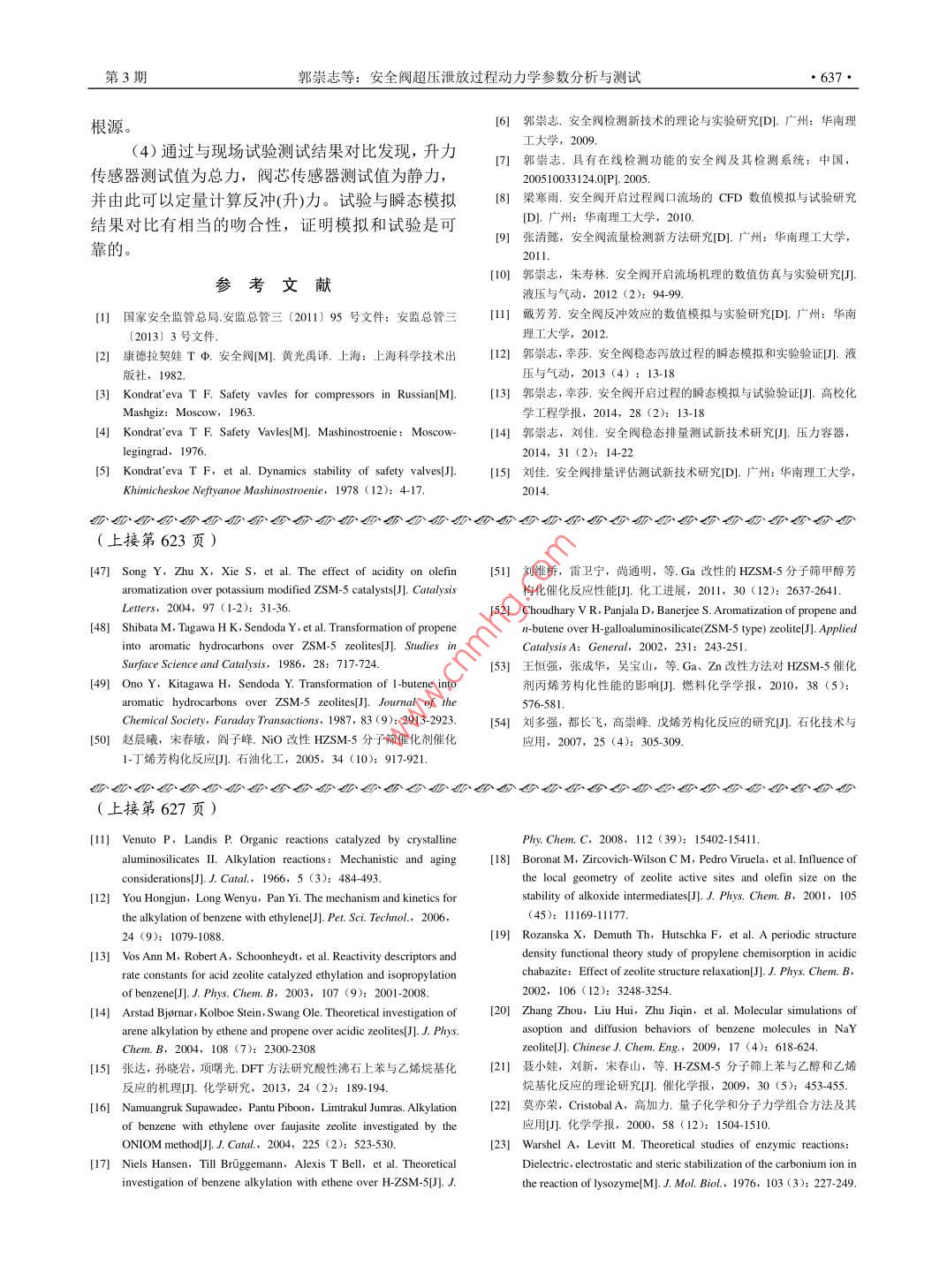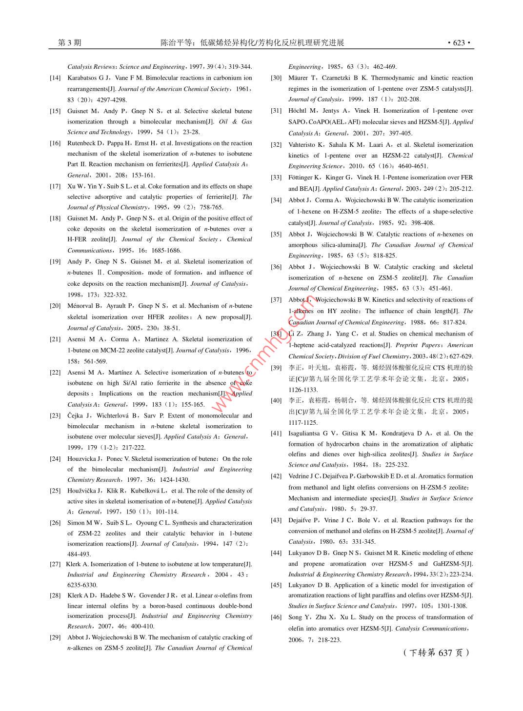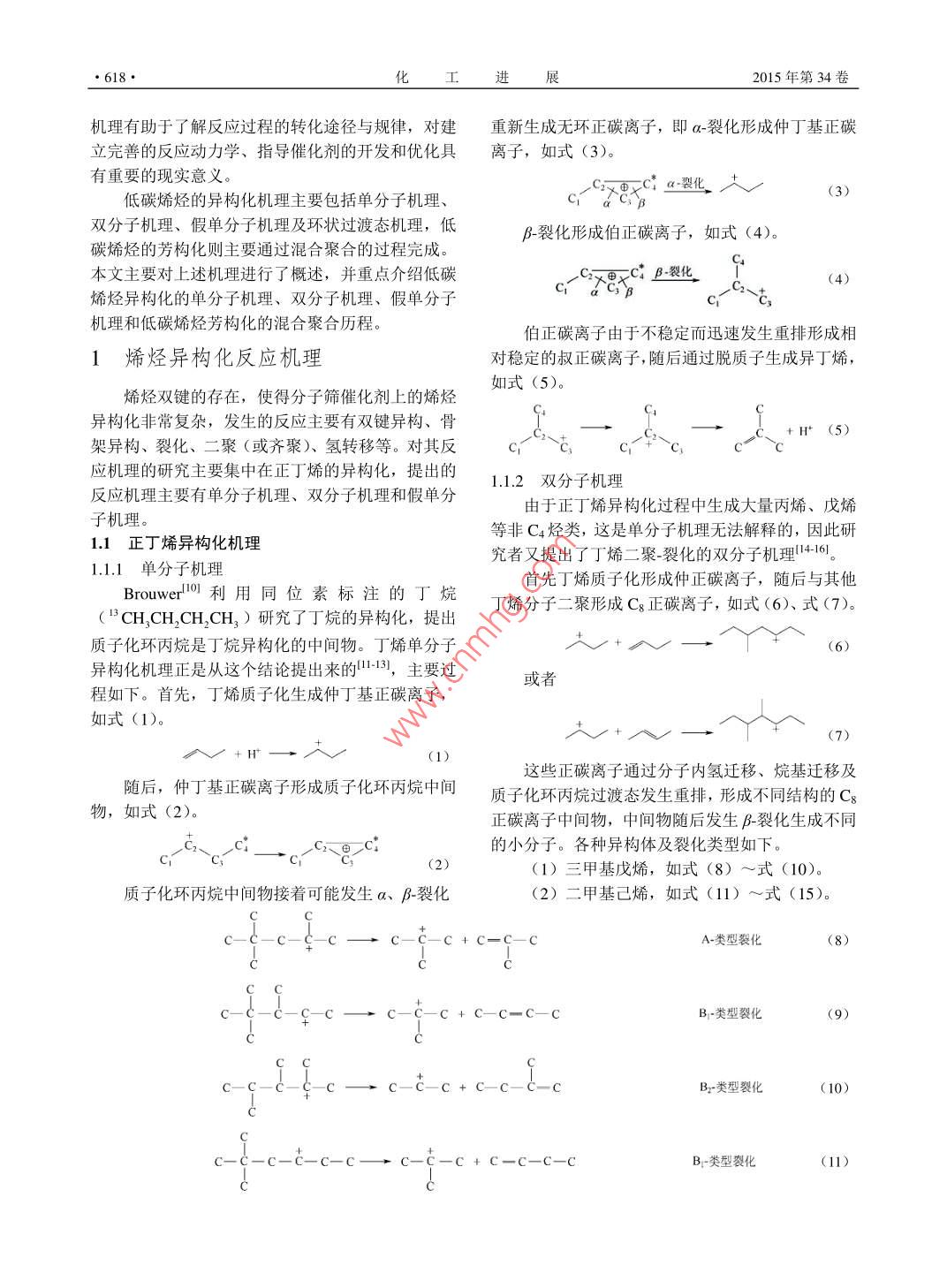 化工進(jìn)展2015年第34卷第3期CHEMICAL INDUSTRY AND ENGINEERING PROGRESS綜述與專(zhuān)論j低碳烯烴異構(gòu)化/芳構(gòu)化反應(yīng)機(jī)理研究進(jìn)展陳治平',徐建',鮑曉軍12(中國(guó)石油大學(xué)(北京)中國(guó)石油天然氣集團(tuán)公司催化重點(diǎn)實(shí)驗(yàn)室,北京102249; 2中國(guó)石油大學(xué)(北京)重質(zhì)油國(guó)家重點(diǎn)實(shí)驗(yàn)室,北京102249)摘要:簡(jiǎn)述了分子篩催化劑上低碳烯烴異構(gòu)化的單分子機(jī)理、雙分子機(jī)理、假單分子機(jī)理及環(huán)狀過(guò)渡態(tài)機(jī)理,指出單分子機(jī)理和雙分子機(jī)理更為大多數(shù)研究者所接受,在低碳烯烴的異構(gòu)化過(guò)程中單分子機(jī)理和雙分子機(jī)理同時(shí)存在,單分子機(jī)理是烯烴異構(gòu)化的主要途徑,而雙分子機(jī)理主要生成副產(chǎn)物。介紹了分子篩催化劑上低碳烯烴芳構(gòu)化反應(yīng)機(jī)理的研究進(jìn)展,指出低碳烯烴的芳構(gòu)化是-一個(gè)混合聚合的過(guò)程。另外,介紹了低碳烯烴在金屬改性的分子篩催化劑上的芳構(gòu)化機(jī)理研究進(jìn)展,指出金屬的引入導(dǎo)致了新的反應(yīng)路徑,能有效提高烯烴的轉(zhuǎn)化率和芳烴的選擇性。關(guān)鍵詞:化學(xué)反應(yīng);分子篩;烯烴;異構(gòu)化;芳構(gòu)化中圖分類(lèi)號(hào): TE 624.4文獻(xiàn)標(biāo)志碼: A文章編號(hào): 1000 - 6613 ( 2015) 03 - 0617- 08DOI: 10. 16085/j.issn.1000-6613.2015.03.003Studies on the reaction mechanism of light olefin isomerization andaromatizationCHEN Zhiping', XU Jian', BAO Xiaojun'( 'The Key Laboratory of Catalysis, China National Petroleum Corporation,China University of Petroleum,Bejing102249, China; State Key Laboratory of Heavy Oil Processing, China University of Petroleum, Bejing 102249, China)Abstract: The monomolecular mechanism, bimolecular mechanism, pseudounimolecular mechanismand cyclo-transition state mechanism for olefin isomerization over the zeolite catalysts were reviewed.The monomolecular mechanism and bimolecular mechanism have been accepted by more researchers.Olefins were considered to be isomerized mainly through monomolecular mechanism and by-productsare generated through bimolecular mechanism. Light olefin aromatization is a conjunct polymerizationprocess over zeolite catalysts. The advances of olefin aromatization over metal modified zeolitecatalysts were also discussed. The introduction of metal led to a new reaction path, raising theconversion of olefins and the selectivity of aromatics in light olefin aromatization.Key words: chemical reaction; zeolite; olefin; isomerization; aromatization油品質(zhì)量升級(jí)速度的加快,推動(dòng)了我國(guó)催化裂芳構(gòu)化,可以制得高附加值的芳烴化合物,提高煉化(FCC)汽油降烯烴技術(shù)的快速發(fā)展1-3]。直接加廠經(jīng)濟(jì)效益18-9]。自沸石催化劑出現(xiàn)以來(lái),國(guó)內(nèi)外有氫飽和的方法能夠降低FCC汽油中的烯烴含量,但關(guān)低碳烯烴異構(gòu)化、芳構(gòu)化的研究就得到了不斷的同時(shí)也會(huì)造成大量的辛烷值損失。異構(gòu)烷烴和芳烴發(fā)展,相應(yīng)的反應(yīng)機(jī)理研究也備受關(guān)注。探明反應(yīng)是汽油的高辛烷值組分,將FCC汽油中的直鏈烯烴收稿日期: 2014-08-19; 修改稿日期: 201409-15。轉(zhuǎn)化為異構(gòu)烷烴,或者將烯烴轉(zhuǎn)化為芳烴,既能有基金項(xiàng)目:國(guó)家重點(diǎn)基礎(chǔ)研究發(fā)展計(jì)劃項(xiàng)目(2010CB226905)效降低FCC汽油的烯烴含量,又能保持汽油辛烷值第一作者:陳治平(1982- -), 男,博士研究生。聯(lián)系人:鮑曉軍,教授,主要從事清潔燃料生產(chǎn)催化劑和工藝研究、催化新材料的研究。147]。此外,將煉廠中富含低碳烯烴的煉廠氣等進(jìn)行E-mail baoxj@ cup.edu.cn。●618.化I進(jìn)展2015年第34卷機(jī)理有助于了解反應(yīng)過(guò)程的轉(zhuǎn)化途徑與規(guī)律,對(duì)建重新生成無(wú)環(huán)正碳離子,即a-裂化形成仲丁基正碳立完善的反應(yīng)動(dòng)力學(xué)、指導(dǎo)催化劑的開(kāi)發(fā)和優(yōu)化具離子,如式(3)。有重要的現(xiàn)實(shí)意義。。CxExC《.裂化大(3)低碳烯烴的異構(gòu)化機(jī)理主要包括單分子機(jī)理、雙分子機(jī)理、假單分子機(jī)理及環(huán)狀過(guò)渡態(tài)機(jī)理,低β-裂化形成伯正碳離子,如式(4)。碳烯烴的芳構(gòu)化則主要通過(guò)混合聚合的過(guò)程完成。本文主要對(duì)上述機(jī)理進(jìn)行了概述,并重點(diǎn)介紹低碳c有(4)烯烴異構(gòu)化的單分子機(jī)理、雙分子機(jī)理、假單分子機(jī)理和低碳烯烴芳構(gòu)化的混合聚合歷程。伯正碳離子由于不穩(wěn)定而迅速發(fā)生重排形成相1烯烴異構(gòu)化反應(yīng)機(jī)理對(duì)穩(wěn)定的叔正碳離子,隨后通過(guò)脫質(zhì)子生成異丁烯,烯烴雙鍵的存在,使得分子篩催化劑上的烯烴如式(5)。異構(gòu)化非常復(fù)雜,發(fā)生的反應(yīng)主要有雙鍵異構(gòu)、骨(5)架異構(gòu)、裂化、二聚(或齊聚)、氫轉(zhuǎn)移等。對(duì)其反應(yīng)機(jī)理的研究主要集中在正J烯的異構(gòu)化,提出的1.1.2雙分子機(jī)理反應(yīng)機(jī)理主要有單分子機(jī)理、雙分子機(jī)理和假單分由于正丁烯異構(gòu)化過(guò)程中生成大量丙烯、戊烯子機(jī)理。等非C4烴類(lèi),這是單分子機(jī)理無(wú)法解釋的,因此研1.1正丁 烯異構(gòu)化機(jī)理究者又提出了丁烯二聚-裂化的雙分子機