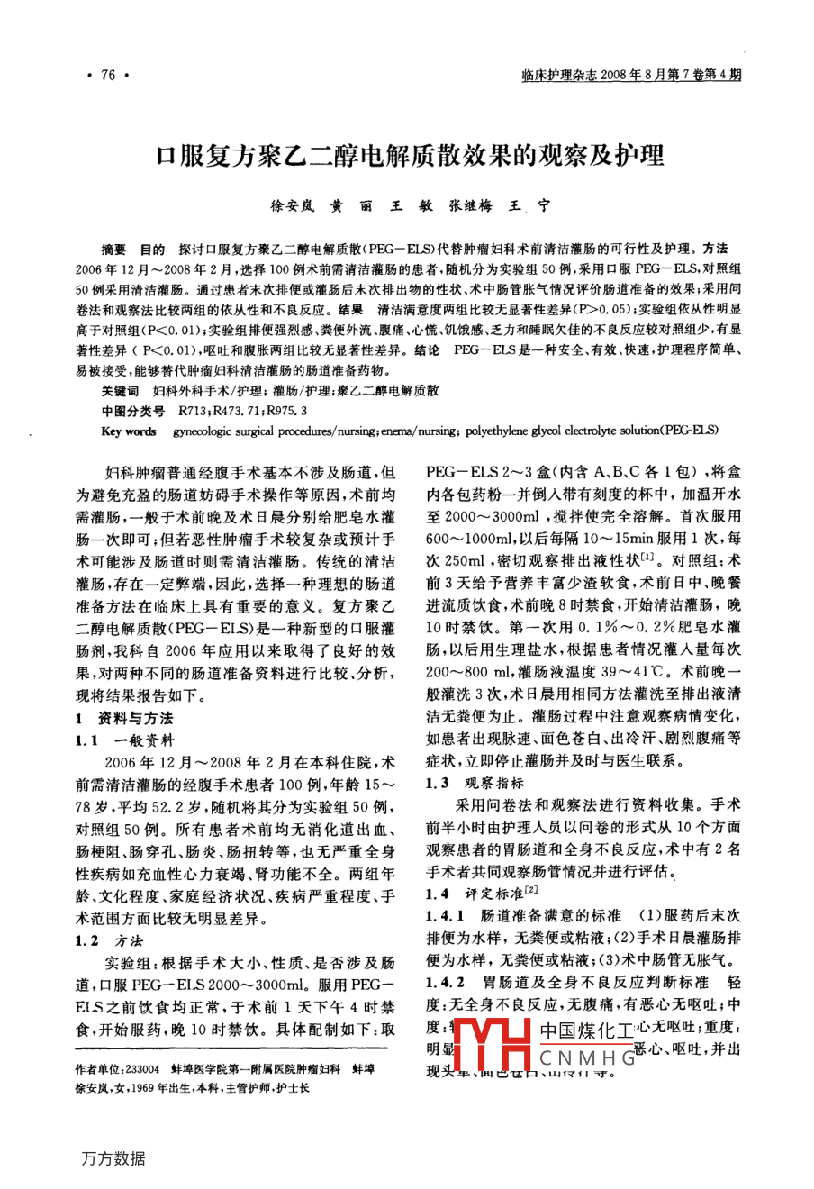 臨床護(hù)理雜志2008年8月第7卷第4期口服復(fù)方聚乙二醇電解質(zhì)散效果的觀察及護(hù)理徐安嵐黃麗王敏張繼梅王寧摘要目的探討口服復(fù)方聚乙二醇電解質(zhì)散(PFG一ELS)代替腫瘤婦科術(shù)前清潔灌腸的可行性及護(hù)理。方法2006年12月~2008年2月,選擇100例術(shù)前需清潔灌腸的患者隨機分為實驗組50例,采用口服PFG-ELS,對照組例采用清潔灌腸。通過患者末次排便或灌腸后末次排出物的性狀、術(shù)中腸管脹氣情況評價腸道準(zhǔn)備的效果;采用問卷法和觀察法比較兩組的依從性和不良反應(yīng)。結(jié)果清潔滿意度兩組比較無顯著性差異(P>0.05);實驗組依從性明顯高于對照組(P<0.01);實驗組排便強烈感糞便外流腹痛、心慌饑餓感、乏力和睡眠欠佳的不良反應(yīng)較對照組少,有顯著性差異(P<0.01),嘔吐和腹脹兩組比較無顯著性差異。結(jié)論PEG一ES是一種安全、有效、快速,護(hù)理程序簡單、易被接受,能夠替代腫瘤婦科淸潔灌腸的腸道準(zhǔn)備藥物。關(guān)鍵詞婦科外科手術(shù)/護(hù)理;灌腸/護(hù)理;聚乙二醇電解質(zhì)散中圖分類號R713;R473.71;R975.3Key words gynecologic surgical procedures/nursing; enema/nursing; polyethylene glycol electrolyte solution(PEG-ELS)婦科腫瘤普通經(jīng)腹手術(shù)基本不涉及腸道,但PEG一ELS2~3盒(內(nèi)含A、B、C各1包),將盒為避免充盈的腸道妨礙手術(shù)操作等原因,術(shù)前均內(nèi)各包藥粉一并倒入帶有刻度的杯中,加溫開水需灌腸,一般于術(shù)前晚及術(shù)日晨分別給肥皂水灌至2000~3000ml,攪拌使完全溶解。首次服用腸一次即可;但若惡性腫瘤手術(shù)較復(fù)雜或預(yù)計手600~10ml,以后每隔10~15min服用1次,每術(shù)可能涉及腸道時則需清潔灌腸。傳統(tǒng)的清潔次250ml,密切觀察排出液性狀口。對照組:術(shù)灌腸,存在一定弊端,因此,選擇一種理想的腸道前3天給予營養(yǎng)豐富少渣軟食,術(shù)前日中、晚餐準(zhǔn)備方法在臨床上具有重要的意義。復(fù)方聚乙進(jìn)流質(zhì)飲食,術(shù)前晚8時禁食,開始清潔灌腸,晚二醇電解質(zhì)散(PEG一EIS)是一種新型的口服灌10時禁飲。第一次用0.1%~0.2%肥皂水灌腸劑,我科自2006年應(yīng)用以來取得了良好的效腸,以后用生理鹽水,根據(jù)患者情況灌人量每次果,對兩種不同的腸道準(zhǔn)備資料進(jìn)行比較、分析,200~800ml,灌腸液溫度39~4l℃。術(shù)前晚現(xiàn)將結(jié)果報告如下般灌洗3次,術(shù)日晨用相同方法灌洗至排出液清資料與方法潔無糞便為止。灌腸過程中注意觀察病情變化,1.1一般資料如患者出現(xiàn)脈速、面色蒼白、出冷汗、劇烈腹痛等2006年12月~2008年2月在本科住院,術(shù)癥狀,立即停止灌腸并及時與醫(yī)生聯(lián)系。前需清潔灌腸的經(jīng)腹手術(shù)患者100例,年齡15~1.3觀察指標(biāo)78歲,平均52.2歲,隨機將其分為實驗組50例采用問卷法和觀察法進(jìn)行資料收集。手術(shù)對照組50例。所有患者術(shù)前均無消化道出血、前半小時由護(hù)理人員以問卷的形式從10個方面腸梗阻、腸穿孔、腸炎、腸扭轉(zhuǎn)等,也無嚴(yán)重全身觀察患者的胃腸道和全身不良反應(yīng),術(shù)中有2名性疾病如充血性心力衰竭、腎功能不全。兩組年手術(shù)者共同觀察腸管情況并進(jìn)行評估。齡、文化程度、家庭經(jīng)濟(jì)狀況、疾病嚴(yán)重程度、手1.4評定標(biāo)準(zhǔn)2術(shù)范圍方面比較無明顯差異1.4.1腸道準(zhǔn)備滿意的標(biāo)準(zhǔn)(1)服藥后末次1.2方法排便為水樣,無糞便或粘液;(2)手術(shù)日晨灌腸排實驗組:根據(jù)手術(shù)大小性質(zhì)、是否涉及腸便為水樣,無糞便或粘液;(3)術(shù)中腸管無脹氣道,口服 PEG--EIS200~3000ml,服用PEG-1.4.2胃腸道及全身不良反應(yīng)判斷標(biāo)準(zhǔn)輕ELS之前飲食均正常,于術(shù)前1天下午4時禁度:無全身不良反應(yīng),無腹痛,有惡心無嘔吐;中食,開始服藥,晚10時禁飲。具體配制如下:取度中國煤化工心無嘔吐;重度:明5N1AAL惡心、嘔吐,并出作者單位:233004蚌埠醫(yī)學(xué)院第一附屬醫(yī)院腫瘤婦科蚌埠現(xiàn)頭H徐安嵐,女,1969年出生,本科,主管護(hù)師護(hù)土長臨床護(hù)理雜志2008年8月第?卷第4期1.5統(tǒng)計學(xué)方法2.3兩組清潔腸道成功率的比較所有數(shù)據(jù)應(yīng)用SPSs13.0統(tǒng)計軟件進(jìn)行處實驗組49例服藥后1~2h開始腹瀉,平均腹理數(shù)據(jù)采用x2檢驗,P<0.05差異有顯著性瀉7次,有效率為98.0%。對照組48例,平均腹2結(jié)果瀉8次,有效率為96.2%,兩組比較無顯著性差異2.1兩種方法清潔腸道準(zhǔn)備的比較(P>0.05)。實驗組1例因飲藥液量不足,腹瀉次實驗組準(zhǔn)備時間小于1天,限制飲食1餐,護(hù)數(shù)較少,糞便排出少,改用清潔灌腸。對照組2例理程序簡單,對照組準(zhǔn)備時間3天,限制飲食2因肛門松弛等原因在灌腸后立即出現(xiàn)灌腸液流出餐,護(hù)理程序繁瑣。而無法充分清潔腸道。2.2兩組依從性的比較,表12.4兩組腸道清潔滿意度的比較表1顯示,實驗組依從性明顯高于對照組,兩實驗組44例滿意,5例不滿意,滿意率為組比較有顯著性差異(P<0.01)89.8%,對照組41例滿意,7例不滿意,滿意率為1兩組依從性的比較85.4%,兩組比較無顯著性差異(P>0.05)。組別例數(shù)完全依從部分依從不依從2.5兩組不良反應(yīng)的比較,表2表2顯示,實驗組中排便強烈感糞便外流、腹實驗組500痛、心慌、饑餓感、乏力和