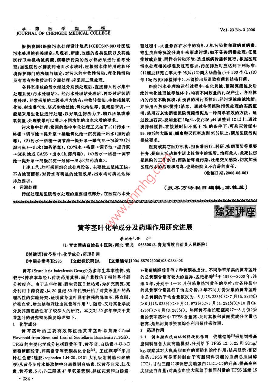 J平C是 MEDICAL COLLEGEVol.23No.32006液308~1min,脫水透明、封片黑色,切片后效果較好,因組織塊表面染色看似過染,但切片至結(jié)果組織塊中央時(shí)染色適度否則著色較淡。組織塊表面部位切片表皮細(xì)胞界線為棕黃色,輪廓清晰特別是角質(zhì)層的角質(zhì)應(yīng)薄,效果較好。硝酸銀染色所用玻璃器皿要潔凈;所用藥品一細(xì)胞界線明顯;汗腺導(dǎo)管及顆粒層的細(xì)胞顆粒神經(jīng)末梢的觸定在避光條件下保存不超過保質(zhì)期覺小體和環(huán)層小體染成深棕色;脂肪細(xì)胞界線為棕色。蘇木精此法除適用于組織學(xué)教學(xué)用片外,也可用于臨床實(shí)驗(yàn)研一伊紅復(fù)染后的細(xì)胞核為淺藍(lán)色細(xì)胞質(zhì)呈淡粉黃色3討論在硝酸銀染色及還原過程中,肉眼觀察組織塊表面應(yīng)接近(收稿日期:2006-0401)625例不孕癥患者B超檢測(cè)方法孫春明,劉劍誠,蔣愛華(1承德市婦幼保健院河北承德0670002承德醫(yī)學(xué)院)【關(guān)鍵調(diào)】B超診斷;不孕癥;卵泡監(jiān)測(cè);輸卵管通液【中圖分類號(hào)衛(wèi)R445.1【文獻(xiàn)標(biāo)識(shí)碼】B【文章編號(hào)】1004-6879(2006)03-0282-01目前B型超聲在不孕癥診斷治療中已成為主要手段,廣625例女性不孕癥患者,通過B超檢查卵泡監(jiān)測(cè)和B超泛應(yīng)用于臨床。下面對(duì)2005年以來在我院就診的625例女性監(jiān)視下輸卵管通液,查明不孕病因的416例。(1)排卵障礙:187不孕癥患者B超檢測(cè)方法介紹如下例,占29.9%(187/625)其中卵泡發(fā)育不良176例,治療后531資料與方法例妊娠黃體化卵泡不破裂6例,卵巢過度刺激5例,1例妊娠1.1一般資料625例女性不孕癥患者年齡范圍21~42歲,治愈率28.9%;(2)輸卵管阻塞:194例,占31.0%(194/625)均為已婚婦女不孕年限為1~12年經(jīng)給予抗生素抗感染、中藥活血化淤及數(shù)次通液術(shù)后,妊娠1.2方法利用常規(guī)腹部探頭(頻率為37MHx)及陰道探頭例治愈率40.2%;(3)子宮畸形:9例,占1.4%(9/625),其中頻率為6MH)腹部檢查患者膀胱適度充盈在恥骨上緣至宮子宮縱膈4例,1例經(jīng)言腔鏡手術(shù)切除縱膈后妊娠;殘角子宮1底間做多切面的掃查,腹部超聲(TAS)欠滿意者加用經(jīng)陰道超例,治療后妊娠;雙角子宮2例,1例妊娠;雙子宮2例;(4)其它聲(TVS)檢查以排除子宮及附件疾患,監(jiān)測(cè)卵泡以TvS檢查子宮及附件疾患:26例,占42%(26/625),其中子宮發(fā)育不良為主包括雙側(cè)卵巢大小卵泡數(shù)目大小及形態(tài)子宮內(nèi)膜厚6例1例妊娠;子宮肌瘤7例;子宮肌腺癥2例;子宮內(nèi)膜息肉度及聲像表現(xiàn),患者以月經(jīng)周期長短來定,多數(shù)患者從月經(jīng)第1例;卵巢腫物5例;輸卵管積水5例12天開始監(jiān)測(cè)藥物誘導(dǎo)排卵的患者從月經(jīng)第8天開始進(jìn)行觀3討論察,隔日一次,卵泡直徑>15mm為優(yōu)勢(shì)卵泡,出現(xiàn)優(yōu)勢(shì)卵泡后B超在女性不孕癥診斷治療中起著重要作用它可直觀顯每天監(jiān)測(cè)一次至卵泡成熟排卵為止(成熟卵泡直徑18-示子宮卵巢及輸卵管的形態(tài)學(xué)改變通過對(duì)卵泡發(fā)育的監(jiān)測(cè)25mm,圓形或橢圓形壁薄張力大排卵后卵泡消失或卵泡縮可判斷卵巢內(nèi)有無卵泡發(fā)育能否成熟和是否正常排卵。在誘小欠規(guī)則,直腸窩可見少量液體)。在輸卵管通暢情況下,根據(jù)導(dǎo)排卵治療中還要注意預(yù)防卵巢過度刺激癥等并發(fā)癥,從而指卵泡發(fā)育及排卵情況,指導(dǎo)性生活及藥物治療。B超監(jiān)視下輸導(dǎo)臨床用藥及適時(shí)性生活減少盲目性。B超監(jiān)視下輸卵管通卵管通液,結(jié)合進(jìn)液速度及壓強(qiáng),觀察兩側(cè)或單側(cè)卵巢周邊、宮液可根據(jù)左側(cè)或右側(cè)輸卵管通暢情況在其同側(cè)卵巢內(nèi)有正常旁及直腸窩有無液性暗區(qū),48小時(shí)后復(fù)查。卵巢周邊液體消失排卵時(shí)指導(dǎo)性生活。通過B超檢查出子宮畸形、卵巢腫物、盆腔者為輸卵管通暢如仍有液體滯留考慮輸卵管遠(yuǎn)端粘連,當(dāng)雙炎癥等使治療有的放矢.總之,B超以其準(zhǔn)確方便快捷安側(cè)輸卵管阻塞時(shí)卵巢周邊及直腸窩無液性暗區(qū)液體反流宮全可重復(fù)進(jìn)行等優(yōu)點(diǎn)在不孕癥診斷中已經(jīng)占有不可替代的腔內(nèi)可存少量液體地位。結(jié)果(收稿日期:2006-03-16)醫(yī)院污水的處理技術(shù)王榮吉,劉鋼(承德市環(huán)境科學(xué)研究院,河北承德067000【關(guān)鍵詞】醫(yī)院污水處理;技術(shù)方案【中田分類號(hào)R123【文獻(xiàn)標(biāo)識(shí)碼】【文章編號(hào)】1004-6879(2006)03-0282-03282·vol.23No.32006JOURNAL OF CHENGDE MEDICAL COLLEGE醫(yī)院排出的污水中可能含有傳染性病菌病毒、化學(xué)污染醫(yī)院現(xiàn)排放污水的主要部門有:診療室、化驗(yàn)室病房、洗物等有毒有害物質(zhì),具有極大的危害性如不妥善處理處置,衣房同位素治療診斷手術(shù)室等排水;醫(yī)院行政管理和醫(yī)務(wù)人對(duì)醫(yī)務(wù)人員及廣大人民群眾健康及環(huán)境的危害是顯而易見的,員排放的生活污水食堂單身宿會(huì)排水1醫(yī)院污水來源及水質(zhì)情況1.1各部門排水情況及主要污染物詳見表11醫(yī)院各部門排水情況及主要污染物主要污染物部門污水類別病原體放射性重金屬化學(xué)品病房生活污水實(shí)驗(yàn)窒含菌污水門診部生活污