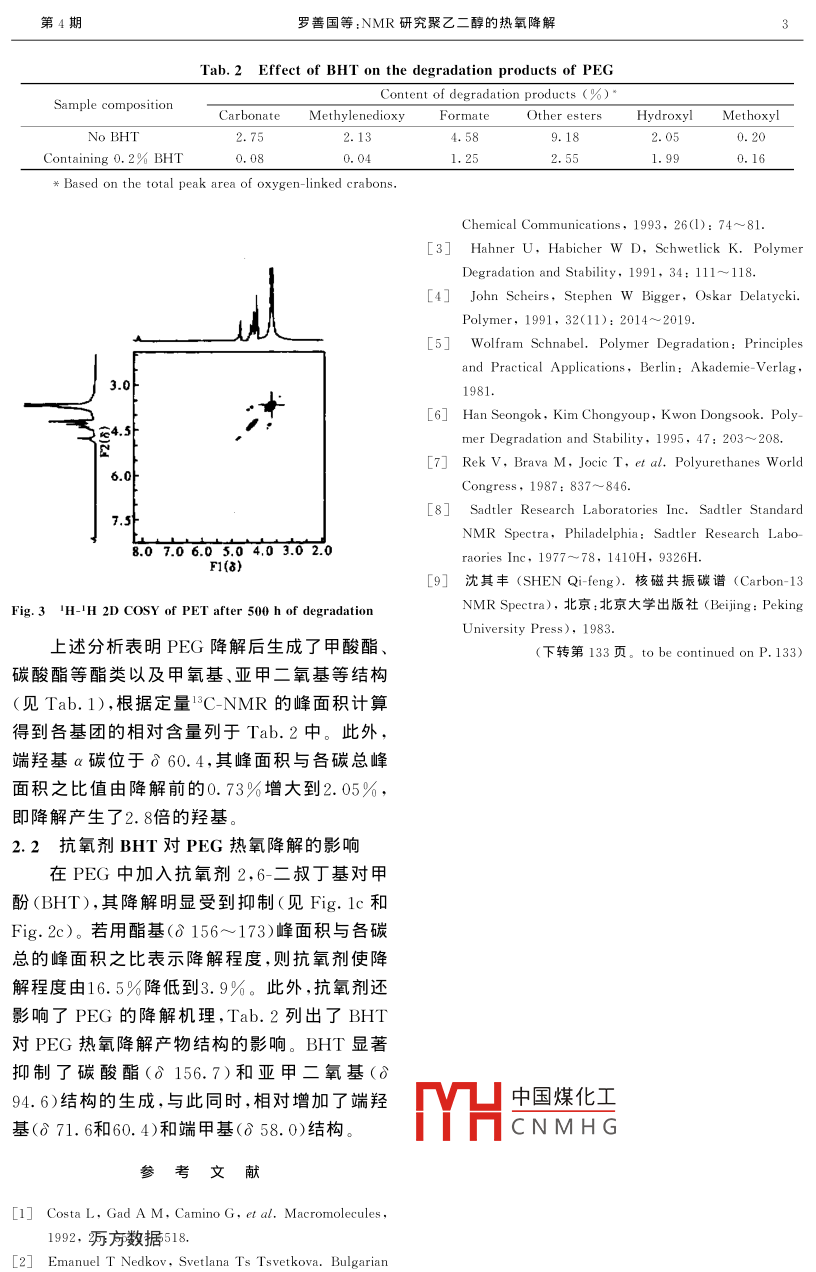 第17卷第4期高分子材料科學與工程Vol. 17. No. 42001年7月POLYMER MATERIALS SCIENCE AND ENGINEERINGNMR研究聚乙二醇的熱氧降解羅善國1,陳福泰ψ,譚惠民1,張建國2,滿光磊1,羅運軍1北京理工大學化工與材料學院,北京100081;2中國科學院長春應化所,吉林長春130022)摘要:采用H、C和2DNMR技術研究了聚乙二醇(PEG的熱氧降解,對產物結構作了詳細分析和表征,并定量討論了抗氧劑2,6-二叔丁基-4-甲基酚(BHT)對其熱氧降解的影響。PEG的氧化降解發(fā)生在醚鍵氧碳上,遵循自由基氧化杋理,最后形成大量的甲酸酯等酯類以及甲基、亞甲二氧基和醇。抗氧劑BHT不僅降低了PEG的氧化降解程度,而且改變了降解產物的結構分布,顯著抑制了碳酸酯和亞甲二氧基結構的生成,相對增加了端羥基和端甲基結構關鍵詞:聚乙二醇;熱氧降解;核磁共振中圖分類號:O632.3文獻標識碼:A文章編號:1000-7555(2001)04-0128-0聚醚的熱氧降解已有不少報道1-3,對產500h后的樣品做NMR實驗。物的結構表征基本上采用紅外光譜法1.3NMR實驗(IR)4:。然而IR不能區(qū)分一些結構相似的基在 UNITY-400NMR譜儀上測定。以氘代團,并且很難給出定量結果。近幾年來,用核磁氯仿(CDCl3)為溶劑,采用φ5mm樣品管,質共振技術(NMR)研究高分子降解已有一些報子譜以δws=0.00,碳譜以c1=77.00為譜道,但大都以H譜為依據。由于H譜化學線參考位移范圍較窄,信號重疊嚴重,提供的信息有1C-NMR實驗:觀察頻率為100.58MHz,限?!孀V則可以提供較寬的且分辨很好的結90脈沖,重復周期為7.1s,譜寬21kHz,16K構信息;此外,二維化學位移相關譜可以提供碳數據點,反轉門控去偶方法(NNE)用于定量測和氫相互關聯(lián)的信息,從而可以確定分子骨架定,6000次以上累加。的連接方式。本文采用多種NMR技術研究聚H-NMR實驗:觀察頻率為399.95MHz,乙二醇(PEG)在熱氧降解過程中的結構變化,譜寬為4.2kHz,64K數據點,90°脈沖,重復周并定量討論抗氧劑2,6-二叔丁基4-甲基酚期為2.3s。H-H同核相關實驗(COSY):觀察(BHT)對其熱氧降解的影響頻率為399.95MHz,取F1=F2=3.5kHz,2K數據點,90°脈沖,重復周期為2.1s,累加32次1實驗部分F1維取數256,數據處理采用正弦鐘窗函數1.1試劑聚乙二醇(PEG6000):日本進口分裝,M2結果與討論6000,平均官能度為2;2,6二叔丁基4甲基2.1NMR分析產物結構酚(BHT):AR,上海化學試劑站分裝廠T姑始右葉稱規(guī)整性其HNMR1.2熱氧老化實驗吧Fig.1a),其中o3.70將PEG鋪開在直徑約為8cm的蒸發(fā)皿CNMHG以了,δ1.95和δ2.82的兩中,置于90C老化烘箱中并保持通風,取老化收稿日期:1999-08基金項面、據63”計劃基金資助課題善國,男,32歲,博士后,副教授.聯(lián)系人:譚惠民高分子材料科學與工程2001年個單峰分別歸屬于羥基和水峰。C-NMR譜出(結構C)α碳上的質子;?3.39為甲氧基結構現(xiàn)3個峰(見Fig.2a),其中δ60.4和72.1分(結構D)中的質子。COSY譜顯示δ4.39和o別為端羥基中α和β碳的貢獻,主鏈碳峰位于4.26分別與?3.78和?3.71交叉,歸屬于酯結構A和C中的亞甲基質子。Fig. 2 3C-NMR spectra of PEG at different degradationa: before degradation i b: after 500 h of degradaFig. 1 H-NMR spectra of PEG at different degradation timetion; c: after 500 h of degradation in the presencea: before degradation: b: after 500 h of degradation;c: after 500 h of degradation in the presence of bht.PEG在90C很快熔化,隨著降解進行,熔1C-NMR譜中出現(xiàn)δ94.6、0156~173和液逐漸變稀。500h后的H和CNMR譜分別58~73幾組新峰。DEPT譜表明8160.6為叔如Fig.1b和Fig.2b所示,表征的產物結構列碳,是甲酸酯結構(結構A),其氧碳位于δ62.2。δ156~173為季碳,是其它酯基結構,其于Tab.1中在H譜中,降解產生的新峰出現(xiàn)在8.10氧碳位于663.0-67,9;多條譜線的出現(xiàn)是由于受鄰近基團的影響,酯基及其氧碳存在多種8.18、δ6.10、δ3.39和δ4.1~4.8范圍內Fig.3的COSY譜顯示a8.10~8.18、4.71化學環(huán)境,其中δ156.7為碳酸酯結構(結構E)1。58.0為甲基,是甲氧結構(結構D)的貢δ4.18和3.39是孤立質子,其中δ8.108.18是甲酸酯(結構A)質子特征峰:δ4.71歸獻其它各碳均為亞甲基,其中δ94.6是亞甲二屬于亞甲二氧基結構(結構B);04,18為酯基氧基結構(結構B)。Tab. 1 NMR characterization of degradation products of PEGDegradation productsNMR characterizationH2=8.10~8.18;Hb=4.39;He=3.78C--OCH, CH,OwCa=160.6;Cb=62MO-CH2--OvH=4.71;C=94.6H=4,18;H=4.26;H4=3.71wOCH,C-CH,CH,OCb=169~173:C=63.0~67.9MMCH-OCH3中國煤化工CNMHGw-CHO-C-oCH2w第4期羅善國等:NMR研究聚乙二醇的熱氧降解Tab 2 Effect of BHT on the degradation products of PEGContent of degradation products(%)arbonate Methylenedioxy FormateHydroxyl MethoxylNo BHT2.754.589.182.050.20ng 0. 2% BHTBased on the total peak area of oxygen-linked crabonsChemical Communications. 1993. 26(D):74-81[3 Hahner U, Habicher W D, Schwetlick K. PolymerDegradation and Stability, 1991, 34: 111-118.[4 John Scheirs, Stephen W Bigger, Oskar DelatyckiPolymer,1991.32(11):2014~2019[5 Wolfram Schnabel. Polymer Degradation Principlesand Practical Applications, Berlin: Akademie-Verlag[6 Han Seongok, Kim Chongyoup. Kwon Dongsook. Pe≈45mer Degradation and Stability, 1995, 47: 203-208[7 Rek V, Brava M, Jocic T, et al. Polyurethanes WorlSadtler standard7.5[8 Sadtler Research Laborate8.07.06.05.0403.02.0F1(3)raories inc,1977~78,1410H,9326H[9]沈其豐( SHEN QI-feng).核磁共振碳諧( Carbon-13Fig 3 H-H 2D COSY of PET after 500 h of degradationNMR Spectra),北京:北京大學出版社( Beijing: Peking上述分析表明PEG降解后生成了甲酸酯(下轉第133頁。 to be continued on e.133)碳酸酯等酯類以及甲氧基、亞甲二氧基等結構(見Tab.1),根據定量C-NMR的峰面積計算得到