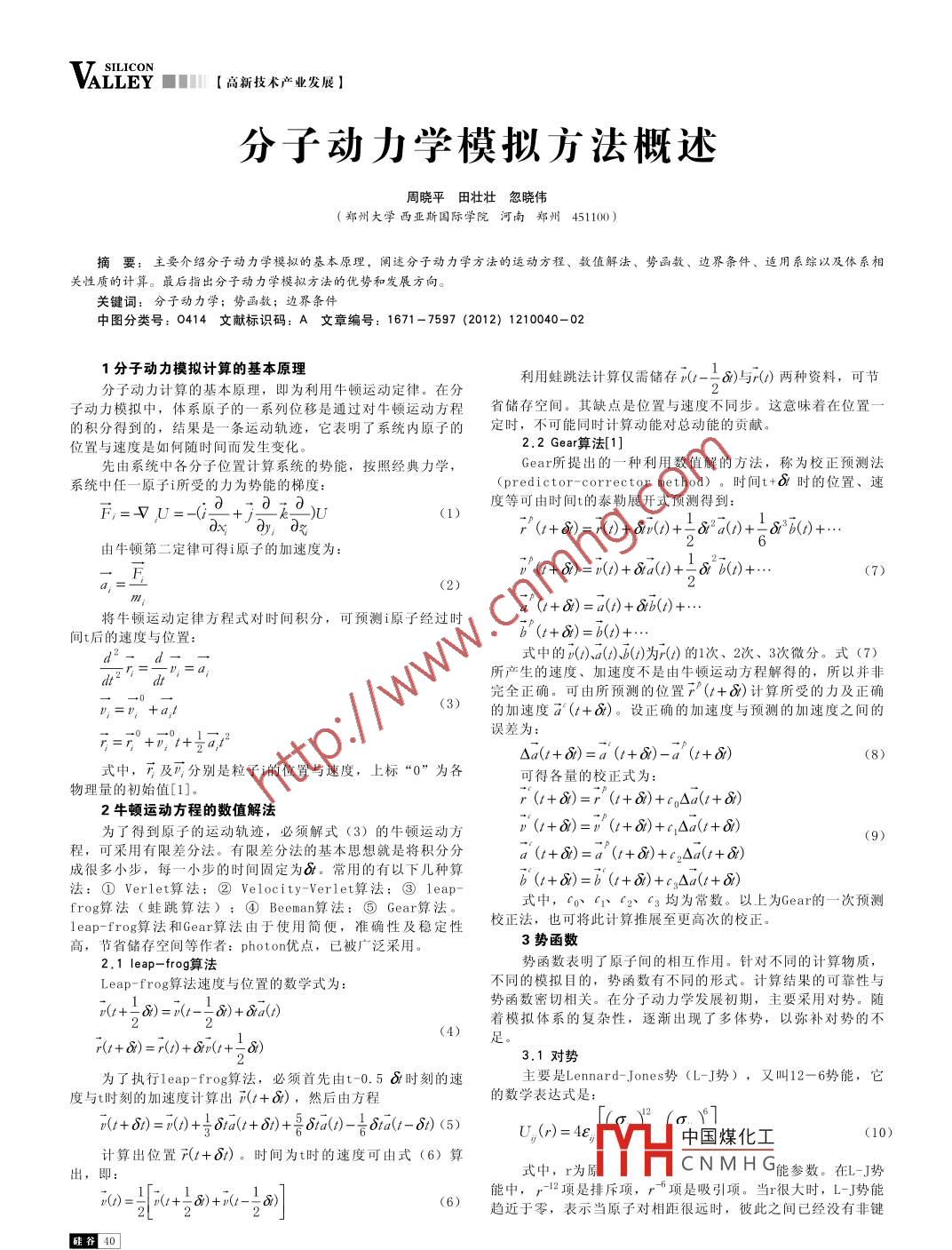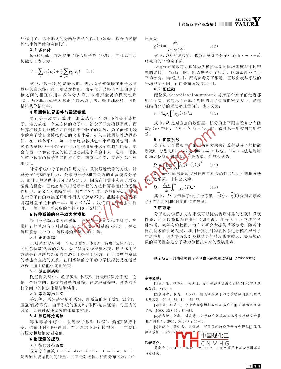 SILICONLLEY■■【高新技術(shù)產(chǎn)業(yè)發(fā)展分子動(dòng)力學(xué)模擬方法概述周曉平田壯壯忽曉偉(鄭州大學(xué)西亞斯國際學(xué)院河南鄭州451100)摘要:主要介紹分子動(dòng)力學(xué)模擬的基本原理,闡述分子動(dòng)力學(xué)方法的運(yùn)動(dòng)方程、數(shù)值解法、勢函數(shù)、邊界條件、適用系綜以及體系相關(guān)性質(zhì)的計(jì)算。最后指出分子動(dòng)力學(xué)模擬方法的優(yōu)勢和發(fā)展方向。關(guān)鍵詞:分子動(dòng)力學(xué);勢函數(shù);邊界條件中圖分類號(hào):0414文獻(xiàn)標(biāo)識(shí)碼:A文章編號(hào):1671-7597(2012)1210040-021分子動(dòng)力模擬計(jì)算的基本原理利用蛙跳法計(jì)算僅需儲(chǔ)存(-)與r()兩種資料,可節(jié)分子動(dòng)力計(jì)算的基本原理,即為利用牛頓運(yùn)動(dòng)定律。在分子動(dòng)力模擬中,體系原子的一系列位移是通過對牛頓運(yùn)動(dòng)方程省儲(chǔ)存空間。其缺點(diǎn)是位置與速度不同步。這意味著在位置的積分得到的,結(jié)果是一條運(yùn)動(dòng)軌跡,它表明了系統(tǒng)內(nèi)原子的定時(shí),不可能同時(shí)計(jì)算動(dòng)能對總動(dòng)能的貢獻(xiàn)位置與速度是如何隨時(shí)間而發(fā)生變化2.2Gea算法[1先由系統(tǒng)中各分子位置計(jì)算系統(tǒng)的勢能,按照經(jīng)典力學(xué)Gear所提出的一種利用數(shù)值解的方法,稱為校正預(yù)測法系統(tǒng)中任一原子i所受的力為勢能的梯度( predictor- corrector method)。時(shí)間t+時(shí)的位置、速度等可由時(shí)間t的泰勒展開式預(yù)測得到(1)r"(+6)=()+8n()+12()+18b(+由牛頓第二定律可得i原子的加速度為F(+8)=()+n()+182b()(t+)=a()+b(1)將牛頓運(yùn)動(dòng)定律方程式對時(shí)間積分,可預(yù)測i原子經(jīng)過時(shí)間t后的速度與位置:b(+)=6()+式中的(、a()、b()為()的1次、2次、3次微分。式(7)dt所產(chǎn)生的速度、加速度不是由牛頓運(yùn)動(dòng)方程解得的,所以并非(3)完全正確??捎伤A(yù)測的位置產(chǎn)(+)計(jì)算所受的力及正確的加速度d(+)。設(shè)正確的加速度與預(yù)測的加速度之間的誤差為r=r +p t+△a(+8)=a(+8)-a(+8)(8)式中,及"分別是粒子i的位置與速度,上標(biāo)“0”為各可得各量的校正式為:物理量的初始值[1]r(+8)=r"(+8)+c△a(+2牛頓運(yùn)動(dòng)方程的數(shù)值解法為了得到原子的運(yùn)動(dòng)軌跡,必須解式(3)的牛頓運(yùn)動(dòng)方(+8)=(+6)+c△(+)(9)程,可采用有限差分法。有限差分法的基本思想就是將積分分a(+8)=a(+6)+c,△(+8)成很多小步,每一小步的時(shí)間固定為c。常用的有以下兒種算法:① Verlet算法;② Velocity- Verlet算法:③leapb(+)=b(+)+c3△a(+)frog算法(蛙跳算法);④ Beeman算法:⑤Gear算法式中,C0、C1c2、C3均為常數(shù)。以上為Gear的一次預(yù)測1 eap-frog算法和Gear算法由于使用簡便,準(zhǔn)確性及穩(wěn)定性校正法,也可將此計(jì)算推展至更高次的校正高,節(jié)省儲(chǔ)存空間等作者: photon優(yōu)點(diǎn),已被廣泛采用3勢函數(shù)2.1leap-frog算法勢函數(shù)表明了原子間的相互作用。針對不同的計(jì)算物質(zhì)Leap-frog算法速度與位置的數(shù)學(xué)式為:不同的模擬目的,勢函數(shù)有不同的形式。計(jì)算結(jié)果的可靠性與勢函數(shù)密切相關(guān)。在分子動(dòng)力學(xué)發(fā)展初期,主要采用對勢。隨(+-=v(r--S)+sat著模擬體系的復(fù)雜性,逐漸出現(xiàn)了多體勢,以彌補(bǔ)對勢的不r(t+)=r()+Cp(t+-)3.1對勢為了執(zhí)行1eap-frog算法,必須首先由t-0.5時(shí)刻的速主要是 Lennard- Jones勢(L-J勢),又叫12-6勢能,它度與t時(shí)刻的加速度計(jì)算出(t+8),然后由方程的數(shù)學(xué)表達(dá)式是(r+)=(+16(+)+5b()-16(t-06)(5)U(r)=4中國煤化工(10)計(jì)算出位置r(+6t)。時(shí)間為t時(shí)的速度可由式(6)算出,即式中,r為CNMHG能參數(shù)能中,r-2項(xiàng)是排斥項(xiàng),r項(xiàng)是吸引項(xiàng)。當(dāng)r很大時(shí),L-J勢能p()=(+)+p(-O)(6)趨近于零,表示當(dāng)原子對相距很遠(yuǎn)時(shí),彼此之間已經(jīng)沒有非鍵SILICON【高新技術(shù)產(chǎn)業(yè)發(fā)展】 VALLE結(jié)作用了。這個(gè)形式的勢函數(shù)表達(dá)的作用力較弱,適合描述惰定義為性氣體的固體和液體[2]多體勢Daw和 Baskes首次提出了嵌入原子勢(EAM),其體系的總式中,P為系統(tǒng)密度,dN為距離參考分子中心由r→r+ah勢能可以表示為:球殼內(nèi)的平均粒子數(shù)。徑向分布函數(shù)可以理解為所模擬體系的區(qū)域密度與平均密U=∑F(p)+∑()(11)度的比[1]。當(dāng)r值小時(shí),距離參考分子很近,區(qū)域密度不同于平均密度;當(dāng)r值大時(shí),距離參考分子很遠(yuǎn),區(qū)域密度與系統(tǒng)的式中,第一項(xiàng)F是嵌入能,表示原子核鑲嵌在電子云背平均密度相同,徑向分布函數(shù)接近于1景中的嵌入能;第二項(xiàng)是對勢能,表示位于晶格點(diǎn)陣上的原子2配位數(shù)核之間的相互作用。多體勢大都用來模擬金屬的微觀性質(zhì)配位數(shù)( coordination number)是指某個(gè)原子的最近鄰[2]。后來 Baskes等人修正了嵌入原子法,提出MEA勢,可以原子個(gè)數(shù),它顯示了該原子周圍的原子分布的密度大小,是微描述共價(jià)鍵材料觀結(jié)構(gòu)分析的輔助物理量[4]。其定義為:4周期性邊界條件與最近鏡像(13)執(zhí)行分子動(dòng)力計(jì)算時(shí),通常選取一定數(shù)目N的分子或