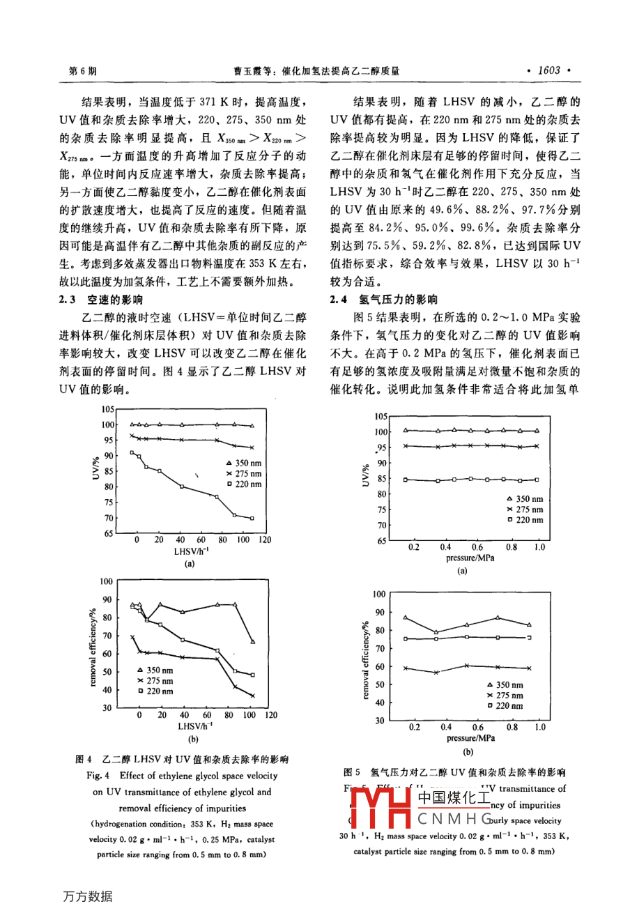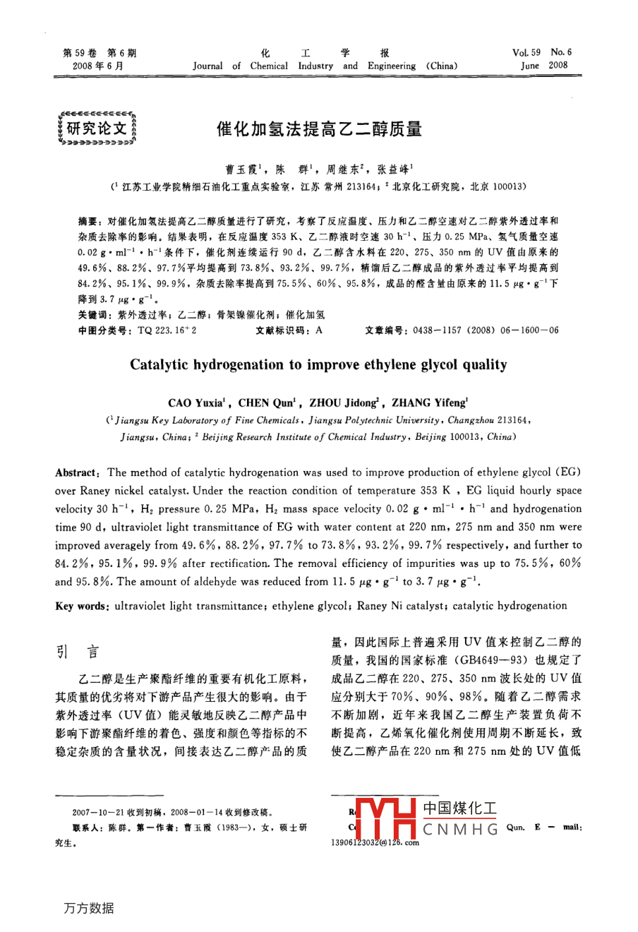 第59卷第6期2008年6月Journal of Chemical Industry and Engineering (China)June 2008研究論文催化加氬法提高乙二醇質量曹玉霞1,陳群',周繼東2,張益峰(江蘇工業(yè)學院精細石油化工重點實驗室,江蘇常州213164;2北京化工研究院,北京100013)摘要:對催化加氫法提高乙二醇質量進行了研究,考察了反應溫度、壓力和乙二醇空速對乙二醇紫外透過率和雜質去除率的影響。結果表明,在反應溫度353K、乙二醇液時空速30h1、壓力0.25MPa、氫氣質量空速0.02g·ml1·h-條件下,催化劑連續(xù)運行90d,乙二醇含水料在220、275、350m的UV值由原來的49.6%、88.2%、97.7%平均提高到73.8%、93.2%、99.7%,精餾后乙二醇成品的紫外透過率平均提高到84.2%、95.1%、9.9%,雜質去除率提高到75.5%、60%、95,8%,成品的醛含量由原來的11.5g·g1下降到3.7g·g-1。關鍵詞:紫外透過率;乙二醇;骨架鎳催化劑;催化加氫中圖分類號:TQ223.16-2文獻標識碼:A文章編號:0438-1157(2008)06-1600-06Catalytic hydrogenation to improve ethylene glycol qualityCAO Yuxia, CHEN Qun', ZHOU Jidong,, ZHANG Yifeng'Jiangsu Key Laboratory of Fine Chemicals, Jiangsu Polytechnic University, Changzhou 213164Jiangsu, China; 2 Beijing Research Institute of Chemical Industry, Beijing 100013, China)Abstract: The method of catalytic hydrogenation was used to improve production of ethylene glycol (EGover Raney nickel catalyst. Under the reaction condition of temperature 353 K, EG liquid hourly spacevelocity 30 h, H2 pressure 0. 25 MPa, H2 mass space velocity 0. 02 g. ml-.h and hydrogenationtime 90 d, ultraviolet light transmittance of eg with water content at 220 nm, 275 nm and 350 nm wereimproved averagely from 49. 6%,88.2%,97. 7% to 73.., 99. 7% respectively, and further to84.2%,95.1%,99.9% after rectification. The removal efficiency of impurities was up to 75. 5%, 60%and 95.8%. The amount of aldehyde was reduced from 11.5 ug.gI to 3. 7 ug.gKey words: ultraviolet light transmittance; ethylene glycol; Raney Ni catalyst; catalytic hydrogenation引言量,因此國際上普遍釆用UV值來控制乙二醇的質量,我國的國家標準(GB4649-93)也規(guī)定了乙二醇是生產聚酯纖維的重要有機化工原料,成品乙二醇在220、275、350mm波長處的UV值其質量的優(yōu)劣將對下游產品產生很大的影響。由于應分別大于70%、90%、98%。隨著乙二醇需求紫外透過率(UV值)能靈敏地反映乙二醇產品中不斷加劇,近年來我國乙二醇生產裝置負荷不影響下游聚酯纖維的著色、強度和顏色等指標的不斷提高,乙烯氧化催化劑使用周期不斷延長,致穩(wěn)定雜質的含量狀況,間接表達乙二醇產品的質使乙二醇產品在220nm和275nm處的UV值低2007-10-21收到初稿,2008-01-14收到修改稿中國煤化工聯系人:陳群。第一作者:曹玉霞(1983-),女,頓士研HCNMHG Qun究生13906123032(第6期曹玉霞等:催化加氫法提高乙二醇質量1601ethylene ethylene oxide absorbing,.multiple-effect.rporation Hf hydrohylene glycol圖1改進后的乙二醇生產工藝Fig. 1 Manufacturing technique of ethylene glycol after amelioration于國外同類產品并低于國家標準值。并且隨裝置運試樣中的脂肪醛化合物在氯化鐵存在下,與3甲行工況的變化,UV值與醛含量不斷波動,成為乙基-2-苯并噻唑酮腙(MBTH)反應,生成藍-綠色二醇生產行業(yè)普遍關注的難題。因此如何在不改變稠合陽離子,在波長620m處有吸收,且在一定現有生產工藝的前提下開展提高乙二醇紫外透過率范圍內醛含量與吸光度呈線性關系,據此可測得樣與降低醛含量的技術開發(fā)與研究,并使乙二醇產品品中的脂肪醛含量UV值在220、275、350m處分別達到80%、采用離子色譜法測定加氫前后乙二醇中有機酸95%、99%以上的國際標準,將具有重要的意義。含量。樣品在青島普仁PIC8型離子色譜儀上測使乙二醇U值下降的主要原因是裝置工藝定。色譜條件:淋洗流速1.5ml·min-1,輔抑制參數發(fā)生變化,并直接導致物料中醛、酮和羧酸類器水流速1.5ml·min-1,主抑制器電流120mA,化合物濃度增加,這些微量有機物因含有輔抑制器電流100mA“C=C”雙鍵、“C=O”雙鍵及其共軛結構基團,采用UV1201型紫外分光光度計,測定加氫極微量雜質含量即可使乙二醇在200~400m紫前后乙二醇紫外透過率。參比水為高錳酸鉀處理的外區(qū)有較大的吸收,從而表現出UV值的顯去離子水。該方法符合GB4649-93中有關乙二醇著下降。UV值的分析要求。除改變催化劑工藝及裝置參數外,目前國內外在原料乙二醇中,烯酸類化合物如丙烯酸等在報道的提高乙二醇UV值的方法主要是吸附劑吸220mm處有較強的吸收峰,加氫后將轉化為對應附1和化學還原的方法1),但均存在效率低、的飽和羧酸。羰基類化合物如甲醛、3乙某-1,2環(huán)成本高、操作復雜、對主流程影響大等問題。查閱戊二酮等主要在275nm處有強吸收,加氫后變?yōu)榻鼛啄暧嘘P方面的文獻,未見采用固定床催化加氫相應的醇類化合物,其275m處吸收消失。為此還原不飽和雜質以提高UV值的方法的報道,催化劑活性用乙二醇的UV值變化和雜質去除率本文將該方法應用于乙二醇生產工藝改進中,其過表示。根據朗伯比爾定律,其吸光度A與溶液液程如圖1所示。即在乙二醇多效蒸發(fā)器的末效出口層厚度b和濃度c的乘積呈正比與乙二醇精餾單元之間增加一固定床催化加氫單元,并取消原樹脂縮醛化催化降醛單元,將含有A=-IgT15%水的乙二醇粗產品(簡稱含水料)經催化加氫在同一波長下物質的吸光系數不變。另外由紫外光處理后,其中的不飽和雜質化合物被部分轉化為飽譜原理可知,純乙二醇在波長200nm以上無吸