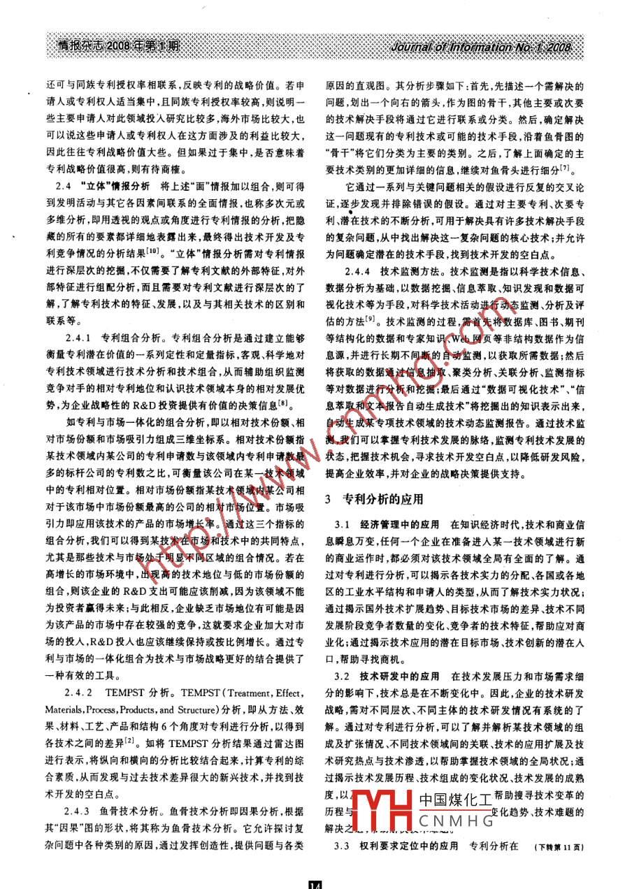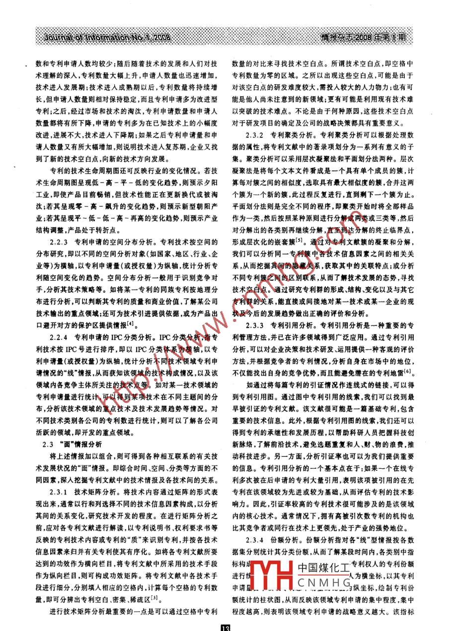 ,情報雜志2008年第1期JournalornmatianN專利分析方法研究*The Study of Patent Information Analysis郭婕婷肖國華(中國科學(xué)院成都文獻(xiàn)情報中心成都610041)摘要由于專利成為研發(fā)重點(diǎn)和主要的技術(shù)保護(hù)措施,因此專利情報分析也成為國家和企業(yè)主要處理的事務(wù)之一。根據(jù)專利信惠的特點(diǎn),從專利信息挖掘由淺入深的角度入手,從“點(diǎn)”、“線”、“面”、“立體”四個層次建立了專利分析方法體系,并分別對專利分析方法進(jìn)行了介紹,討論了專利分析方法的應(yīng)用。關(guān)鍵詞專利情報 情報分析方 法隨著經(jīng)濟(jì)全球化進(jìn)程的加快和我國經(jīng)濟(jì)的快速發(fā)展,專項(xiàng),按有關(guān)指標(biāo)分別進(jìn)行統(tǒng)計(jì)分析,以取得某國家、地區(qū)、行利作為知識產(chǎn)權(quán)的重要組成部分,其重要作用日益突出。但業(yè)領(lǐng)域、組織、機(jī)構(gòu)、個人等不同主體的專利投入、產(chǎn)出情況是在科技8益發(fā)達(dá)的今天,面對海量的專利信息,如何有效地的初步情報?!包c(diǎn)”情報分析是對專利信息的初步挖掘。具體利用專利分析方法從紛繁復(fù)雜的專利信息中獲得有用的信分析方法有以下兩種。息,從而為決策服務(wù),應(yīng)是信息情報人員所關(guān)注的重要問題。2.1.1簡單統(tǒng)計(jì)分析。 按照專利申請人、專利申請量、專利授權(quán)量、同族專利量等指標(biāo)分別進(jìn)行統(tǒng)計(jì)分析。通過相1專利分析的重要意義關(guān)指標(biāo)的統(tǒng)計(jì),可反映不同主體在某一時間范圍內(nèi)的專利投專利作為知識產(chǎn)權(quán)中科技含量高的重要組成部分,對于人產(chǎn)出情況,初步了解其專利質(zhì)量的高低。知識產(chǎn)權(quán)戰(zhàn)略的實(shí)施和企業(yè)的研發(fā)活動有重要的影響意義。2.1.2關(guān)鍵詞頻統(tǒng)計(jì)。 通過提取專利項(xiàng)、摘要和標(biāo)題中據(jù)世界知識產(chǎn)權(quán)組織(WIPO)統(tǒng)計(jì):專利信息是世界上最大的技術(shù)關(guān)鍵詞,并對其頻數(shù)進(jìn)行統(tǒng)計(jì)。通過關(guān)鍵詞出現(xiàn)頻率的公開技術(shù)信息源之一- ,它包含了世界上90% ~95%的技術(shù)的高低,可反映某-技術(shù)領(lǐng)域研究熱點(diǎn)的轉(zhuǎn)移情況;還可對出信息,并且技術(shù)信息的公開要比其他載體早1~2年;有效運(yùn)現(xiàn)頻率較高的關(guān)鍵詞進(jìn)行邏輯組配,對技術(shù)概念進(jìn)行再理解。用專利情報,可平均縮短研發(fā)時間60% ,節(jié)省研發(fā)費(fèi)用40%;2.2“線"情報分析 “線"情報分析 ,指將獲得的“點(diǎn)"情報在世界研發(fā)平均產(chǎn)出中,與其它活動相比,專利經(jīng)濟(jì)價值超過按照一定方式排序,從而得到有序化的“線”情報。即通過對了90%"1。因此在知識經(jīng)濟(jì)時代,專利信息對于國家和企業(yè)專利初步統(tǒng)計(jì)中的專利數(shù)量、專利權(quán)人、專利申請日等進(jìn)行組而言都具有舉足輕重的作用,最大程度地開發(fā)和利用專利信配統(tǒng)計(jì),或按時間、空間、分類等進(jìn)行再排序的過程。息也成為國家和企業(yè)取得競爭優(yōu)勢的重要保證。2.2.1專 利申請的時間序列分析。時間序列分析,指專由于專利成為研發(fā)重點(diǎn)和主要的技術(shù)保護(hù)措施,專利分利技術(shù)按時間的分布研究,即將簡單統(tǒng)計(jì)分析的結(jié)果按時間析也成為國家和企業(yè)急需處理的主要事務(wù)之一。專利情報分序列予以整理。如以時間為橫軸,以專利申請量(或授權(quán)量、析,即對專利文獻(xiàn)中包含的技術(shù)信息、經(jīng)濟(jì)信息、法律信息通同族專利數(shù)量等)為縱軸,統(tǒng)計(jì)分析專利隨時間變化的趨勢,過科學(xué)的加工、整理與分析,進(jìn)行深度挖掘與縝密剖析,形成得到有關(guān)發(fā)明先后的線情報。通過對各主要國家或企業(yè)專利具有較高技術(shù)與商業(yè)價值的專利情報。申請數(shù)量隨時間變化的分析比較,可反映各國家或企業(yè)技術(shù)創(chuàng)新行為變化的快慢和趨勢,及它們之間技術(shù)開發(fā)能力的強(qiáng)2專利情報分析方法弱,從而指導(dǎo)R&D研究和識別技術(shù)領(lǐng)域的演變。本文根據(jù)專利信息的特點(diǎn),從專利信息挖掘由淺人深的2.2.2技術(shù)生命周期分析。 技術(shù)的發(fā)展同產(chǎn)品一樣,具角度,分別從“點(diǎn)”、“線”、“面”、“立體”等四個層次對專利分析有一定的生命周期。通過統(tǒng)計(jì)-段時間內(nèi)某項(xiàng)技術(shù) 相關(guān)專利方法作初步的探討。的申請數(shù)量和專利由請人數(shù)毋的變化.可以繪制技術(shù)生命周2.1“點(diǎn)"情報分析 “點(diǎn)"情報 分析主要是對專利文獻(xiàn)的期圖。中國煤化工步期、發(fā)展期、成熟外部特征進(jìn)行的統(tǒng)計(jì)分析,即對專利文獻(xiàn)上固有的單個著錄期、下降CN M H G技術(shù)起步初期,專利基金項(xiàng)目:中國科學(xué)院“西部之光"人才培養(yǎng)計(jì)劃研究項(xiàng)目"專利地圖研究分析及其應(yīng)用"的研究成果之一。作者簡介:郭婕婷,女,1983年生,碩士研究生;肖國華,男,1975年生,副研究員,研究方向?yàn)閷@閳蠓治?。JautnakotuonmatonNo.2008情報東志:2008年第1期數(shù)和專利申請人數(shù)均較少;