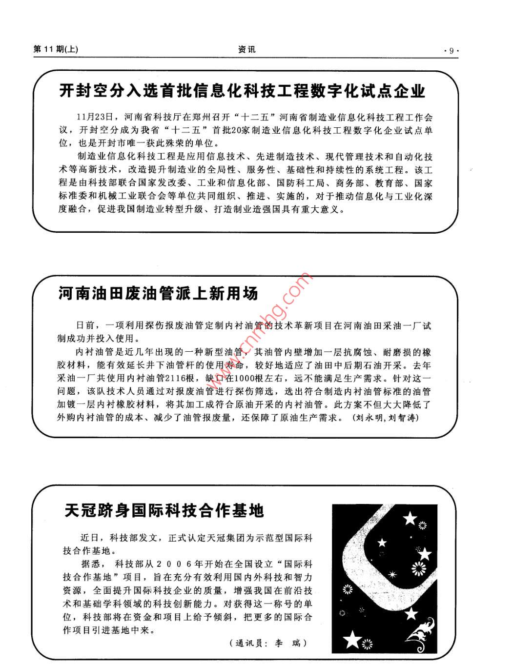 第11期(上)資訊開封空分入選首批信息化科技工程數(shù)字化試點企業(yè)11月23日,河南省科技廳在鄭州召開“十二五”河南省制造業(yè)信息化科技工程工作會議,開封空分成為我省“十二五”首批20家制造業(yè)信息化科技工程數(shù)字化企業(yè)試點單位,也是開封市唯一獲此殊榮的單位。制造業(yè)信息化科技工程是應(yīng)用信息技術(shù)、先進制造技術(shù)、現(xiàn)代管理技術(shù)和自動化技術(shù)等高新技術(shù),改造提升制造業(yè)的全局性、服務(wù)性、基礎(chǔ)性和持續(xù)性的系統(tǒng)工程。該工程是由科技部聯(lián)合國家發(fā)改委、工業(yè)和信息化部、國防科工局、商務(wù)部、教育部、國家標準委和機械工業(yè)聯(lián)合會等單位共同組織、推進、實施的,對于推動信息化與工業(yè)化深度融合,促進我國制造業(yè)轉(zhuǎn)型升級、打造制業(yè)造強國具有重大意義。河南油田廢油管派上新用場日前,一項利用探傷報廢油管定制內(nèi)襯油管的技術(shù)革新項目在河南油田采油一廠試制成功并投入使用。內(nèi)襯油管是近幾年出現(xiàn)的一種新型油管,其油管內(nèi)壁增加一層抗腐蝕、耐磨損的橡膠材料,能有效延長井下油管桿的使用壽命,較好地適應(yīng)了油田中后期石油開采。去年采油一廠共使用內(nèi)襯油管2116根,缺口在1000根左右,遠不能滿足生產(chǎn)需求。針對這問題,該隊技術(shù)人員通過對報廢油管進行探傷篩選,選出符合制造內(nèi)襯油管標準的油管加鍍一層內(nèi)襯橡膠材料,將其加工成符合原油開采的內(nèi)襯油管。此方案不但大大降低了外購內(nèi)襯油管的成本、減少了油管報廢量,還保障了原油生產(chǎn)需求。(劉永明,劉智濤)天冠躋身國際科技合作基地近日,科技部發(fā)文,正式認定天冠集團為示范型國際科★技合作基地。據(jù)悉,科技部從2006年開始在全國設(shè)立“國際科技合作基地”項目,旨在充分有效利用國內(nèi)外科技和智力資源,全面提升國礫科技企業(yè)的質(zhì)量,增強我國在前沿技術(shù)和基礎(chǔ)學科領(lǐng)域的科技創(chuàng)新能力。對獲得這一稱號的單位,科技部將在資金和項目上給予傾斜,把更多的國際合6作項目引進基地中來。(通訊員:李瑞)