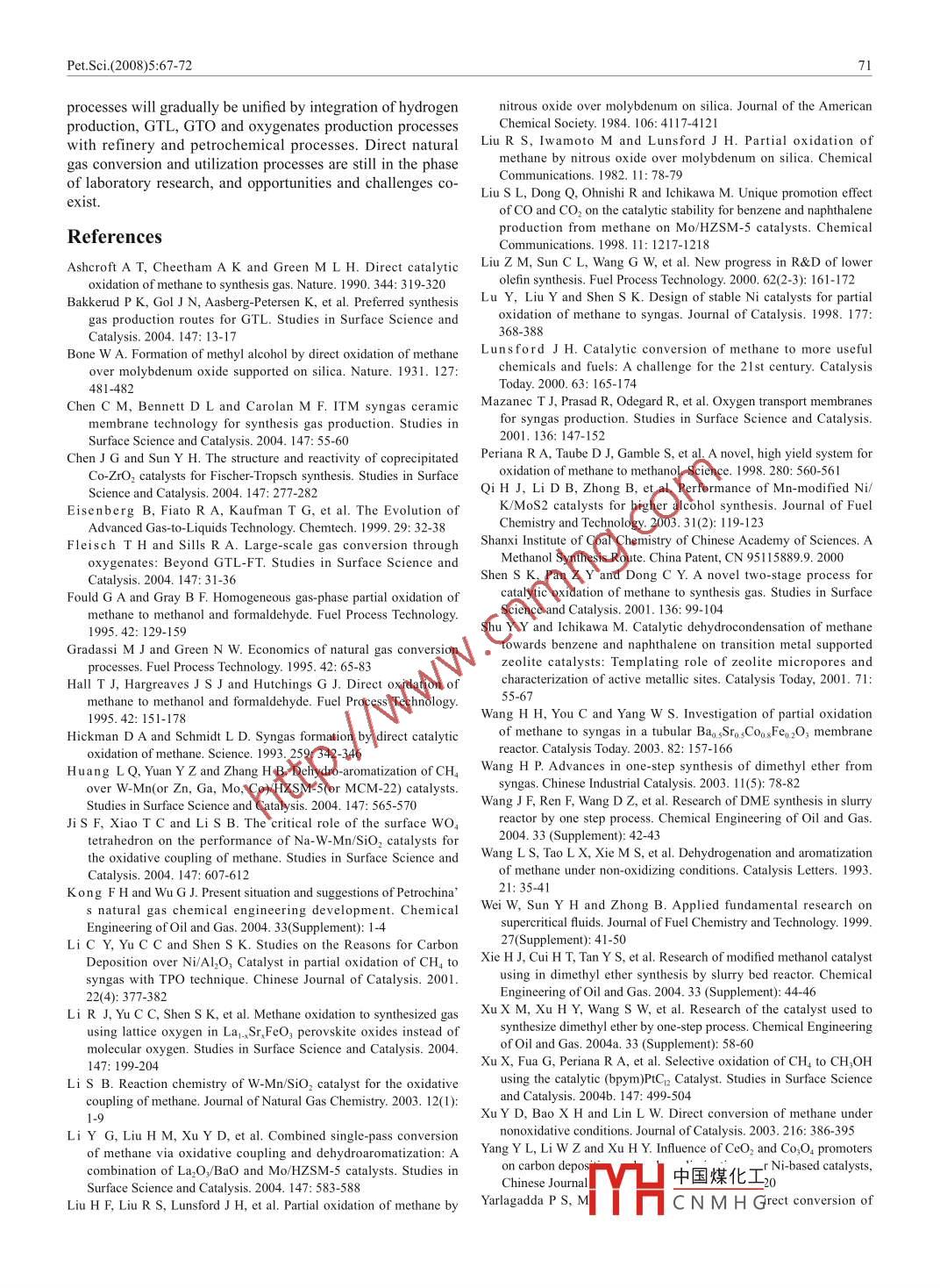 DOI10.1007/s12182008-0011-7Progress in studies of natural gasconversion in China NYu Changchun** and Shen ShikongKey Laboratory of Catalysis under CNPC, China University of Petroleum, Beijing 102249, ChinaAbstract: Progress in natural gas conversion in China is presented in this paper, including processes ofnatural gas to synthesis gas(syngas), syngas to liquid hydrocarbons, oxygenates synthesis, methanol toolefins(MTO), methane to aromatics and oxidative coupling of methane(OCM)Key words: Methane, natural gas conversion, GTL, synthesis gas, hydrocarbons, alcohols, olefins,methanol, dimethyl ether1 Introductionto oxygenate and natural gas to hydrogen has attracted moreattention in China and worldwideAccording to the data from china State Statistics bureauResearch and development of natural gas conversionthe output of natural gas in China was less than 1x10"m3in China are presented in this paper, and suggestions onbefore 1995, of which about 45% was used as chemical utilization of natural gas are made for natural gas chemicalindustry feedstock. In 2004, the output of natural gas in China industryreached 4.07x10. of which the commercial sales volumewas 3x10 m, while the natural gas used as chemical industry 2 Conversion of natural gas to syngasfeedstock decreased to 35%, but the absolute quantity was2.3 times higher than that of 1995. Up to date, the natural gasCatalytic partial oxidation(CPO)of natural gas to syngasused as chemical industry feedstock in China for ammonia is a mild exothermic reaction(AH=-36 kJ/mol). Worldwidesynthesis accounts for 60% for methanol synthesis accounts researchers have carried out lots of studies on CPO procesfor 30%, for acetylene and all the other products accounts for since 1990(Ashcroft et al, 1990; Hickman and Schmidt,10%(Kong and wu, 2004993; Lu et al, 1998; Zhang et al, 2000 Li et al, 2001; YangUp to 2005, China had only shared 1.3% of the world total et al, 2002 ). The results indicated that both noble metalnatural gas resources, and the corresponding price was relative catalysts and nickel catalysts have very high activity for CPOhigh, which is unfavorable for the development of natural reaction, and alkaline earth metal oxide and rare earth metalas chemical industry in China. However, globalization isxide promoters can inhibit carbon deposition reactions overtrend in the future and the neighboring countries of China, nickel catalysts. Because of very high reaction rate of CPOcountries in middle east and australia have abundant natural controlling reaction temperature to avoid runaway of thegas resources, which is favorable for China to utilize these catalyst bed temperature is the key to scale up of CPO reactorforeign natural gas resources From the viewpoint of optimal (Shen et al, 2001). Currently, syngas production based onutilization of natural gas resources, the chemical industry CPO is still in the phase of laboratory research with only onein China has quite a large potential size in the utilization exception of pilot plant test of Exxon Mobils fixed fluidizedof natural gas. Chemical conversion and utilization of bed CPO process(Eisenberg et al, 1999)natural gas has always been put in an important position inHighly active anti-carbon deposition catalyst is mostChina, and a lot of progress has been made. Processes with important for the CPO process. The La2 -Ni/MgAlOindependent intellectual property rights, including MTO and Al2 O catalyst developed by Lu et al (1998)is a nickel-basedoal-based synthesized fuel were developed and achieved highly active anti-carbon deposition CPO catalyst For thepilot plant demonstration, providing strong technical support catalyst, an MgAl O4 spinel membrane formed on the surfacefor sustainable development of natural gas chemical industry of Al2O, support can prevent the reaction of high temperaturein Chinasolid phase between nickel and alumina, thus avoiding thecause of the shortage of petroleum resources and more formation of NiAl O4 spinel phase, which is an inactive phasetrict environmental regulations, the conversion of natural gas for CPo reaction and will result in catalyst deactivation. Theto liquids(GTL), natural gas to olefins(GTO), natural gas catalyst promoted by the strong basic La,O, promoter canken the metallicity of nickel and slightly decrease thethe catalyst. BSupported by the National Natural Science Foundation of China promoters'modification, once methane dissociates over(20490201,20306016)the catalyst, sus Corresponding author. e-mail: yucc(@cup. edu中國(guó)煤化工 act with surfaceoxygen speciesReceived March 11 2007YHCNMHGy Surface carbonPet. Sci.(20085:67-72deposition is avoided.which is far higher than that of CPO process. In addition, theAlthough CPO is a mild exothermic reaction, very high temperature of exit gas of aTR process is about 1050C. Ingas hourly space velocity would cause a large quantity CPO process, as the feedstock temperature is limited by itsof heat release in catalyst bed in a short time period, auto-ignition temperature, in order to reach a high exit gasconsequently resulting in the formation of hot spot and temperature of ca. 1050C, a small fraction of natural gastemperature runaway. In addition, the feedstock methane and oxygen are used as fuel to be burnt to heat the reactionto oxygen molar ratio is 2: 1, which is in the range of gas. By this way, the natural gas and oxygen consumptionupper and lower limits of explosion of CH/O, mixture, CPO process is 7% and 18%, respectively, higher than thatand safe operation of cPo process is one of the key in ATR process(Bakkerud and Gol, 2004). Whether CPO ortechnologies for CPO commercialization. Lu et al(1998) ATR process is more advanced needs further researchdeveloped a new technology, which is a combination of In ATR process, oxygen production cost accounts for 40%low temperature catalytic combustion and catalytic partial of operation cost. In order to cut down the oxygen productionoxidation. It includes a serially 