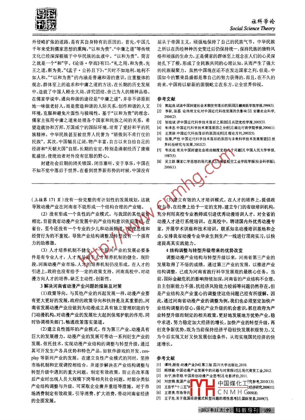 社科學(xué)論Social Science Theory河南省動(dòng)漫產(chǎn)業(yè)結(jié)構(gòu)調(diào)整與轉(zhuǎn)型升級(jí)研究張可欣(商丘工學(xué)院傳媒與現(xiàn)代藝術(shù)學(xué)院河南. 商丘476000)摘要許多國(guó)家已經(jīng)把文化產(chǎn)業(yè)作為一項(xiàng)國(guó)家的戰(zhàn)略產(chǎn)業(yè)加以對(duì)待,各級(jí)政府也紛紛成立文化產(chǎn)業(yè)管理部門(mén),把文化資源作為一-種戰(zhàn)略資源加以管理。動(dòng)漫產(chǎn)業(yè)是新興的文化創(chuàng)意產(chǎn)業(yè),本文主要研究了解動(dòng)漫產(chǎn)業(yè)發(fā)展現(xiàn)狀與瓶頸,在此基礎(chǔ)上提出動(dòng)漫產(chǎn)業(yè)結(jié)構(gòu)調(diào)整與升級(jí)思路,試圖探索動(dòng)漫產(chǎn)業(yè)理論研究新空間。同時(shí)本文的理論研究希望對(duì)政府和社會(huì)推動(dòng)動(dòng)漫產(chǎn)業(yè)發(fā)展提供理論支持,為動(dòng)漫產(chǎn)業(yè)轉(zhuǎn)型提供新的思路。關(guān)鍵詞動(dòng)漫產(chǎn)業(yè) 轉(zhuǎn)型升級(jí)政策導(dǎo)向中圖分類(lèi)號(hào):F127文獻(xiàn)標(biāo)識(shí)碼:AHe'nan Animation Industry Structure Adjustmentand Transformation UpgradingZHANG Keyin(School of Media and Moderm Art, Shangqiu Institute of Technology, Shangqiu, He'nan 476000)Abstract Many countries have treated the cultural industries as a national strategic industry;been founded in the cultural industry management department, the cultural resources to be managed as a strategic resource.Animation industry is an emerging cultural and creative indutries, the paper mainly study the animation industry develop-ment status and bottlenecks, based on this proposed animation industry structure adjustment and upgrading ideas, theoreticalstudy atempts to explore new space for the animation industry. While the theoretical study hopes to provide theoretical sup-port for the govemment and the community t0 promote the development of animation industry, and provides new ideas forKey words animation industry; transformation upgrading; policy-oriented1產(chǎn)業(yè)結(jié)構(gòu)調(diào)整與轉(zhuǎn)型升級(jí)的必要性及研究的現(xiàn)實(shí)意義之后陸續(xù)出品的《大鬧天宮》 、《哪吒?jìng)髌妗贰逗J兄弟)等幾部(1)產(chǎn)業(yè)結(jié)構(gòu)調(diào)整與轉(zhuǎn)型升級(jí)的必要性.隨著社會(huì)的不斷動(dòng)畫(huà)片也在國(guó)際上產(chǎn)生- -定影響。 但在此之后,我國(guó)的動(dòng)漫發(fā)展,資源約束和經(jīng)濟(jì)形勢(shì)的改變,有效調(diào)整產(chǎn)業(yè)結(jié)構(gòu)并升級(jí)產(chǎn)業(yè)就進(jìn)入了瓶頸時(shí)期,很少有影響力巨大的作品出現(xiàn)了,更是使經(jīng)濟(jì)能夠持續(xù)發(fā)展的必經(jīng)之路。國(guó)家也在不斷地強(qiáng)調(diào),促難以形成強(qiáng)有力的產(chǎn)業(yè)。2006 年以后,我國(guó)重新發(fā)展動(dòng)漫產(chǎn)進(jìn)國(guó)民經(jīng)濟(jì)又好又快發(fā)展,必須加快轉(zhuǎn)變經(jīng)濟(jì)發(fā)展方式,推進(jìn)業(yè)。在扶持我國(guó)動(dòng)漫產(chǎn)業(yè)的舉措上,一方面,抬高國(guó)外動(dòng)畫(huà)片經(jīng)濟(jì)結(jié)構(gòu)調(diào)整,產(chǎn)業(yè)結(jié)構(gòu)得到優(yōu)化升級(jí)。由此足以見(jiàn)國(guó)家對(duì)轉(zhuǎn)播放門(mén)檻。逐年減少對(duì)國(guó)外動(dòng)漫的引進(jìn),其次在電視上大量變經(jīng)濟(jì)發(fā)展方式和產(chǎn)業(yè)結(jié)構(gòu)的轉(zhuǎn)型升級(jí)的重視與強(qiáng)調(diào)。播放本土動(dòng)畫(huà)作品,并鼓勵(lì)各地方電視臺(tái)開(kāi)播動(dòng)畫(huà)頻道。時(shí)(2)課題研究的現(xiàn)實(shí)意義。調(diào)整產(chǎn)業(yè)結(jié)構(gòu),并使其能夠有至今日,國(guó)家每年都會(huì)出臺(tái)一系列政策 、劃撥資金扶持動(dòng)漫產(chǎn)效合理地轉(zhuǎn)型升級(jí)已經(jīng)成為當(dāng)前經(jīng)濟(jì)發(fā)展的新方向。我國(guó)經(jīng)業(yè)發(fā)展。在國(guó)家的扶持下,國(guó)內(nèi)動(dòng)漫產(chǎn)業(yè)也快速起步并穩(wěn)步濟(jì)經(jīng)歷長(zhǎng)期高速發(fā)展后,更面臨著前所未有的新挑戰(zhàn)新壓力,發(fā)展。2009年,國(guó)產(chǎn)動(dòng)畫(huà)片《喜羊羊與灰太狼》的騰空出世,其對(duì)產(chǎn)業(yè)結(jié)構(gòu)的調(diào)整與升級(jí)能夠促進(jìn)新興產(chǎn)業(yè)的萌芽、發(fā)展,并影響力更給國(guó)內(nèi)動(dòng)畫(huà)產(chǎn)業(yè)帶來(lái)新的希望與鼓舞。專(zhuān)家預(yù)測(cè),使經(jīng)濟(jì)呈現(xiàn)多元化發(fā)展,縮短與發(fā)達(dá)國(guó)家的距離。在未來(lái)幾年里,中國(guó)動(dòng)漫市場(chǎng)有更大的發(fā)展空間,未來(lái)將是中2動(dòng)漫產(chǎn)業(yè)現(xiàn)狀與弊端國(guó)動(dòng)漫產(chǎn)業(yè)發(fā)展的黃金期。2.1動(dòng)漫產(chǎn)業(yè)現(xiàn)狀分析(3)河南動(dòng)漫產(chǎn)業(yè)現(xiàn)狀分析。河南省人口眾多是其成為(1)國(guó)際動(dòng)漫產(chǎn)業(yè)現(xiàn)狀分析。隨著人們生活水平的提高,動(dòng)漫產(chǎn)業(yè)受眾最多的省份之一-的主要原因。 河南省委和省政更多的人將不同的娛樂(lè)消遣方式作為生活的必需品。與此同府及相關(guān)廳局也給予充分的重視和支持,并先后組建了河南時(shí),動(dòng)漫產(chǎn)業(yè)逐年的迅猛發(fā)展,也已成為與電影、電視劇并駕動(dòng)漫協(xié)會(huì)和河南省動(dòng)漫基地,省會(huì)鄭州也成立鄭