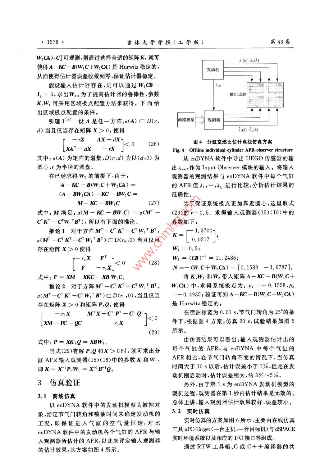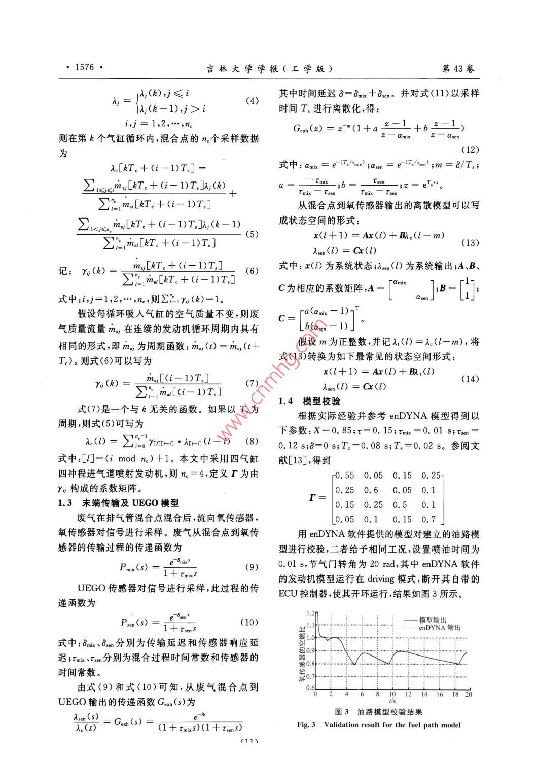 第43卷第6期吉林大學(xué)學(xué)報(bào)(工學(xué)版)Vol, 43 No2013年11月Journal of Jilin University(Engineering and Technology Edition)Nov.2013基于輸入觀測(cè)器的分缸空燃比估計(jì)王萍1,江和耀,范亞南,陳虹(1.吉林大學(xué)通信工程學(xué)院,長春13002:2.中國船舶重工集團(tuán)公司第七一三研究所,鄭州450015)摘要:針對(duì)進(jìn)氣道噴射發(fā)動(dòng)機(jī),為了實(shí)現(xiàn)更加精確的空燃比( Air-fuel ratio,AFR)控制,提出了基于輸入觀測(cè)器的分缸空燃比估計(jì)方法。首先建立發(fā)動(dòng)機(jī)的完整油路模型,主要包括燃油傳輸模型、氣體(廢氣)混合過程模型、廢氣傳輸模型和氧傳感器模型,并基于發(fā)動(dòng)機(jī)仿真軟件 enDYNA對(duì)其進(jìn)行校驗(yàn)。然后設(shè)計(jì)了輸入觀測(cè)器來估計(jì)各缸內(nèi)的空燃比,并利用區(qū)域極點(diǎn)配置方法確定觀測(cè)器的増益。最后通過離線仿真和發(fā)動(dòng)機(jī)控制試驗(yàn)臺(tái)架上的實(shí)時(shí)仿真驗(yàn)證了觀測(cè)器的合理性和有效性。關(guān)鍵詞:控制理論;分缸空燃比;油路模型;輸入觀測(cè)器;區(qū)域極點(diǎn)配置中圖分類號(hào):TP273文獻(xiàn)標(biāo)志碼:A文章編號(hào):1671-5497(2013)06-157407DOl:10.7964/ jdxbgxb201306023Individual cylinder air-fuel ratio estimation based on input observerWANG Ping, JIANG He-yao, FAN Ya-nan, CHEN HongCollege of communication engineering, Jilin University, Changchun 130022, China; 2. The 713th Research Instituteof China Shipbuilding Industry Corporation, Zhengzhou 450015, China)Abstract: Based on the input observer, an estimator of individual cylinder Air- Fuel Ratio(AFR) in aSI engine is proposed. The fuel path model, which is constituted by fuel wall-wetting model. exhaustgas mix model, exhaust gas transfer model and universal exhaust gas oxygen(UEGO)sensor model,is established. Then, under the same working condition and with the same input, the developed modelis validated using the precise engine model of enDYNA. Furthermore, an input observer based onregional pole placement is proposed to design an AFR estimator. Finally, the rationality and feasibilitof the proposed observer and AFR estimator are validated by real-time and offline simulations on asimulation platform for automotive engine controKey words: control theory; individual cylinder air-fuel ratio; fuel path model; input-observer; regionalpole placement常用的空燃比控制方法主要有基于經(jīng)典控制智能控制等。然而這些方法沒有考慮實(shí)際的發(fā)理論的PID控制、基于模型的現(xiàn)代控制以及人工動(dòng)機(jī)各個(gè)氣缸以及各個(gè)噴油器之間都會(huì)存在細(xì)微收稿日期:2012-10-19.基金項(xiàng)目:國家自然科學(xué)基金重點(diǎn)項(xiàng)目(61034001);教育部“長江學(xué)者和創(chuàng)新團(tuán)隊(duì)發(fā)展計(jì)劃”創(chuàng)新團(tuán)隊(duì)項(xiàng)目(ITR1017作者簡(jiǎn)介:王萍(1982-),女,講師博士,研究方向:預(yù)測(cè)控制,發(fā)動(dòng)機(jī)控制.E-mail:wangping12@jlu.edu.cn通信作者:陳虹(1963-),女教授,博士生導(dǎo)師研究方向:預(yù)測(cè)控制魯棒控制及非線性控制的理論與應(yīng)用E-mail:chen@jlu.edu.cn第6期王萍,等:基于輸入觀測(cè)器的分缸空燃比估計(jì)·1575·差別,使得各缸內(nèi)空燃比不盡相同。為了達(dá)到更1.1燃油傳輸模型加精確的空燃比控制效果,分缸空燃比控制日漸燃油傳輸動(dòng)態(tài)模型,即油膜模型,選用Xτ油興起2。另外,寬域廢氣氧傳感器(UEGO)主要膜模型(,噴出的燃油大部分直接與空氣組成混用于測(cè)量廢氣中氧氣的濃度,已經(jīng)逐漸應(yīng)用到轎合氣進(jìn)入氣缸內(nèi),其余部分(比例為X)形成油車排放控制系統(tǒng)中9。通過它得到的數(shù)據(jù),經(jīng)過膜,而油膜又進(jìn)行二次蒸發(fā)為燃油蒸氣(蒸發(fā)時(shí)間觀測(cè)算法加工后能夠精確估計(jì)氣缸內(nèi)的空燃比常數(shù)為τ),與其他燃油一同進(jìn)入氣缸。假設(shè)發(fā)動(dòng)值,從而實(shí)現(xiàn)了空燃比的精確控制。機(jī)具有n個(gè)氣缸,對(duì)于氣缸i有:本文綜合考慮燃油傳輸動(dòng)態(tài)和廢氣動(dòng)態(tài),建m(k+1)=(l-r)m(k)+ Xm(k)立了完整的油路模型。然后基于此模型設(shè)計(jì)了分ma(k+1)=m(k)+(1-X)m(k)缸空燃比的狀態(tài)/輸人觀測(cè)器。最后進(jìn)行離線和式中:i=1,2,…,n;m為壁上油膜質(zhì)量;m為噴實(shí)時(shí)仿真,試驗(yàn)結(jié)果表明所設(shè)計(jì)的觀測(cè)器可行且油器一次噴出的燃油總量,且m(k)=gta(k),g有效。為噴油器增益;m。為進(jìn)入氣缸的燃油的質(zhì)量。油路系統(tǒng)模型氣缸i內(nèi)的空燃比為,(k)=mn(k)(2)圖1為四氣缸進(jìn)氣道多點(diǎn)噴射的SI發(fā)動(dòng)機(jī)簡(jiǎn)圖。假設(shè)四沖程發(fā)動(dòng)機(jī)的每個(gè)工作循環(huán)吸入的式中:m為進(jìn)入氣缸內(nèi)的空氣質(zhì)量,m為常數(shù)空氣質(zhì)量不變,建立油路數(shù)學(xué)模型,并通過發(fā)動(dòng)機(jī)1.2廢氣混合模型仿真軟件 enDYNA以及查閱相關(guān)文獻(xiàn)0獲取??扇蓟旌蠚饨?jīng)過壓縮、燃燒做功變?yōu)閺U氣后型參數(shù)。完整的油路模型如圖2所示,主要包括:從缸內(nèi)流向排氣歧管中。廢氣迅速膨脹,各自流燃油傳輸模型G、廢氣混合模型G灬x、混合點(diǎn)到向排氣歧管的混合點(diǎn),如圖1所示。由于氣體流氧傳感器的模型Gah。速很快,這里假設(shè)各排氣歧管等長,即傳輸延遲均節(jié)氣門相等。此