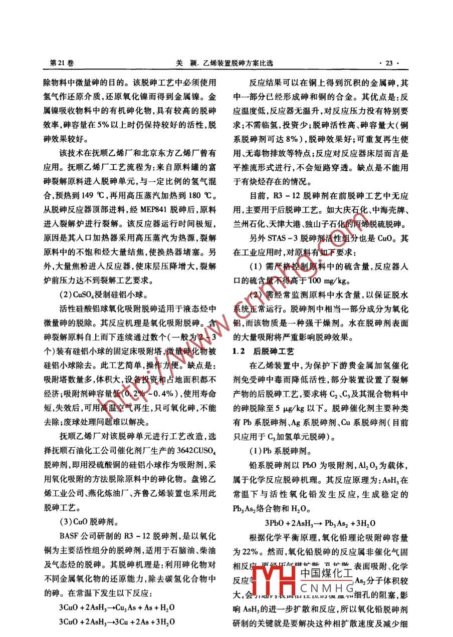 工業(yè)技術(shù)乙烯工業(yè)2009,21(3) 22 ~24.ETHYLENE INDUSTRY乙烯裝置脫砷方案比選(中國(guó)石油撫順石化公司石油二廠研究所,遼寧撫順, 113004)摘要: 通過與多家脫砷催化劑供應(yīng)商進(jìn)行技術(shù)交流,并對(duì)國(guó)內(nèi)乙烯裝置脫砷單元進(jìn)行考察,對(duì)目前國(guó)內(nèi)己烯裝置普遍采用的脫砷方案和脫砷催化劑進(jìn)行評(píng)述、比逸,從而達(dá)到探討脫砷技術(shù)發(fā)展、優(yōu)化脫砷工藝的目的。關(guān)鍵詞:脫砷催化劑;脫砷技術(shù);脫砷工藝方案隨著原油開采的不斷進(jìn)行,石油資源日益貧到最低限度,國(guó)內(nèi)高砷原油的后續(xù)加工裝置均設(shè)化,原油成分也日趨復(fù)雜,某些油田生產(chǎn)的原油砷置預(yù)脫砷單元。筆者通過與多家脫砷催化劑供應(yīng)含量呈逐年上升的趨勢(shì),這種油品性質(zhì)的惡化將商進(jìn)行技術(shù)交流,并對(duì)國(guó)內(nèi)部分乙烯裝置進(jìn)行考直接影響到后續(xù)加工裝置。乙烯裂解裝置是重要察,下面將從脫砷工藝、脫砷催化劑、脫砷工藝方的石油烴加工裝置,其原料-般來源于煉油廠一、案的工業(yè)應(yīng)用等幾方面評(píng)述乙烯裝置脫砷技術(shù)。二次加工的油品或煉廠氣,如石腦油、煤油、柴油、重油、乙烷、丙烷、丁烷,還有一部分天然氣和伴生1乙烯裝 置脫砷工藝氣(見表1)。由表1可見,上述裂解原料中夾雜著根據(jù)工業(yè)應(yīng)用情況看,按照乙烯裝置脫砷位有機(jī)砷化物。置的不同,其脫砷工藝主要分為兩種:- - 是脫砷床表1石油烴中砷化物及其沸點(diǎn)["設(shè)置在裂解爐前,進(jìn)行原料脫砷,即前脫砷工藝;砷化物壓強(qiáng)/kPa佛點(diǎn)/心二是直接設(shè)置在C2/C,加氫反應(yīng)器前,即后脫砷工AsHy101.3-55CH, AsH22藝。而汽油加氫前是否進(jìn)行脫砷則根據(jù)裂解汽油(CH, )2AsH99.635.6中的砷含量及-段加氫催化劑的種類決定。CHs AsH236(CH,)3AsH98.1521.1 前脫砷工藝(C2Hs)zAs140常見的裂解原料脫砷催化劑種類有:Ni系催.(CgH3)zAsH2.7161化劑、CuSO,浸制硅鋁小球、Cu0。其脫砷機(jī)理及(CgH)sAs360乙烯裝置使用的催化劑多數(shù)以鈀、鉑、鎳等過工業(yè)應(yīng)用詳述如下:渡金屬為活性組分,易與砷化物作用而導(dǎo)致催化(1) Ni系催化劑。劑永久性中毒。這些砷化物使鈀等過渡金屬催化法國(guó)IFP脫砷工藝所用的脫砷劑MEP841是劑中毒的機(jī)理為:砷是元素周期表中第V族元素,--種以氧化鎳為活性組分,加氫脫有機(jī)砷工藝。其化合物有3價(jià)和5價(jià)兩種,其中3價(jià)砷可使鈀中其脫砷機(jī)理為:在一-定溫度下,有機(jī)砷化物氫解為毒失活,這是因?yàn)?價(jià)的砷具有孤對(duì)電子,其孤對(duì)AsH, ,利用砷化物能使鎳中毒的特性,以氧化鎳作電子極易形成與第W族的鈀在d軌道形成吸附性為犧牲體,使液態(tài)烴中的砷與鎳結(jié)合,從而達(dá)到脫中國(guó)煤化工極強(qiáng)的配位鍵,形成砷鈀化合物,致使催化劑失去MYHCNMHG活性,即催化劑中毒2]。作者簡(jiǎn)介:關(guān)穎(1975-),女,1998年畢業(yè)于撫順石油學(xué)院化為解決砷化物對(duì)石油烴加工過程中催化劑的工工藝專業(yè),獲工學(xué)學(xué)士學(xué)位,現(xiàn)任撫順石化公司石油二廠研負(fù)面影響,將石油烴加工中的砷化物中毒作用降究所試驗(yàn)員,從事科研開發(fā)工作,工程師。.第21卷關(guān)穎. 乙烯裝置脫砷方案比選●23,除物料中微量砷的目的。該脫砷工藝中必須使用反應(yīng)結(jié)果可以在銅上得到沉積的金屬砷,其氫氣作還原介質(zhì),還原氧化鎳而得到金屬鎳。金中一部分已經(jīng)形成砷和銅的合金。其優(yōu)點(diǎn)是:反屬鎳吸收物料中的有機(jī)砷化物,具有較高的脫砷應(yīng)溫度低,反應(yīng)器無溫升,對(duì)反應(yīng)壓力沒有特別要效率,砷容量在5%以上時(shí)仍保持較好的活性,脫求;不需臨氫,投資少;脫砷活性高、砷容量大(銅砷效果較好。系脫砷劑可達(dá)8%) ,脫砷效果好;可重復(fù)再生使該技術(shù)在撫順乙烯廠和北京東方乙烯廠曾有用、無毒物排放等特點(diǎn);反應(yīng)對(duì)反應(yīng)器床層而言是應(yīng)用。撫順乙烯廠工藝流程為:來自原料罐的富平推流形式進(jìn)行,不會(huì)短路穿透。缺點(diǎn)是不能用砷裂解原料進(jìn)入脫砷單元,與- -定比例的氫氣混于有炔烴存在的情況。合,預(yù)熱到149 C,再用高壓蒸汽加熱到180 C。目前,R3-12脫砷劑在前脫砷工藝中無應(yīng)從脫砷反應(yīng)器頂部進(jìn)料,經(jīng)MEP841脫砷后,原料用,主要用于后脫砷工藝。如大慶石化、中海殼牌、進(jìn)入裂解爐進(jìn)行裂解。該反應(yīng)器運(yùn)行時(shí)間極短,蘭州石化、天津大港獨(dú)山子石化的丙烯脫硫脫砷。原因是其人口加熱器采用高壓蒸汽為熱源,裂解另外STAS -3脫砷劑活性組分也是CuO。其原料中的不飽和烴大量結(jié)焦,使換熱器堵塞。另在工業(yè)應(yīng)用時(shí),對(duì)原料有如下要求:外,大量焦粉進(jìn)人反應(yīng)器,使床層壓降增大,裂解(1)需嚴(yán)格控制原料中的硫含量,反應(yīng)器人爐前壓力達(dá)不到裂解工藝要求??诘牧蚝坎坏酶哂?00 mg/kg。(2)CuSO,浸制硅鋁小球。(2)需經(jīng)常監(jiān)測(cè)原料中水含量,以保證脫水活性硅酸鋁球氧化吸附脫砷適用于液態(tài)烴中系統(tǒng)正常運(yùn)行。脫砷劑中相當(dāng)一部分成分為氧化微量砷的脫除。