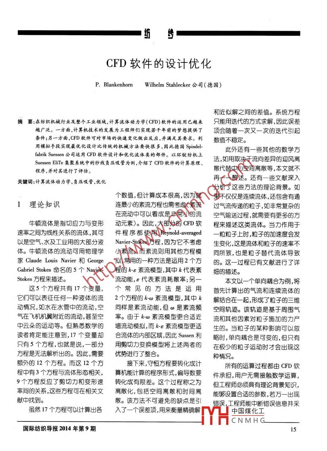 n紡紗Stokes方程的空間離散性通過一未知量加上2 個(gè)紊流模型的方程,2程序設(shè)計(jì)優(yōu)化張網(wǎng)格將流動(dòng)區(qū)域分割成- -一個(gè)個(gè)再乘以51 600個(gè)節(jié)點(diǎn),結(jié)果就是的單元。大部分的CFD軟件包含-個(gè)980萬的巨大方程組。借助Ansys CFX軟件并以紗.一個(gè)網(wǎng)格化模塊, 用于產(chǎn)生四面體下一步要設(shè)定邊界條件。負(fù)線斷頭負(fù)壓吸管為例子,對(duì)程序的和簡(jiǎn)單的六面體網(wǎng)格。本文案例壓吸管壁的速率為0 , EliTube管壁方法進(jìn)行了解釋。圖1為帶EliTe中采用專門的Ansys ICEM CFD軟和EliTe上羅拉的速率為0.3 m/s,集聚系統(tǒng)的牽伸系統(tǒng),負(fù)壓吸管位件產(chǎn)生了復(fù)雜的六面體網(wǎng)格。一其相應(yīng)的運(yùn)輸速率是18 m/min。于EliTe集聚系統(tǒng)的下方,用字母般來說,當(dāng)單元格數(shù)量相同時(shí),六在計(jì)算流域的邊界設(shè)定-開放條“S"表示,白色標(biāo)記的框架表示用面體網(wǎng)格運(yùn)算結(jié)果比四面體運(yùn)算件,使流體能流進(jìn)流出。此外,在于計(jì)算的區(qū)域。牽伸系統(tǒng)的CAD結(jié)果好。主體表面的流體速率總負(fù)壓吸管的末端設(shè)定了800 Pa的模型:是本過程的基礎(chǔ)。首先在被是0,負(fù)壓吸管內(nèi)部的流體速率在靜態(tài)負(fù)壓。所有的設(shè)置意味著流研究區(qū)域的周圍創(chuàng)建一個(gè)足夠大離管 壁0.28 mm的地方增加到約,向可以是流域內(nèi)的任一方向, 同時(shí)的空間,因?yàn)橐M氣流,所以負(fù)40 m/so管壁摩擦力不能忽略,因也會(huì)是CFD軟件的計(jì)算結(jié)果之一。壓吸管的幾何結(jié)構(gòu)和牽伸系統(tǒng)中為在負(fù) 壓吸管表面有著高速率梯由980萬個(gè)方程組成的巨大羅拉的幾何結(jié)構(gòu)是排除在外的。度,幾何結(jié)構(gòu)壁上有多層單元薄方程組無法直接求解,必須依靠運(yùn)用對(duì)稱條件,故只需要模型的一層。圖2展示了Suessen負(fù)壓吸管CFD軟件和算法中的迭代方法,通半。程序在減少一半單元的情況用于計(jì)算 的流體網(wǎng)格。流域上部過求解出軟件的參數(shù)設(shè)置來求解下不會(huì)影響其準(zhǔn)確性。Navier-的腔體代表EliTube 和EliTe.上羅方法,并對(duì)過程加以控制,但這些拉。離散點(diǎn)稱內(nèi)容都超出了本文討論的范圍。為節(jié)點(diǎn),位于每圖2中的一個(gè)小模型如果用單個(gè)個(gè)單元的角落。處理器的話,計(jì)算時(shí)間為2.5 h。圖2的網(wǎng)格包當(dāng)然,現(xiàn)今的電腦有多個(gè)處理器,括490000個(gè)單計(jì)算內(nèi)容可被分成多部分,利用多元和51 600 個(gè)個(gè)處理器并行計(jì)算。如果使用4個(gè)節(jié)點(diǎn)。上面提處理器,則計(jì)算時(shí)間會(huì)縮短到到的方程組必52 min。.須對(duì)每一個(gè)節(jié)點(diǎn)都進(jìn)行求解。3評(píng)價(jià)17個(gè)方程的17個(gè)Navier Stokes現(xiàn)在的CFD軟件能提供可視圖1帶EIiTe集聚系統(tǒng)的牽伸系統(tǒng)圖2 流域的空間分割:網(wǎng)格s油意的法出刑曲線中國(guó)煤化工MYHCNMH G-1國(guó)際紡織導(dǎo)報(bào)2014年第9期.=紡紗圖4 5 μm粒子的流動(dòng)軌跡圖525μm粒子的流動(dòng)軌跡化的計(jì)算結(jié)果,辦、應(yīng)力、壓強(qiáng)、焓、吸力帶走; 另一-方面,負(fù)壓吸管中不同。圖5是直徑為25 μm的粒熵、溫度及熱通量都可以可視化,的黏性粒子體應(yīng)該被控制,如果被子的流動(dòng)軌跡,粒子和吸管間有接甚至一些紊流量(如螺旋度、渦流包裹的黏性粒子的沖擊角過大,則觸,但沖擊角可以忽略。強(qiáng)度、漩渦等)也是如此。圖3為包裹物被沖開 ,黏性粒子就會(huì)沉淀總之,在CFD軟件的幫助下,純空氣流,從流線型曲線可以看在負(fù)壓管壁上。由空氣運(yùn)送的纖不同的設(shè)計(jì)行為都能當(dāng)成設(shè)計(jì)過到,空氣流從選定的散點(diǎn)開始,不維可能附著在黏性粒子上,因此建程的一部分來進(jìn)行研究,在第一 個(gè)同顏色表示不同的空氣流速。在議避免產(chǎn)生過大的沖擊角。CFI標(biāo)準(zhǔn)件生產(chǎn)出來之前,流體相關(guān)部計(jì)算的流域邊界處空氣流速幾乎軟件模擬可 用于優(yōu)化幾何模型的分的系統(tǒng)優(yōu)化可以不斷完善。因?yàn)榱?而在負(fù)壓吸管內(nèi)則達(dá)到了參數(shù), 研究-系列設(shè)計(jì)變量,并選此,該模擬證明, Suessen有快速滿40 m/s。-旦有紗線斷頭被吸入,擇最優(yōu)的設(shè)計(jì)。 圖4是直徑為足市場(chǎng)要求的能力。就會(huì)被空氣帶走,過程非常有意5 μm的小粒子的流動(dòng)軌跡,其粒思。一方面,原棉中的廢棄物或灰子的運(yùn)動(dòng)與氣流的運(yùn)動(dòng)大體相同。肖偉民譯顏雪校塵粒子不能飄到機(jī)器外面,而應(yīng)被但粒子的行為會(huì) 隨直徑的增加而Design optimization by means of CFDPeter Blankenhorn, Wilhelm Stahlecker GmbH, Supen/GermanyAbstract: In textile machinery as well as in industry as a whole , the use of computational fuid dynamics (CFD) hasan ever increasing relevance. On the one hand, the development of computer technology provides processingpower engineers could only have dreamed of a few years ago. On the other hand, this enables an immediatereaction to the rapidly changing requirements of the market. A design opimization by simulation is considerablyfaster than the traditional procedure by mechanical trials. Spindlfabrik Suessen Gm