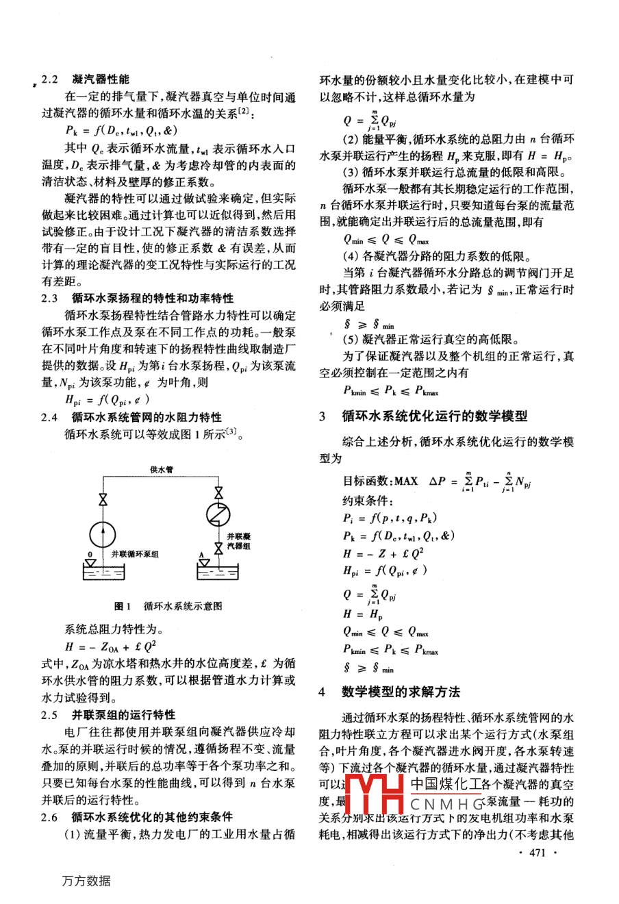 第24卷,總第139期節(jié)能技術(shù)》Vol 24 Sum. No. 1392006年9月,第5期ENERGY CONSERVATION TECHNOLOGYSep.2006,No.5循環(huán)水系統(tǒng)的優(yōu)化分析李偉(上海交通大學(xué),上海200摘要:通過(guò)對(duì)循環(huán)水系統(tǒng)的影響因素分析,建立其優(yōu)化運(yùn)行數(shù)學(xué)模型,從而進(jìn)行優(yōu)化計(jì)算,并與原運(yùn)行方式進(jìn)行比較,從而提出新的建議和運(yùn)行方式,提高機(jī)組經(jīng)濟(jì)性。關(guān)鍵詞:循環(huán)水系統(tǒng);優(yōu)化模型;經(jīng)濟(jì)性中圖分類(lèi)號(hào):K267文獻(xiàn)標(biāo)識(shí)碼:A文章編號(hào):1002-6339(2006)05-0470-04Optimization Analyses on Water Circulating System of Thermal Power UnitLI WeiCollege of Mechanical Engineering, Shanghai Jiaotong University, Shanghai 200030, China)Abstract: With the help of the influencing factor analyses, an optimizing model on water circulating system isestablished In order to improve the performance of thermal power units, the author presents the proposals on theunit runingrough optimizing calculation and comparison of operaKey words: water circulating system; optimizing model; ecnomical characteristic循環(huán)水系統(tǒng)是火力發(fā)電廠的一個(gè)重要系統(tǒng),消MAX△P耗很大一部分廠用電,相當(dāng)于總發(fā)電量的1.5%Ne2%(12由于循環(huán)水系統(tǒng)設(shè)備性能的改變,使得原先式中△P各機(jī)組發(fā)電量與各循環(huán)水泵耗電量的設(shè)計(jì)運(yùn)行方式變的并非最優(yōu),得出基于設(shè)計(jì)曲線(xiàn)之差和試驗(yàn)方式等獲得設(shè)備性能的計(jì)算結(jié)果會(huì)隨著設(shè)備P1第i臺(tái)機(jī)組的發(fā)電量,i=1,2,…,性能變化而出現(xiàn)與實(shí)際最優(yōu)不符的情況,從而增大m,m為機(jī)組臺(tái)數(shù)了發(fā)電煤耗。循環(huán)水系統(tǒng)的優(yōu)化運(yùn)行實(shí)質(zhì)上是尋找N—第j臺(tái)循環(huán)泵的耗電量,=1,2機(jī)組的最佳真空,通過(guò)對(duì)循環(huán)水系統(tǒng)的影響因素進(jìn)…,n,n為循環(huán)泵臺(tái)數(shù)行分析建立優(yōu)化模型從而保證循環(huán)水系統(tǒng)按最優(yōu)2循環(huán)水系統(tǒng)優(yōu)化數(shù)學(xué)模型相關(guān)的設(shè)備性運(yùn)行,提高機(jī)組經(jīng)濟(jì)性。能特性1循環(huán)水系統(tǒng)優(yōu)化模型中目標(biāo)函數(shù)的建立2.1汽輪機(jī)微增功率性能循環(huán)水系統(tǒng)經(jīng)濟(jì)運(yùn)行研究就是要尋找一種合理在某一新蒸汽參數(shù)和流量條件下汽輪機(jī)輸出功的運(yùn)行方式。在該方式下機(jī)組出力增量總和與水泵率與排氣壓力的關(guān)系耗功增加的總量之差最大,此時(shí),機(jī)組的運(yùn)行經(jīng)濟(jì)性最高,故目標(biāo)函數(shù)為取=八P,t,q,)中國(guó)煤化工度流量,P表示機(jī)組背YHa驗(yàn)得出,一般在小范圍CNMHG收稿日期2006-08-05修訂稿日期2006-09作者簡(jiǎn)介:李偉(1976~),男,在職研究生,工程師2凝汽器性能環(huán)水量的份額較小且水量變化比較小,在建模中可在一定的排氣量下,凝汽器真空與單位時(shí)間通以忽略不計(jì),這樣總循環(huán)水量為過(guò)凝汽器的循環(huán)水量和循環(huán)水溫的關(guān)系(2)Pk= f(De, twl, Q,&)e= tepi其中Q。表示循環(huán)水流量,tn表示循環(huán)水入口(2)能量平衡,循環(huán)水系統(tǒng)的總阻力由n臺(tái)循環(huán)溫度,D表示排氣量,&為考慮冷卻管的內(nèi)表面的水泵并聯(lián)運(yùn)行產(chǎn)生的揚(yáng)程H來(lái)克服,即有H=H3)循環(huán)水泵并聯(lián)運(yùn)行總流量的低限和高限。清潔狀態(tài)、材料及壁厚的修正系數(shù)。循環(huán)水泵一般都有其長(zhǎng)期穩(wěn)定運(yùn)行的工作范圍,凝汽器的特性可以通過(guò)做試驗(yàn)來(lái)確定,但實(shí)際做起來(lái)比較困難。通過(guò)計(jì)算也可以近似得到然后用臺(tái)循環(huán)水泵并聯(lián)運(yùn)行時(shí),只要知道每臺(tái)泵的流量范試驗(yàn)修正。由于設(shè)計(jì)工況下凝汽器的清潔系數(shù)選擇圍,就能確定出并聯(lián)運(yùn)行后的總流量范圍即有帶有一定的盲目性,使的修正系數(shù)&有誤差,從而Qmn≤Q≤Qn計(jì)算的理論凝汽器的變工況特性與實(shí)際運(yùn)行的工況(4)各凝汽器分路的阻力系數(shù)的低限。當(dāng)?shù)趇臺(tái)凝汽器循環(huán)水分路總的調(diào)節(jié)閥門(mén)開(kāi)足有差距時(shí),其管路阻力系數(shù)最小,若記為§-,正常運(yùn)行時(shí)3循環(huán)水泵揚(yáng)程的特性和功率特性循環(huán)水泵揚(yáng)程特性結(jié)合管路水力特性可以確定必須滿(mǎn)足循環(huán)水泵工作點(diǎn)及泵在不同工作點(diǎn)的功耗。一般泵s≥§(5)凝汽器正常運(yùn)行真空的高低限。在不同葉片角度和轉(zhuǎn)速下的揚(yáng)程特性曲線(xiàn)取制造廠為了保證凝汽器以及整個(gè)機(jī)組的正常運(yùn)行,真提供的數(shù)據(jù)設(shè)Hp為第i臺(tái)水泵揚(yáng)程,Qp為該泵流量,Ni為該泵功能,g為葉角,則空必須控制在一定范圍之內(nèi)有Pk≤Pk≤Pknxf(Qpi, g)2.4循環(huán)水系統(tǒng)管網(wǎng)的水阻力特性3循環(huán)水系統(tǒng)優(yōu)化運(yùn)行的數(shù)學(xué)模型循環(huán)水系統(tǒng)可以等效成圖1所示3)。綜合上述分析,循環(huán)水系統(tǒng)優(yōu)化運(yùn)行的數(shù)學(xué)模型為供水管目標(biāo)函數(shù)MAX△P=ΣPt-2N約束條件Pi= f(p, t, g, Pk)并聯(lián)凝Pk=f(c,wI,Yt