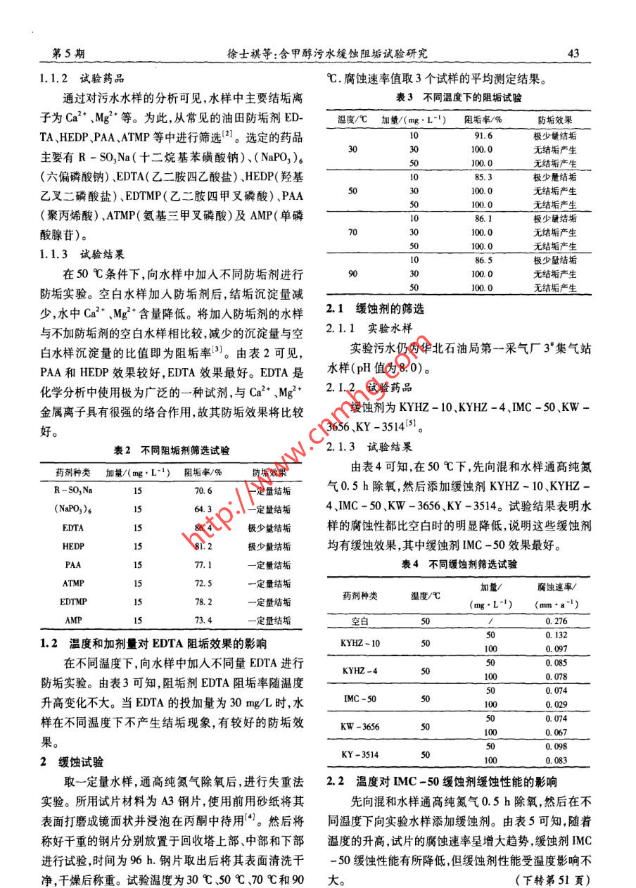 含甲醇污水緩蝕阻垢試驗研究