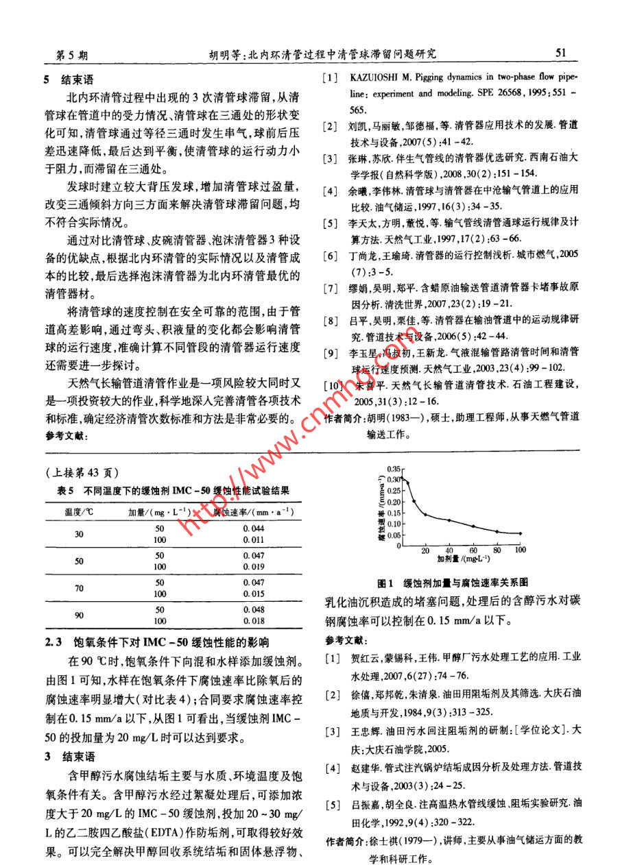 2010年.管道_技術(shù)5設(shè)備2010第5期Pipeline Technique_ and EquipmentNo.5含甲醇污水緩蝕阻垢試驗研究徐士祺' ,楊文勝2 ,王建偉2(1.西安石油大學(xué)石油工程學(xué)院,陜西西安710065 ;2.吐哈油田公司鄞善采油廠新疆吐魯番838202)摘要:油氣田產(chǎn)出的污水,礦化度一般較高,油分和機(jī)械雜質(zhì)含量都較高,經(jīng)絮凝劑除掉懸浮顆粒后還具有結(jié)垢和腐蝕的傾向。文中對華北石油局采氣廠的污水進(jìn)行了阻垢試驗和緩蝕試驗,經(jīng)過對幾組不同的阻垢劑和緩蝕劑的實驗效果的對比,選出了適合水質(zhì)特點的阻垢劑和緩蝕劑,并對相關(guān)的影響因素進(jìn)行了分析,得出添加濃度大于20 mg/L的IMC-50緩蝕劑,投加量為20 ~30 mg/L的乙二胺四乙酸鹽(EDTA)作防垢劑,可取得較好效果。關(guān)鍵詞:含醇污水;阻垢;緩蝕中圖分類號:TE98文獻(xiàn)標(biāo)識碼:A .文章編號:1004 -9614(2010)05 -0042 -02An Experiment Study of Corrosion and Scale Inhibiting ofWaste Water Containing MethanolXU Shi-qi' ,YANG Wen-sheng' ,WANG Jian-wei?(1. Xi'an Shiyou University ,Xi'an 710065 ,China;2. The Shanshan Production Factory of Tuha Field Company , Turpan 838202 ,China)Abstract:The waste water produced by oil and gas fields is characterized by a higher mineralization degree and a highercontent of oil and suspended solids. After the suspended solids are removed by the flocculation agent, the waste water tends toscale and corrode. The scale and corosion inhibiting agent is determined on the basis of the waste water quality charateristics bythe scale and corrosion inhibiting experiment , and the influence factor is intoduced.Key words: waste water containing methanol ;scale inhibiting;corrosion inhibiting0引言1阻垢試驗?zāi)壳?國內(nèi)外普遍采用回注地層、綜合利用和外通過對污水產(chǎn)生的結(jié)垢物進(jìn)行現(xiàn)場分析后發(fā)現(xiàn),排等方法將油氣田水排出。國內(nèi)大部分油氣田水被結(jié)垢物 主要為碳酸鹽垢( CaCO3)、硫酸鹽垢(主要為注人枯竭井或廢棄井,但因回注前預(yù)處理工藝不完CaSO,)、泥沙和少量的其他含鐵化合物及油等有機(jī)善,回注地層被堵塞和管線腐蝕現(xiàn)象時有發(fā)生,使作物?;瘜W(xué)阻垢是油氣田最為常用的抑制和緩解結(jié)垢業(yè)受阻,因此有必要對氣田水水質(zhì)進(jìn)行預(yù)處理。的一項工藝技術(shù)”。為了防止結(jié)垢,需在地面流程、實驗中的污水取自華北石油局第一采氣廠,該污油井和注水站連續(xù)或間歇地向系統(tǒng)中投加阻垢劑。水以CaCl2型為主,水質(zhì)特點是礦化度非常高,油分和1.1阻垢劑的篩選機(jī)械雜質(zhì)含量也較高,pH值較低,屬于易結(jié)垢、腐蝕1.1.1 試驗水樣性強(qiáng)的污水體系。含甲醇污水組成復(fù)雜,且是-一個比實驗污水為華北石油局第一采氣廠 3"集氣站水較穩(wěn)定的膠體體系,若在污水進(jìn)入儲罐前投加緩蝕阻樣(pH值為8.0),污水水質(zhì)見表1。表1中,礦化度垢劑,藥劑會被污水體系中的懸浮物等吸附、包裹、不為96650mg/L.能充分?jǐn)U散,達(dá)不到預(yù)期的效果,也必然造成藥劑的表1實驗污水的水質(zhì)浪費。因此,把緩蝕阻垢劑加藥點選在沉降過濾后較為適宜。此外,加入適合水質(zhì)特點的緩蝕阻垢劑可以,組分含量/(mg.L-1)含量/(mg.L-I)C1-49 058S2+ +Ba20達(dá)到很好的處理效果,又可以降低經(jīng)濟(jì)成本。HCO;316. 6582.42so?-297.31Fe3+Ca2+15418油214.6收稿日期:2008-10-20收修改稿日期:2010-04 -20_Mg2*1 654.4機(jī)雜963. 8..第5期徐士祺等:含甲醇污水緩蝕阻垢試驗研究431.1.2 試驗藥品C.腐蝕速率值取3個試樣的平均測定結(jié)果。通過對污水水樣的分析可見,水樣中主要結(jié)垢離表3不同溫度下的阻垢試驗子為Ca2*、Mg*等。為此,從常見的油田防垢劑ED-溫度/C加量/(mg.L")阻垢率/%防垢效果TA、HEDP、PAA .ATMP等中進(jìn)行篩選2]。選定的藥品191.6極少量結(jié)垢30100.0無結(jié)垢產(chǎn)生主要有R-SO,Na(十二烷基苯磺酸鈉)、(NaPO3)。_5100. 0(六偏磷酸鈉) EDTA(乙二胺四乙酸鹽)、HEDP(羥基:85.3503C乙叉二磷酸鹽)、EDTMP(乙二胺四甲叉磷酸)、PAA_S(聚丙烯酸)、ATMP(氨基三甲叉磷酸)及AMP(單磷86.1酸腺苷)。701.1.3 試驗結(jié)果86.5在50C條件下,向水樣中加入不同防垢劑進(jìn)行90防垢實驗??瞻姿畼蛹尤朔拦竸┖螅Y(jié)垢沉淀量減_5(少,水中Ca2*、Mg*含量降低。將加人防垢劑的水樣2.1緩蝕劑的篩選與不加防垢劑的空白水樣相比較,減少的沉淀量與空2.1.1實驗水樣白水樣沉淀量的比值即為阻垢率3。由表2可見,實驗污水仍為華北石油局第一采氣廠3"集氣站PAA和HEDP效果較好,EDTA效果最好。EDTA 是水樣(pH值為8.0)?;瘜W(xué)分析中使用極為廣泛的一-種試劑,與Ca2*、Mg2'2.1.2試驗藥品金屬離子具有很強(qiáng)的絡(luò)合作用,故其防垢效果將比較緩蝕劑為KYHZ - 10、KYHZ -4、MC -50、KW -3656、KY -3514[5]。好。表2不同阻垢劑篩選試驗2.1.3試驗結(jié) 果由表4可知,在50C下,先向混和水樣通高純氮藥劑種類加量/(mg.川)_阻垢奉/%R- SO,Na1:70.6一定量結(jié)垢氣0.5h除氧,然后添加緩蝕劑KYHZ-10、KYHZ-(NaPO,)。64. 34 IMC-50、KW - 3656.KY -3514。試驗結(jié)果表明水EDTA1586.4樣的腐蝕性都比空白時的明顯降低,說明這些緩蝕劑HEDP81.2均有緩蝕效果,其中緩蝕劑IMC -50效果最好。PAA77.1表4不同緩蝕劑篩 選試驗ATMP72. 5加量/腐蝕速率/溫度/CEDTMP78.2(mg.L1)(mm.a~')AMP73.40. 2760. 1321.2溫度和加劑量對 EDTA阻垢效果的影響KYHZ -1000_0.097在不同溫度下,向水樣中加人不同量EDT