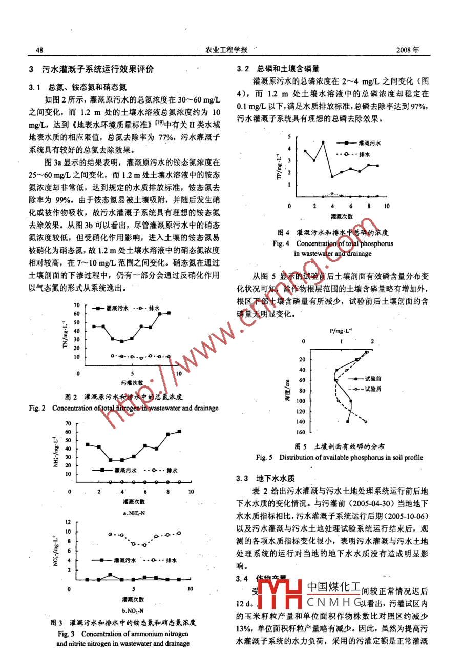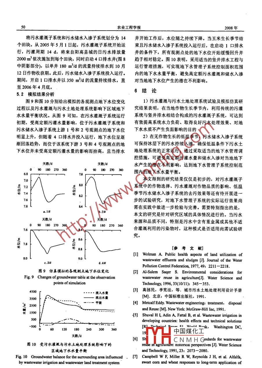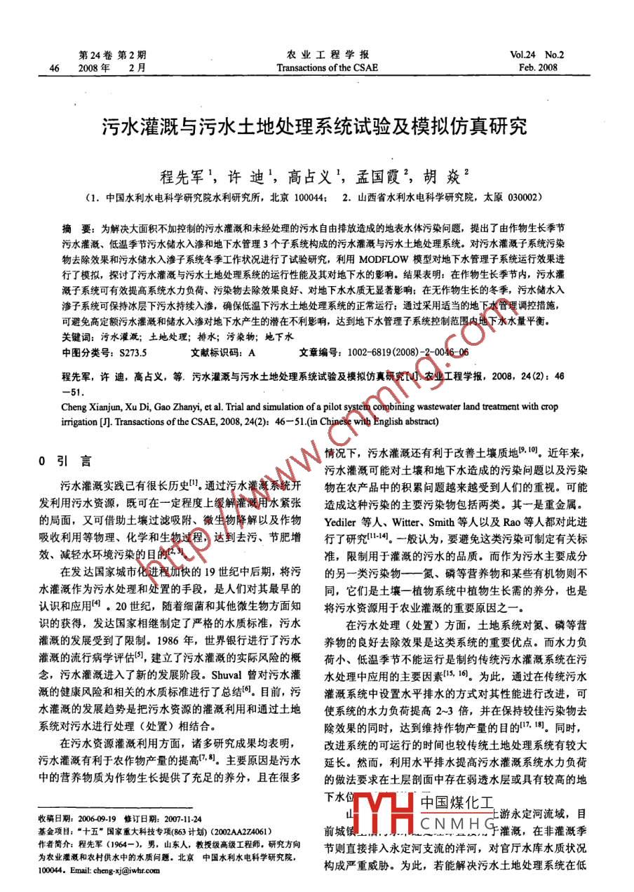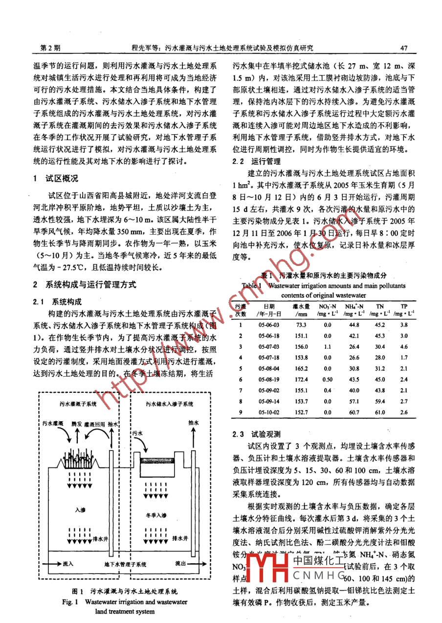 第24卷第2期農(nóng)業(yè)工程學(xué)報(bào)Vol.24 No.2_42008年2月Transactions of the CSAEFeb. 2008污水灌溉與污水土地處理系統(tǒng)試驗(yàn)及模擬仿真研究程先軍',許迪',高占義',孟國(guó)霞”,胡焱(1.中國(guó)水利水電科學(xué)研究院水利研究所,北京10044; 2. 山西省水利水電科學(xué)研究院,太原030002)摘要:為解決大面積不加控制的污水灌溉和未經(jīng)處理的污水自由排放造成的地表水體污染問(wèn)題,提出了由作物生長(zhǎng)季節(jié)污水灌溉、低溫季節(jié)污水儲(chǔ)水入滲和地下水管理3個(gè)子系統(tǒng)構(gòu)成的污水灌溉與污水土地處理系統(tǒng)。對(duì)污水灌溉子系統(tǒng)污染物去除效果和污水儲(chǔ)水入滲子系統(tǒng)冬季工作狀況進(jìn)行了試驗(yàn)研究,利用MODFLOW模型對(duì)地下水管理子系統(tǒng)運(yùn)行效果進(jìn)行了模擬,探討了污水灌溉與污水土地處理系統(tǒng)的運(yùn)行性能及其對(duì)地下水的影響。結(jié)果表明:在作物生長(zhǎng)季節(jié)內(nèi),污水灌溉子系統(tǒng)可有效提高系統(tǒng)水力負(fù)荷、污染物去除效果良好、對(duì)地下水水質(zhì)無(wú)顯著影響;在無(wú)作物生長(zhǎng)的冬季,污水儲(chǔ)水入滲子系統(tǒng)可保持冰層下污水持續(xù)入滲,確保低溫下污水土地處理系統(tǒng)的正常運(yùn)行:通過(guò)采用適當(dāng)?shù)牡叵滤芾碚{(diào)控措施,可避免高定額污水灌溉和儲(chǔ)水入滲對(duì)地下水產(chǎn)生的潛在不利影響,達(dá)到地下水管理子系統(tǒng)控制范圍內(nèi)地下水水量平衡。關(guān)鍵詞:污水灌溉;土地處理;排水;污染物;地下水中圖分類號(hào): S273.5文獻(xiàn)標(biāo)識(shí)碼: A文章編號(hào): 1002 6819(2008) -2-0046-06程先軍,許迪,高占義,等.污水灌溉與污水土地處理系統(tǒng)試驗(yàn)及模擬仿真研究[J].農(nóng)業(yè)工程學(xué)報(bào),2008, 24(2): 46-51Cheng Xianjum, Xu Di, Gao Zhanyi, et al. Trial and simulation of a pilot system combining wastewater land treatment with cropirigation [I]. Transactions of the CSAE, 2008, 24(2); 46- 51.(in Chinese with English abstract)情況下,污水灌溉還有利于改善土壤質(zhì)地9.10。近年來(lái),0引言污水灌溉可能對(duì)土壤和地下水造成的污染問(wèn)題以及污染污水灌溉實(shí)踐已有很長(zhǎng)歷史”。通過(guò)污水灌溉系統(tǒng)開(kāi)物在農(nóng)產(chǎn)品中的積累問(wèn)題越來(lái)越受到人們的重視??赡馨l(fā)利用污水資源,既可在-定程度上緩解灌溉用水緊張?jiān)斐蛇@種污染的主耍污染物包括兩類。其一是重金屬。的局面,又可借助土壤過(guò)濾吸附、微生物降解以及作物Yediler 等人、Witter. Smith 等人以及Rao等人都對(duì)此進(jìn)吸收利用等物理、化學(xué)和生物過(guò)程,達(dá)到去污、節(jié)肥增行了研究11-4。一般認(rèn)為,要避免這類污染可制定有關(guān)標(biāo)效、減輕水環(huán)境污染的目的23)。準(zhǔn),限制用于灌溉的污水的品質(zhì)。而作為污水主要成分在發(fā)達(dá)國(guó)家城市化進(jìn)程加快的19世紀(jì)中后期,將污的另- -類污染物--氮、 磷等營(yíng)養(yǎng)物和某些有機(jī)物則不水灌溉作為污水處理和處置的手段,是人們對(duì)其最早的同,它們是土壤- -植物系統(tǒng)中植物生長(zhǎng)需的養(yǎng)分,也是認(rèn)識(shí)和應(yīng)用41。20世紀(jì),隨著細(xì)菌和其他微生物方面知將污水資源用于農(nóng)業(yè)灌溉的重要原因之一。識(shí)的獲得,發(fā)達(dá)國(guó)家相繼制定了嚴(yán)格的水質(zhì)標(biāo)準(zhǔn),污水在污水處理(處置)方面,土地系統(tǒng)對(duì)氮、磷等營(yíng)灌溉的發(fā)展受到了限制。1986 年,世界銀行進(jìn)行了污水養(yǎng)物的良好去除效果是這類系統(tǒng)的重要優(yōu)點(diǎn)。而水力負(fù)灌溉的流行病學(xué)評(píng)估),建立了污水灌溉的實(shí)際風(fēng)險(xiǎn)的概荷小、低溫季節(jié)不能運(yùn)行是制約傳統(tǒng)污水灌溉系統(tǒng)在污念,污水灌溉進(jìn)入了新的發(fā)展階段。Shuval 曾對(duì)污水灌水處理中應(yīng)用的主要因素[I5, 16。為此,通過(guò)在傳統(tǒng)污水溉的健康風(fēng)險(xiǎn)和相關(guān)的水質(zhì)標(biāo)準(zhǔn)進(jìn)行了總結(jié)問(wèn)。目前,污灌溉系統(tǒng)中設(shè)置水平排水的方式對(duì)其性能進(jìn)行改進(jìn),可水灌溉的發(fā)展趨勢(shì)是把污水資源的灌溉利用和通過(guò)土地使系統(tǒng)的水力負(fù)荷提高2~3倍,并在保持較佳污染物去系統(tǒng)對(duì)污水進(jìn)行處理(處置)相結(jié)合。除效果的同時(shí),達(dá)到維持作物產(chǎn)量的目的17,18。同時(shí),在污水資源灌溉利用方面,諸多研究成果均表明,改進(jìn)系統(tǒng)的可運(yùn)行的時(shí)間也較傳統(tǒng)土地處理系統(tǒng)有較大污水灌溉有利于農(nóng)作物產(chǎn)量的提高(7,8。主要原因是污水延長(zhǎng)。然而,利用水平排水提高污水灌溉系統(tǒng)水力負(fù)荷中的營(yíng)養(yǎng)物質(zhì)為作物生長(zhǎng)提供了充足的養(yǎng)分,且在很多的做法要求在土層剖面中存在弱透水層或具有較高的地下水位中國(guó)煤化工收稿日期: 2006-09-19 修訂日期: 207-1124上游永定河流域,目基金項(xiàng)目:“十五"國(guó)家重大科技專項(xiàng)(863計(jì)劃) (002A2Z4061)前城鎮(zhèn)MYHCNMHCF灌溉,在非灌酒季作者簡(jiǎn)介:程先軍(1964-),男,山東人,教授級(jí)