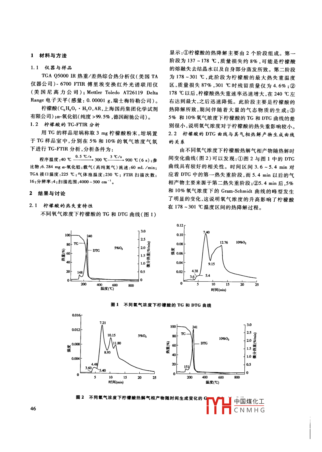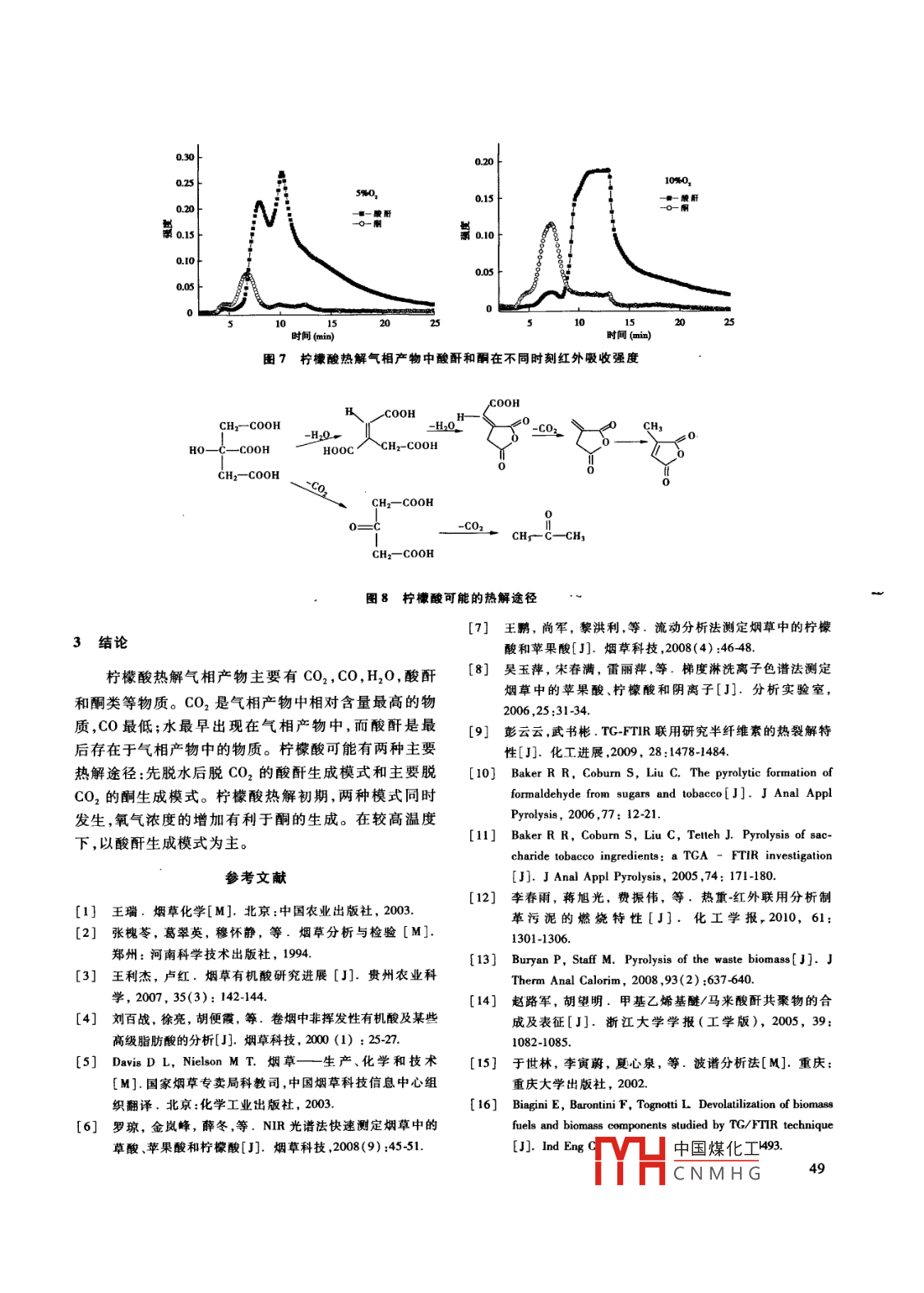草科技/ Tobacco Science& Technology煙草化學(xué)/ Tobucco Chemistry201l年第9期(總第290期)檸檬酸的熱解特性周順,徐迎波,王程輝,田振峰安徽中煙工業(yè)有限責(zé)任公司技術(shù)中心,合肥市高新區(qū)天達(dá)路9號230088關(guān)鍵詞:檸檬酸;熱重-紅外;熱裂解;氣相產(chǎn)物摘要:使用熱失重/傅里葉變換紅外聯(lián)用(TG-FTIR)技術(shù)研究了檸檬酸的熱裂解特性,測定并比較了不同氧氣濃度下檸樽酸的熱重(TG)和微商熱重(DG)曲線,以及檸檬酸熱解氣相產(chǎn)物相對含量和生成規(guī)律,探討了檸檬酸可能的熱解機(jī)制。結(jié)果表明:①檸檬酸的熱解氣相產(chǎn)物主要有CO2,CO,H2O,酸酐和酮類物質(zhì)。CO2是氣相產(chǎn)物中相對含量最高的物質(zhì),CO最低;水最早出現(xiàn)在氣相產(chǎn)物中,酸酐是最后存在于氣相產(chǎn)物中的物質(zhì);②檸檬酸可能有2種主要熱解途徑:先脫水后脫CO2的酸酐生成模式和主要脫CO2的酮生成模式。在熱解初期,2種模式同時(shí)發(fā)生,氧氣濃度的增加有利于酮的生成。在較高溫度下,主要以酸酐生成模式為主中圖分類號:TS264.3文獻(xiàn)標(biāo)識碼:A文章編號:1002-0861(2011)09-0045-05Pyrolytic Behavior of Citric AcidZHOU SHUN XU YING-BO, WANG CHENG-HUI, and TIAN ZHEN-FENGTechnology Center, China Tobacco Anhui Industrial Co., Ltd., Hefei 230088, ChitKeywords: Citric acid; TG-FTIR; Pyrolysis; Gas phase productAbstract: The pyrolytic behavior of citric acid was investigated by thermogravimetric system coupled to Fouriertransform infrared spectrometer(TG-FTIR ) The TG curves, DTG curves, and relative contents of pyrolyticgas phase products of citric acid in oxygen of different concentrations were determined and compared. Theformation rules of gas phase products and pyrolytic mechanism of citric acid were explored. The results showedthat 1)The main pyrolytic gas phase products of citric acid included CO2, H2O, CO, anhydride and ketonecompounds, in which CO, was the major, while CO was the minor, H,0 emerged first, while anhydride theast.2)There might exist two pyrolytic pathways, in one of the pathways citric acid was dehydrated and thendecarbonated to form anhydride, and in the other to form ketones mainly by decarbonation. At the initialpyrolytic stage, both pathways coexisted, increasing oxygen concentration would benefit the formation ofketones. While at higher temperature, anhydride formation dominated檸檬酸是煙草中重要的非揮發(fā)性有機(jī)酸2,能與生物堿結(jié)合成鹽,調(diào)節(jié)煙草中堿性成分的揮發(fā)性,在燃燒過程中分解產(chǎn)生的酸性片段可調(diào)節(jié)煙氣中質(zhì)子化基金項(xiàng)目:安徽中煙工業(yè)公司科技項(xiàng)目(20111004)“造紙法煙和游離態(tài)煙堿的比例,從而影響煙葉的勁頭和吸草薄片燃燒熱解行為及其應(yīng)用研究”。味31。目前關(guān)于檸檬酸的研究文獻(xiàn)多集中在分離和作者簡介:周順(1982-),博士,研究方向:煙草燃燒化學(xué)和降焦快速測定方面6。,而熱解特性研究很少。熱重-紅外減害。E-mail:zhous@mail.ustc.edu.cn電話:0551-5738652聯(lián)用儀器具有升溫速率和熱解氣氛可調(diào)的優(yōu)點(diǎn),已被收稿日期:2011-03-2廣泛用于熱解行為和機(jī)理研究1),但用其研究檸檬責(zé)任編輯:劉立全E-mail:lq@tobaccoinfo.com.cn酸的熱解特性鮮見報(bào)道。因此,進(jìn)行了本研究,旨在進(jìn)電話:037167672637步了解檸檬酸TH中國煤化工。CNMHG1材料與方法顯示:①檸檬酸的熱降解主要由2個(gè)階段組成。第階段為137~178℃,質(zhì)量損失約8%,可能是檸檬酸1.1儀器與樣品的熔融失去結(jié)晶水以及自身部分蒸發(fā)所致。第二階段TGAQ5000IR熱重/差熱綜合熱分析儀(美國TA為178~301℃,此階段為檸檬酸的最大熱失重溫度儀器公司)-6700FTIR傅里埃變換紅外光譜聯(lián)用儀區(qū),質(zhì)量損失87%,301℃時(shí)殘留質(zhì)量僅為4.6%;②(美國尼高力公司); Mettler Toledo AT26119 Delta178℃以后,檸檬酸熱失重速率迅速增大,在240℃左Range電子天平〔感量:o.0000g,瑞土梅特勒公司)。右達(dá)到最大,之后迅速降低。此階段主要是檸檬酸的檸檬酸(C6HO,·H2O,AR,上海國藥集團(tuán)化學(xué)試劑熱降解所致,期間伴隨著大量的氣態(tài)物質(zhì)的生成;③有限公司);a-氧化鋁(純度>99.5%,德國耐馳公司)。5%和10%氧氣濃度下檸檬酸的TG和DTG曲線的差1.2檸檬酸的TG-FTIR分析別很小,說明氧氣濃度對于檸檬酸的熱失重影響較小。用τG的樣品坩堝稱取3mg檸檬酸粉末,坩堝置2.2檸檬酸的DG曲線與其氣相熱解產(chǎn)物生成曲線于TG樣品室中,分別在5%和10%的氧氣濃度氣氛的關(guān)系下進(jìn)行 TG-FTIR分析,分析條件為由不同氧氣濃度下檸檬酸熱解氣相產(chǎn)物隨熱解時(shí)程序溫度:40℃05℃30℃3℃,90℃(6);參間變化曲線(圖2)可以發(fā)現(xiàn):①圖2與圖1中的Dc比物:6284mga氧化鋁載氣(高純氮?dú)?流速:60mL/min;曲線具有較好的相關(guān)性。時(shí)間區(qū)間3.6~54min對TGA接口溫度:25℃;氣體池溫度:230℃;FTIR掃描次數(shù):應(yīng)著DTG中的第一熱失重階段,而5.4min以后的氣16;分辨率:4;掃描范圍:4000-500cm-1相產(chǎn)物主要來源于第二熱失重階段;②5.4min后,5%2結(jié)果與討論和10%氧氣濃度下的Gram- Schmidt曲線的峰型發(fā)生了明顯的變化,這說明氧氣濃度的升高影響了檸檬酸2.1檸檬酸的熱失重特性在178~301℃溫度區(qū)間的熱降解過程。不同氧氣濃度下檸檬酸的TG和DTG曲線(圖1)127610%215915時(shí)間圖1不同氧氣濃度下檸檬酸的TG和DTG曲線00125%0210%O020004104010400時(sh