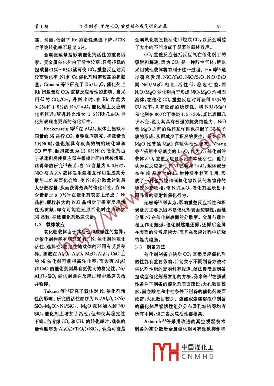 天然氣化工1999年第24卷變論「甲資(0臺動綜述研究進展丁榮剛,閻子峰∵,錢嶺(山東石油大學煉制系東營257062)摘要:系統(tǒng)回顧和總結(jié)了當前甲烷和二氧化碳重整反應研究現(xiàn)狀,分析了催化劑研究狀況反應機理和動力學行為及催化劑失活特性。探索抑制催化劑積碳失活的有效途徑是CO2重整過程開發(fā)成功的關(guān)鍵關(guān)鍵詞:CO2重整;催化劑;反應機理;動力學;失活0引言效應,改善人類生活居住環(huán)境因而具有重大的戰(zhàn)略意義隨著現(xiàn)代工業(yè)的迅速發(fā)展,人類向大氣中1CO2/CH4重整制合成氣催化排放的CO2正以每年4%的速度遞增。CO2在大氣層中的大量累計造成全球性的溫室效應,劑研究現(xiàn)狀使地球平均溫度升高,氣候惡化給人類的生1.1金屬活性組分產(chǎn)和生活造成了嚴重的影響。但限制CO2的人們通過研究發(fā)現(xiàn),大多數(shù)第Ⅷ族過渡金排放在很大程度上影響現(xiàn)代工業(yè)和世界經(jīng)濟屬催化劑對CO2重整反應均具有催化活性發(fā)展,因此合理有效地利用Co2已成為一個不同催化劑的性能比較表明,Ru、Rh、Ir等貴越來越迫切的問題。金屬催化劑是CO2重整轉(zhuǎn)化反應的優(yōu)良催化隨著石油資源的日益枯竭天然氣資源將劑,催化活性高,抗積炭性能強穩(wěn)定性好,在因其可觀的蘊藏量而成為下個世紀最有希望高溫可使甲烷獲得較高的轉(zhuǎn)化率對非貴金屬的替代能源和化工原料之一?!捌呶濉逼陂g的勘催化劑的研究表明,它對CO2重整反應的催探表明,我國天然氣資源的遠景儲量達43×化活性序列為N>Co>Cu>Fe.擔載型Ni102m2,占世界天然氣儲量的10%。相對于巨催化劑抗積炭性能較好,具有較高的轉(zhuǎn)化活大的資源優(yōu)勢,天然氣的利用水平還相當?shù)?。性、選擇性和穩(wěn)定性,同時價格便宜因而引起因此將天然氣通過化學途徑轉(zhuǎn)化為易于運輸眾多研究者的注意。的液體燃料或高附加值的化工產(chǎn)品已成為化除了第Ⅷ族過渡金屬外,其它金屬也可作學家們面臨的重大課題之一為二氧化碳重整反應的催化劑。一種錳基催化前工業(yè)上應用的水汽重整工藝操作彈劑在1200K下可獲得高收率合成氣而且不性小,能耗大,維修費用高,龍其是產(chǎn)物中H/會發(fā)生積炭。然而這種催化劑的活性比第CO比太高,不適合作為羰基合成和含氧有機族過渡金屬要低得多擔載在AlO上的金屬化合物的原料。鑒于此在第十屆國際催化會Re也可以作為二氧化碳重整反應的催化劑議上,催化專家提出了CO2,CH,重整的研究反應溫度高于973K時對于按計量比混合的動向,如果能用CO2代替HO同CH,重整反CO2和CH,金屬Re的催化活性比r還要應,則可降低反應的成本和能耗,更重要的是H2/CO比特別適宜于羰基合成和含氧有機化中國石油天然氣總公司中青年創(chuàng)新基金和山合物的制備。另一方面,CO2和CH4這兩大溫東省優(yōu)秀中青年科學家獎勵基金資助項目室氣體的同時有效利用可從根本上緩和溫室通訊聯(lián)系人中國煤化工CNMHG第1期丁榮剛等:甲烷-CO2重整制合成氣研究進展高。然而,低溫下Re的活性迅速下降,873K金屬氧化物直接活化甲烷或CO2以及金屬粒時甲烷轉(zhuǎn)化率不超過5%子大小的不同造成了顯著的載體效應金屬擔載量是影響催化劑活性的重要因CO2重整反應包括反應氣在催化劑上的素。貴金屬催化劑由于活性較高,只需很低的吸附和解離因為CO2是一種酸性氣體,所以擔載量(1%~5%)就可使CO2重整反應達到采用堿性載體將有利于這一過程。Hu等)通較高轉(zhuǎn)化率N和Co催化劑則帶較高的擔載過研究發(fā)現(xiàn),NO/CaO、NO/SrO、NiO/BO量。 Bronchi等研究了Rh/La2O催化劑上同NO/MgO相比,活性低,穩(wěn)定性差,而Rh擔載量對CO2重整反應活性的影響。當采NO/MgO催化劑由于形成 NiO-MgO均相固用低的CO2/CH4進料比時,在Rh含量為溶體在催化CO2重整反應時可獲得95%的0.2%和1.5%的Rh/La2O3催化劑上反應轉(zhuǎn)CO收率,且有極好的穩(wěn)定性。將NO/MgO化率相近;隨進料比增大,1.5%Rh/La2O催催化劑在800℃下焙燒1.5~20h,其比表面幾化劑表現(xiàn)出更高的催化活性。乎不變,說明其具有極強的抗燒結(jié)能力。NORuckenstein等2在AO2戴體上擔載不和MgO之間的強相互作用也抑制了N原子同量的Ni進行CO2重整反應研究。擔載量為簇的形成,從而減少了積炭的發(fā)生。超細單晶1%Ni時,催化劑具有很高的初始轉(zhuǎn)化率和MgO比普通MgO作載體活性更高。ZhngCO產(chǎn)率;而擔載量為136%N的催化劑由等采用中等堿度的La2O3作為Ni催化劑的于迅速積炭使反應器在很短時間內(nèi)就被堵塞。載體,CO2重整反應顯示出高本征活性。他們路勇等的研究表明,當N含量為9.0%時,認為在反應條件下N晶粒與La2O3載體或分NO與Al2O3載體發(fā)生強相互作用生成高分布在Ni晶粒土的La物種發(fā)生相互作用,形散的二維表面化合物使N的分散量達到最成了一種包括鎳和鑭氧化物以及氣相物種的大分散容量從而獲得最高的催化活性。當Ni穩(wěn)定的新物相,使Ni/La2O3催化劑顯示出不含量超過90%時在催化劑表面上形成了Ni同尋常的吸附和催化行為。晶相,顆粒較大的NO晶相對于提高反應活紀敏等則認為,影響重整反應活性和積性無貢獻,卻有可能在還原活化時生成較大炭量的主要原因不是催化劑表面酸堿性,而是Ni晶粒,導致催化劑迅速失活。金屬Ni在催化劑表面的分散度。金屬與載體1.2載體效應相互作用越強,催
