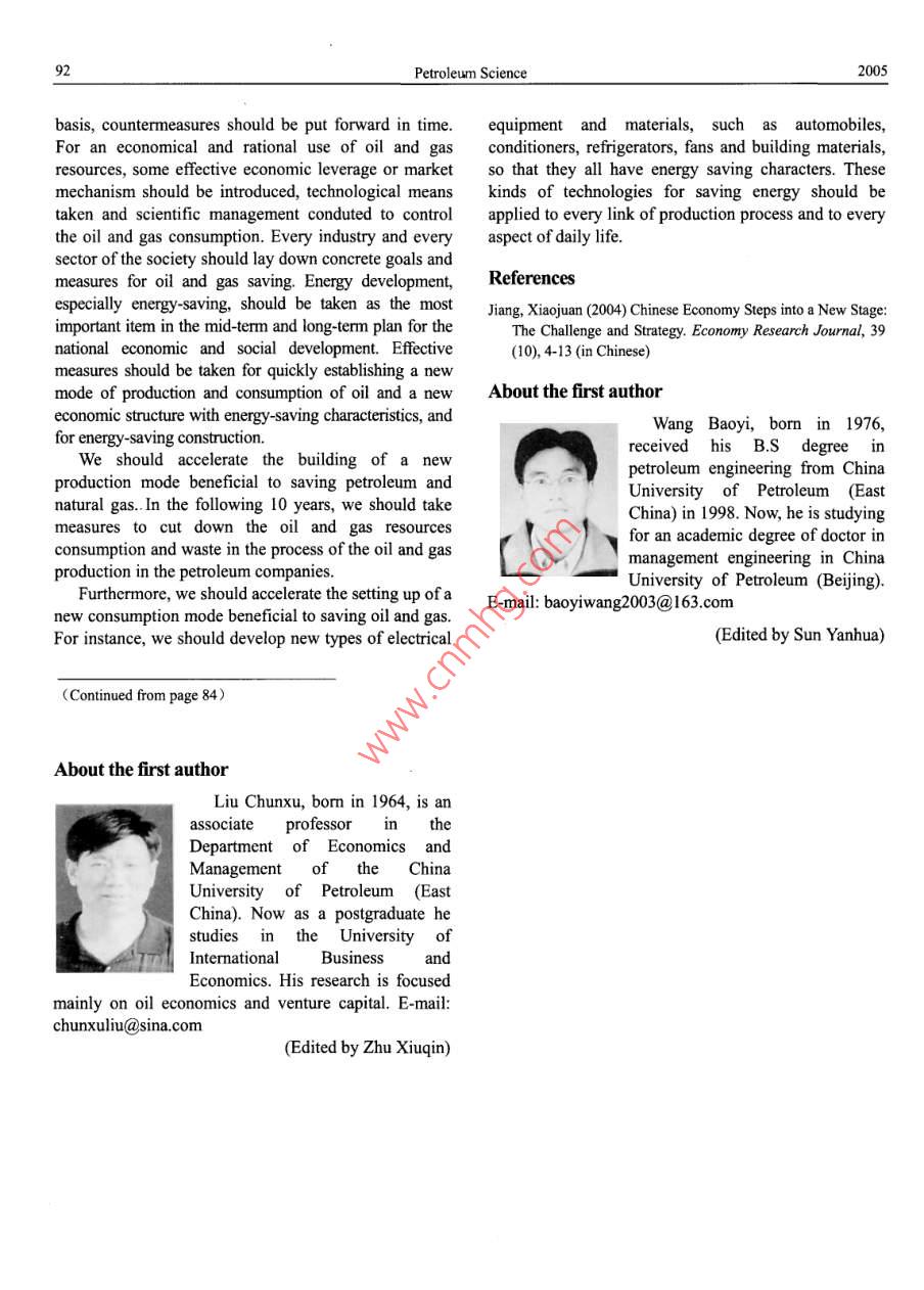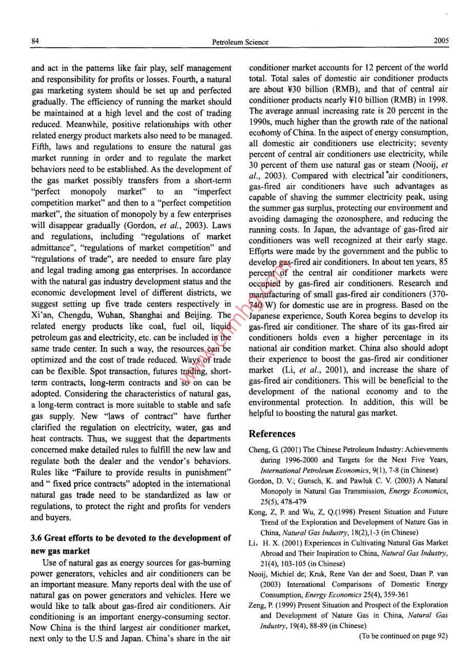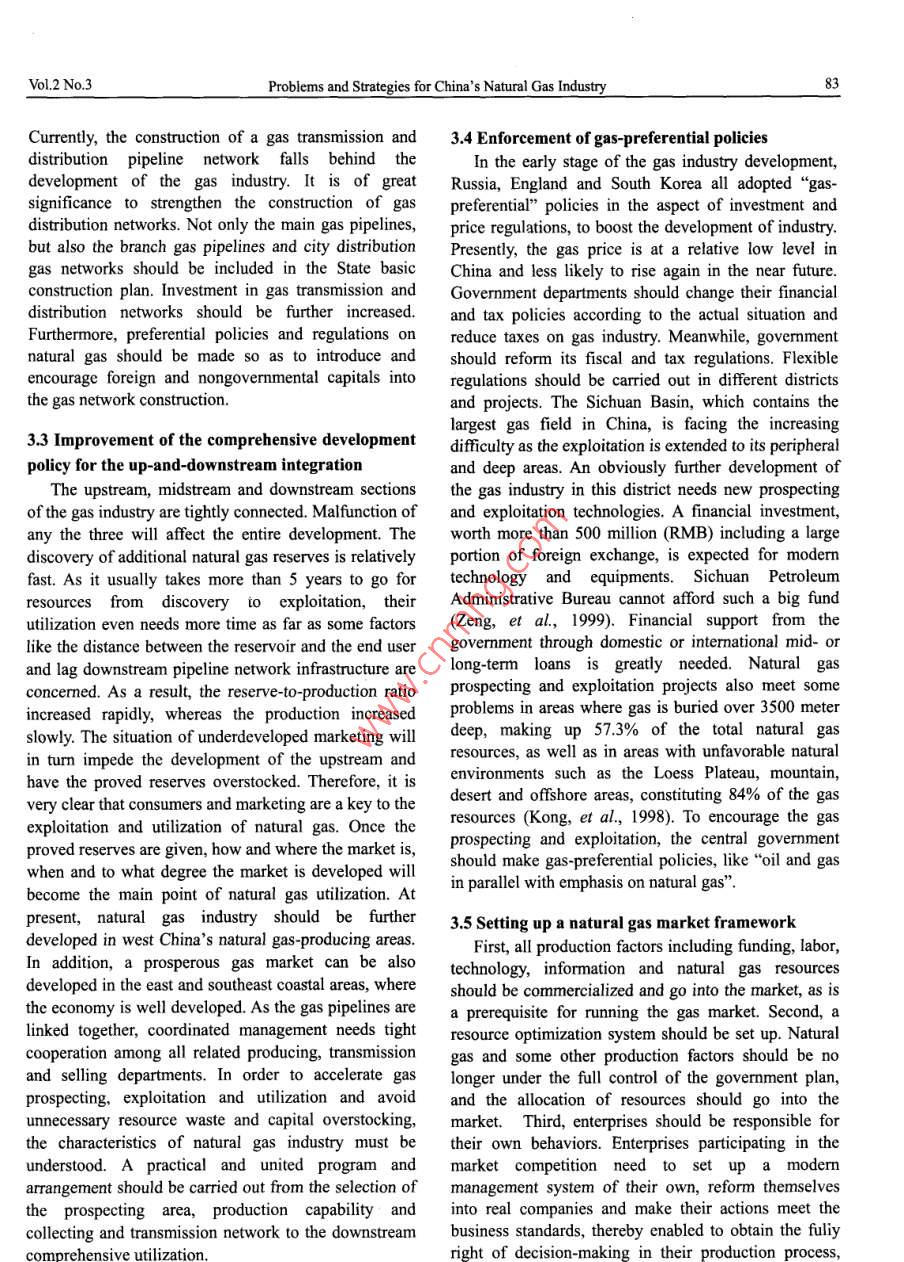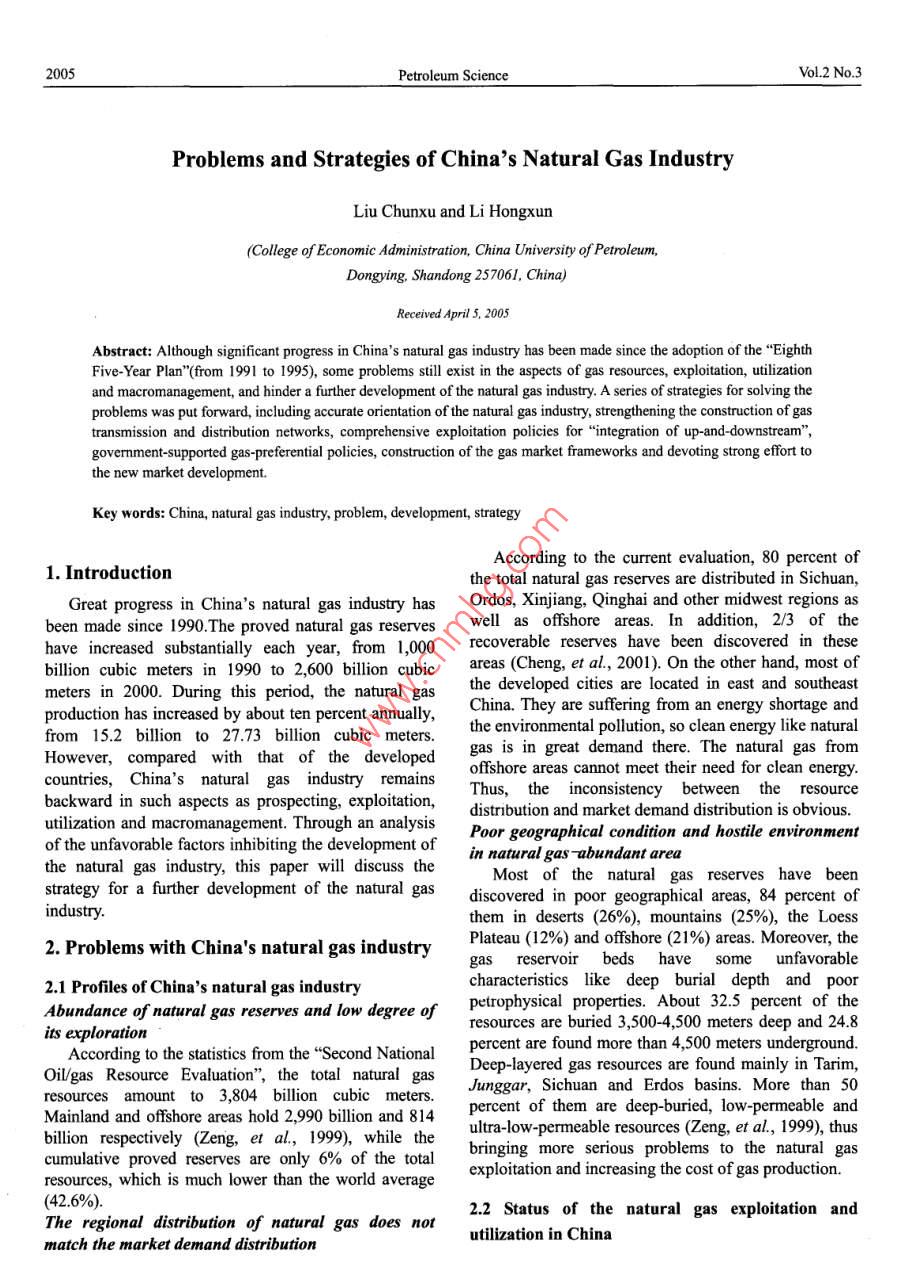 Petroleum ScienceVol.2 No.3Problems and Strategies of China's Natural Gas IndustryLiu Chunxu and Li Hongxun(College of Economic Administration, China University of Petroleum,Dongying, Shandong 257061, China)Reeived April s, 2005Abstract: Although significant progress in China's natural gas industry has been made since the adoption of the“"EighthFive-Year Plan"(from 1991 to 1995), some problems still exist in the aspects of gas resources, exploitation, utilizationand macromanagement, and hinder a further development of the natural gas industry. A series of strategies for solving theproblems was put forward, including accurate orientation of the natural gas industry, strengthening the construction of gastransmission and distribution networks, comprehensive exploitation policies for "integration of up-and downstream”,govermment-supported gas-preferential policies, construction of the gas market frameworks and devoting strong effort tothe new market development.Key words: China, natural gas industry, problem, development, strategyAccording to the current evaluation, 80 percent of1. Introductionthe total natural gas reserves are distributed in Sichuan,Great progress in China's natural gas industry hasOrdos, Xinjiang, Qinghai and other midwest regions asbeen made since 1990.The proved natural gas reserveswell as offishore areas. In addition, 2/3 of thehave increased substantially each year, from 1,000recoverable reserves have been discovered in thesebillion cubic meters in 1990 to 2,600 billion cubicareas (Cheng, et al, 2001). On the other hand, most ofmeters in 2000. During this period, the natural gasthe developed cities are located in east and southeastproduction has increased by about ten percent annually,China. They are suffering from an energy shortage andfrom 15.2 billion to 27.73 billion cubic meters.the environmental pollution, so clean energy like naturalHowever, compared with that of the developedgas is in great demand there. The natural gas fromcountries, China's natural gas industry remainsoffshore areas cannot meet their need for clean energy.Thus,theinconsistency between the resourcebackward in such aspects as prospecting, exploitation,distribution and market demand distribution is obvious.utilization and macromanagement. Through an analysisPoor geographical condition and hostile environmentof the unfavorable factors inhibiting the development ofin natural gas ubundant areathe natural gas industry, this paper will discuss theMost of the natural gas reserves have beenstrategy for a further development of the natural gasdiscovered in poor geographical areas, 84 percent ofindustry.them in deserts (26%), mountains (25%), the Loess2. Problems with China's natural gas industryPlateau (12%) and offshore (21%) areas. Moreover, thegas reservoir beds have some unfavorablecharacteristics like deep burial depth and poor2.1 Profiles of China's natural gas industryAbundance of natural gas reserves and low degree ofpetrophysical properties. About 32.5 percent of theresources are buried 3,500-4,500 meters deep and 24.8its explorationAccording to the statistics from the“Second Nationalpercent are found more than 4,500 meters underground.Oil/gas Resource Evaluation", the total natural gasDeep-layered gas resources are found mainly in Tarim,resources amount to 3,804 billion cubic meters.Junggar, Sichuan and Erdos basins. More than 50Mainland and offshore areas hold 2,990 billion and 814percent of them are deep-buried, low-permeable andbillion respectively (Zeng, et al, 1999), while theultra-low-permeable resources (Zeng, et al, 1999), thuscumulative proved reserves are only 6% of the totalbringing more serious problems to the natural gasresources, which is much lower than the world averageexploitation and increasing the cost of gas production.(42.6%).2.2 Status of the natural gas exploitation anThe regional distribution of natural gas does notutilization in Chinamatch the market demand distributionVol.2 No.3Problems and Strategies for China's Natural Gas Industry81Large reserve-to-production ratio due to low gasenergy consumption (Zeng, et al, 1999). For theproductionworldwide gas consumption mix, the percentages usedAlthough the proved natural gas reserves haveby power plants, by industry, as chemical raw materials,increased significantly since the Eighth Five-Year Planfor cities and commerce are 13%, 34%, 4% and 39%(from 1991 to 1995), the increase of the natural gasrespectively in North America. Gas consurmptionoutput remains slow, partially due to limitations inaccounts for 27.2% in energy consumption structure. Instorage and transportation facilities and downstreamWestern Europe, the numbers are 17%, 24%, 4% andmarketing. Currently, the annual natural gas output is 45% respectively. Gas consumption is 19.2% of theonly about 27 billion cubic meters, namely 20 cubicwhole energy consumption structure (Li, et al, 2001).meters per person. There is a big gap compared with theApparently, compared with the worldwide consumptiondeveloped countries. For example, the annual naturalmixes, the share of natural gas used as chemical rawgas output in England is 1,300 cubic meters per person.materials is relatively huge and unreasonable. TheMeanwhile, residual recoverable reserves of natural gasstructure of gas consumption needs to be optimized soof about 1,000 billion cubic meters have not beenas to increase the ratio of natural gas consumption in theexploited. The reserve-to-production ratio is higher thanenergy consumption structure.70:1 (Li, et al, 2001). Therefore, the potential of naturalGas storage and transmission equipment not wellgas resources, especially proved reserves, is still great.constructedLack of a full understanding of natural gasAffected by the wrong thought that oil is superior toSome relevant officials and urban residents have notnatural gas and due to the insufficient investment inrealized the important role of natural gas in improvingChina's infrastructure, natural gas storage a