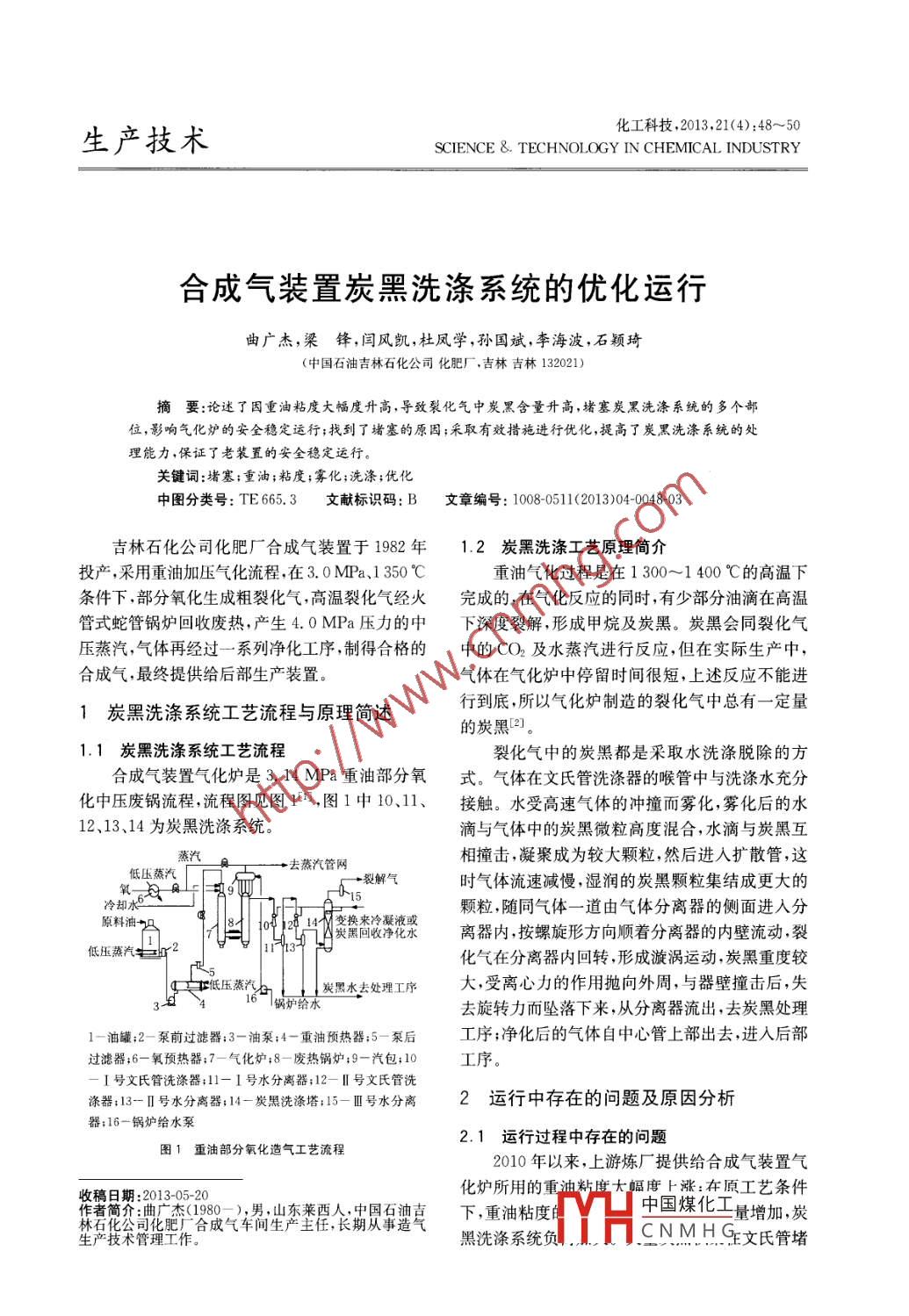 生產(chǎn)技術(shù)化工科技,2013,21(4):48~50science & TECHNOLOGY IN CHEMICAL INDUSTRY合成氣裝置炭黑洗滌系統(tǒng)的優(yōu)化運行曲廣杰,梁鋒,閆風(fēng)凱,杜鳳學(xué),孫國斌,李海波,石穎琦(中國石油吉林石化公司化肥廠,吉林吉林132021)摘要:論迷了因重油粘度大幅度升高,導(dǎo)致裂化氣中炭黑含量升髙,堵塞炭黑洗滌系統(tǒng)的多個部位,影響氣化爐的安全穩(wěn)定運行;找到了堵塞的原因;釆取有效措施進(jìn)行優(yōu)化,提高了炭黑洗滌系統(tǒng)的處理能力,保證了老裝置的安全穩(wěn)定運行。關(guān)鍵詞:;堵塞;重油;粘度;霧化;洗滌;優(yōu)化中圖分類號:TE665.3文獻(xiàn)標(biāo)識碼:B文章編號:1008-0511(2013)04004803吉林石化公司化肥廠合成氣裝置于1982年1.2炭黑洗滌工藝原理簡介投產(chǎn),采用重油加壓氣化流程,在3.0MPa、1350℃重油氣化過程是在1300~1400℃的高溫下條件下,部分氧化生成粗裂化氣,高溫裂化氣經(jīng)火完成的,在氣化反應(yīng)的同時,有少部分油滴在高溫管式蛇管鍋爐回收廢熱,產(chǎn)生4.0MPa壓力的中下深度裂解,形成甲烷及炭黑。炭黑會同裂化氣壓蒸汽,氣體再經(jīng)過一系列凈化工序,制得合格的中的CO2及水蒸汽進(jìn)行反應(yīng),但在實際生產(chǎn)中,合成氣,最終提供給后部生產(chǎn)裝置。氣體在氣化爐中停留時間很短,上述反應(yīng)不能進(jìn)1炭黑洗滌系統(tǒng)工藝流程與原理簡述行到底,所以氣化爐制造的裂化氣中總有一定量的炭黑211.1炭黑洗滌系統(tǒng)工藝流程裂化氣中的炭黑都是采取水洗滌脫除的方合成氣裝置氣化爐是3.14MPa重油部分氧式。氣體在文氏管洗滌器的喉管中與洗滌水充分化中壓廢鍋流程,流程圖見圖1,圖1中10、11、接觸。水受高速氣體的沖撞而霧化,霧化后的水12、13、14為炭黑洗滌系統(tǒng)滴與氣體中的炭黑微粒高度混合,水滴與炭黑互蒸汽去蒸汽管網(wǎng)相撞擊,凝聚成為較大顆粒,然后進(jìn)入擴(kuò)散管,這低壓蒸汽時氣體流速減慢,濕潤的炭黑顆粒集結(jié)成更大的冷卻水6顆粒,隨同氣體一道由氣體分離器的側(cè)面進(jìn)入分原料油14變換來冷凝液或炭黑回收凈化水離器內(nèi),按螺旋形方向順著分離器的內(nèi)壁流動,裂低壓蒸汽攔2化氣在分離器內(nèi)回轉(zhuǎn),形成漩渦運動,炭黑重度較炭黑水去處理工序大,受離心力的作用拋向外周,與器壁撞擊后,失去旋轉(zhuǎn)力而墜落下來,從分離器流出,去炭黑處理油罐:2-泵前過濾器:3-油泵;4-重油預(yù)熱器:5-泵后工序;凈化后的氣體自中心管上部出去,進(jìn)入后部過濾器;6一氧預(yù)熱器;7一氣化爐;8一廢熱鍋爐;9一汽包;10工序。I號文氏管洗滌器:11-1號水分離器;12-Ⅱ號文氏管洗滌器:13-Ⅱ號水分離器:14-炭黑洗滌塔;15-Ⅲ號水分離2運行中存在的問題及原因分析器;16-鍋爐給水泵2.1運行過程中存在的問題圖1重油部分氧化造氣工藝流程2010年以來,上游煉廠提供給合成氣裝置氣收稿日期:201305-20化爐所用的重油料度大幅度上漲:在原工藝條件作者簡介;曲廣杰(1980-),男,山東萊西人,中國石下,重油粘度中國煤化工量增加,炭肥廠合成氣車間生產(chǎn)主任,長期從事生產(chǎn)技術(shù)管理工作。黑洗滌系統(tǒng)負(fù)CNMH王文氏管堵第1期曲疒杰·等.合成氣裝置炭黑洗滌系統(tǒng)的優(yōu)化運行塞喉管,造成氣化爐超壓直至停車,嚴(yán)重影響氣化大幅度升高后原有的霧化器不能適應(yīng)粘度的改爐的安全運行;同時堵塞也使炭黑洗滌系統(tǒng)效率變,霧化效果變差,導(dǎo)致裂化氣中炭黑含量增加,炭下降,降低了外送裂化氣的品質(zhì),影響后部工序的黑洗滌系統(tǒng)負(fù)荷增大,導(dǎo)致一文、二文頻繁堵塞;生產(chǎn)。旦出現(xiàn)堵塞,無法及時停車清理(保證連續(xù)化生2.2原因分析產(chǎn)),炭黑在喉管和擴(kuò)散管處聚集,久而久之,將喉在重油部分氧化過程中,為了保證氣化反應(yīng)管和擴(kuò)散管完全堵塞,造成氣化爐系統(tǒng)停車。的效果,需要最大限度的將油滴分割,使油和氣化劑形成最大的反應(yīng)界面。這樣既能減少重油裂解3采取的措施反應(yīng)的發(fā)生(即減少炭黑和甲烷的生成),又能加由炭黑生成機(jī)理和炭黑洗滌工藝原理簡介不快氣化反應(yīng)速度,提高氣化效率難看出,要避免一文、二文洗滌器的堵塞,必須從概括來說,重油的霧化是用外加能量做功克減少炭黑的生成和強(qiáng)化洗滌效果2個方面想辦服重油的表面張力以增大表面積的過程。此過法,基于這2點,從2012年8月份開始,開始積極程是一個復(fù)雜的物理機(jī)械過程。重油霧化效果的進(jìn)行工藝優(yōu)化:一是根據(jù)入爐重油的變化對氣化好壞直接決定裂化氣中炭黑含量多少。爐進(jìn)行工藝指標(biāo)優(yōu)化,大幅度減少炭黑的生成;二影響重油霧化效果的因素主要有5方面:重是加大一文、二文的洗滌水用量,盡量提高整個炭油的粘度及表面張力氣化劑與重油的相對速度,黑洗滌系統(tǒng)的能力防止炭黑在系統(tǒng)內(nèi)積聚外界給予重油外力的大小,氣化劑和燃料的噴出3.1優(yōu)化工藝指標(biāo)減少炭黑生成夾角及作用方向,霧化器的類型、結(jié)構(gòu)及加工質(zhì)根據(jù)氣化反應(yīng)的原理并結(jié)合多年的生產(chǎn)實踐量,其中影響最大的因素是重油的粘度。重油的經(jīng)驗,反應(yīng)中炭黑生成的多少主要取決于氧油比粘度除了與溫度有關(guān)外,也與