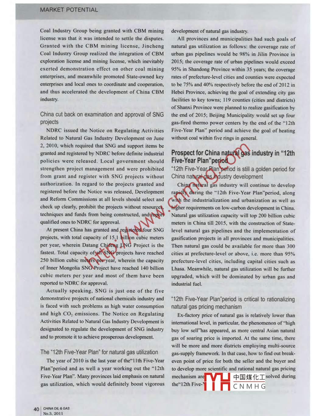 MARKET POTENTIALDevelopment Trends andProspect of China NaturalGas IndustrySun Huil, Li Wei?, Yang Yi, Zhuang Tao2(1. PetroChina Planning and Engineering Institute, 2. PetroChina Natural Gas Pipeline Company)China natural gas industry maintained a vigorous technical recoverable gas reserves being 594.55 billiondevelopment trend in 2010. Either domestic natural and 287.5 billion cubic meters respectively. Newlygas production or natural gas import has witnessed proven gas in place declined by more than 100 billiona significant increase; natural gas pipelines and cubic meters as compared with 2009. By the end of 2010.other infrastructure have been upgraded; natural gas China's cumulative proven gas in place were 9.3 trillionconsumption has kept rising, and consumption mix has cubic meters, and remaining technical recoverable gasbeen optimized increasingly; natural gas price reform has reserves were 3.9 trillion cubic meters, attaining a yeartaken big stepon-year growth of 3. 7%. Domestic newly proven gas inplace was based on China National Petroleum CorporationReview of China natural gas industry in 2010(hereafter as CNPC). In 2010, CNPC newly proven gasNatural gas reserves continued to grow; breakthrough in place was 570.I billion cubic meters, which accountedmade in deepwater explorationfor more than 90% of national total, and they were mainlyChina's natural gas reserves continued to grow in distributed in Tarim and Ordos Basin2010, with newly proven gas in place and newly proven China continued to make a breakthrough in deepwater省人民政府中國石油天然氣集團(tuán)公湖南工程”戰(zhàn)略合作框架協(xié)議簽約湖室·長沙2011年9月中國煤化工On September 8, the ceremony for the opening of the Xiangtan- Loudi-Shaoyang NaturalTYHCNMHGangtan CityCNPC President Jiang Jiemin attended and gave a speech on the ceremonyCHINA OIL GASMARKET POTENTIALexploration for natural gas in 2010, discovering the third West-East Gas Pipeline, the Sichuan-East China Gasdeepwater natural gas field-Liuhua 29-1 gas field-in Pipeline, the Second West-East Gas Pipeline(westSouth China Sea in succession to Liwan 3-1 and Liuhua section), the Shaanxi-Beijing Gas Pipeline, and the34-2 gas fields. 57 million cubic feet of natural gas could Zhong County-Wuhan Municipality Gas Pipeline as thebe produced in Well Liuhua 29-1-1during drillstem test. backbone, and the Lanzhou-Yinchuan Gas Pipeline, theHuaiyang-Wuhan Gas Pipeline, and the Hebei-NanjingNatural gas production grew rapidlyGas Pipeline as interconnected pipelines. The natural gasChina natural gas production has maintained a high- pipeline network has connected Sichuan, Changqing,speed growth in recent years, amounting to 95.21 billion Tarim and Qinghai gas provinces as well as Middle Asiacubic meters in 2010 rising from 22. 3 billion cubic meters and domestic major consumption markets together. By thein 1998, and annual growth rate reached 12.9%. China end of 2010, China has built 45,000 kilometers of naturalnatural gas production in 2010 rose by 11.08 billion cubic gas pipelines in length within its bordersmeters as compared with 2009, and the grow rate was Throughput of natural gas pipelines got more flexible13.2%, which was obviously higher than 8.6% in 2009. after being interconnected. On August 31, 2010, theCNPC was still the largest natural gas producer Sichuan-East China Gas Pipeline Project was officiallyin China in 2010. Meanwhile, China Petrochemical put into operation, and a multi-source supplyingCorporation(hereafter as Sinopec Group)and China framework was formed in Delta Region of YangtzeNational Offshore Oil Corporation(CNOOC) have made River. On October 26, 2010, China's first transnationaltremendous development, either of which natural gas natural gas pipeline-Trans Asia Gas Pipeline- was put intoproduction topped 10 billion cubic meters for the first production, with cumulative transmission of natural gastime. In 2010 CNPC natural gas production was 72.53 from Turkmenistan being 4.38 billion cubic meters perbillion cubic meters(containing 284 million cubic meters year. On November 18, 2010, Zhongwei-Huangpo sectionof CBM), rising by 4.21 billion cubic meters than in 2009 of the Second West-East Gas Pipeline was completed andand taking up 76.2% of national total. Sichuan-East China put into production, and natural gas from Middle Asia wasGas Project was put into operation and Puguang gas field transported to Central China for the first time, moreover,was developed, on this basis, natural gas production of the Second West-East Gas Pipeline was thus connectedSinopec Group reached 12.36 billion cubic meters in 2010, with the Huaiyang-Wuhan Municipality Gas Pipelinerising by 4.03 billion cubic meters than in 2009 and taking On December 8, 2010, Zaoyang-Xiangfan section ofup 13.0%of national total CNOOC reversed the situation Zaoyang-Shiyan branch line of the Second West-East Gasof decline in 2009, with natural gas production rising by Pipeline was put into operation, so the Second West-East2.7 billion cubic meters tremendously and attaining 10.17 Gas Pipeline was connected with the Zhong Countrybillion cubic meters, 10.7% of national total. Moreover, Wuhan Municipality Gas Pipeline. On December 31natural gas production of Shaanxi Yanchang Petroleum 2010, Yulin-Liangxiang section of the Third Shaanxi-(Group) Co., Ltd was about 150 million cubic meters in Beijing Gas Pipeline was put into production, so the2010capability of supplying natural gas to Beijing and BohaiChangqing, Chuanyu, and Tarim gas provinces were Rim was reinforced On the same day, the Yulin-Jinan Gasstill Chinas major gas fields, each of which annual natural Pipeline was officially put into operation, so Daniudi gasgas production topped 20 billion cubic meters. Among field was connected with Zhongyuan Oilfieldthem, annual production of natural gas of Sulige gas field In addition, China had many large-scale natural gas(Changqing gas province)topped 10 