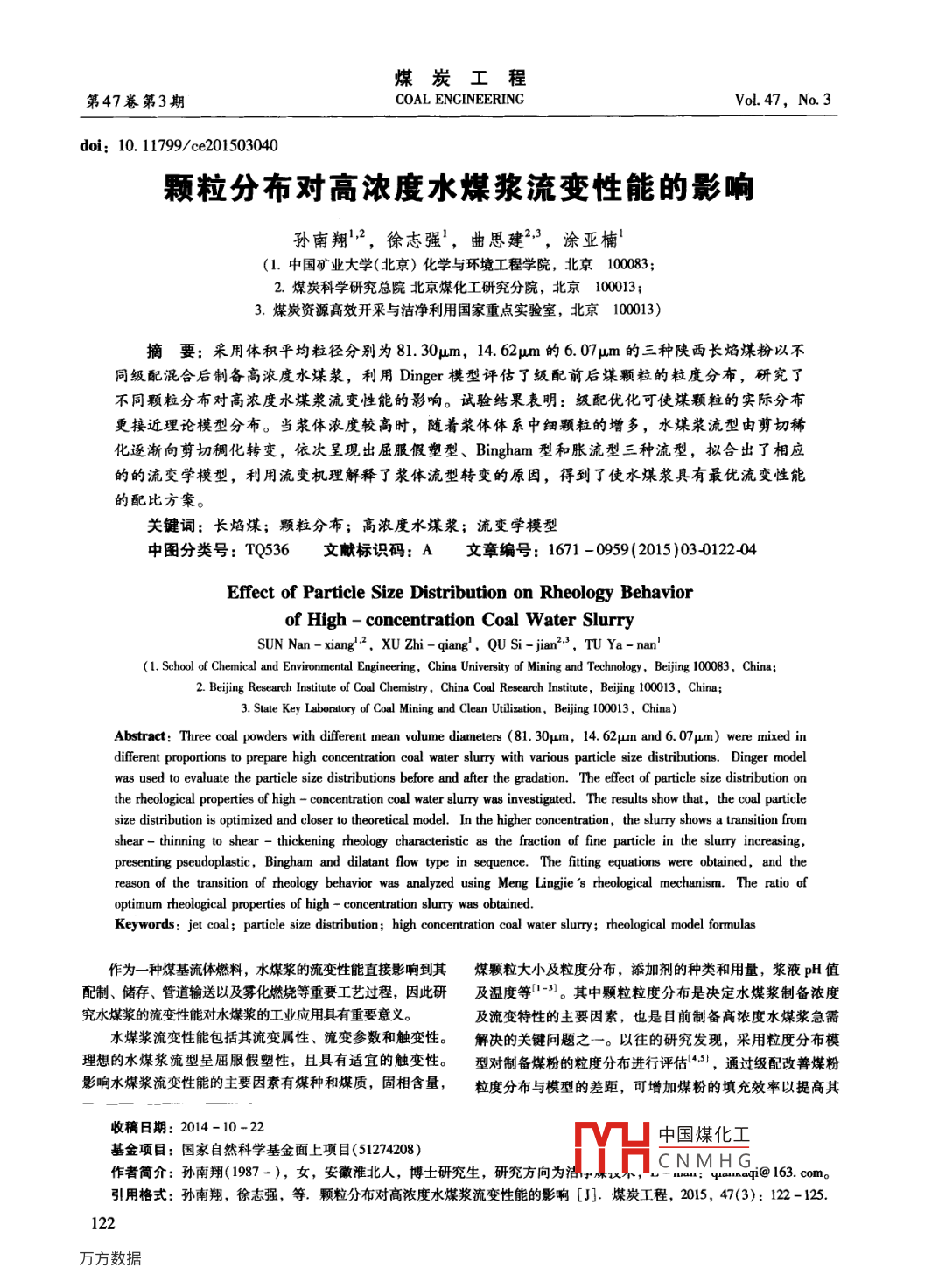 煤炭工程第47卷第3期COAL ENGINEERINGVoL 47. No. 3doi:10.11799/ce201503040顆粒分布對高濃度水煤漿流變性能的影響孫南翔2,徐志強(qiáng)',曲思建2,涂亞楠(1.中國礦業(yè)大學(xué)(北京)化學(xué)與環(huán)境工程學(xué)院,北京100083;2.煤炭科學(xué)研究總院北京煤化工研究分院,北京100013;3.煤炭資源高效開采與潔凈利用國家重點(diǎn)實(shí)驗(yàn)室,北京100013)摘要:采用體積平均粒徑分別為81.30μm,14.62μm的6.07μm的三種陜西長焰煤粉以不同級配混合后制備高濃度水煤漿,利用 Dinger模型評估了級配前后煤顆粒的粒度分布,研究了不同顆粒分布對高濃度水煤漿流變性能的影響。試驗(yàn)結(jié)釆表明:級配優(yōu)化可使煤顆粒的實(shí)際分布更接近理論模型分布。當(dāng)漿體濃度較高時(shí),隨著漿體體系中細(xì)顆粒的增多,水煤漿流型由剪切稀化逐漸向剪切稠化轉(zhuǎn)變,依次呈現(xiàn)出屈服假塑型、 Bingham型和脹流型三種流型,擬合出了相應(yīng)的的流變學(xué)模型,利用流變杋理解釋了漿體流型轉(zhuǎn)變的原因,得到了使水煤漿具有最優(yōu)流變性能的配比方案。關(guān)鍵詞:長焰煤;顆粒分布;高濃度水煤漿;流變學(xué)模型中圖分類號:TQ536文獻(xiàn)標(biāo)識碼:A文章編號:1671-0959(2015)03012204Effect of Particle Size distribution on Rheology Behaviorof High-concentration Coal Water SlurrySUN Nan-xiang, XU Zhi-qiang, QU Si-jian"3,TU Ya-nan'(1. School of Chemical and Environmental Engineering, China University of Mining and Technology, Beijing 100083,China2. Beijing Research Institute of Coal Chemistry, China Coal Research Institute, Beijing 100013, China;3. State Key Laboratory of Coal Mining and Clean Utilization, Beijing 100013, China)Abstract: Three coal powders with different mean volume diameters(81 30um, 14. 62um and 6. 07um) were mixed indifferent proportions to prepare high concentration coal water slurry with various particle size distributions. Dinger modelwas used to evaluate the particle size distributions before and after the gradation. The effect of particle size distribution orthe rheological properties of high-concentration coal water slurry was investigated. The results show that, the coal particlesize distribution is optimized and closer to theoretical model. In the higher concentration, the slurry shows a transition fromshear-thinning to shear -thickening rheology characteristic as the fraction of fine particle in the slurry increasingpresenting pseudoplastic, Bingham and dilatant flow type in sequence. The fitting equations were obtained, and thereason of the transition of rheology behavior was analyzed using Meng Lingjie's rheological mechanism. The ratio ofoptimum rheological properties of high concentration slurry was obtainKeywords: jet coal; particle size distribution; high concentration coal water slurry; rheological model formulas作為一種煤基流體燃料,水煤漿的流變性能直接影響到其煤顆粒大小及粒度分布,添加劑的種類和用量,漿液pH值配制、儲存、管道輸送以及霧化燃燒等重要工藝過程,因此研及溫度等1-3。其中顆粒粒度分布是決定水煤漿制備濃度究水煤漿的流變性能對水煤漿的工業(yè)應(yīng)用具有重要意義及流變特性的主要因素,也是目前制備高濃度水煤漿急需水煤漿流變性能包括其流變屬性、流變參數(shù)和觸變性。解決的關(guān)鍵問題之一。以往的研究發(fā)現(xiàn),采用粒度分布模理想的水煤漿流型呈屈服假塑性,且具有適宜的觸變性。型對制備煤粉的粒度分布進(jìn)行評估3,通過級配改善煤粉影響水煤漿流變性能的主要因素有煤種和煤質(zhì),固相含量,粒度分布與模型的差距,可增加煤粉的填充效率以提高其收稿日期:2014-10-22中國煤化工基金項(xiàng)目:國家自然科學(xué)基金面上項(xiàng)目(51274208)作者簡介:孫南翔(1987-),女,安徽淮北人,博士研究生,研究方向?yàn)闈? ICNMHG2163.cm引用格式:孫南翔,徐志強(qiáng),等.顆粒分布對高濃度水煤漿流變性能的影響[J.煤炭工程,2015,47(3):122-125.1222015年第3期煤炭工程研究探討成漿性。粒度級配的變化不僅影響其成漿性,同時(shí)影響其(1)流動(dòng)性和穩(wěn)定性為進(jìn)一步探討顆粒分布對高濃度水煤漿流變性能的影其中,ω為小于該尺寸顆粒的累積質(zhì)量分?jǐn)?shù),%;d響,本文通過改變級配研究不同的粒度分布對高濃度水煤為粒群中最小的顆粒尺寸,mm;dm為最大的顆粒尺寸,漿所產(chǎn)生的不同流變模型的影響,分析流變模型變化的原mm;d為粒群范圍內(nèi)任一顆粒尺寸,mm;n為模型參數(shù),因,尋求制備低粘度高濃度水煤漿的最優(yōu)級配方案。Dinger模型給出的能夠達(dá)到最大堆積密度的n值為0.37。三種原料煤粉CS、FS和UFS的實(shí)測粒度分布與 Dinger1級配優(yōu)化實(shí)驗(yàn)?zāi)P陀?jì)算值的差異如圖1所示。FS和UFS粒度分布與模型1.1樣品的選擇理論值相差較小,但由于該兩種煤粉粒度分布太窄,不適實(shí)驗(yàn)選用煤樣為陜西長焰煤,其工業(yè)分析和元素分析合單獨(dú)制漿。CS粒度分布較寬,但實(shí)測粒度分布與模型理數(shù)據(jù)見表1。長焰煤的煤質(zhì)特點(diǎn)是高水分、高氧含量,可磨論值相差較大性指數(shù)小,屬難成漿煤種,但其揮發(fā)分高,反應(yīng)活性強(qiáng)若能將低階煤制成水煤漿用于煤代油鍋爐燃燒或氣化,則Ds理想分布可擴(kuò)大制漿煤種的范圍。將原煤破碎至3mm左右,利用球60|→D46理想分布磨機(jī)進(jìn)行不同時(shí)長的磨礦,得到3種不同粒度分布的煤粉。D607理想分布因工業(yè)生產(chǎn)