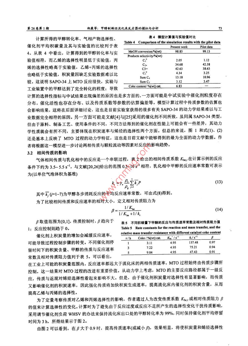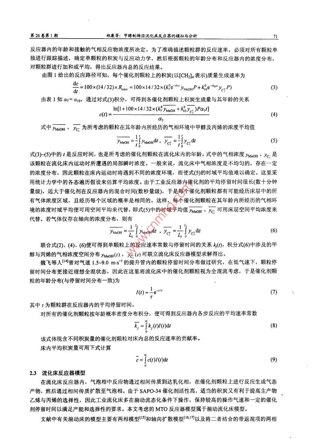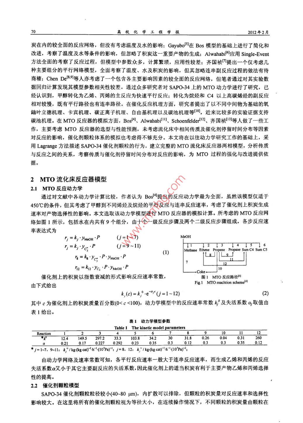 70高?;瘜W(xué)工程學(xué)報(bào)2012年2月炭在內(nèi)的較全面的反應(yīng)網(wǎng)絡(luò),但沒有考忠溫度及水的影響; Gayubol')在 Bos模型的基礎(chǔ)上進(jìn)行了簡化和改進(jìn),考察了溫度及水等條件的影響,但忽略了積炭這一-重要 產(chǎn)物的生成; Alwahabi!I應(yīng)用 Single-Event方法全面的考察了反應(yīng)過程,但模型中參數(shù)眾多,計(jì)算繁瑣,應(yīng)用性較差;齊國禎"提出一個僅考慮幾種主要組分的平行網(wǎng)絡(luò)模型,全面考察了溫度、水及積炭的影響,但其忽略連串副反應(yīng)過程的做法有待商榷;ChenDel89]等人亦考慮了一個包含各主要影響因素的較全面的反應(yīng)網(wǎng)絡(luò),但筆者通過對其實(shí)驗(yàn)數(shù)據(jù)回歸計(jì)算發(fā)現(xiàn)其模型參數(shù)相關(guān)性較差。通過眾多研究者對SAPO-34.上的MTO動力學(xué)進(jìn)行了研究,已經(jīng)認(rèn)識到,甲醇轉(zhuǎn)化為乙烯、丙烯的主反應(yīng)為快速平行反應(yīng);轉(zhuǎn)化為烷烴和C4以上高碳烯烴的副反應(yīng)相對較慢,既有平行路徑也有連串路徑。在催化反應(yīng)機(jī)理方面,研究者提出了以不同中間物為基礎(chǔ)的氧鑰葉立德機(jī)理、卡賓機(jī)理、碳正離子機(jī)理、自由基機(jī)理以及碳池機(jī)理等[10],近來比較多的實(shí)驗(yàn)證據(jù)支持碳池機(jī)理。在MTO反應(yīng)器的模擬方面,Boslf!、 Alwababil". Schoenfelderl2]、 齊國禎!13]等人做了 一些工作,主要考慮MTO反應(yīng)器的選型與性能預(yù)測,未考慮流化床中相間傳質(zhì)及催化劑停留時間分布等因素對反應(yīng)的影響,催化劑顆粒體系的模擬也考慮得不夠充分。本文將在以往動力學(xué)研究工作的基礎(chǔ)上,采用Lagrange方法描述SAPO-34催化劑顆粒的行為,建立完整的MTO流化床反應(yīng)器兩相模型,分析傳質(zhì)與反應(yīng)之間的關(guān)系,考察傳質(zhì)與催化劑停留時間分布對反應(yīng)的影響,為MTO過程的強(qiáng)化與改進(jìn)提供依據(jù)。2 MTO 流化床反應(yīng)器模型2.1 MTO 反應(yīng)動力學(xué)通過對文獻(xiàn)中各動力學(xué)計(jì)算比較,作者認(rèn)為Bos'1提 出的反應(yīng)動力學(xué)最為全面,雖然該模型僅適于450C的條件,但其考慮了甲醇到不同烯烴及烷烴的平行反應(yīng)與連串反應(yīng)速率,考慮了催化劑上積炭生成速率對產(chǎn)物選擇性的影響。本文選取該動力學(xué)模型進(jìn)行MTO反應(yīng)器的模擬計(jì)算。所考慮的MTO反應(yīng)網(wǎng)絡(luò)如圖1所示,包括水在內(nèi)共有9個組分,由十個一級反應(yīng)步驟及兩個二級反應(yīng)步驟組成,各步反應(yīng)速率表達(dá)式為竹=k, YMou:P(j=1~7)MeOHrj=kj.yc.P(j=9~11)-↓2↓3↓4↓3↓6Methane Ethene Propene Propane SumC4 Sum C5(1)g=kg.Yc; .P.YMcoH.P_1212 =2 "Yc, .P.YMmOH.P10催化劑上的積炭以指數(shù)衰減的形式影響反應(yīng)速率常數(shù),圖1 MTO 反應(yīng)路徑州Fig1 MTO reachtion schemelH由下式給出k,(c)=k°e"°(j=1~12)(2)其中c為催化劑上的積炭質(zhì)量百分?jǐn)?shù)(0 Roo = 100x14/32<(ke~"yMmoxP+h%e qrv.P)(3)由表1知an= a1o,通過對式(3)積分,可得到各催化劑顆粒上積炭生成量與其年齡的關(guān)系In[l + 100x14/32x(k9 YMNOH + ki0Y%c )Pa,t]c()=(4)式中INeOH、心為所考慮的顆粒在其年齡內(nèi)所經(jīng)歷的氣相環(huán)境中甲醇及丙烯的濃度平均值Phem Hnd石-Hredk(5)式(3)-(5)中的1是反應(yīng)時間,也是所考慮的催化劑顆粒在流化床內(nèi)的年齡,式中的氣相濃度VMeOH、yc;是該顆粒在流化床內(nèi)運(yùn)動時所遭遇的局部瞬時濃度。一般來說,流化床中氣相濃度是不均勻的,存在一定的濃度分布,因此顆粒在床內(nèi)運(yùn)動時將遇到不同的濃度環(huán)境,而使式(5)的時域平均值難以確定。這里采用統(tǒng)計(jì)力學(xué)中的各態(tài)遍歷假沒來估算平均濃度。由于工業(yè)反應(yīng)器內(nèi)催化劑的平均停留時間很長(數(shù)十分鐘量級),遠(yuǎn)大于催化劑在反應(yīng)器內(nèi)的混合時間(數(shù)秒量級),于是每個催化劑顆粒都有可能經(jīng)歷床層中的所有氣體濃度區(qū)域,且經(jīng)歷每個區(qū)域的概率是相同的。這樣,每個催化劑顆粒在其年齡內(nèi)所經(jīng)歷的氣相環(huán)境的濃度時域平均便可用空間平均來代替,即式(5)中的時域平均值YMOH、y心可用床層空間平均濃度來代替。若氣體僅存在軸向的濃度分布,則有ynon=-Imordz ,石=一yxdz(6)聯(lián)合式(2)、(4)、(6)便可得到單顆粒上的反應(yīng)速率常數(shù)與停留時間的關(guān)系k(),積分式(6)中涉及的甲醇與丙烯的氣相濃度空間分布MoOr(z)、yc; (2)可聯(lián)立流化床反應(yīng)器模型求解得出。魏飛等人4曾對氣速1.5~9.0 m-s-' 的提升管內(nèi)的顆粒停留時間分布做過研究,在低氣速下,顆粒停留時間分布更接近理想全混狀態(tài),因此在這里將流化床中的催化劑顆粒視為全混流考慮,于是催化劑顆粒的年齡分布(與停留時間分布-致)為I()=-e*"(7)其中r為顆粒群在反應(yīng)器內(nèi)的平均停留時間。對所有的催化劑顆粒按年齡概率密度分布積分,便可得到反應(yīng)器內(nèi)各步反應(yīng)的平均速率常數(shù)F=j,(OI(0dt(8)該式體現(xiàn)含不同積炭量的催化劑顆粒對床內(nèi)總的反應(yīng)速率的貢獻(xiàn)率。床內(nèi)平均積炭量可用下式計(jì)算c= jc()I()dt(9)2.3流化床反應(yīng)器模型在流化床反應(yīng)器內(nèi),氣泡相中反應(yīng)物通過相間傳質(zhì