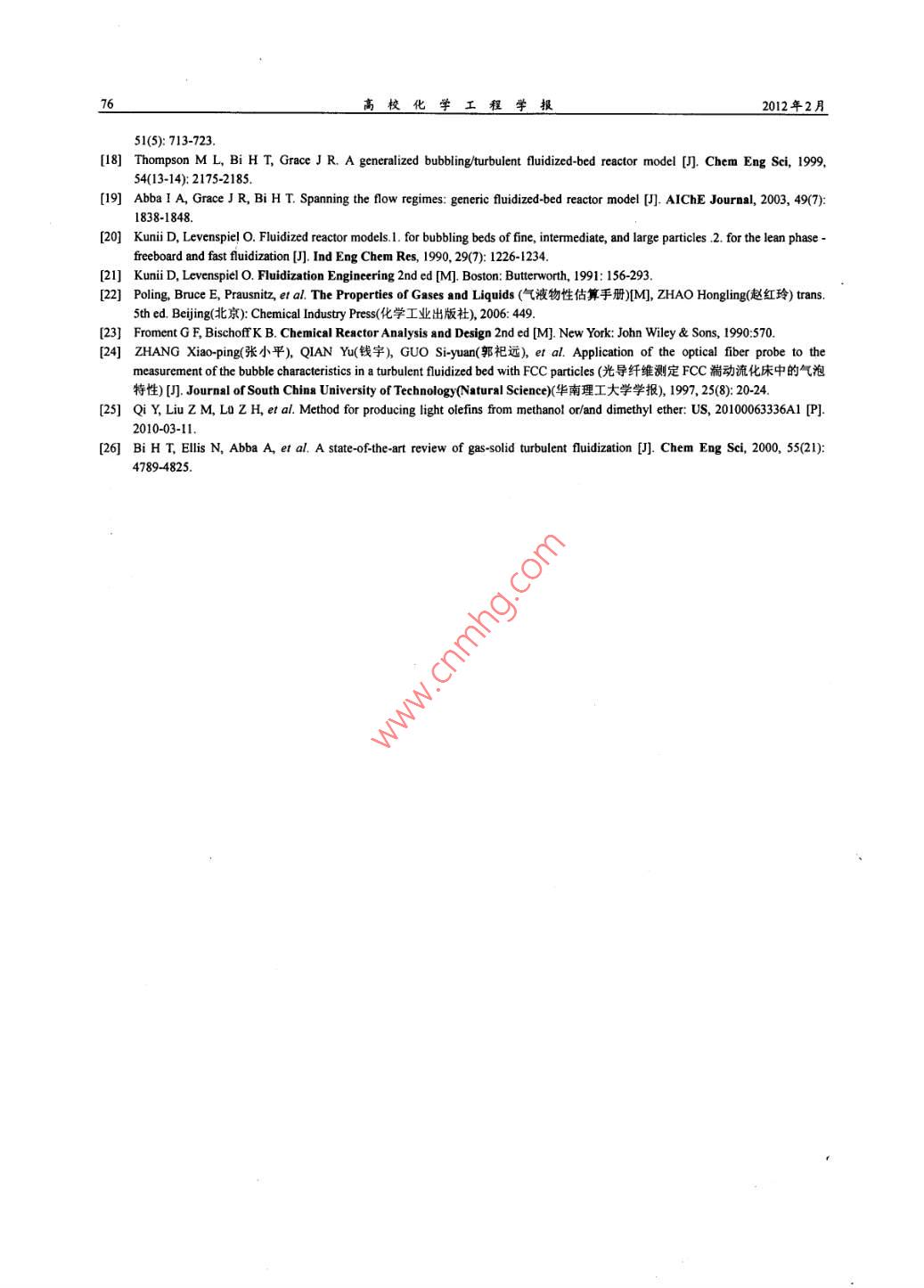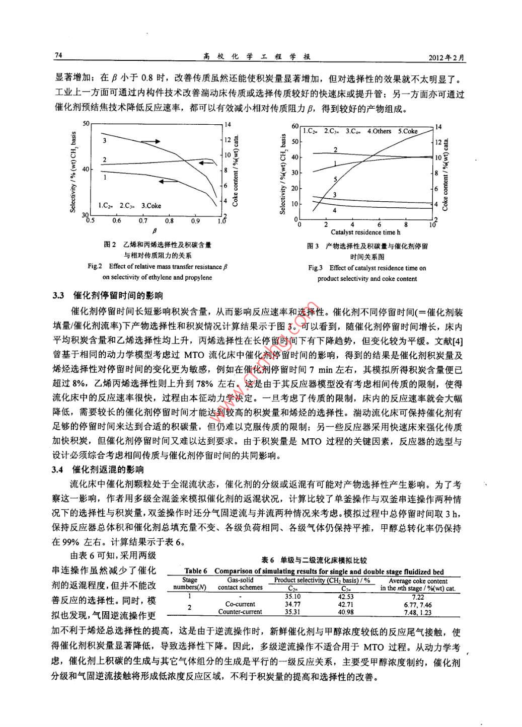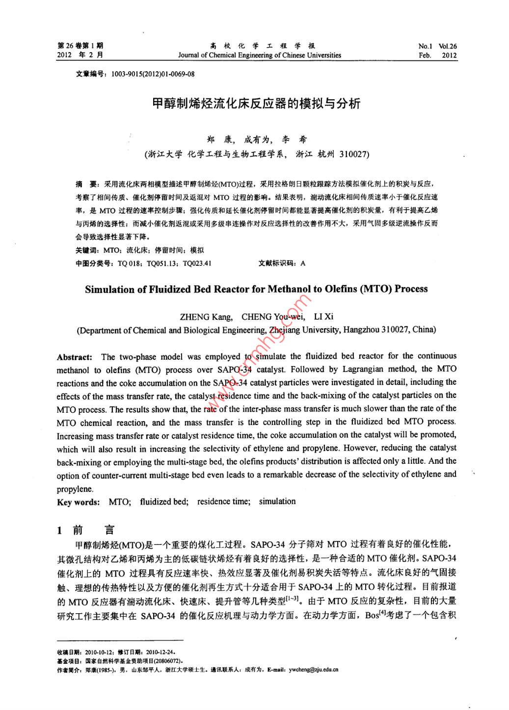 70高?;瘜W(xué)工程學(xué)報(bào)2012年2月炭在內(nèi)的較全面的反應(yīng)網(wǎng)絡(luò),但沒有考忠溫度及水的影響; Gayubol')在 Bos模型的基礎(chǔ)上進(jìn)行了簡化和改進(jìn),考察了溫度及水等條件的影響,但忽略了積炭這一-重要 產(chǎn)物的生成; Alwahabi!I應(yīng)用 Single-Event方法全面的考察了反應(yīng)過程,但模型中參數(shù)眾多,計(jì)算繁瑣,應(yīng)用性較差;齊國禎"提出一個僅考慮幾種主要組分的平行網(wǎng)絡(luò)模型,全面考察了溫度、水及積炭的影響,但其忽略連串副反應(yīng)過程的做法有待商榷;ChenDel89]等人亦考慮了一個包含各主要影響因素的較全面的反應(yīng)網(wǎng)絡(luò),但筆者通過對其實(shí)驗(yàn)數(shù)據(jù)回歸計(jì)算發(fā)現(xiàn)其模型參數(shù)相關(guān)性較差。通過眾多研究者對SAPO-34.上的MTO動力學(xué)進(jìn)行了研究,已經(jīng)認(rèn)識到,甲醇轉(zhuǎn)化為乙烯、丙烯的主反應(yīng)為快速平行反應(yīng);轉(zhuǎn)化為烷烴和C4以上高碳烯烴的副反應(yīng)相對較慢,既有平行路徑也有連串路徑。在催化反應(yīng)機(jī)理方面,研究者提出了以不同中間物為基礎(chǔ)的氧鑰葉立德機(jī)理、卡賓機(jī)理、碳正離子機(jī)理、自由基機(jī)理以及碳池機(jī)理等[10],近來比較多的實(shí)驗(yàn)證據(jù)支持碳池機(jī)理。在MTO反應(yīng)器的模擬方面,Boslf!、 Alwababil". Schoenfelderl2]、 齊國禎!13]等人做了 一些工作,主要考慮MTO反應(yīng)器的選型與性能預(yù)測,未考慮流化床中相間傳質(zhì)及催化劑停留時間分布等因素對反應(yīng)的影響,催化劑顆粒體系的模擬也考慮得不夠充分。本文將在以往動力學(xué)研究工作的基礎(chǔ)上,采用Lagrange方法描述SAPO-34催化劑顆粒的行為,建立完整的MTO流化床反應(yīng)器兩相模型,分析傳質(zhì)與反應(yīng)之間的關(guān)系,考察傳質(zhì)與催化劑停留時間分布對反應(yīng)的影響,為MTO過程的強(qiáng)化與改進(jìn)提供依據(jù)。2 MTO 流化床反應(yīng)器模型2.1 MTO 反應(yīng)動力學(xué)通過對文獻(xiàn)中各動力學(xué)計(jì)算比較,作者認(rèn)為Bos'1提 出的反應(yīng)動力學(xué)最為全面,雖然該模型僅適于450C的條件,但其考慮了甲醇到不同烯烴及烷烴的平行反應(yīng)與連串反應(yīng)速率,考慮了催化劑上積炭生成速率對產(chǎn)物選擇性的影響。本文選取該動力學(xué)模型進(jìn)行MTO反應(yīng)器的模擬計(jì)算。所考慮的MTO反應(yīng)網(wǎng)絡(luò)如圖1所示,包括水在內(nèi)共有9個組分,由十個一級反應(yīng)步驟及兩個二級反應(yīng)步驟組成,各步反應(yīng)速率表達(dá)式為竹=k, YMou:P(j=1~7)MeOHrj=kj.yc.P(j=9~11)-↓2↓3↓4↓3↓6Methane Ethene Propene Propane SumC4 Sum C5(1)g=kg.Yc; .P.YMcoH.P_1212 =2 "Yc, .P.YMmOH.P10催化劑上的積炭以指數(shù)衰減的形式影響反應(yīng)速率常數(shù),圖1 MTO 反應(yīng)路徑州Fig1 MTO reachtion schemelH由下式給出k,(c)=k°e"°(j=1~12)(2)其中c為催化劑上的積炭質(zhì)量百分?jǐn)?shù)(0 Roo = 100x14/32<(ke~"yMmoxP+h%e qrv.P)(3)由表1知an= a1o,通過對式(3)積分,可得到各催化劑顆粒上積炭生成量與其年齡的關(guān)系In[l + 100x14/32x(k9 YMNOH + ki0Y%c )Pa,t]c()=(4)式中INeOH、心為所考慮的顆粒在其年齡內(nèi)所經(jīng)歷的氣相環(huán)境中甲醇及丙烯的濃度平均值Phem Hnd石-Hredk(5)式(3)-(5)中的1是反應(yīng)時間,也是所考慮的催化劑顆粒在流化床內(nèi)的年齡,式中的氣相濃度VMeOH、yc;是該顆粒在流化床內(nèi)運(yùn)動時所遭遇的局部瞬時濃度。一般來說,流化床中氣相濃度是不均勻的,存在一定的濃度分布,因此顆粒在床內(nèi)運(yùn)動時將遇到不同的濃度環(huán)境,而使式(5)的時域平均值難以確定。這里采用統(tǒng)計(jì)力學(xué)中的各態(tài)遍歷假沒來估算平均濃度。由于工業(yè)反應(yīng)器內(nèi)催化劑的平均停留時間很長(數(shù)十分鐘量級),遠(yuǎn)大于催化劑在反應(yīng)器內(nèi)的混合時間(數(shù)秒量級),于是每個催化劑顆粒都有可能經(jīng)歷床層中的所有氣體濃度區(qū)域,且經(jīng)歷每個區(qū)域的概率是相同的。這樣,每個催化劑顆粒在其年齡內(nèi)所經(jīng)歷的氣相環(huán)境的濃度時域平均便可用空間平均來代替,即式(5)中的時域平均值YMOH、y心可用床層空間平均濃度來代替。若氣體僅存在軸向的濃度分布,則有ynon=-Imordz ,石=一yxdz(6)聯(lián)合式(2)、(4)、(6)便可得到單顆粒上的反應(yīng)速率常數(shù)與停留時間的關(guān)系k(),積分式(6)中涉及的甲醇與丙烯的氣相濃度空間分布MoOr(z)、yc; (2)可聯(lián)立流化床反應(yīng)器模型求解得出。魏飛等人4曾對氣速1.5~9.0 m-s-' 的提升管內(nèi)的顆粒停留時間分布做過研究,在低氣速下,顆粒停留時間分布更接近理想全混狀態(tài),因此在這里將流化床中的催化劑顆粒視為全混流考慮,于是催化劑顆粒的年齡分布(與停留時間分布-致)為I()=-e*"(7)其中r為顆粒群在反應(yīng)器內(nèi)的平均停留時間。對所有的催化劑顆粒按年齡概率密度分布積分,便可得到反應(yīng)器內(nèi)各步反應(yīng)的平均速率常數(shù)F=j,(OI(0dt(8)該式體現(xiàn)含不同積炭量的催化劑顆粒對床內(nèi)總的反應(yīng)速率的貢獻(xiàn)率。床內(nèi)平均積炭量可用下式計(jì)算c= jc()I()dt(9)2.3流化床反應(yīng)器模型在流化床反應(yīng)器內(nèi),氣泡相中反應(yīng)物通過相間傳質(zhì