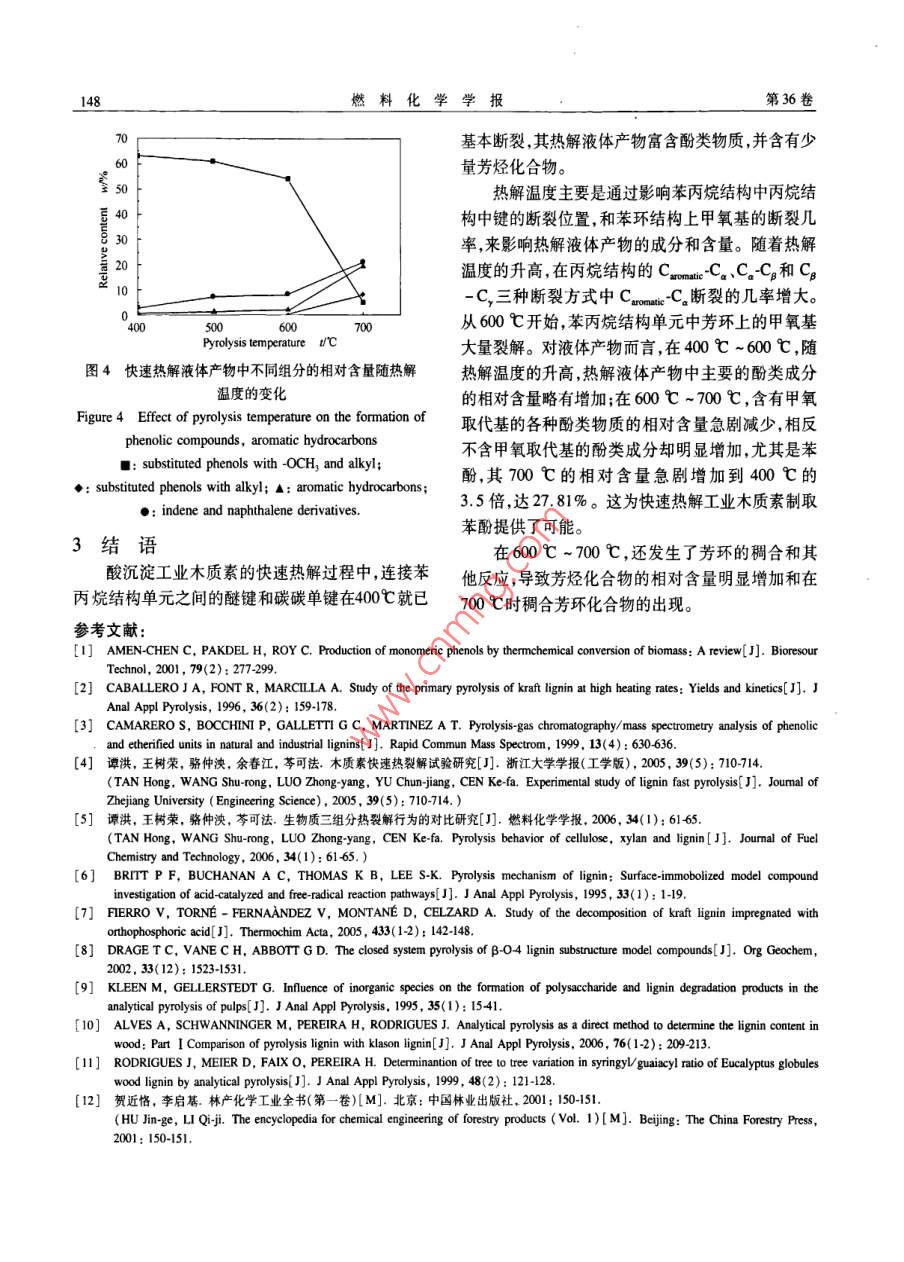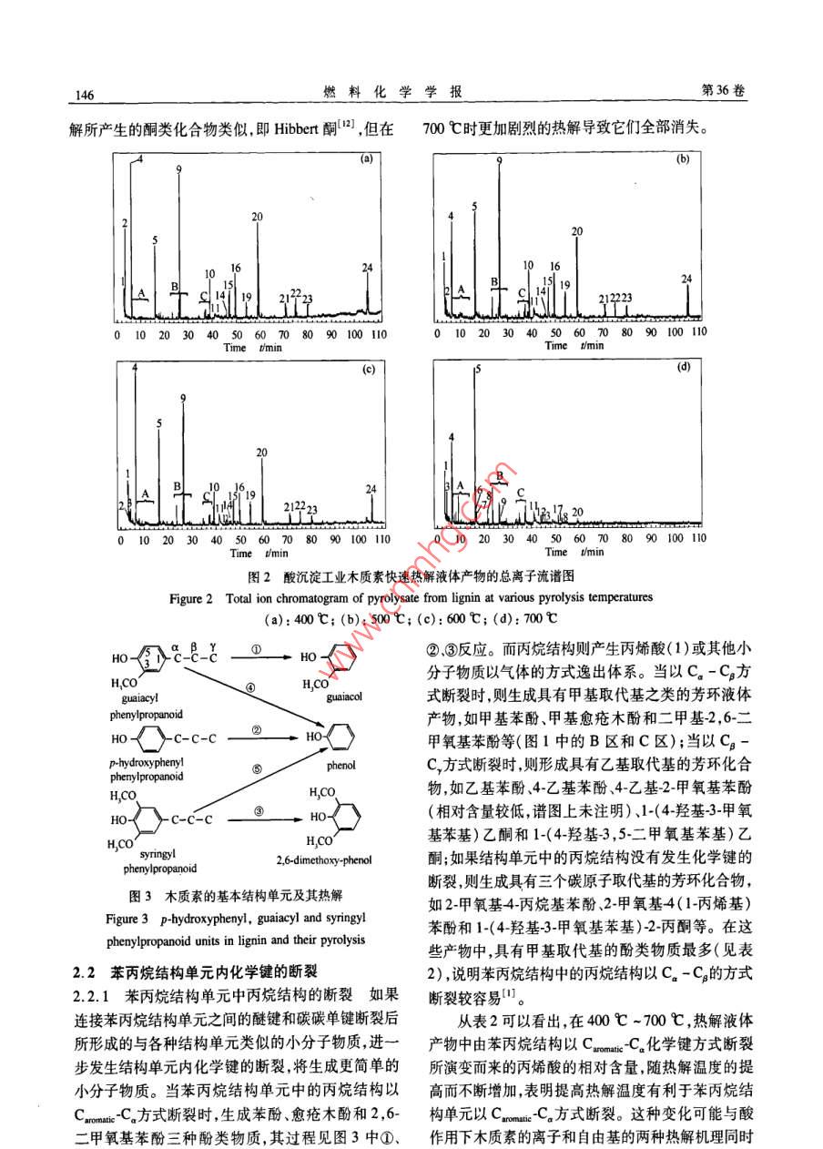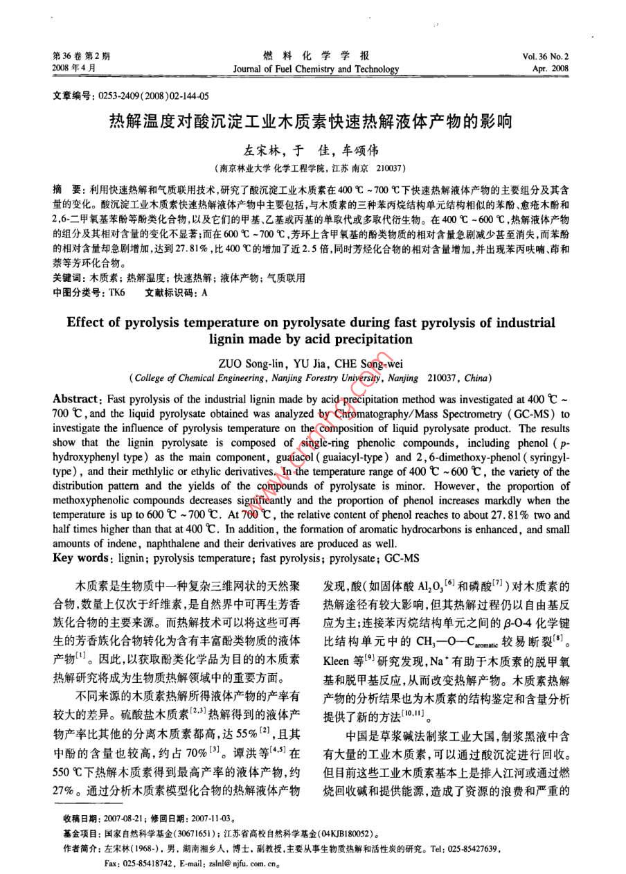 第36卷第2期燃料化學(xué)學(xué)報(bào)Vol. 36 No.22008年4月Journal of Fuel Chemistry and TechnologyApr.2008文章編號(hào): 0253-2409(2008 )02-144-05熱解溫度對(duì)酸沉淀工業(yè)木質(zhì)素快速熱解液體產(chǎn)物的影響左宋林,于佳,車(chē)頌偉(南京林業(yè)大學(xué)化學(xué)工程學(xué)院,江蘇南京210037)摘要:利用快速熱解和氣質(zhì)聯(lián)用技術(shù),研究了酸沉淀工業(yè)木質(zhì)素在400C~700C下快速熱解液體產(chǎn)物的主要組分及其含量的變化。酸沉淀工業(yè)木質(zhì)素快速熱解液體產(chǎn)物中主要包括,與木質(zhì)索的三種苯丙烷結(jié)構(gòu)單元結(jié)構(gòu)相似的苯酚、愈瘡木酚和2,6-二甲氧基苯酚等酚類(lèi)化合物,以及它們的甲基,乙基或丙基的單取代或多取代衍生物。在400 C -600 C ,熱解液體產(chǎn)物的組分及其相對(duì)含量的變化不顯著;而在600C-700C,芳環(huán)上含甲氧基的酚類(lèi)物質(zhì)的相對(duì)含最急劇減少甚至消失,而苯酚的相對(duì)含量卻急劇增加,達(dá)到27.81% ,比400 C的增加了近2.5倍,同時(shí)芳烴化合物的相對(duì)含量增加,并出現(xiàn)苯丙呋喃、茚和蔡等芳環(huán)化合物。關(guān)鍵詞:木質(zhì)素;熱解溫度;快速熱解;液體產(chǎn)物;氣質(zhì)聯(lián)用中圖分類(lèi)號(hào): TK6文獻(xiàn)標(biāo)識(shí)碼: AEffect of pyrolysis temperature on pyrolysate during fast pyrolysis of industriallignin made by acid precipitationZUO Song-lin, YU Jia, CHE Song-wei(College of Chemical Engineering, Nanjing Forestry University, Nanjing 210037, China)Abstract: Fast pyrolysis of the industrial lignin made by acid precipitation method was investigated at 400 C ~700 C, and the liquid pyrolysate obtained was analyzed by Chromatography/Mass Spectrometry (GC-MS) to .investigate the influence of pyrolysis temperature on the composition of liquid pyrolysate product. The resultsshow that the lignin pyrolysate is composed of single-ring phenolice compounds, including phenol ( P-hydroxyphenyl type) as the main component, guaiacol ( guaiacyl-type ) and 2 , 6-dimethoxy-phenol ( syringyl-type), and their methlylic or ethylic derivatives. In the temperature range of 400 C ~600 C, the variety of thedistribution patterm and the yields of the compounds of pyrolysate is minor. However, the proportion ofmethoxyphenolic compounds decreases significantly and the proportion of phenol increases markdly when thetemperature is up to 600 ~ 700 C. At 700 C, the relative content of phenol reaches to about 27.81% two andhalf times higher than that at 400 C. In addition, the formation of aromatic hydrocarbons is enhanced, and smallamounts of indene,, naphthalene and their derivatives are produced as well.Key words: lignin; pyrolysis temperature; fast pyrolysis; pyrolysate; GC-MS木質(zhì)素是生物質(zhì)中一種復(fù)雜三維網(wǎng)狀的天然聚發(fā)現(xiàn),酸(如固體酸Al20356)和磷酸”1)對(duì)木質(zhì)素的合物,數(shù)量上僅次于纖維素,是自然界中可再生芳香熱解途徑有較大影響,但其熱解過(guò)程仍以自由基反族化合物的主要來(lái)源。而熱解技術(shù)可以將這些可再應(yīng)為主;連接苯丙烷結(jié)構(gòu)單元之間的β-04化學(xué)鍵生的芳香族化合物轉(zhuǎn)化為含有豐富酚類(lèi)物質(zhì)的液體比結(jié)構(gòu)單元中的CH,-O-Cxcomaic 較易斷裂[8]。產(chǎn)物"。因此,以獲取酚類(lèi)化學(xué)品為目的的木質(zhì)素Kleen等[9]研究發(fā)現(xiàn),Na*有助于木質(zhì)素的脫甲氧熱解研究將成為生物質(zhì)熱解領(lǐng)域中的重要方面?;兔摷谆磻?yīng),從而改變熱解產(chǎn)物。木質(zhì)素?zé)峤獠煌瑏?lái)源的木質(zhì)素?zé)峤馑靡后w產(chǎn)物的產(chǎn)率有產(chǎn)物的分析結(jié)果也為木質(zhì)素的結(jié)構(gòu)鑒定和含量分析較大的差異。硫酸鹽木質(zhì)素[2.3熱解得到的液體產(chǎn)提供了新的方法(10.11。物產(chǎn)率比其他的分離木質(zhì)素都高,達(dá)55%(2],且其中國(guó)是草漿堿法制漿工業(yè)大國(guó),制漿黑液中含中酚的含量也較高,約占70%印。譚洪等[4S])在有大量的工業(yè)木質(zhì)素,可以通過(guò)酸沉淀進(jìn)行回收。550C下熱解木質(zhì)素得到最高產(chǎn)率的液體產(chǎn)物,約但目前這些工業(yè)木質(zhì)素基本上是排入江河或通過(guò)燃27%。通過(guò)分析木質(zhì)素模型化合物的熱解液體產(chǎn)物燒回收堿和提供能源,造成了資源的浪費(fèi)和嚴(yán)重的收稿日期: 2007-08-21;修回日期: 207-1103.基金項(xiàng)目:國(guó)家自然科學(xué)基金( 30671651);江蘇省高校自然科學(xué)基金(04KJB180052)。作者簡(jiǎn)介:左宋林(1968-).男,湖南湘鄉(xiāng)人,博士,副教授,主要從事生物質(zhì)熱解和活性炭的研究。Tel: 025 85427639,Fax: 025 85418742. E-mail; zslnl@ njfu. com. cn。第2期左宋林等:熱解溫度對(duì)酸沉淀工業(yè)木質(zhì)素快速熱解液體產(chǎn)物的影響145環(huán)境污染。因此,工業(yè)木質(zhì)素的熱解對(duì)于資源利用1.2液體產(chǎn)物的分析熱解液體產(chǎn)物的分析采用和環(huán)境保護(hù)都有重要意義。本實(shí)驗(yàn)著重研究酸沉淀Thermo Finnigan Trace DSQ氣質(zhì)聯(lián)用儀進(jìn)行。氣相工業(yè)木質(zhì)素的快速熱解溫度對(duì)液體產(chǎn)物中酚類(lèi)物質(zhì)色譜條件:色譜柱DB-5(25 mx0. 25 mm x組成的影響,為工業(yè)木質(zhì)素?zé)峤庵迫》宇?lèi)化學(xué)品提0.25 μm);柱溫40 C,保持2 min,以1 C/min升供理論依據(jù)。溫速率升至130 C ,再以20 C/min升至300C,保1實(shí)驗(yàn)部分持5min;