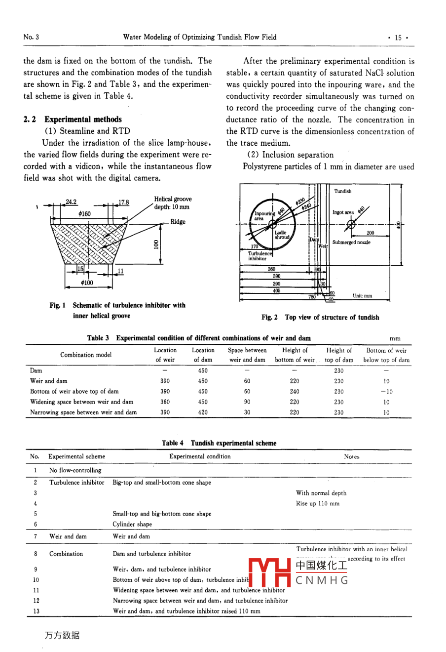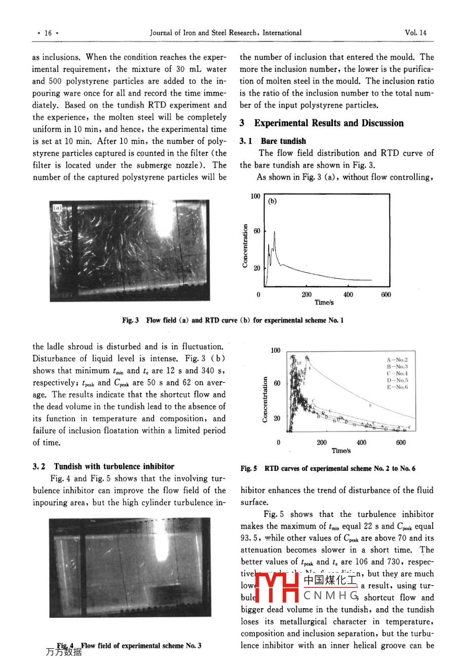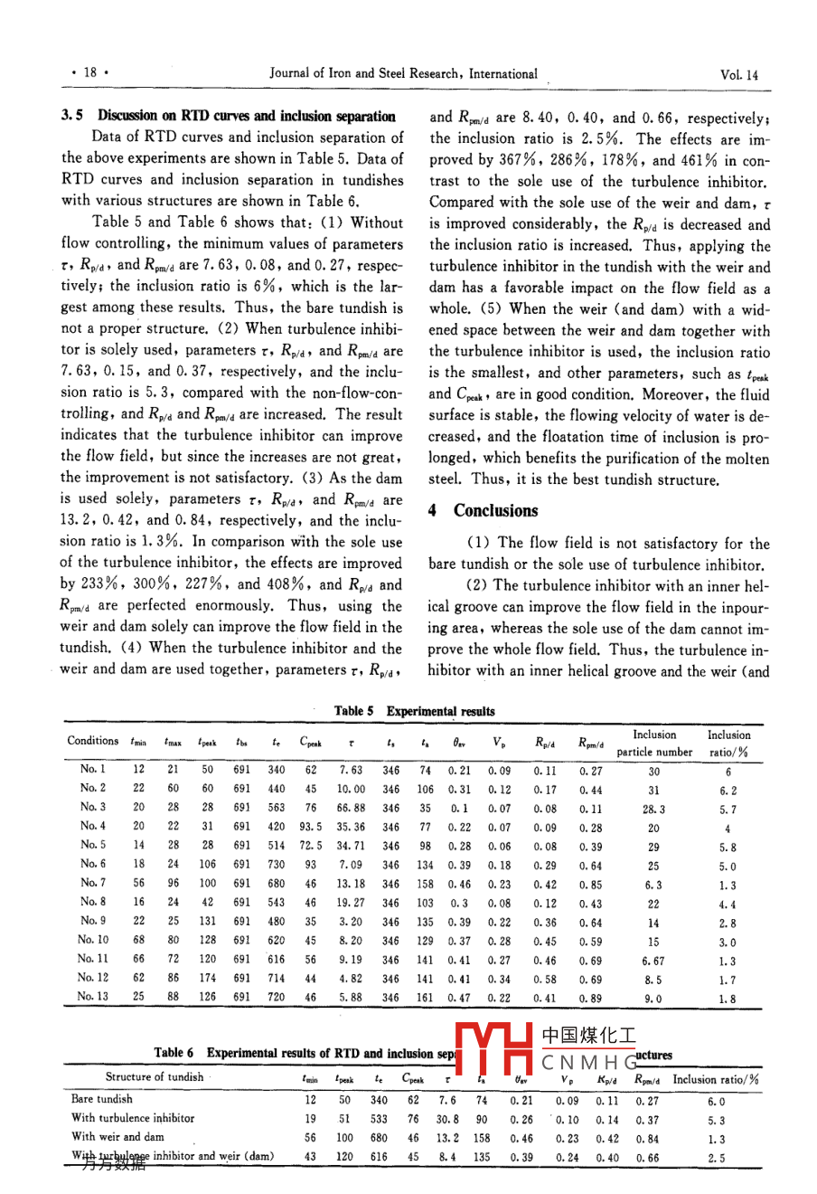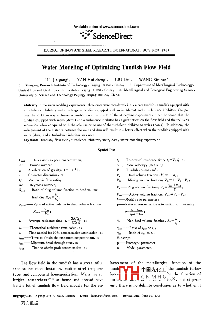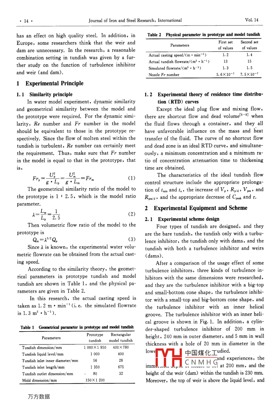 Available online at www.sciencedirect.comScienceDirectJOURNAL OF IRON AND STEEL RBSEARCH, INTERNATIONAL. 2007, 14(3): 13-19Water Modeling of Optimizing Tundish Flow FieldLIU Jin-gang',YAN Hui-cheng' ,LIU Liu2,W ANG Xin-hua'(1. Shougang Research Institute of Technology, Beiing 100041, China; 2. Department of Metallurgical Technology,Central Iron and Steel Research Institute, Beijing 100081, China; 3. Metallurgical and Ecological Engineering School,University of Science and Technology Beiing, Beijing 100083, China)Abstract: In the water modeling experiments, three cases were considered, ie,a bare tundish, a tundish equipped witha turbulence inhibitor, and a rectangular tundish equipped with weirs (dams) and a turbulence inhibitor. Compa-ring the RTD curves, inclusion separation, and the result of the streamline experiment, it can be found that thetundish equipped with weirs (dams) and a turbulence inhibitor has a great effect on the flow field and the inclusionseparation when compared with the sole use or no use of the turbulent inhibitor or weirs (dams). In addition, theenlargement of the distance between the weir and dam will result in a better effect when the tundish equipped withweirs (dam) and a turbulence inhibitor was used.Key words: tundish; flow field; turbulence inhibitor; weir; dam; water modeling experimentSymbol ListCpak一Dimensionless peak concentration;,一 Theoretical residence time, L,=V/Q, s;Fr- - -Froude number;-Flow velocity, (m. s~1);g- - Acceleration of gravity, (m. s~i);V一-Tundish volume, m* ;-Character dimension, m;-Dead volume fraction, V。=1-0.v;Q一-Volumetric flow ratio;Mixing volume fraction, Vn=1- -V,- -Vs;Re- -Reynolds number;V,- Plug volume fraction, V, =the;R:/d- Ratio of plug volume fraction to dead volumeVm- Active volume fraction, Vmm =V, +Vm;fraction, Ru-號;-Model ratio parameter;Rpm/d- - -Ratio of active volume to dead volume fraction,一Ratio of concentration attenuation to thickening,Rmwu=-;4.- - Average residence time,.= CO ,0一-Non-dead volume fraction, 0.=二;2C(I)m一Theoretical residence time twice, S;Ppak- - -Ratio of troak to,;t.-- -Time needed for 90% concentration attenuation, s;0min一Ratio of tain tol,;Time to obtain the maximum concentration, s;Subscripttmim- Minimum breakthrough time, s;p一Prototype parameter;-Time to obtain peak concentration, s;m- -Model parameter.The flow field in the tundish has a great influ- hancement of the metallurgical function of theence on inclusion floatation, molten steel tempera-tund中國煤化工the tundish turbu-ture, and component homogenization. Many metal- lencefor the function oflurgical researchers[1-4] at home and abroad haveHHC N M HSisho, butt at presbuilt a lot of tundish flow field models for the en-ent, there is no definite conclusion as to whether itBlography;LIU Jin-gang(1976-), Male, Doctor;E-mail: liujg9916@163. com; Rerised Date: June 10, 2005.●14●Journal of Iron and Steel Research, InternationalVol. 14has an effect on high quality steel. In addition, inTable 2 Physical parameter in prototype and model tundishEurope, some researchers think that the weir andFirst setSecond setParametersof valuesdam are unnecessary. In the research, a reasonableActual casting speed/(m●min 1 )1.21.4combination setting in tundish was given by a fur-Actual tundish flowrate/(m3 ●h-1)1:15ther study on the function of turbulence inhibitorSimulated flowrate/(m2 .h-1)1.31.and weir (and dam).Nozzle Fr number5.6X10-7 7. 5X10-91 Experimental Principle1.1 Similarity principle1.2 Experimental theory of residence time distribu-In water model experiment, dynamic similaritytion (RTD) curvesand geometrical similarity between the model andExcept the ideal plug flow and mixing flow,the prototype were required. For the dynamic simi-there are shortcut flow and dead volumef- -8] whenlarity,Re number and Fr number in the modelthe fluid flows through a container, and they allshould be equivalent to those in the prototype re-have unfavorable influence on the mass and heatspectively. Since the flow of molten steel within thetransfer of the fluid. The curve of no shortcut flowtundish is turbulent, Re number can certainly meetand dead zone is an ideal RTD curve, and simultane-the requirement. Thus, make sure that Fr numberously, a minimum concentration and a minimum ra-in the model is equal to that in the prototype, thattio of concentration attenuation time to thickeningis,time are obtained.UThe characteristics of the ideal tundish flowFr,=:= Frm(1)control structure include the appropriate prolonga-The geometrical similarity ratio of the model totion of tmia andt, the increase of V,, Ro/a, Vpm, andthe prototype is 1 : 2.5, which is the model ratioRpm/d, and the appropriate decrease of Cpek and t.parameter.2 Experimental Equipment and Scheme(2)Lp 2.52. 1 Experimental scheme designThen volumetric flow ratio of the model to theFour types of tundish are designed, and theyprototype isare the bare tundish, the tundish only with a turbu-Qm=λ/2Q, .lence inhibitor, the tundish only with dams, and theSince λ is known, the experimental water volu-tundish with both a turbulence inhibitor and weirsmetric flowrate can be obtained from the actual cast-(dams).ing speed.After a comparison of the usage effect of someAccording to the similarity theory, the geomet-turbulence inhibitors, three kinds of turbulence in-rical parameters in prototype tundish and modelhibitors with the same dimensions were researched,tundish are shown in Table 1, and the physical pa-and they are the turbulence inhibitor with a big-toprameters are given in Table 2.and small-bottom cone shape, the turbulence inhibi-In this research, the actual casting speed istor with a small-top and big-bottom cone shape, andtaken as1.2 m. min-'(i.e. the simulated flowratethe turbulence inhibitor with an inner helicalis1.3 m3●h-1).groove. The turbulence inhibitor with an inner heli-cal groove is shown in Fig. 1. In addition, a cylin-Table 1 Geometrical parameter in prototype a