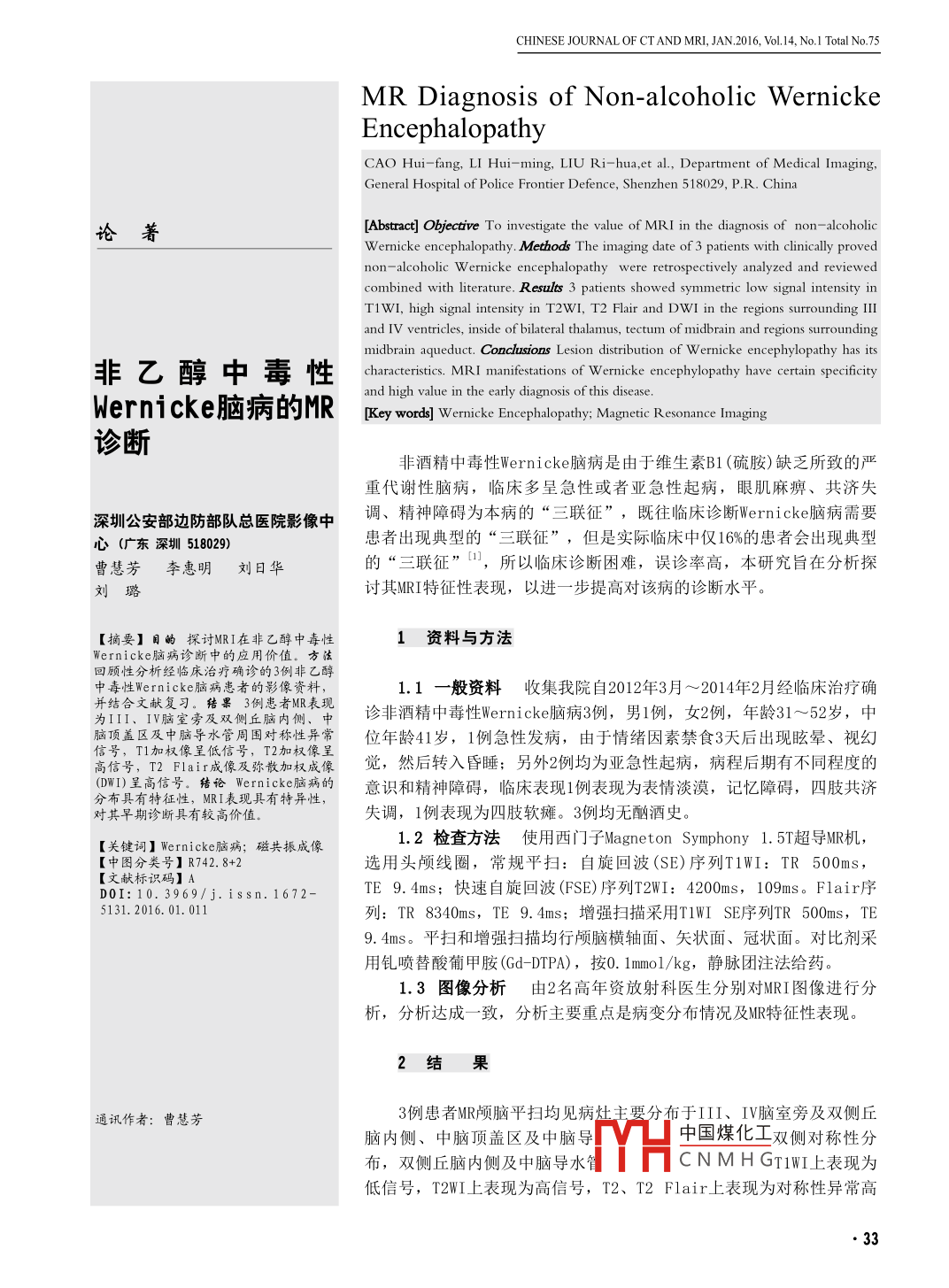 CHINESE JOURNAL OF CT AND MRI JAN, 2016, Vol, 14. No I Total No 75MR Diagnosis of Non-alcoholic WernickeEncephalopathpipCAO Hui-fang, LI Hui-ming, LIU Ri-hua, et al., Department of Medical Imaging,General Hospital of Police Frontier Defence, Shenzhen 518029, P. R. China論著[Abstract Objective To investigate the value of MRI in the diagnosis of non-alcoholicnon-alcoholic Wernicke encephalopathy were retrospectively analyzed and reviewedombined with literature. Results 3 patients showed symmetric low signal intensity inT1WI, high signal intensity in T2WI, T2 Flair and DWI in the regions surrounding IIIand IV ventricles, inside of bilateral thalamus, tectum of midbrain and regions surrounding非乙醇中毒性characteristics. MRI manifestations of Wernicke encephylopathy have certain specificity硎 wernicke腦病的MRand high value in the early diagnosis of this diseaseKey words] Wernicke Encephalopathy; Magnetic Resonance Imaging診斷非酒精中毒性 Wernicke腦病是由于維生素B1(硫胺)缺乏所致的嚴(yán)重代謝性腦病,臨床多呈急性或者亞急性起病,眼肌麻痹、共濟(jì)失深圳公安部邊防部隊(duì)總醫(yī)院影像中調(diào)、精神障礙為本病的“三聯(lián)征”,既往臨床診斷 Wernicke腦病需要心(廣東深圳518029)患者出現(xiàn)典型的“三聯(lián)征”,但是實(shí)際臨床中僅16%的患者會(huì)出現(xiàn)典型曹慧芳李惠明劉日華的“三聯(lián)征”口,所以臨床診斷困難,誤診率高,本研究旨在分析探討其MRI特征性表現(xiàn),以進(jìn)一步提高對(duì)該病的診斷水平?!菊磕康奶接慚RI在非乙醇中毒性1資料與方法Wernicke腦病診斷中的應(yīng)用價(jià)值。方法回顧性分析經(jīng)臨床治療確診的3例非乙醇中毒性 Wernicke腦病患者的影像資料,1.1一般資料收集我院自2012年3月~2014年2月經(jīng)臨床治療確為1、V腦室旁及雙側(cè)丘腦內(nèi)側(cè),中診非酒精中毒性 Wernicke腦病3例,男1例,女2例,年齡31~52歲,中腦頂蓋區(qū)及中腦導(dǎo)水管周圍對(duì)稱性異常位年齡4歲,1例急性發(fā)病,由于情緒因素禁食3天后出現(xiàn)眩暈、視幻高信號(hào),T2F1ar成像及彌散加權(quán)成像覺(jué),然后轉(zhuǎn)入昏睡;另外2例均為亞急性起病,病程后期有不同程度的ωWI〕呈高信號(hào)。結(jié)" wernicke腦病的意識(shí)和精神障礙,臨床表現(xiàn)l例表現(xiàn)為表情淡漠,記憶障礙,四肢共濟(jì)分布具有特征性,MRI表現(xiàn)具有特異性對(duì)其早期診斷具有較高價(jià)值失調(diào),1例表現(xiàn)為四肢軟癱。3例均無(wú)酗酒史。【關(guān)鍵詞】 Wernicke腦病;磁共振成像1.2檢查方法使用西門子 Magneton Symphony1.5T超導(dǎo)M機(jī),【中圖分類號(hào)】R742.8+2選用頭顱線圈,常規(guī)平掃:自旋回波(SE)序列T1WI:TR500ms【文獻(xiàn)標(biāo)識(shí)碼】AD0I:10.3969/j.issn.1672-TE9.4ms;快速自旋回波(FSE)序列T2WI:4200ms,109ms。 Flair序5131.2016.01.011列:TR8340ms,TE9.4ms;增強(qiáng)掃描采用 TIWI SE序列TR500ms,TE9.4ms。平掃和增強(qiáng)掃描均行顱腦橫軸面、矢狀面、冠狀面。對(duì)比劑采用釓噴替酸葡甲胺(Gd-DTPA),按0. I mmol/kg,靜脈團(tuán)注法給藥1.3圖像分析由2名高年資放射科醫(yī)生分別對(duì)MRI圖像進(jìn)行分析,分析達(dá)成一致,分析主要重點(diǎn)是病變分布情況及MR特征性表現(xiàn)。2結(jié)果通訊作者:曹慧芳3例患者愀R顱腦平掃均見(jiàn)病灶主要分布于IIIV腦室旁及雙側(cè)丘腦內(nèi)側(cè)、中腦頂蓋區(qū)及中腦導(dǎo)中國(guó)煤化工雙側(cè)對(duì)稱性分布,雙側(cè)丘腦內(nèi)側(cè)及中腦導(dǎo)水CNMHGTIWI上表現(xiàn)為低信號(hào),T2WI上表現(xiàn)為高信號(hào),T2、T2 Flair上表現(xiàn)為對(duì)稱性異常高中國(guó)CT和RI雜志2016年1月第14卷第1期總第75期信號(hào),在彌散加權(quán)成像(DWI,b值3.1 Wernicke腦病的病因、血性腦灰質(zhì)炎而提出。1940年1000)亦表現(xiàn)為雙側(cè)對(duì)稱性異常病理及臨床表現(xiàn)Campbell和 Russell強(qiáng)調(diào)營(yíng)養(yǎng)和高信號(hào)。增強(qiáng)掃描2例輕度斑點(diǎn)3.1.1 Wernicke腦病的病 Wernicke腦病有密切關(guān)系,并提狀對(duì)比強(qiáng)化,1例無(wú)強(qiáng)化,見(jiàn)圖因: Wernicke腦病( Wernick‘e出硫胺素缺乏是引起代謝異常性encephalopathy,wE)是由維生素腦病的誘發(fā)因素。 Wernicke腦B1(硫胺)缺乏導(dǎo)致的中樞神經(jīng)系病的病因繁多,常見(jiàn)于慢性酒精3討論統(tǒng)的代謝障礙綜合癥,由 Wernicke中毒和妊娠嘔吐者,近年來(lái)于1881年首次發(fā)現(xiàn)并以急性出各種原因所致的營(yíng)養(yǎng)不良和胃圖1-6T1WI、T2W及 FLAIR顯示雙側(cè)丘腦內(nèi)側(cè)核及下丘腦對(duì)稱性異常信號(hào)影。圖7-9T1WI、T2WI及FLAR顯示中腦導(dǎo)水管周圍對(duì)稱性異常信號(hào)影。圖10-12DW1顯示上述病中國(guó)煤化工號(hào)圖1315CNMHGCHINESE JOURNAL OF CT AND MRI JAN, 2016, Vol, 14. No I Total No 75腸外營(yíng)養(yǎng)導(dǎo)致的非酒精中毒性側(cè)、中腦頂蓋區(qū)、乳頭體、四疊的異常信號(hào)改變更明顯,由于非Wernicke腦病的發(fā)病率明顯提體及中腦導(dǎo)水管周圍灰質(zhì)3,呈嗜酒性 Wernicke腦病患者是首次高,如急性胰腺炎、結(jié)腸癌術(shù)后對(duì)稱性,這些區(qū)域因?yàn)檠趸x發(fā)生硫胺素缺乏代謝性障礙,乳化療后引起間斷惡心、嘔吐病效率高,所以對(duì)硫胺素的缺乏很頭體不會(huì)發(fā)生明顯萎縮,我們的3史,還有報(bào)道AIDS患者和甲亢患敏感。 Wernicke腦病常規(guī)MRI包例病例均未看到乳頭體體積