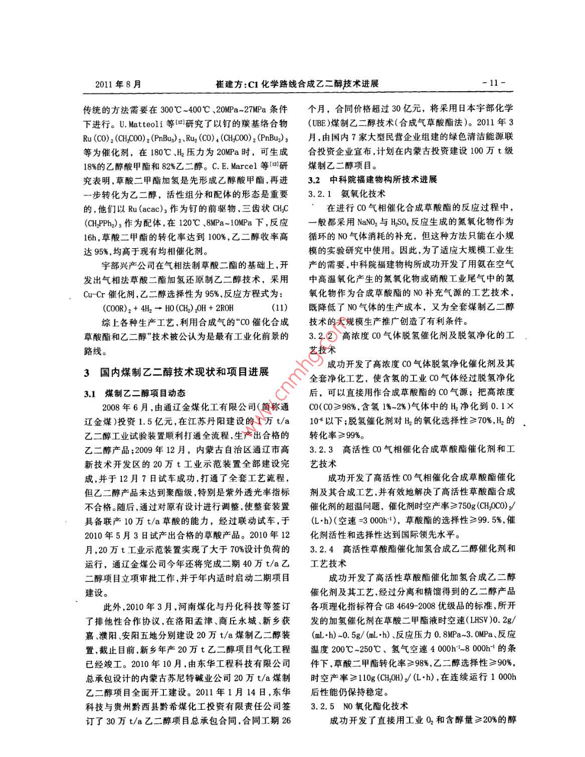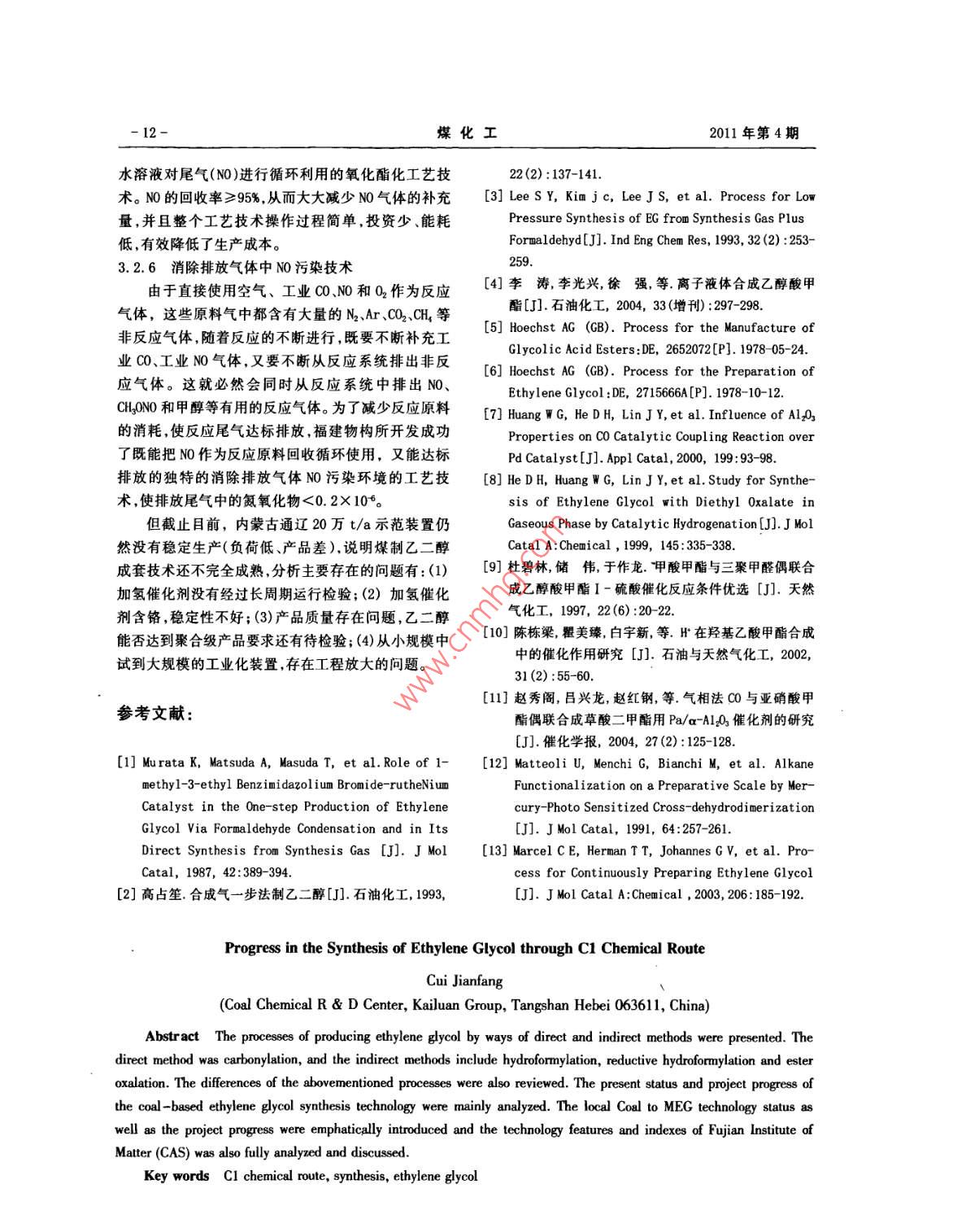 第4期(總第155期煤化工No 4(Total No 155)2011年8月Coal Chemical IndustryC1化學(xué)路線合成乙二醇技術(shù)進展崔建方(開灤集團煤化工研發(fā)中心河北唐山063611)摘要介紹了C化學(xué)路線合成乙二醇的各種方法,其中直接法為合成氣一步合成乙二醇,而間接法則包括甲醇法、甲醛法、草酸酯法等,并對各種方法的工藝技術(shù)特點進行了評述。重點介紹了國內(nèi)煤制乙二醇技術(shù)現(xiàn)狀和項目進展情況,并分析了中科院福建物構(gòu)所開發(fā)的煤制乙二醇技術(shù)特點和指標。關(guān)鍵詞Cl化學(xué)路線合成乙二醇文章編號:1005-9598(2011)-04000904中圖分類號:TQ54文獻標識碼:A乙二醇(EG)是一種重要的石油化工基礎(chǔ)有機原化劑,但所需壓力仍太高(56MPa),催化劑選擇性低的料,從它可衍生出100多種化學(xué)品。其中聚酯(包括聚問題也沒有根本解決。20世紀80年代以來,經(jīng)研究酯纖維聚酯瓶、聚酯薄膜等)是我國乙二醇的主要消確定,合成氣直接合成乙二醇的優(yōu)良催化劑主要分為費領(lǐng)域,其消費量約占國內(nèi)總消費量的90%,另外約銠和釕兩大類。K. Murata等u.用苯并咪唑鹽、釕的10%用于防凍劑、黏合劑、油漆溶劑、耐寒潤滑油以及羰基化合物和有機胺作催化劑,在1OMa、150℃下反表面活性劑等。目前工業(yè)生產(chǎn)乙二醇路線為石腦油裂應(yīng)3h,生成41.3%的乙二醇反應(yīng)條件相對溫和。日本解生產(chǎn)乙烯,乙烯氧化生產(chǎn)環(huán)氧乙烷(E),最后環(huán)氧三井化學(xué)和佳友化學(xué)公司以Ru-1-烷基-2-取代苯乙烷水合得到乙二醇。在石油價格居高不下的經(jīng)濟環(huán)并咪唑為催化劑在四甘醇二甲醚溶劑中獲得了較高境下,C1化學(xué)路線由于具備原料廣泛、經(jīng)濟性好、工的催化活性,乙二醇選擇性達到70%。藝更合理的優(yōu)勢,逐步成為非石油路線合成乙二醇的目前,合成氣直接合成乙二醇仍處于研究階段研究熱點。主要原因是存在反應(yīng)壓力過高(大于50MPa)(2、Co轉(zhuǎn)化率較低、乙二醇選擇性不理想催化劑穩(wěn)定性不夠1直接法以及反應(yīng)體系較復(fù)雜等問題,工業(yè)化難度較大。合成氣直接合成法是理論價值最高的一條工藝2間接法路線,也最符合原子經(jīng)濟性,其方程式如下2C0+3H2→ HOCHA CH2OH(1)2.1甲醇法(甲醇氧化偶聯(lián)法此反應(yīng)屬于自由能增加的反應(yīng),在熱力學(xué)上很難在引發(fā)劑存在下,通過自由基反應(yīng)機理,由甲醇進行,必須在高溫高壓和催化劑的條件下進行。此方生成CHOH自由基,然后2個自由基氧化偶聯(lián)可形成法最早是由美國杜邦公司于1947年提出,采用羰基乙二醇。反應(yīng)過程為鈷為催化劑,反應(yīng)在超高壓(340MPa)下進行,雖然反CHOH→CH·+·H應(yīng)條件苛刻,但是乙二醇的產(chǎn)率卻很低。1971年,美CH4O·+CHOH→CHOH+·CH2國UC公司采用三烷基膦和胺改性的銠作催化劑,并2·CH2OH→ HOCH CH OH(4)使用添加劑,結(jié)果顯示其活性和選擇性明顯優(yōu)于鈷催由于甲醇碳氫鍵與烷基碳氫鍵均屬惰性鍵,能閾較大,據(jù)報道,目前的研究都采取了相當嚴格的反應(yīng)收稿日期:2011-03-02條件,需用過氧化物、y射線、銠和紫外光等催化,結(jié)作者簡介:崔建方(1982-),男,2005年本科畢業(yè)于黑龍果不理想,目前研究大都處于實驗室小試階段反應(yīng)江科技大學(xué),2008年碩士研究生畢業(yè)于中國石油大學(xué)(華過程的有效控制成為主要的研究難點。東),工程師,主要從事煤化工技術(shù)研發(fā)工作該法原料甲醇價廉易得,乙二醇的收率也較高10煤化工2011年第4期若生產(chǎn)規(guī)模能擴大,該工藝路線比較有吸引力。的研究已經(jīng)使情況大大改善,如用Co、Zn、Cr、Cu等的22甲醛法氧化物或復(fù)合氧化物及Rh-Re作為乙醇酸甲酯加氫2.2.1甲醛羰化法還原反應(yīng)的催化劑,乙二醇收率達到40%-70%。德國甲醛羰化法由美國杜邦公司開發(fā),并建成小規(guī)模赫斯特公司采用 Kieselguhr催化劑(10.6%Pd-2.3%工業(yè)生產(chǎn)裝置,是以合成氣為基礎(chǔ)唯一曾經(jīng)工業(yè)化的Re),在172℃、20MPa條件下,得到97%收率的乙二醇,個項目。該方法是以甲醛和C0為原料,在150℃~其選擇性達到93.6%6225℃、50.6MPa~101.3Pa下,經(jīng)HS04或BF3催化劑近期,此路線的研究重點集中在非液體酸催化劑催化下縮合成乙醇酸,乙醇酸在HSO4催化下,于的研究上。清華大學(xué)以磷鎢酸、硅鎢酸等雜多酸為210℃-2l5℃、81.OMPa-91.1Pa下,用甲醇酯化為乙偶聯(lián)催化劑,催化活性優(yōu)于硫酸等液體酸催化劑,并醇酸甲酯,后者在210℃-215℃、3.OMPa、空速2000提出雜多酸催化劑是以酸堿協(xié)同方式為主要反應(yīng)途h、過量氫(氫與乙醇酸甲酯摩爾比為30:1)存在的徑。中科院成都有機所m以硫酸、硫酸/金屬羰基化條件下,用亞鉻酸銅為催化劑加氫還原生成乙二醇,合物及固體超強酸S0/ZrO2為催化劑,其MG和WAc甲醇則循環(huán)使用,第一步和第二步可同時完成。反應(yīng)的總收率達到60%-97%過程為23草酸酯法(CO氧化偶聯(lián)法)HCH0+C0+H0→ HOCH COOH(5)草酸二酯法合成乙二醇第一步是草酸二酯的合HOCH COOH CH3OH- HOCH COOCH3 H,0(6)成,有液相法和氣相法兩種工藝HOCH-COOCH, 2H2- HO(CH2)2OH+ CH3OH(7)美國聯(lián)合石油公司于1966年首先開發(fā)出液相合每步反應(yīng)的收率都在90%~95%,按甲醛原料計,成草酸二酯技術(shù),用醇在C0存在下發(fā)生氧化羰化反乙二醇總