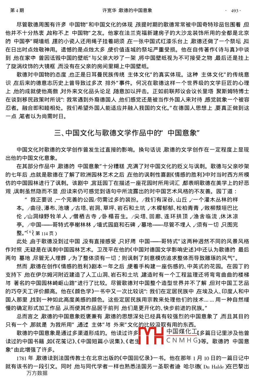 第55卷第4期武漢大學(xué)學(xué)報(人文科學(xué)版)Vol 55. No. 42002年7月Wuhan University Journal( Humanity SciencesJuly2002.490495●外國文學(xué)歌德的中國意象許寬華武漢大學(xué)外語學(xué)院,湖北武漢430072)[作者簡介]許寬華1953-)男湖北黃石人,武漢大學(xué)外語學(xué)院德文系教授主要從事德語文學(xué)與翻譯學(xué)研究。[摘要]從歌德孩提和青少年時期的生活環(huán)境看歊德雖未到過中國但受文化遷徙的影響仍然具有較深刻的中國意象這種意象一方面對他的創(chuàng)作起到一定的作用,另一方面對中國文化在歐洲的傳播產(chǎn)生過積極意義。也正因為他未曾到過中國所以他的所謂中國意象只不過是表面的、片面的和不完整的系不完全文化遷徙”所致[關(guān)鍵詞]文化迂徙沖國物沖國文化沖國意象[中圖分類號]I1[文獻(xiàn)標(biāo)識碼]A[文章編號]1000-53742002)4-0490.06在中國人的眼中歌德是西方文學(xué)巨匠研究歌德的專著論文不勝枚舉狂西方人的眼里歊德是文學(xué)天才有關(guān)他的專題研討會及論文專著不計其數(shù)洏在歌德的眼里,西方人和東方人有何差異、東方″物”到底如何?通過歌德的一生及他對中國物”及中國文化的意象也許可見一斑。何為意象?其一為表象的一種。即由記憶表象或現(xiàn)有知覺形象改造而成的想象性表象。其次為中國古代文藝?yán)碚撔g(shù)語指主觀情意和外在物象相融合的心象。意象感物而生之意包括藝術(shù)想象飛第221頁)意象與印象不同。印象是指感覺過的事物在人的頭腦里留下的跡象屬感性認(rèn)識階段。而意象是感物而生之意包括藝術(shù)想象。未到過中國的歌德在其生涯中雖然接觸到不少中國物”但他沒有停留在感性認(rèn)識階段而是由感性生發(fā)想象故產(chǎn)生意象。歌德的中國意象始于何時尚難定論。許多學(xué)者認(rèn)為J8世紀(jì)中葉后中國的文學(xué)藝術(shù)開始對德國發(fā)生影響而歌德出生在這個年代里因此他的中國意象應(yīng)當(dāng)始于此時。東方文化西遷與歌德的中國意象”約翰沃爾夫?qū)璧?749年8月28日生于德國萊因河畔的法蘭克福。歌德家的房子有一個悅耳美妙的名字叫三把七弦琴2P.13)具有當(dāng)時有教養(yǎng)的市民階層住所的特點。1755年改建時,歌德的父親特別強調(diào)內(nèi)部布置要舒適講究而不追求外觀他花了大量精力擺設(shè)他的藏書室和一個收藏同時代藝術(shù)家作品的畫廊在各個房間和寬敞的客廳里陳設(shè)著他各次旅行所購的紀(jì)念品其中不芝中國物”。一般地說德國人有著主流文化"的傳統(tǒng)因此那V凵中國煤化工對異國文化現(xiàn)象的好奇罷了CNMHG當(dāng)時東方文化向西方遷徙而代表東方文化主流的中國文化西遷歐洲可能被東方”化以至于人收稿日期:2001-1025第4期許寬華歌德的中國意象491們分不出多種文化出自的國度分不清中國文化與日本文化的特征甚至混為一團(tuán)。如把銀杏樹葉稱做中日″樹葉、把仿中國瓷器的日本陶瓷″視為藏世珍寶等。這種不完全的文化遷徙″導(dǎo)致歌德的中國意象是表面的、片面的和不完整的。這在他的言談及后來的文學(xué)創(chuàng)作中明顯地表現(xiàn)出來。歌德′中國意象”的產(chǎn)生和形成是通過他人將東方文化帶到西方實現(xiàn)的首先歊德對日本的認(rèn)識還得歸功于萊姆戈的恩格爾貝特克姆普費爾( Engelbert Kaempfer)醫(yī)生。后者于1690年至1692年到日本進(jìn)行了兩年的科學(xué)考察后在1729年用法語,777年用德語寫下了題為《日本史志》的考察專論成為歷史上第一部有關(guān)遠(yuǎn)東富島的科學(xué)開發(fā)的專著在1813年萊比錫戰(zhàn)亂時期,中國文化和日本文化幫助了歌德,使他擺脫了時下的困惑。如他在1815年1月23日寫給克里斯蒂安海因利希施羅塞爾的信中所說":一年前我認(rèn)真地游歷了中國和日本并使自己相當(dāng)熟悉了那個巨大的國家。3第103頁這當(dāng)然是在書中游歷。他于1813-1814年在他歐《在波蘭引進(jìn)德語的建議》一書中還曾對《日本史志》進(jìn)行了摘錄??四菲召M爾是在1712年將銀杏樹介紹到歐洲的用的是日本名所以現(xiàn)在西方語言都襲用至今稱銀杏為亞洲或日本和中國的樹種。有趣的是該樹名日本語拼寫原為Gin-Kyo據(jù)說是克姆普費爾誤將y"寫成了g"即寫成了 Ginkgo″故該詞在現(xiàn)代英語中為 Gingko"而在現(xiàn)代德語中則為 Ginkgo”或 Ginkgo"4第513頁銀杏樹引進(jìn)到歐洲是在23年以后的1735年首先在今荷蘭的烏德勒支后于1754年引進(jìn)到英國,大約在1800年才引進(jìn)到魏瑪。遺憾的是魏瑪?shù)幕蕦m花園里連一棵銀杏樹也沒能存活下來。使人欣慰的是在侯爵家族的房屋旁邊尚存一株據(jù)說是1813年栽種的。歌德于1815年秋為維勒默爾夫人創(chuàng)作著名旳《銀杏樹葉詩》時手上還拿著一片中日″樹葉。據(jù)說在德國海德堡還存有那片葉子。歌德不甘心僅見物議物停留在印象里而是善于借物生情、感物生意的詩中道這種樹葉來自東方,對我的花園充滿信賴,神秘意義予以品嘗,賜給知音莫大愉快。歌德對東方文化的喜歡是多方面的而所謂東方文化又以中國文化為源頭。他從小在家中接觸中國物”家中描金彩漆家具上的奇異小人房間蠟染壁帔上的宙宇留著胡須的小瓷人″等皆來自中國他對在德累斯頓附近的皮爾尼茨和魏瑪附近的
