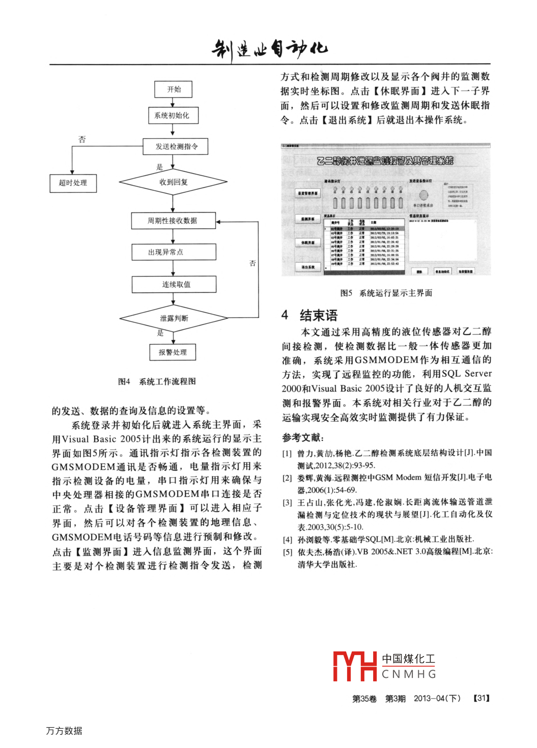 乙二醇野外管道遠程實時監(jiān)測報警系統(tǒng)Glycol field pipeline remote real-time monitoring and alarm system蔣偉,龍偉,白俟JIANG Wei, LONG Wei, BAI Jun(四川大學(xué)制造科學(xué)與工程學(xué)院,成都610065)摘要:本文設(shè)計了一種對乙二醇運輸管道迣露的遠程監(jiān)測報警的系統(tǒng)。乙二醇發(fā)生泄漏時,管道下方檢測容器液位升高,因此,檢測裝置采用液位傳感器間接檢測運輸管道下方檢測容器的液位,并將檢測到的液位值通過 GSMMODEM實時傳送回監(jiān)控中心,監(jiān)控中心軟件平臺處理接收到的數(shù)據(jù),如果發(fā)現(xiàn)數(shù)據(jù)異常,達到報警閥值就進行報警。從而本系統(tǒng)實現(xiàn)了對乙二醇管道的遠程實時監(jiān)測。關(guān)鍵詞:乙二醇;管道運輸;泄露檢測;遠程監(jiān)控中圖分類號:TP277文獻標識碼:A文章編號:1009-0134(2013)04(下)-0029-03Doi:10.3969/J.issn.10090134.2013.04(下).110引言根據(jù)系統(tǒng)的功能需求,以及系統(tǒng)的總體方案管道輸送是液體輸送最常用的方法,能夠?qū)崿F(xiàn)大量連續(xù)遠距離輸送。我國的管道輸送技術(shù)主設(shè)計,我們可以進一步構(gòu)造系統(tǒng)的運行與操作平臺總體方案功能模塊化設(shè)計,如圖1所示。我們把要運用于石油和天然氣領(lǐng)域,關(guān)于輸送過程中系統(tǒng)中所要求的數(shù)據(jù)管理操作,檢測裝置的地理的泄漏檢測問題研究比較多,且技術(shù)水平相對較高。但關(guān)于其他化工原料(如乙二醇)輸送過程設(shè)置,自檢操作,監(jiān)控操作等人機交互功能,全都設(shè)計在前臺程序中,而把實時信息管理,報警模塊中的泄漏檢測還未得到足夠的重視,相關(guān)的研究和遠程監(jiān)控的通信模塊集中在后臺程序中,并通過也比較少。如果不能及時發(fā)現(xiàn)泄漏并采取應(yīng)對措數(shù)據(jù)庫管理系統(tǒng)和系統(tǒng)驅(qū)動運行程序,把前后臺程施,不但會給企業(yè)造成很大的經(jīng)濟損失,而且可序橋接集成為系統(tǒng)運行的中央監(jiān)控系統(tǒng)能會對環(huán)境造成嚴重的污染。因此我們研制了乙通過系統(tǒng)的總體方案,我們可以根據(jù)系統(tǒng)需二醇野外管道實時監(jiān)測報警系統(tǒng)。乙二醇野外管求,對照檢查系統(tǒng)的功能設(shè)計是否符合要求,并道實時監(jiān)測報警系統(tǒng)能夠比較迅速有效地判定乙確定實施系統(tǒng)功能的技術(shù)路徑,同時可以對系統(tǒng)醇是否泄漏,并及時通知相關(guān)人員進行處理,的各個功能子模塊進行約束設(shè)計還能夠滿足操作人員及整個項目的各種操作需求及功能需求。閥井檢測裝置1系統(tǒng)的總體方案設(shè)計乙二醇管閥泄漏實時監(jiān)測與報警系統(tǒng)的總體方監(jiān)控系統(tǒng)案設(shè)計的思路是:基于公眾無線信息傳輸平臺(即移動通信平臺),將乙二醇檢測儀,安裝在乙二醇傳輸管道閥門豎井下端的側(cè)室內(nèi)。檢測儀是一個由微處理芯片控制的自動檢測裝置,它可以按任意設(shè)定的檢測周期,將檢測的實時數(shù)據(jù)轉(zhuǎn)換成手機短時間周期信,并發(fā)送至中央監(jiān)控與管理系統(tǒng)。中央監(jiān)控管理1警閥值設(shè)定遠程通信維護系統(tǒng)通過檢測裝置返回的數(shù)據(jù)進行處理判斷,當數(shù)據(jù)出現(xiàn)異常達到報警閥值就報警圖1總體方案功能能個模塊化收稿日期:2012-11-27V凵中國煤化工作者簡介:蔣偉(1989-),男,講師,碩士,研究方向為RFD技術(shù)CNMHG第35卷第3期2013-04(下)斜步業(yè)自北2實時監(jiān)測終端設(shè)計定時檢測功能21檢測裝置設(shè)計休眠功能我們用市面上不同廠家生產(chǎn)的乙二醇氣體檢測儀進行試驗,發(fā)現(xiàn)檢測效果并不理想,因此我休眠蘇醒功能們想到用一種高精度的液位傳感器進行間接檢自檢功能測。通常在管道的連接處發(fā)生泄露的幾率大于管道的其他部位,因此我們在連接處下方安裝一個檢系統(tǒng)功能電壓監(jiān)測功能指令即時回復(fù)功能測容器,檢測容器與管道的連接處通過漏斗相連,即時回復(fù)功能且發(fā)生泄露,乙二醇通過漏斗進入容器內(nèi),檢測測量值即時回復(fù)功能容器應(yīng)該盡量做到密封,防止其他液體進入容器影響測量。液位傳感器安裝在容器底部。溫濕度傳感電話號碼存儲功能短信處理功能器(輔助液位傳感器檢測), GSMMODEM,信號短信刪除功能處理電路安裝在檢測容器壁上22檢測裝置系統(tǒng)功能設(shè)計2監(jiān)測設(shè)備的系統(tǒng)功能通過用戶對乙二醇需求情況的分析可以知道,乙二醇的輸送是根據(jù)需要在特定的一些時間數(shù)據(jù)的各種操作,對數(shù)據(jù)庫的設(shè)計有以下四個要內(nèi)進行輸送,大多數(shù)時候并沒有輸送,可以使系求:1)數(shù)據(jù)的存儲、查詢、刪除、更新等操作方統(tǒng)在沒有輸送乙二醇的時候進入休眠狀態(tài),以降便、實用、有效;2)數(shù)據(jù)庫表的設(shè)計要合理低系統(tǒng)耗電量。另外,由于管道均安裝于野外,3)數(shù)據(jù)庫的可移植性;4)數(shù)據(jù)庫的安全性。因此采用 GSM MODEM作為通訊工具,以短信對于操作平臺來說,數(shù)據(jù)庫的設(shè)計要滿足息的方式實現(xiàn)現(xiàn)場監(jiān)測點與監(jiān)控室之間的數(shù)據(jù)交操作平臺數(shù)據(jù)處理的要求。因此本系統(tǒng)采用SQL互。為了降低通訊費用,可以設(shè