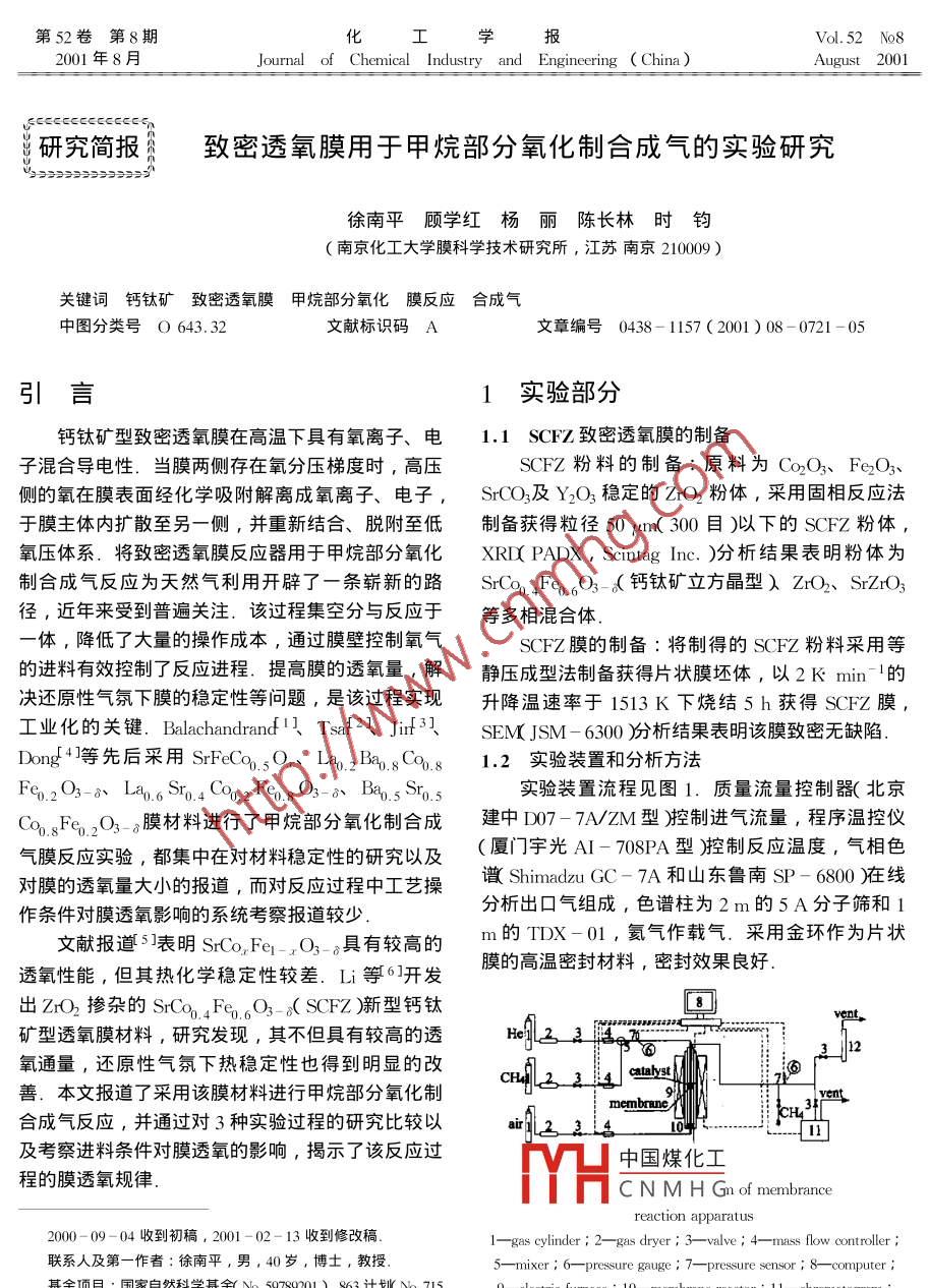 致密透氧膜用于甲烷部分氧化制合成氣的實驗研究