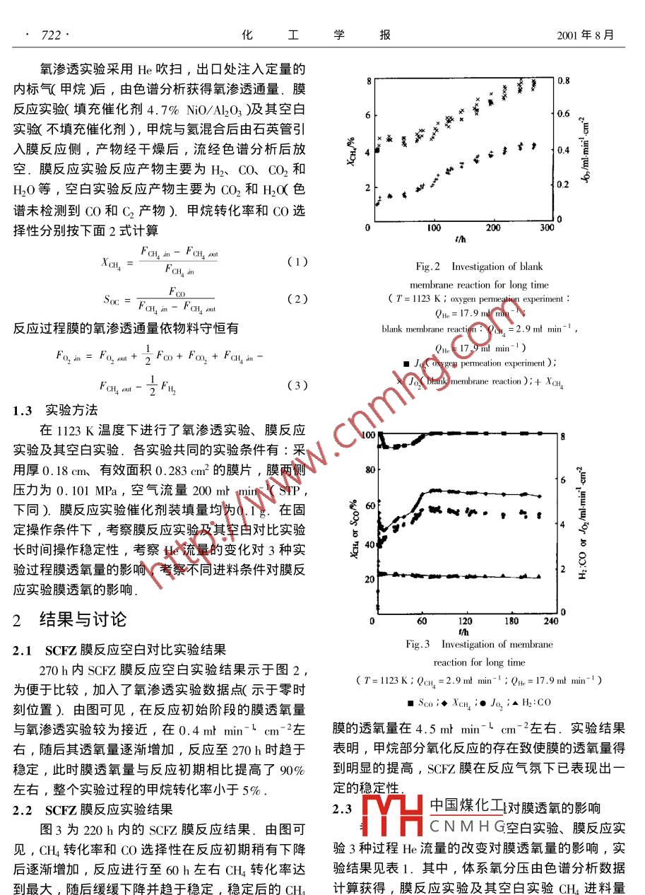 第52卷第8期化報Vol. 52 No82001年8月Chemical Industry and Engineering China)August 2001GCCCCCGCCCGCCS研究簡報8致密透氧膜用于甲烷部分氧化制合成氣的實驗研究徐南平顧學(xué)紅楊麗陳長林時鈞南京化工大學(xué)膜科學(xué)技術(shù)研究所,江蘇南京210000關(guān)鍵詞鈣鈦礦致密透氧膜甲烷部分氧化膜反應(yīng)合成氣中圖分類號文獻標(biāo)識碼A文章編號0438-1157(2001)08-0721-05引言1實驗部分鈣鈦礦型致密透氧膜在高溫下具有氧離子、電1.1SCHZ致密透氧膜的制備子混合導(dǎo)電性.當(dāng)膜兩側(cè)存在氧分壓梯度時,高壓SCFZ粉料的制備:原料為Co2O3、Fe2O3側(cè)的氧在膜表面經(jīng)化學(xué)吸附解離成氧離子、電子,SO及Y2O3穩(wěn)定的ZrO2粉體,采用固相反應(yīng)法于膜主體內(nèi)擴散至另一側(cè),并重新結(jié)合、脫附至低制備獲得粒徑50mm(300目)以下的SCFZ粉體氧壓體系.將致密透氧膜反應(yīng)器用于甲烷部分氧化XRI〔PADX, Scintag Inc.)分析結(jié)果表明粉體為制合成氣反應(yīng)為天然氣利用開辟了一條嶄新的路 SrCoo 4Fe06O3-K鈣鈦礦立方晶型)ZO2、SZO3徑,近年來受到普遍關(guān)注.該過程集空分與反應(yīng)于等多相混合體體,降低了大量的操作成本,通過膜壁控制氧氣SCFZ膜的制備:將制得的SCFZ粉料采用等的進料有效控制了反應(yīng)進程、提高膜的透氧量,解靜壓成型法制備獲得片狀膜坯體,以2Kmin-1的決還原性氣氛下膜的穩(wěn)定性等問題,是該過程實現(xiàn)升降溫速率于1513K下燒結(jié)5h獲得SCFZ膜工業(yè)化的關(guān)鍵. balachandrand"、Tsa2、Jit3、 SEM JSM-6300分析結(jié)果表明該膜致密無缺陷Ing4等先后采用SFC.O、LA12B31.C1.1.2實驗裝置和分析方法Fe.2O3-a、La.6Srn.4Co2FsO3-a、BasS.s實驗裝置流程見圖1.質(zhì)量流量控制器(北京o.Fe2O3-a膜材料進行了甲烷部分氧化制合成建中D7-7MZM型腔制進氣流量,程序溫控儀氣膜反應(yīng)實驗,都集中在對材料穩(wěn)定性的研究以及廈門宇光AI-708PA型)控制反應(yīng)溫度,氣相色對膜的透氧量大小的報道,而對反應(yīng)過程中工藝操 Shimadzu gc-7A和山東魯南SP-6800在線作條件對膜透氧影響的系統(tǒng)考察報道較少分析出口氣組成,色譜柱為2m的5A分子篩和1文獻報道表明S(oFe1-O2-具有較高的m的TDX-01,氦氣作載氣.采用金環(huán)作為片狀透氧性能,但其熱化學(xué)穩(wěn)定性較差.Li等6開發(fā)膜的高溫密封材料,密封效果良好出ZO2摻雜的SO4F06O3-(SCFZ)新型鈣鈦礦型透氧膜材料,研究發(fā)現(xiàn),其不但具有較高的透氧通量,還原性氣氛下熱穩(wěn)定性也得到明顯的改善.本文報道了采用該膜材料進行甲烷部分氧化制合成氣反應(yīng),并通過對3種實驗過程的研究比較以及考察進料條件對膜透氧的影響,揭示了該反應(yīng)過中國煤化工程的膜透氧規(guī)律CNMHGn ofmembrancereaction apparatusI-gas cylinder 2-gas dryer 3-valve :4-mass flow controller5--mixer 6-pressure gauge :7--pressure sensor;S-computer基金項目:國家自然科學(xué)基金(N0.59789001)863計劃No.7159-electric furnace 10--membrane reactor 11-chromatogram06-0123款幫學(xué)工程與技術(shù)重點實驗室開放基金資助項目12-bubble flow mete722化工學(xué)報200年8月氧滲透實驗采用He吹掃,出口處注入定量的內(nèi)標(biāo)氣甲烷后,由色譜分析獲得氧滲透通量.膜反應(yīng)實驗(填充催化劑4.7%NOA2O3)其空白0.6實驗不填充催化劑),甲烷與氦混合后由石英管引入膜反應(yīng)側(cè),產(chǎn)物經(jīng)干燥后,流經(jīng)色譜分析后放空.膜反應(yīng)實驗反應(yīng)產(chǎn)物主要為H2、CO、CO,和H2O等,空白實驗反應(yīng)產(chǎn)物主要為CO2和H2O色譜未檢測到CO和C2產(chǎn)物).甲烷轉(zhuǎn)化率和CO選擇性分別按下面2式計算(1)Fig 2 Investigation of blankmembrane reaction for long time(2)(T=l123 K; oxygen permeation experiment17.9m反應(yīng)過程膜的氧滲透通量依物料守恒有blank membrane reaction: QcH:=2.9 ml minQ1e=17.9mlFo, in= Fo, au 2Fc0+ Fo,+ FcH,in■Ja( oxygen permex Jo( blank membrane reaction ) XcH1.3實驗方法在1123K溫度下進行了氧滲透實驗、膜反應(yīng)實驗及其空白實驗.各實驗共同的實驗條件有:采用厚0.18cm、有效面積0.283cm2的膜片,膜兩側(cè)壓力為0.101MPa,空氣流量200mmin-(STP,下同).膜反應(yīng)實驗催化劑裝填量均為0.1g.在固8P。,÷:,直定操作條件下,考察膜反應(yīng)實驗及其空白對比實驗長時間操作穩(wěn)定性,考察He流量的變化對3種實驗過程膜透氧量的影響,考察不同進料條件對膜反應(yīng)實驗?zāi)ね秆醯挠绊?2結(jié)果與討論2.1SCrZ膜反應(yīng)空白對比實驗結(jié)果270h內(nèi)SCFZ膜反應(yīng)空白實驗結(jié)果示于圖2ong time為便于比較,加入了氧滲透實驗數(shù)據(jù)點(示于零時(T=1123 K: QcH.=2.9 ml min; QH= 17.9 ml min)刻位置).由圖可見,在反應(yīng)初始階段的膜透氧量■Sco;◆XcH.;·Jo.;▲H2:CO與氧滲透實驗較為接近,在0.4mmin-cm-2左膜的透氧量在4.5 mt min-cm-2左右.實驗結(jié)果右,隨后其透氧量逐漸增加,反應(yīng)至270h時趨于表明,甲烷部分氧化反應(yīng)的存在致使膜的透氧量得穩(wěn)定,此時膜透氧量與反應(yīng)初期相比提高了90%到明顯的提高,SCHZ膜在反應(yīng)氣氛下已表現(xiàn)出左右,整個實驗過程的甲烷轉(zhuǎn)化率小于5%定的穩(wěn)定性2.2SCFZ膜反應(yīng)實驗結(jié)果中國煤化工對膜透氧的影響圖3為220h內(nèi)的SCFZ膜反應(yīng)結(jié)果.由圖可CNMHG空白實驗、膜反應(yīng)實見,CH轉(zhuǎn)化率和CO選擇性在反應(yīng)初期稍有