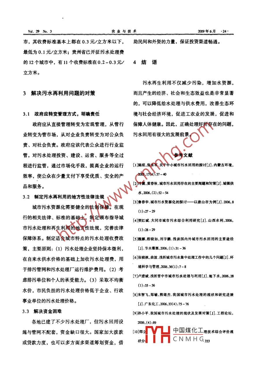 第29卷第3期農(nóng)業(yè)與技術(shù)Val.29 No. 32009年6月Agiculure&TechndlogyJun. 2009__ .22...城市污水回用的探討國洪琴徐敏鐘卓趙志勇(遼寧省水文水資源勘測禺本溪分局,遼寧本溪17000[摘要]城市污水易于處理,再生利用率高,效益顯著。文章綜述了國內(nèi)外污水回用的主要途徑以及存在的問題,最后提出了解決問題的對策。[關(guān)鍵詞]城市污水;再利用;處理中國分類號: X703文獻(xiàn)標(biāo)識碼: C水資源是經(jīng)濟(jì)社會可持續(xù)發(fā)展的重要戰(zhàn)略性行的途徑。本文將國內(nèi)外比較成熟的污水回用途資源和基礎(chǔ)性自然資源。隨著人口的增加,經(jīng)濟(jì)徑介紹如下。社會的發(fā)展,水資源的供需矛盾日漸突出。以本溪市為例,多年平均地表水資源量1國內(nèi)外污水回用的主要途徑32. .48億立方米,地下水資源量7.0億立方米,水資源總量32.56億立方米。但是,在加入人類系1.1 用于農(nóng)業(yè)灌溉統(tǒng)后,情況就大不一樣。1985 年本溪市水資源總一般經(jīng)二級處理的城市污水出水水質(zhì)都能滿量31.95億立方米,人口142.3萬,人均水資源足農(nóng)業(yè)灌溉用水標(biāo)準(zhǔn)。在國內(nèi)許多城市,用于此量2245立方米; 2000年, 本溪市人口157.1 萬項的水量占總處理量的比重較大。污水回用于農(nóng)人,人均水資源量2073立方米。從以上數(shù)據(jù)可以田灌溉,對水質(zhì)要求也不高,而且還可給土壤提看出,相對于某-地區(qū)而言,多年平均水資源總供肥份,減少化肥用量,是- -種符合可持續(xù)發(fā)展量是一個定數(shù),但人均水資源量是逐年減少的,已經(jīng)嚴(yán)重制約了經(jīng)濟(jì)社會的發(fā)展,因此,多途徑的回用方式。1.2 用于工業(yè)生產(chǎn)開發(fā)水資源利用的方式方法迫在眉捷。隨著社會的進(jìn)- - 步城市化,城市污水的排放城市污水用于工業(yè)生產(chǎn)用水的最大好處在于量會越來越大。城市污水主要包括工業(yè)污水和生可以代替飲用水,因為在很多情況下,工業(yè)用水.活污水。目前,城市污水的處理方法是經(jīng)過污水對水質(zhì)的要求遠(yuǎn)低于飲用水標(biāo)準(zhǔn)。因此,城市污處理廠處理直接排入江河。以本溪市為例,現(xiàn)有水回收對于工業(yè)企業(yè)和市政當(dāng)局都有很大的益處。2座城市污水處理廠,每天處理污水35萬立方目前,隨著社會的快速發(fā)展,工業(yè)相對于其他行米。每年處理污水12775 萬立方米。如何利用城業(yè)來說中國煤化工生水回用于工市污水,增大水資源可利用量,緩解日益突出的業(yè)生產(chǎn):MCHCNMH' G業(yè)生產(chǎn)用水和水資源供需矛盾,城市污水回用是一種性價比可工業(yè)冷 卻水而言。農(nóng)業(yè)與技術(shù)Val.29 No. 3_1.3 用于景觀用水管網(wǎng)建設(shè)滯后,多數(shù)地區(qū)雨污不分,使污水處理目前,隨著水資源的缺乏和水污染的日益嚴(yán)廠系統(tǒng)的整體效率低下。重,各城市越來越多地將城市污水凈化回用于娛2.2法規(guī)和配衰 政策不完善樂景觀用水。目前我國污水管理的法規(guī)不完善,政策不健.4 用于回灌地下水全。對欠費(fèi)和拒繳污水處理費(fèi)的用戶以及經(jīng)營困城市污水地下回灌深度處理方法-般為傳統(tǒng)難、無力交費(fèi)的企業(yè)尚無有效的制約和懲罰措施。的污水處理方法,廢水處理的程度則取決于回灌城市污水再生利用需要健全的法制保障和全面的的水量與水質(zhì)、地下水盆地和天然地下水稀釋的統(tǒng)- -管理,而我國城市污水再生利用的法規(guī)和政可能性、土壤類型、地下水深度、回灌方式、使策還需要完善。在城市污水再生利用工程的可行用前在含水層中的停留時間等。性研究、立項、設(shè)計、建成和改造中,要建立相.5 用于城市生活用水應(yīng)的規(guī)范和再生水水質(zhì)標(biāo)準(zhǔn),改革管理體制和服目前城市生活用水已占城市用水量的50%左務(wù)體系,在衛(wèi)生安全、生產(chǎn)過程、產(chǎn)品質(zhì)量等方右,隨著城市的發(fā)展還將進(jìn)一步增加。目前全國面,保障每-一個再生水使用單位享有免受不良影人均生活用水量為212L/d (其中城市為228L/d)。響的基本權(quán)益。在城市用水中,只有2/3的水直接或間接用于飲.2.3 融資困難用,其他1/3的用途都可以由再生水代替。經(jīng)二在我國列入計劃的建設(shè)項目,其資金來源由級處理的城市污水,再經(jīng)過深度處理,即可回用。中央政府補(bǔ)助資金、地方政府自籌資金和國內(nèi)外1.6 用于市政雜用銀行貸款幾方面構(gòu)成。雖然中央政府逐年擴(kuò)大污城市污水經(jīng)二級處理后,可以用于道路沖刷、水處理的建設(shè)計劃,也不斷增加了中央補(bǔ)助資金澆酒綠地、沖洗車輛、建筑施工降塵用水等。的投入,但是,即使在經(jīng)濟(jì)較發(fā)達(dá)的地區(qū),地方政府自籌資金和申請銀行貸款也有相當(dāng)?shù)睦щy。2污水再利 用存在的問題總的來說,如何有效融資現(xiàn)在基本還處在摸索階段。相對于其它市政公用行業(yè),污水處理及回用現(xiàn)在國內(nèi)外意識到污水回用的好處也采取了工程由于投資大、歷史包袱重等原因利潤空間低,一些途徑再利用污水,取得了一些成績,但是污融資較困難。水的再利用還存在著一些不足。2.4污水處理費(fèi)開征標(biāo)準(zhǔn)低2.1污水處理廠 運(yùn)行狀況不理想截至2005