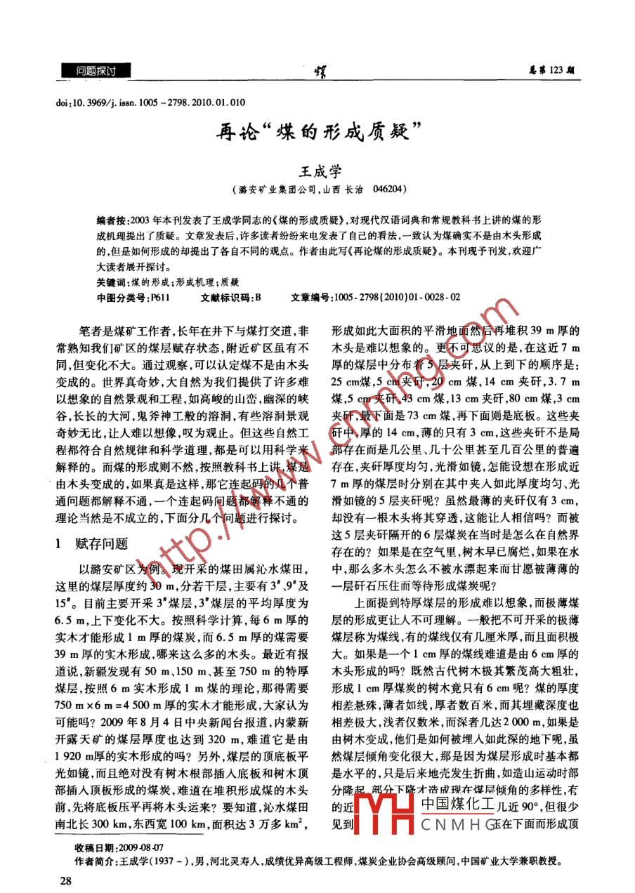 問題探討蝶總第123期doi:10. 3969/j. isn.1005 - 2798.2010.01. 010再論“煤的形成質疑”王成學(潞安礦業(yè)集團公司,山西長治046204)編者按:2003年本刊發(fā)表了王成學同志的《煤的形成質疑》,對現(xiàn)代漢語詞典和常規(guī)教科書上講的煤的形成機理提出了質疑。文章發(fā)表后,許多讀者紛紛來電發(fā)表了自己的看法,一致認為煤確實不是由木頭形成的,但是如何形成的卻提出了各自不同的觀點。作者由此寫《再論煤的形成質疑》。本刊現(xiàn)予刊發(fā),歡迎廣大讀者展開探討。關鍵詞:煤的形成;形成機理;質疑中圖分類號:P611文獻標識碼:B文章編號:1005- 2798(2010)01 - 0028-02筆者是煤礦工作者,長年在井下與煤打交道,非形成如此大面積的平滑地面然后再堆積39m厚的常熟知我們礦區(qū)的煤層賦存狀態(tài),附近礦區(qū)雖有不木頭是難以想象的。更不可思議的是,在這近7 m同,但變化不大。通過觀察,可以認定煤不是由木頭厚的煤層中分布著5層夾矸,從上到下的順序是:變成的。世界真奇妙,大自然為我們提供了許多難25 cm煤,5 cm夾矸, 20 cm煤,14 cm夾矸,3.7 m以想象的自然景觀和工程,如高峻的山巒,幽深的峽煤,5 cm夾矸,43 cm煤,13 cm夾矸,80 cm煤,3 cm谷,長長的大河,鬼斧神工般的溶洞,有些溶洞景觀夾矸,最下面是73 cm煤,再下面則是底板。這些夾奇妙無比,讓人難以想像,嘆為觀止。但這些自然工矸中,厚的14 cm,薄的只有3 cm,這些夾矸不是局程都符合自然規(guī)律和科學道理,都是可以用科學來部存在而是幾公里、幾十公里甚至幾百公里的普遍解釋的。而煤的形成則不然,按照教科書上講,煤是存在,夾矸厚度均勻,光滑如鏡,怎能設想在形成近由木頭變成的,如果真是這樣,那它連起碼的幾個普7 m厚的煤層時分別在其中夾人如此厚度均勻、光通問題都解釋不通,一個連起碼問題都解釋不通的滑如鏡的5層夾矸呢?雖然最薄的夾矸僅有3 cm,理論當然是不成立的,下面分幾個問題進行探討。卻沒有一根木頭將其穿透,這能讓人相信嗎?而被這5層夾矸隔開的6層煤炭在當時是怎么在自然界1賦存問題存在的?如果是在空氣里,樹木早已腐爛,如果在水以潞安礦區(qū)為例?,F(xiàn)開采的煤田屬沁水煤田,中,那么多木頭怎么不被水漂起來而甘愿被薄薄的這里的煤層厚度約30 m,分若千層,主要有3".9"及一層矸石壓住而等待形成煤炭呢?15"。目前主要開采3*煤層,3*煤層的平均厚度為上面提到特厚煤層的形成難以想象,而極薄煤6.5 m,上下變化不大。按照科學計算,每6 m厚的層的形成更讓人不可理解。一般把不可開采的極薄實木才能形成1 m厚的煤炭,而6.5 m厚的煤需要煤層稱為煤線,有的煤線僅有幾厘米厚,而且面積極39m厚的實木形成,哪來這么多的木頭。最近有報大。如果是- -個1 cm厚的煤線難道是由6 cm厚的道說,新疆發(fā)現(xiàn)有50 m.150 m、甚至750 m的特厚木頭形成的嗎?既然古代樹木極其繁茂高大粗壯,煤層,按照6 m實木形成1 m煤的理論,那得需要形成1 cm厚煤炭的樹木竟只有6 cm呢?煤的厚度750mx6m=4500m厚的實木才能形成,大家認為相差懸殊,薄者如線,厚者數(shù)百米,而其埋藏深度也可能嗎? 2009年8月4日中央新聞臺報道,內蒙新相差極大,淺者僅數(shù)米,而深者幾達2000 m,如果是開露天礦的煤層厚度也達到320 m,難道它是由由樹木變成,他們是如何被埋人如此深的地下呢,雖1920m厚的實木形成的嗎?另外,煤層的頂?shù)装迤饺幻簩觾A角變化很大,那是因為煤層形成時基本都光如鏡,而且絕對沒有樹木根部插入底板和樹木頂是水平的,只是后來地殼發(fā)生折曲,如造山運動時部部插人頂板形成的煤炭,難道在堆積形成煤的木頭分隆起部分下降才浩成現(xiàn)在煤層傾角的多樣性,有前,先將底板壓平再將木頭運來?要知道,沁水煤田的近中國煤化工幾近90° ,但很少南北長300 km,東西寬100 km,面積達3萬多km2,見到YHCNMHG在下面而形成頂收稿日期:2009-08 07作者簡介:王成學( 1937 -),男,河北靈壽人,成績優(yōu)異高級工程師,煤炭企業(yè)協(xié)會高級顧問,中國礦業(yè)大學兼職教授。282010年1用王成學:再論“煤的形成質疑”第19卷第1期底板倒翻的現(xiàn)象,更何況將其翻在近2000 m的地下樹木確實變成了煤,這也足以證明煤是木頭變成的。呢。這足以說明在煤層形成之后在上面又逐漸形成實則不然,凡是煤中存在的上述情況巖石中都存在,了新的巖石層,煤層僅是地表形成時其中的--層而既有木化石,也有動植物化石,甚至更多。你決不可已。能說見過木頭變成了石頭就以為石頭是木頭變成的。其實,木頭插在煤中就變成煤,插在巖石中就變2儲量問題成巖石,而且同樣的木頭插在不同的巖石中就可以教科書上講,煤是由木頭形成的,石油是動物遺變成不同的巖石,全國各地的硅化木千奇百怪,各式體形成的,似乎都是因為它們可燃。而可燃的東西各樣就足以證明。有的晶瑩剔透如玉,大多粗糙如大多由碳、氫、氧組成,而動植物的主要成分是碳氫泥巖片石,所以說,在特定情況下木頭可以變成哪種氧,所以就推斷可燃的煤及石油都是由動植物形成。東西,就認定哪種東西,- -定是木頭變成的是多么不而地球.上發(fā)現(xiàn)的可燃物很多,如天然氣、可燃冰、油可信。母頁巖等,難道它們也是由動植物形成的嗎?據(jù)說,那煤到底是怎么形成的呢?筆者總感到,它與可燃冰的儲量是煤及石油儲量的2倍還多,難道它其他巖石形成機理一樣。在宇宙大爆炸后,宇