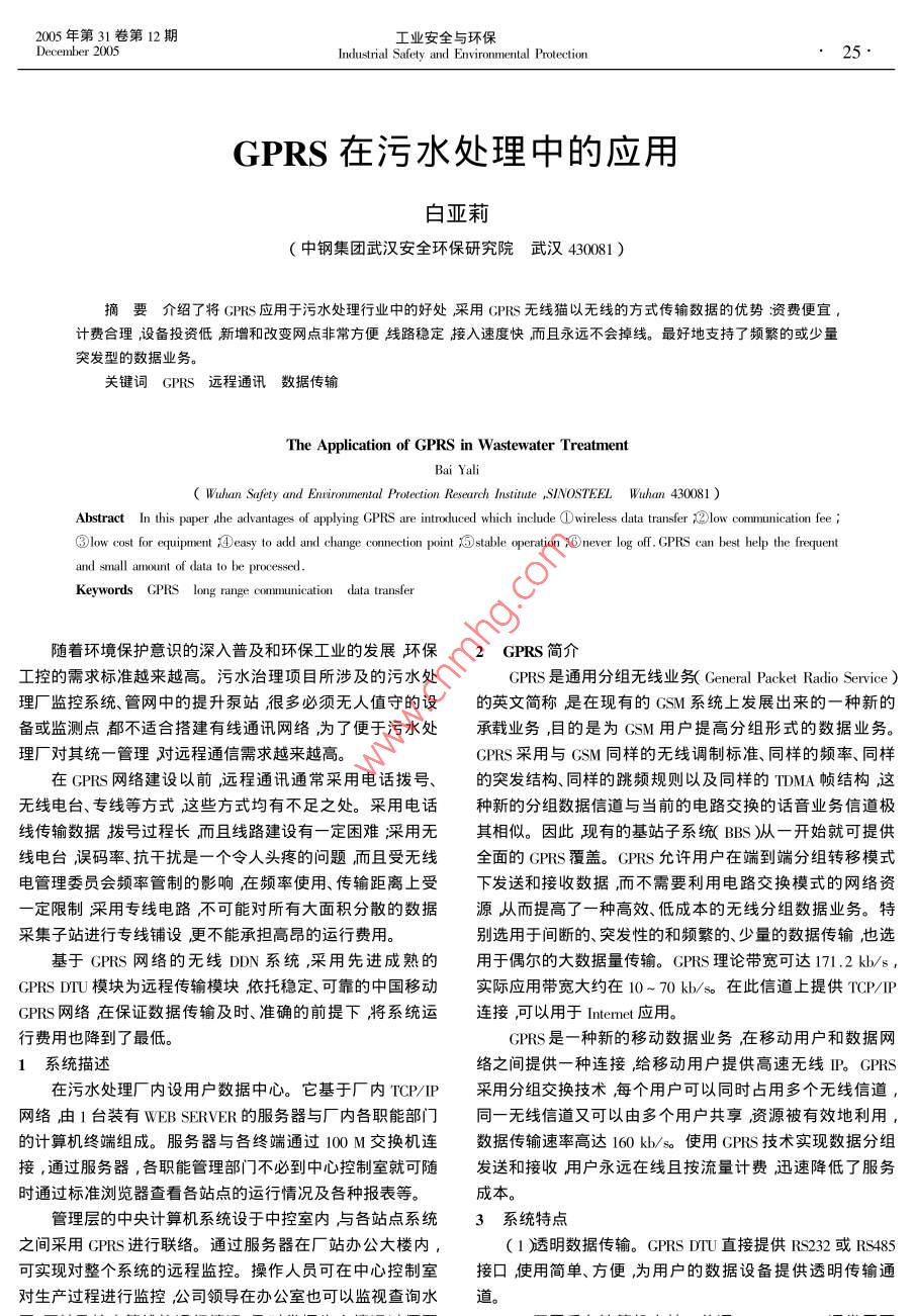 2005年第31卷第12期工業(yè)安全與環(huán)保December 2005Industrial Safety and Environmental Protection25●GPRS在污水處理中的應(yīng)用白亞莉(中鋼集團(tuán)武漢安全環(huán)保研究院武漢 430081 )摘要介紹了將GPRS應(yīng)用于污水處理行業(yè)中的好處采用CPRS無線貓以無線的方式傳輸數(shù)據(jù)的優(yōu)勢(shì)資費(fèi)便宜,計(jì)費(fèi)合理,設(shè)備投資低新增和改變網(wǎng)點(diǎn)非常方便線路穩(wěn)定接入速度快,而且永遠(yuǎn)不會(huì)掉線。最好地支持了頻繁的或少量突發(fā)型的數(shù)據(jù)業(yè)務(wù)。關(guān)鍵詞GPRS 遠(yuǎn)程通訊數(shù)據(jù)傳輸The Application of GPRS in Wastewater TreatmentBai Yali( Wuhan Safety and Enironmenal Potecion Research Instinute ,SINOSTEEL Wuhan 430081 )Abstract In this paper ,the advantages of applying GPRS are intoduced which include ①wirelsss data transfer②)low communication fee ;③low cost for equipoment④easy to add and change cornection point :⑤stable operation⑥never log of. GPRS can best help the frequentand small anmount of data t0 be processed.Keywords GPRS long range conmunication data transfer隨著環(huán)境保護(hù)意識(shí)的深入普及和環(huán)保工業(yè)的發(fā)展環(huán)保2 GPRS 簡(jiǎn)介工控的需求標(biāo)準(zhǔn)越來越高。污水治理項(xiàng)目所涉及的污水處CPRS是通用分組無線業(yè)務(wù)( General Packet Radio Service )理廠監(jiān)控系統(tǒng)、管網(wǎng)中的提升泵站,很多必須無人值守的設(shè)的英文簡(jiǎn)稱是在現(xiàn)有的GSM系統(tǒng)上發(fā)展出來的--種新的備或監(jiān)測(cè)點(diǎn)都不適合搭建有線通訊網(wǎng)絡(luò),為了便于污水處承載業(yè)務(wù),目的是為GSM用戶提高分組形式的數(shù)據(jù)業(yè)務(wù)。理廠對(duì)其統(tǒng)一管理對(duì)遠(yuǎn)程通信需求越來越高。GPRS采用與GSM同樣的無線調(diào)制標(biāo)準(zhǔn)、同樣的頻率、同樣在GPRS網(wǎng)絡(luò)建設(shè)以前,遠(yuǎn)程通訊通常采用電話撥號(hào)、的突發(fā)結(jié)構(gòu)、同樣的跳頻規(guī)則以及同樣的TDMA幀結(jié)構(gòu),這無線電臺(tái)、專線等方式這些方式均有不足之處。采用電話種新的分組數(shù)據(jù)信道與當(dāng)前的電路交換的話音業(yè)務(wù)信道極線傳輸數(shù)據(jù)撥號(hào)過程長(zhǎng)而且線路建設(shè)有一定困難 ;采用無其相似。因此現(xiàn)有的基站子系統(tǒng)(BBS)從一開始就可提供線電臺(tái)誤碼率、抗干擾是一個(gè)令人頭疼的問題,而且受無線全面的GPRS覆蓋。CPRS允許用戶在端到端分組轉(zhuǎn)移模式電管理委員會(huì)頻率管制的影響,在 頻率使用、傳輸距離上受下發(fā)送和接收數(shù)據(jù),而不需要利用電路交換模式的網(wǎng)絡(luò)資一定限制采用專線電路不可能對(duì)所有大面積分散的數(shù)據(jù)源,從而提高了一種高效、低成本的無線分組數(shù)據(jù)業(yè)務(wù)。特采集子站進(jìn)行專線鋪設(shè)更不能承擔(dān)高昂的運(yùn)行費(fèi)用。別選用于間斷的、突發(fā)性的和頻繁的、少量的數(shù)據(jù)傳輸,也選基于GPRS網(wǎng)絡(luò)的無線DDN系統(tǒng),采用先進(jìn)成熟的用于偶爾的大數(shù)據(jù)量傳輸。GPRS 理論帶寬可達(dá)171.2 kb/s,GPRS DTU模塊為遠(yuǎn)程傳輸模塊依托穩(wěn)定、可靠的中國(guó)移動(dòng)實(shí)際應(yīng)用帶寬大約在10~ 70 kb/s。在此信道上提供TCP/IPGPRS網(wǎng)絡(luò)在保證數(shù)據(jù)傳輸及時(shí)、準(zhǔn)確的前提下將系統(tǒng)運(yùn)連接,可以用于Intemet應(yīng)用。行費(fèi)用也降到了最低。GPRS是--種新的移動(dòng)數(shù)據(jù)業(yè)務(wù),在移動(dòng)用戶和數(shù)據(jù)網(wǎng)1系統(tǒng)描述絡(luò)之間提供一種連接,給移動(dòng)用戶提供高速無線IP。GPRS在污水處理廠內(nèi)設(shè)用戶數(shù)據(jù)中心。它基于廠內(nèi)TCP/IP采用分組交換技術(shù)每個(gè)用戶可以同時(shí)占用多個(gè)無線信道網(wǎng)絡(luò)由1臺(tái)裝有WEB SERVER的服務(wù)器與廠內(nèi)各職能部門同一無線信道又可以由多個(gè)用戶共享資源被有效地利用的計(jì)算機(jī)終端組成。服務(wù)器與各終端通過100M交換機(jī)連數(shù)據(jù)傳輸速率高達(dá)160 kb/so使用GPRS技術(shù)實(shí)現(xiàn)數(shù)據(jù)分組接,通過服務(wù)器,各職能管理部門不必到中心控制室就可隨發(fā)送和接收用戶永遠(yuǎn)在線且按流量計(jì)費(fèi),迅速降低了服務(wù)時(shí)通過標(biāo)準(zhǔn)瀏覽器查看各站點(diǎn)的運(yùn)行情況及各種報(bào)表等。成本。管理層的中央計(jì)算機(jī)系統(tǒng)設(shè)于中控室內(nèi)與各站點(diǎn)系統(tǒng)3系統(tǒng)特點(diǎn)之間采用GPRS進(jìn)行聯(lián)絡(luò)。通過服務(wù)器在廠站辦公大樓內(nèi),( 1透明數(shù)據(jù)傳輸。GPRS DTU直接提供RS232或RS485可實(shí)現(xiàn)對(duì)整個(gè)系統(tǒng)的遠(yuǎn)程監(jiān)控。操作人員可在中心控制室接口使用簡(jiǎn)單、方便,為用戶的數(shù)據(jù)設(shè)備提供透明傳輸通對(duì)生產(chǎn)過程進(jìn)行監(jiān)控公司領(lǐng)導(dǎo)在辦公室也可以監(jiān)視查詢水道。26.發(fā)和協(xié)議轉(zhuǎn)移GPRSDTU內(nèi)置自動(dòng)網(wǎng)絡(luò)連接和協(xié)議處理模用。塊無需后臺(tái)計(jì)算機(jī)支持。(6)高速傳輸。GPRS 網(wǎng)絡(luò)的傳輸速度最快將達(dá)到表1幾種數(shù) 據(jù)采集常用通