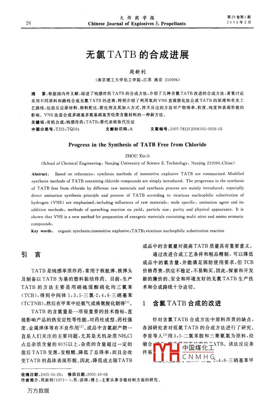 火炸藥學(xué)報第29卷第1期26Chinese Journal of Explosives & Propellants2006年2月無氯TATB的合成進(jìn)展周新利(南京理工大學(xué)化工學(xué)院,江蘇南京210094)摘要:根據(jù)國內(nèi)外文獻(xiàn),綜述了鈍感炸藥TATB的合成方法,介紹了幾種含氯TATB改進(jìn)的合成方法,著重討論采用不同原料和路線合成無氯TATB的進(jìn)展,特別介紹了利用氫的VNS直接胺化法合成TATB的原理和有關(guān)工藝路線,包括反應(yīng)原材料、物料配比、胺化劑及其加入方式、淬滅反應(yīng)的方法對產(chǎn)物得率、粒度、純度和表觀形貌的影響。VNS法是合成多硝基多氨基硝基芳烴類含能材料的-種新方法。關(guān)鍵詞:有機(jī)合成;鈍感炸藥;TATB;替代親核取代反應(yīng)中圖分類號:TJ55;TQ564文獻(xiàn)標(biāo)識碼:A文章編號:1007-7812(2006)01-0026-03Progress in the Synthesis of TATB Free from ChlorideZHOU Xin-li(School of Chemical Engineering, Nanjing University of Science & Technology, Nanjing 210094 ,China)Abstract: Based on references, synthesis methods of insensitive explosive TATB are summarized. Modifiedsynthesis methods of TATB containing chloride compounds are simply introduced. The progresses in the synthesisof TATB free from chloride by different raw materials and synthesis process are mainly introduced, especiallydirect amination synthesis principle and process of TATB according to vicarious . nucleophilie substitution ofhydrogen (VNS) are emphasized , including influences of raw materials, mole specific, amination agent and itsaddition methods, methods of quenching reaction on yield, particle size, purity and physical appearance. It isshown that VNS is a new method for preparation of energetic materials containing multi nitro and amino aromaticcompounds.Key words: organic synthesis ;insensitive explosive;TATB;vicarious nucleophilie substitution reaction成品中的含氯量對提高TATB質(zhì)量具有重要意義。引言通過改進(jìn)合成工藝條件和粗品精制,可以降低成品中的氯含量,并能滿足國防使用要求,但TCBTATB是鈍感單質(zhì)炸藥,常用于核航彈、核彈頭價格昂貴,供應(yīng)不穩(wěn)定,不易購買。因此,探索和開發(fā)及制備以TATB為基的塑料黏結(jié)炸藥。目前,生產(chǎn)新的廉價的、安全和環(huán)境友好的無氯TATB生產(chǎn)技TATB的方法主要是用硝硫混酸硝化均三氯苯術(shù)和合成路線十分迫切。(TCB),得到中間體1,3,5-三氣-2,4,6-三硝基苯(TCTNB) ,然后在甲苯中經(jīng)氨氣或液氨胺化制得”。1含氯TATB合成的改進(jìn)TATB的含氣量是一項很重要的技術(shù)指標(biāo),直接影響產(chǎn)品的熱安定性等性能,對藥柱成型、藥柱強(qiáng)針對含氯TATB合成方法中原料昂貴的缺點,度、金屬彈體等有不良作用°。成品中含氯副產(chǎn)物一各國研究者對低氯TATB的合成方法進(jìn)行了研究。直是人們關(guān)注的主要問題,尤其是無機(jī)雜質(zhì)NH,Cl李星等人”用3,5-二氯苯胺和三聚氰氯為原料,經(jīng)占總雜質(zhì)含量的80%以上,雜質(zhì)的含量超過一定的縮合ATB。該法反應(yīng)條中國煤化工值后TATB變黑,變粗糙、降低了總得率,而且會改件易變TATB的晶體表面形貌。因此,降低或去除TATBCHCNMHG,4,6-三硝基苯甲收稿日期:2005-04-26;修 回日期:2005-10-08作者簡介:周新利(1973-),男,講師,博士.主要從事含能材料方面的研究。第29卷第1期周新利:無氯TATB的合成進(jìn)展27醚、3,5-二氯苯甲醚為原料,在不同條件下制備高純環(huán)上引入碳親核試劑的一個非常好的方法[9]。在硝度、高得率的TATB。這些方法都是以含氯化合物合基芳烴化合物上引入含離去基團(tuán)的碳負(fù)離子,通過成TATB,產(chǎn)物中不可避免地含有各種含氯雜質(zhì)。脫去HX進(jìn)行重芳烴化得到含不同取代基的多硝基化合物。碳親核物質(zhì)的組成為CHXYR,X是離去基2無氯TATB的合成團(tuán)(X=Cl,Br ,OPh,SPh等),Y是碳負(fù)離子上的穩(wěn)定基團(tuán)(Y = SO2Ph, SOPH, CN, COOR等),R是2.1合成方 法簡介取代基(R=H,烷基,芳基等)[0。文獻(xiàn)用不同的碳為了克服TATB中的含氯雜質(zhì),尋求以無氯原親核試劑和含不同取代基的硝基化合物合成了眾多料替代TCB,國內(nèi)外的專家研究出了合成TATB的的硝基芳烴化合物。新路線。如:(1)間苯三酚經(jīng)硝化成三硝基間苯三酚,在研究碳負(fù)離子親核試劑進(jìn)行氫的VNS反應(yīng)然后氨化合成TATB;(2)3,5-二羧基硝基苯經(jīng)酯的基礎(chǔ)上,研究以氮負(fù)離子作為親核試劑進(jìn)行氫的化、氨化、重排合成3, 5-二氨基苯,再經(jīng)硝化、氨化,VNS反應(yīng),實現(xiàn)了硝基芳烴的直接胺化,促進(jìn)了以最終合成TATB;(3)TNT經(jīng)氧化、脫羧、還原、硝.TATB為代表的多硝基多氨基硝基芳烴(含雜環(huán)化化,最后氨化合成TATB;(4)間三甲苯經(jīng)硝化、氧合物)的VNS直接胺化合成,開辟了一條新的合成化、氨化,然后重排得TATB;(5)間三甲氧基苯經(jīng)路線。采用VNS方法合成TATB,可選擇的原料有磺化、硝化、氨化合成TATB.2,4,6-三硝基苯胺和間三硝基苯等,然后在常溫常南京理工大學(xué)的魏運洋[-0]以廉價的苯甲酸為壓下用胺化效果不同的胺化劑胺化2,4,6-三硝基苯原料經(jīng)硝化、Schmidt反應(yīng)硝化和胺化4步反應(yīng)合胺,可制得TATB.成TATB,采用氨氣作為胺化劑,在50 C強(qiáng)烈攪拌下R. D. Schmidt等[以把2,4,6-三硝基苯胺和胺化通人氨氣進(jìn)行胺化。該方法合理利用取代基的定位劑TMHI(1,1,1-三甲基肼的碘鹽)溶解于DMSO,.和活化效應(yīng),特別是中間體在
