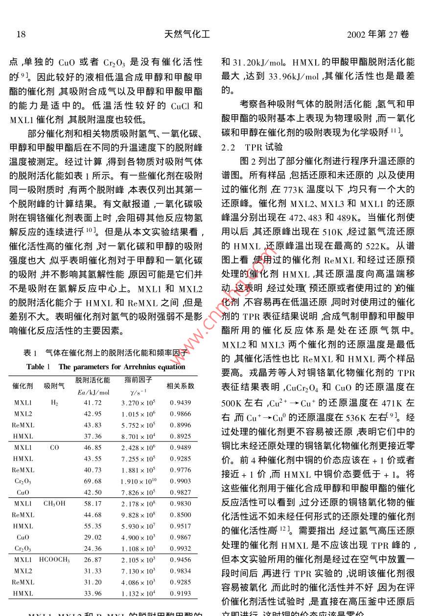 16天然氣化工2002年第27卷羰化氫解法低溫合成甲醇的研究IⅣ銅基催化劑的TPD和TPR研究陳文凱2楊迎春23劉興泉2羅仕忠2吳玉塘2于作龍2(1.福州大學(xué)化學(xué)系福州3500022.中國(guó)科學(xué)院成都有機(jī)化學(xué)研究所成都6100413.四川師范學(xué)院化學(xué)系南充637002)摘要采用程序升溫脫陳TPD汸法對(duì)液相合成甲醇和甲酸甲酯銅基催化劑吸附氫氣、一氧化碳、甲醇和甲酸甲酯后的脫附行為進(jìn)行了考察采用程序升溫還原TPR癘法對(duì)催化劑在氫氣氣氛中的還原行為進(jìn)行了考察。結(jié)果表明催化活性高的催化劑其氬氣的脫附溫度一般也較低。氫氣和一氧化碳的吸附強(qiáng)度對(duì)于合成反應(yīng)沒(méi)有顯著的影響。脫附活化能計(jì)算表明具有較小甲酸甲酯脫附活化能的催化劑其活性較高。使用過(guò)的和經(jīng)過(guò)還原的催化劑,TPR峰向高溫段移動(dòng)。銅的價(jià)態(tài)在+1價(jià)附近的催化劑活性較高。關(guān)鍵詞押醇銅基催化劑;TPD;TPR中圖分類號(hào)0643文獻(xiàn)標(biāo)識(shí)碼:A文章編號(hào)1001-92192002)2-16040前言溫下甲醇和甲酸甲酯以脈沖注射進(jìn)樣。進(jìn)樣15~20min后進(jìn)行程序升溫脫附試驗(yàn)。銅基催化劑具有價(jià)格低廉、應(yīng)用廣泛的特點(diǎn)TPR實(shí)驗(yàn)裝有催化劑的反應(yīng)管接入氣路系統(tǒng)對(duì)于氣相合成甲醇的Cu/ZnO/A2O3催化劑,許后用He在393K溫度下吹掃10min泠卻至室溫后多研究者對(duì)它的反應(yīng)機(jī)理進(jìn)行了比較詳細(xì)的研切換到還原氣其組成為:H28.41%;N291.58%究12。由于對(duì)液相合成甲醇的研究還剛剛開(kāi)并進(jìn)行脫氧處理。)然后進(jìn)行TPR實(shí)驗(yàn)吸附氣體的婚3在反應(yīng)機(jī)理等方面的研究還不是很多。因流速30ml/min升溫速度10K/min此本文對(duì)此類催化劑進(jìn)行了初步研究現(xiàn)報(bào)道部為考察氣體在催化劑表面上的吸附強(qiáng)度測(cè)分研究結(jié)果定了催化劑在不同升溫速度下的峰溫并計(jì)算了程序升溫還原TPR廂程序升溫脫畩TPD)它們的脫附活化能Ed和頻率因子7。是表征催化劑的常用方法。通過(guò)測(cè)試和表征,可以得到關(guān)于活性中心和吸附活化反應(yīng)的一些信2結(jié)果與討論2.1TPD試驗(yàn)1實(shí)驗(yàn)部分試驗(yàn)所得的TPD如圖1所示。在CO/TPD實(shí)驗(yàn)中,CuO和Cn2O3對(duì)于CO催化劑的制備見(jiàn)參考文獻(xiàn)45。實(shí)驗(yàn)在自制幾乎沒(méi)有吸附。Cu2O脫附出來(lái)的CO也很少活的TPR-TPD聯(lián)合裝置中進(jìn)行6性較差的HMXL和 ReMXL則可以大量吸附TPD實(shí)驗(yàn)裝有催化劑的反應(yīng)管接入氣路系CO。催化活性較好的催化劑的吸附量和脫附溫統(tǒng)后,先用He在423K溫度下吹掃20min冷卻度均居于中間。至室溫后切換到吸附氣進(jìn)行室溫吸附時(shí)間為在H2/TPD譜圖中,CuO和Cu2O對(duì)氫幾乎5min然后用He進(jìn)行程序升溫脫附,升溫速度沒(méi)有吸附作用Cr2O3有3個(gè)吸附中心其脫附峰10K/min。氣體流速30ml/min。進(jìn)行甲醇和甲分別在345、583和640K。CuCl的脫附溫度Tm1酸甲酯MF吸附后的程序升溫脫附試驗(yàn)時(shí)在室=34K,MXL1的Tm1=358K而且它們的峰面積也比較小。而對(duì)于還原的催化劑HMXI(還原采第2期陳文凱等蕷化氫解法低溫合成甲醇的研究過(guò)的催化劑 Re MXI,其第一個(gè)脫附峰則分別岀相對(duì)較大表明催化劑的活性與出現(xiàn)脫附峰的溫現(xiàn)在溫度較高的363K和364K同時(shí)其峰面積也度和強(qiáng)度有關(guān)。7003003504004505001-CuO 2-CuO 3-Cr O3 A-CuCI S-MXLI 1-Cu0 2-Cu0 3-Cr O3 A-MXLI6-HMXL #-ReMXL5- RemI為-HMXL-CuCl(a )Profiles of CO-TPD(b)Profiles of H2-TPDI-Cu20 2-CuCl 3-Cr O3 A -CuOI-Cu 2-Cr2O33-Cu20 A-ReMXL5-MXL1為- ReMI5-HMXL為-MXLI-CuCl(e )Profiles of CH: OH-TPDd )Profiles of MF-TPD圖1催化劑吸附氣體后的TPD圖Fig, I Patterns of TPD for copper-based catalysts在MeOH/TPD譜圖中,Cu2O的第一脫附峰活性是最好的8出現(xiàn)在366K,CuO對(duì)甲醇幾乎沒(méi)有吸附作用在MF/TPD試驗(yàn)中CuCl在339K出現(xiàn)一個(gè)Cr2O3的Tm=349K,ReMⅹL只有一個(gè)很大的脫較小的脫附峰,MXLl的脫附峰出現(xiàn)在溫度稍高附峰,Tm=370 K CuCI和 ReMI均有兩個(gè)吸附的368 K HMXL和 ReMXL的脫附峰則分別出現(xiàn)在更高的389K和400K天然氣化工2002年第27卷點(diǎn)單獨(dú)的CuO或者CrO3是沒(méi)有催化活性和31.20kJ/ mol. HMXL的甲酸甲酯脫附活化能的9因此較好的液相低溫合成甲醇和甲酸甲最大達(dá)到33.96kJ/mol,其催化活性也是最差酯的催化劑其吸附合成氣以及甲醇和甲酸甲酯的的能力是適中的。低溫活性較好的CuCl和考察各種吸附氣體的脫附活化能氫氣和甲MXLⅠ催化劑其脫附溫度也較低酸甲酯的吸附基本上表現(xiàn)為物理吸附而一氧化部分催化劑和相關(guān)物質(zhì)吸附氫氣、一氧化碳、碳和甲醇在催化劑的吸附表現(xiàn)為化學(xué)吸附1。甲醇和甲酸甲酯后在不同的升溫速度下的脫附峰2.2TPR試驗(yàn)溫度被測(cè)定。經(jīng)過(guò)計(jì)算得到各物質(zhì)對(duì)吸附氣體圖2列出了部分催化劑進(jìn)行程序升溫還原的的脫附活化能如表1所示。有一些催化劑在吸附譜圖。所有樣品包括還原和未還原的以及使用同一吸附質(zhì)時(shí)有兩個(gè)脫附峰本表僅列出其第一過(guò)的催化劑在773K溫度以下均只有一個(gè)大的個(gè)脫附峰的計(jì)算結(jié)果。有文獻(xiàn)報(bào)