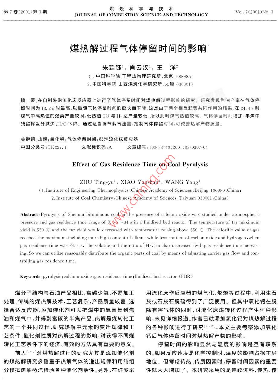 第7卷(2001)第3期燃燒科與技術(shù)JOURNAL OF COMBUSTION SCIENCE AND TECHNOLOGYVol.7(2001)No.3煤熱解過(guò)程氣體停留時(shí)間的影響朱廷鈺1,肖云漢,王洋(1.中國(guó)科學(xué)院工程熱物理研究所,北京100080;2.中國(guó)科學(xué)院山西煤炭化學(xué)研究所,太原030001)摘要:在自制鼓泡流化床反應(yīng)器上進(jìn)行了氣體停留時(shí)間對(duì)煤熱解過(guò)程影響的研究。研究發(fā)現(xiàn)焦油產(chǎn)率在氣體停留時(shí)間為18.2s時(shí)最高,以后隨氣體停留時(shí)間的延長(zhǎng)而下降。這是由于兩個(gè)相反趨勢(shì)共同作用的結(jié)果在24.4s時(shí)煤氣中高熱值的烴類(lèi)產(chǎn)量較鬧,低熱值CO與H總產(chǎn)量較低,所以此時(shí)煤氣熱值較高。氣體停留時(shí)間增加,半焦中殘留揮發(fā)分減少、HC下降。通過(guò)適當(dāng)調(diào)節(jié)載氣流量控制氣體停留時(shí)間,可改善熱解產(chǎn)物質(zhì)量。關(guān)鍵詞:熱解;氧化鈣;氣體停留時(shí)間;鼓泡流化床反應(yīng)器中圖分類(lèi)號(hào):TK227.1文獻(xiàn)標(biāo)識(shí)碼:A文章編號(hào):1006-8740(2001)03-0307-04Effect of Gas Residence Time on Coal PyrolysisZHU Ting-yu, XIAO Yun-han, WANG Yang(1. Institute of Engineering Thermophysics, Chinese Academy of Sciences, Beijing 100080, China2. Institute of Coal Chemistry, Chinese Academy of Sciences, Taiyuan 030001, China)Abstract Pyrolysis of Shenmu bituminous coal in the presence of calcium oxide was studied under atomosphericpressure and gas residence time range of 8.5 s34 s in a fluidized bed reactor. The temperature of tar maximumyield is 550 C and the tar yield would decreased with temperature raising above 550 C. The calorific value of gasreached the maximum, including more high content of alkane while less content of carbon oxide and hydrogen, whengas residence time was 24.4 s. The volatile and the ratio of H/C in char decreased iwth gas residence time increing. So we can utilize reasonably distribute the organic parts of coal by means of adjusting carrier gas flow and con-trolling gas residence timeKeywords pyrolysis calcium oxide; gas residence time fluidized bed reactor (FBR)煤分子結(jié)構(gòu)與石油產(chǎn)品相比,富碳少氬,不易加工用流化床作反應(yīng)器的煤氣化、燃燒等過(guò)程中,利用生石處理傳統(tǒng)的煤熱解技術(shù),工藝復(fù)雜,產(chǎn)品質(zhì)量較差。選灰或石灰石脫硫得到了廣泛使用。但其中氧化鈣在脫擇合適反應(yīng)器、添加催化劑可以把煤中的氫富集到焦除有害氣體的同時(shí),對(duì)流化床煤轉(zhuǎn)化過(guò)程產(chǎn)生何種影油和煤氣中,并得到富碳的半焦產(chǎn)品熱解是煤轉(zhuǎn)化工響,未見(jiàn)詳細(xì)報(bào)道作者已就添加氧化鈣對(duì)煤熱解過(guò)程藝的一個(gè)共同過(guò)程,研究熱解中元素的變遷規(guī)律和工的各種影響進(jìn)行了研究8-1,本文主要考察添加氧化藝條件、催化劑性質(zhì)對(duì)熱解過(guò)程的影響,對(duì)獲得不同煤鈣后氣體停留時(shí)間對(duì)煤熱解產(chǎn)物的影響轉(zhuǎn)化工藝條件下的經(jīng)濟(jì)、有效的方法具有重要的意義。停留時(shí)間的影響顯然與溫度的影響是互有聯(lián)系前人ˉ對(duì)煤熱解過(guò)程的研究尤其是添加催化劑的如果反應(yīng)速度是化學(xué)控制時(shí),溫度的影響占據(jù)主導(dǎo)的煤熱解研究多側(cè)重于熱解氣體的逸岀規(guī)律和用純組地位。但考慮傳熱、傳質(zhì)因素時(shí),停留時(shí)間因素的重要分模擬焦油蒸汽檢驗(yàn)眢種催化劑活性。另外,在許多采性就大大增加了。本硏究采用的是連續(xù)進(jìn)料,傳熱、傳308·燃燒科學(xué)與技術(shù)第7卷第3期質(zhì)良好的鼓泡流化床反應(yīng)器,實(shí)驗(yàn)內(nèi)容詳見(jiàn)文獻(xiàn)[11]。生了二次反應(yīng),生成了氣體焦油產(chǎn)率隨氣體停留時(shí)間的延長(zhǎng)先上升然后下降,于1.82s出現(xiàn)最大值,這與1實(shí)驗(yàn)結(jié)果與討論Schroeder的結(jié)果是一致的。這是由于減少氣體停留時(shí)間就相當(dāng)于增大流化氣速,一方面使焦油蒸汽停留1.1氣體停留時(shí)間對(duì)煤熱解產(chǎn)物產(chǎn)率的影響時(shí)間減少,降低了焦油的二次反應(yīng),使焦油產(chǎn)率有增大圖1~圖5是神木煤在.1MPa,750C,-50+的趨勢(shì)。另一方面由于增大流化氣速會(huì)減小焦油分壓75目粒徑、添加12%CaO條件下,停留時(shí)間對(duì)煤熱解有利于焦油分子從煤粒子表面擴(kuò)散到氧化鈣上發(fā)生二產(chǎn)物產(chǎn)率的影響次反應(yīng),使焦油產(chǎn)率有減小趨勢(shì)。二者共同作用的結(jié)果使焦油產(chǎn)率于18.2s出現(xiàn)了最大值。煤熱解中水產(chǎn)率隨停留時(shí)間延長(zhǎng)而下降的現(xiàn)象也證實(shí)水參與了煤熱解過(guò)程中的一些反應(yīng)CO+H,OSCO2+H和水煤氣等反應(yīng)。隨著氣體停留時(shí)間增加,氣態(tài)和液態(tài)總產(chǎn)率呈增長(zhǎng)趨勢(shì),18.2s后趨于恒定,可達(dá)41%左右;隨著氣體停留時(shí)間增加,半焦產(chǎn)率呈下降趨勢(shì)氣體停留時(shí)間/s1.2氣體停留時(shí)間對(duì)氣態(tài)產(chǎn)物產(chǎn)率的影響圖4、圖5分別表示各種氣態(tài)生成物與氣體停留圖1氣體停留時(shí)間對(duì)氣體產(chǎn)率的影時(shí)間的關(guān)系。如圖4所示,氣體停留時(shí)間延長(zhǎng),H2CH4,C2H產(chǎn)率明顯增加。這是由于延長(zhǎng)氣體停留時(shí)間,更有利于氧化鈣對(duì)煤初始熱解產(chǎn)物