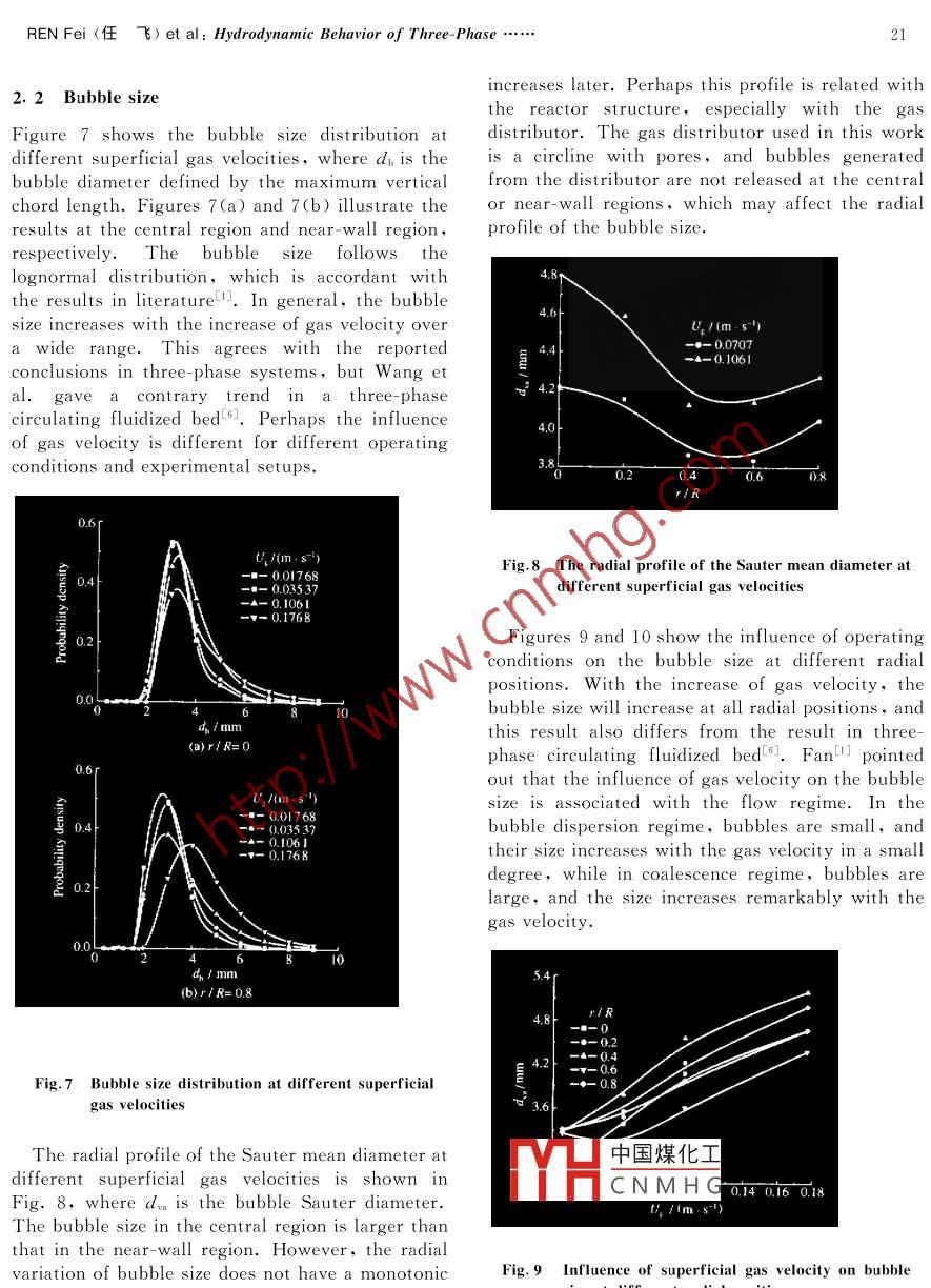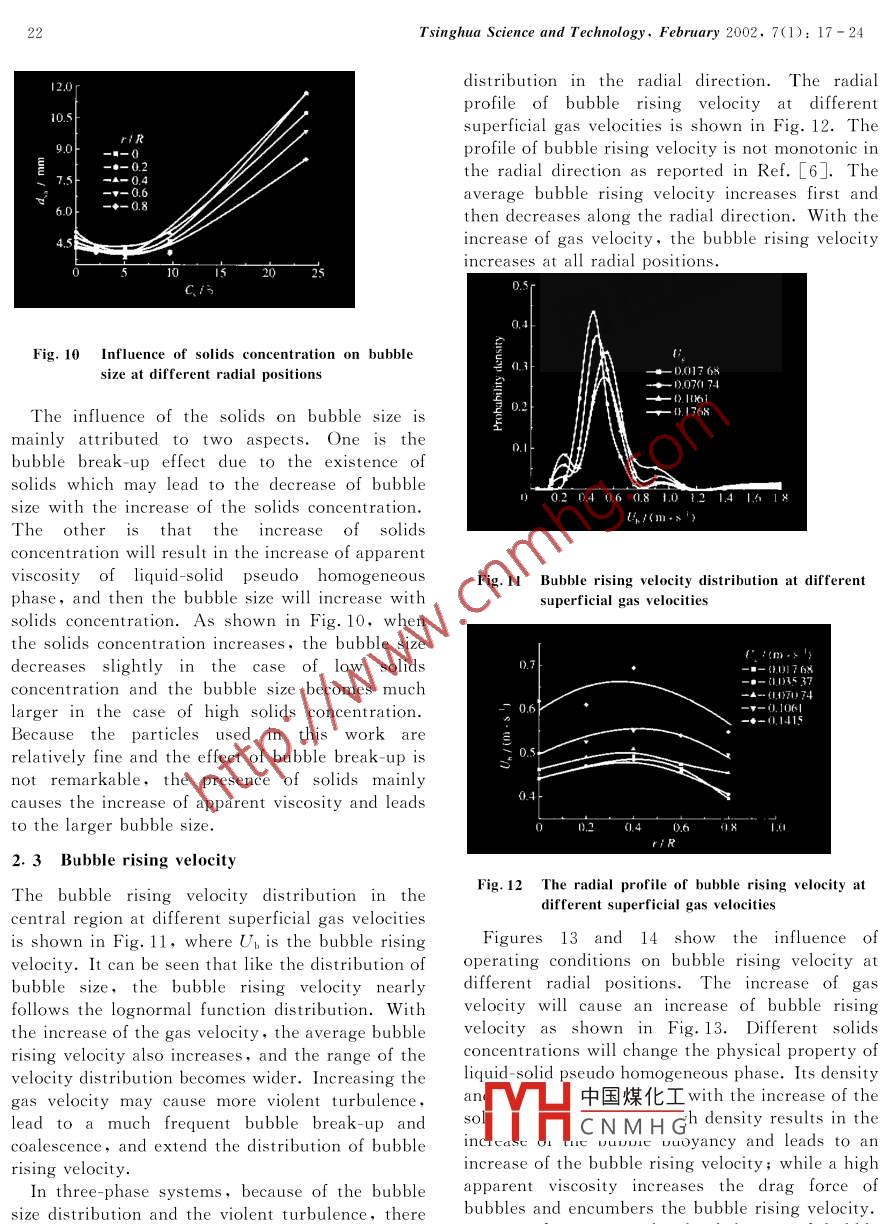 TSINGHUA SCIENCE AND TECHNOLOGYISSN 1007-0214 05/21pp17 - 24Volume 7,Number 1,F(xiàn)ebruary 2002Hydrodynamic Behavior of Three- Phase Airlift LoopSlurry ReactorRENFei (任飛), WANG Jinfu (王金福)*,WANG Tiefeng (王鐵峰),JIN Yong (金涌)Department of Chemical Engineering,Tsinghua University ,Beijing 100084, ChinaAbstract: A novel fiber optic probe system and a set of commercial ultrasonic Doppler velcimeters have beenused to study the hydrodynamic behavior of a three -phase airlift loop (TPAL ) slurry reactor. Experiments havebeen carried out in a loop reactor with 100 mm inner diameter and 2. 5 m height, in which air. tap water andsilica gel particles are used as the gas,liquid and solid phase,respectively. The radial profile of gas holdup ,bubble size, bubble rising velocity, liquid circulating velocity, and the influence of the main operatingconditions such as superficial gas velocity and solids concentration have been studied experimentally in theTP AL slurry reactor. The experimental results show that the bubble characteristics are different in various flowregimes and the radial profiles of some hydrodynamic parameters in the TPAL slurry reactor are more uniform .than those in traditional three phase reactors. The distribution of the bubble size and bubble rising velocity canbe described by a lognormal function. The influence of superficial gas velocity on the hydrodynamic parametersis more remarkable than that of the solids concentration.Key words: three phase airlift loop (TPAL) slurry reactor; hydrodynamics; optic fiber probe; ultr asonicDoppler velocimeterphases through both zones. The circulation resultsIntroductionin considerable mixing of all three phases, betterThree- phase slurry reactors have been widely usedmass transfer performance, even distribution ofin biological waste water treatment, fuel gassolids throughout the reactor, and efficientdesulphurization,Fischer-Tropsch synthesis ,suspension of solids in the liquid3].methanol synthesis, dimethyl ether production ,TPAL slurry reactors have many specificfermentation ( production of ethanol andadvantages including better interphase contact ,mammalian cells), and hydro-treatment of heavyreduced backmixing, larger processing capability,petroleum residues processes[1 -5 Ihighergasholdup,more uniform and finerCompared with conventional slurry bubblebubbles,and easier heat transfer into or out of thecolumns,the three-phase airlift loop ( TPAL )reactor.These features exhibit that the TPALreactor is a new type of reactor. The loop principleslurry reactor has wide potential applications.of TPAL slurry reactors is based on a driving forceA knowledge of the hydrodynamic behavior inwhich is caused by a density difference in twothe TPAL slurry reactor, such as gas holdup,different reactor zones, i.e.,a denser zone of thebu中國煤化工8 velocity, and liquidliquid-solid phase (downer) and a dilute zone oficularly important in thethe gas-liquid-solid phase ( riser ). This densityd:THC N M H Grs. Several researchers,difference induces circulation of the liquid and solidhave studied these hydrodynamic behaviors inthree- phase bubble column slurry reactors14.5,but the research on hydrodynamics of TPAL slurryReceived: 2001-04-02 ; revised: 2001-05- 31reactors,especially on the local hydrodynamic* To wpondence should be addressedbehavior, is scarce. Perhaps the reason is the lack18Tsinghua Science and Technology, February 2002,7(1): 17- 24of effective measuring methods to study these localliquid separation room. Gas enters the bottom ofparameters.the reactor via an annular gas distributor with 36Wang et al. [6.7] developed a novel fiber opticpores of 1. 2 mm in diameter. The experimentalprobe system for studying the bubble behavior inapparatus is operated at room temperature andgas-liquid -solid three- phase circulating fluidizedatmospheric pressure, using air, tap water and 52-beds (TPCFBs),and found that it could also beμm silica gel particles (density 1800 kg/cm*) as the .used for gas-liquid two- phase and gas-liquid-solidgas phase,liquid phasethree-phase systems. From the probe signal, werespectively.The gas superficialvelocity iscan get much useful information about the localmeasuredby a rotameter. The fiber optic probefluid parameters including gas holdup, bubbleconnected to the bed-wall is movable in the radialrising velocity, bubble size distribution, bubbledirection so that the bubble behavior in differentfrequency, and gas-liquid interfacial area.radialpositions can bemeasured,and theIn recent years, the ultrasound technique as an .ultrasonic probe is mounted on the bed wall at anintrusive measurement method has drawn muchangle to get the radial profile of the liquid velocityattention due to its attractive advantages compareddistribution.with conventionaltechniques[8-10].The mainadvantages include: (a) successful technique O1. 2 Fiber optic systemimage formation, (b ) applicability for opaqueThe novel fiber optic system, shown in Fig. 2,systems,and (c ) capability of measuring thewas developed by Wang et al. C6.7] for measuringspatiotemporal velocities. In this work,a set ofhe bubble behavior in multiphase flows. Thecommercial ultrasonic velocimeters DOP2000[8] wasprobe consists of two parallel optic-fibers withused to measure the liquid circulating velocity in a62.5 μm in diameter. The emitted light beam isTPAL slurry reactor.split through the splitter into two beams and then1 Experimentalsent into the fiber through the fiber coupler. Eachbeam is reflected at the end of the fiber. Theintensity of the reflected light when the probe tip1.1Experimental apparatusin the liquid is different from that when the probeThe experimental setup of the TPAL slurry reactortip in the bubble due to different refractions. Theused in this work is shown in Fig. 1. The wholepresence of particles in the system causes no signal↑Air ventresponse, which makes the probe systemapplicable to both gas-liquid-solid three- phase andSlury levelgas-