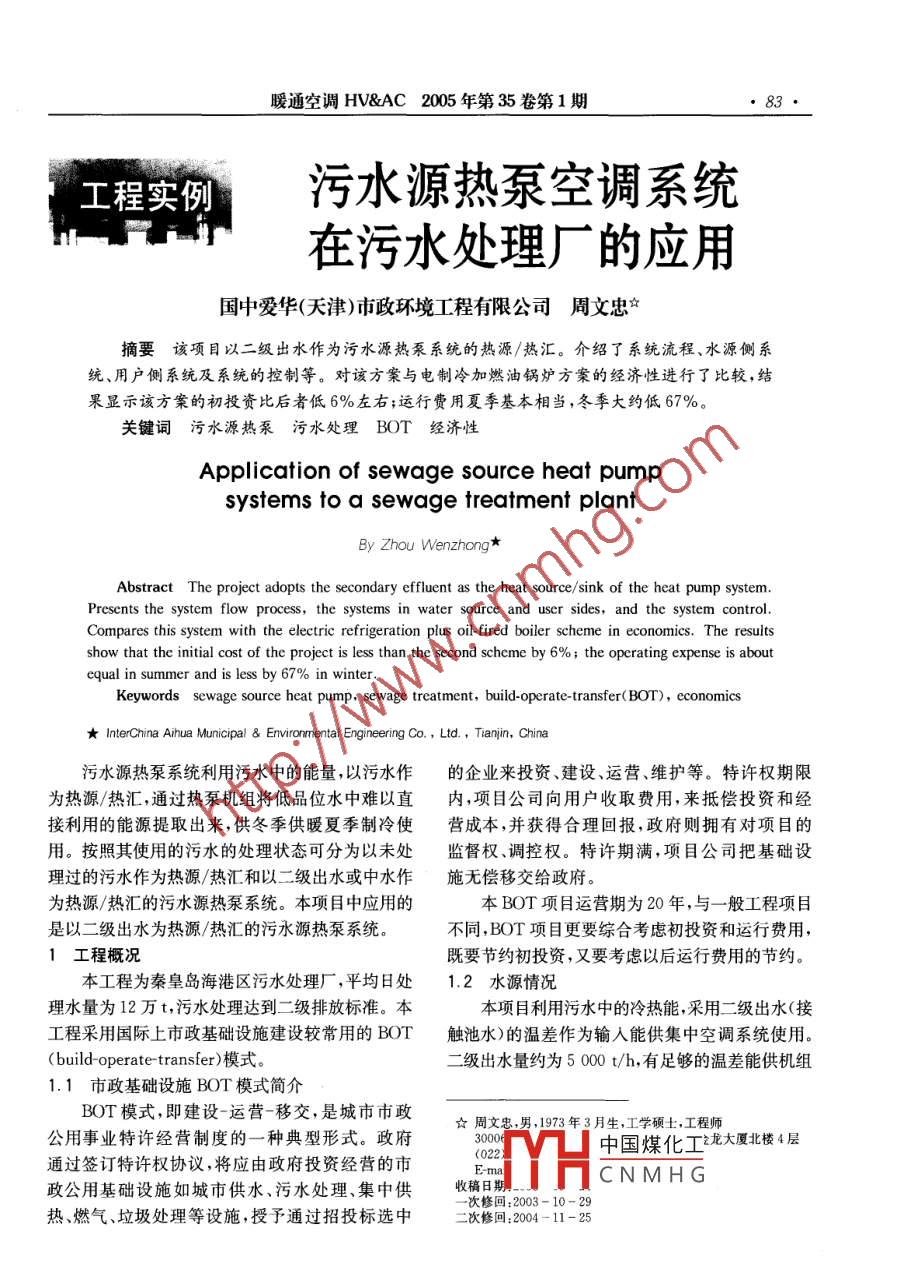 暖通空調(diào)HV&AC 2005 年第35卷第1期工程實(shí)例污水源熱泵空調(diào)系統(tǒng)在污水處理廠的應(yīng)用國中愛華(天津)市政環(huán)境工程有限公司周文忠*摘要該項(xiàng)目以二級出水作為污水源 熱泵系統(tǒng)的熱源/熱匯。介紹了系統(tǒng)流程、水源側(cè)系統(tǒng)、用戶側(cè)系統(tǒng)及系統(tǒng)的控制等。對該方案與電制冷加燃油鍋爐方案的經(jīng)濟(jì)性進(jìn)行了比較,結(jié)果顯示該方案的初投資比后者低6%左右;運(yùn)行費(fèi)用夏季基本相當(dāng),冬季大約低67%。關(guān)鍵詞污水源熱泵 污水處理BOT 經(jīng) 濟(jì)性Application of sewage source heat pumpsystems to a sewage treatment plantBy Zhou Wenzhong*Abstract The project adopts the secondary effluent as the heat source/ sink of the heat pump system.Presents the system flow process, the systems in water source and user sides, and the system control.Compares this system with the electric refrigeration plus oi-fired boiler scheme in economics. The resultsshow that the initial cost of the project is less than the second scheme by 6% ; the operating expense is aboutequal in summer and is less by 67% in winter.Keywords sewage source heat pump, sewage treatment, build-operate-transfer( BOT), economics★InterChina Aihua Municipal & Environmental Engineering Co.,Ltd. ,Tianjin, China污水源熱泵系統(tǒng)利用污水中的能量,以污水作的企業(yè)來投資、建設(shè)、運(yùn)營維護(hù)等。特許權(quán)期限為熱源/熱匯,通過熱泵機(jī)組將低品位水中難以直內(nèi),項(xiàng)目公司向用戶收取費(fèi)用,來抵償投資和經(jīng)接利用的能源提取出來,供冬季供暖夏季制冷使?fàn)I成本,并獲得合理回報(bào),政府則擁有對項(xiàng)目的用。按照其使用的污水的處理狀態(tài)可分為以未處監(jiān)督權(quán)、調(diào)控權(quán)。特許期滿,項(xiàng)目公司把基礎(chǔ)設(shè)理過的污水作為熱源/熱匯和以二級出水或中水作施無償移交給政府。為熱源/熱匯的污水源熱泵系統(tǒng)。本項(xiàng)目中應(yīng)用的本BOT項(xiàng)目運(yùn)營期為20年,與- -般工程項(xiàng)目是以二級出水為熱源/熱匯的污水源熱泵系統(tǒng)。不同,BOT項(xiàng)目更要綜合考慮初投資和運(yùn)行費(fèi)用, .1工程概況既要節(jié)約初投資,又要考慮以后運(yùn)行費(fèi)用的節(jié)約。本工程為秦皇島海港區(qū)污水處理廠,平均日處1.2水源情況理水量為12萬t,污水處理達(dá)到二級排放標(biāo)準(zhǔn)。本本項(xiàng)目利用污水中的冷熱能,采用二級出水(接工程采用國際上市政基礎(chǔ)設(shè)施建設(shè)較常用的BOT觸池水)的溫差作為輸人能供集中空調(diào)系統(tǒng)使用。( build-operate transfer)模式。二級出水量約為5 000 t/h,有足夠的溫差能供機(jī)組1.1 市政基礎(chǔ)設(shè)施BOT模式簡介BOT模式,即建設(shè)-運(yùn)營-移交,是城市市政白周文忠,男,1973年3月生,工學(xué)碩士,工程師公用事業(yè)特許經(jīng)營制度的一種典型形式。政府3000中國煤化工龍大廈北樓4層通過簽訂特許權(quán)協(xié)議,將應(yīng)由政府投資經(jīng)營的市政公用基礎(chǔ)設(shè)施如城市供水、污水處理、集中供收稿日期一次修回:2003-10- 29.MHCNMHG熱燃?xì)?、垃圾處理等設(shè)施,授予通過招投標(biāo)選中二次修回:2004-11-25●84●工程實(shí)例暖通空調(diào)HV&AC 2005 年第35卷第1期提取利用。二級出水水質(zhì):懸浮物30 mg/L,5日生a)二級出水冬季溫度較低,再經(jīng)過一次換熱化耗氧量30 mg/L,鉻測定化學(xué)耗氧量60 mg/L,氨會使水溫進(jìn)一步降低,這樣就有可能不滿足水源熱氮25 mg/L,總磷1 mg/L,冬季水溫不低于10 C,泵機(jī)組的進(jìn)水溫度要求,而造成蒸發(fā)器凍結(jié);其他季節(jié)可達(dá)25 C左右。b)經(jīng)過對二級出水水質(zhì)的分析,二級出水經(jīng).1.3 冷/熱負(fù)荷過處理進(jìn)人板式換熱器是完全可以的。本工程中秦皇島地區(qū)集中供暖期152天,供暖期室外設(shè)在潛水泵的四周(抽水區(qū)域)加設(shè)40目的過濾框架計(jì)溫度---12C。廠內(nèi)建筑物面積總計(jì)3038.78m',網(wǎng),對懸浮物進(jìn)行第一-次過濾,在進(jìn)入機(jī)組前又進(jìn)供熱面積2 698. 42 m2 ,供冷面積1604. 23 m2。供行了60目過濾,這樣完全能保證機(jī)組不受懸浮物熱總負(fù)荷約為337.8 kW,供冷總負(fù)荷約為260. 6的影響,安全有效地運(yùn)行。kW,具體負(fù)荷分布見表1。供冷主要集中在廠前區(qū)2.1制冷 機(jī)組選型的生活辦公用房和生產(chǎn)區(qū)的部分值班操作室儀表配根據(jù)冷熱負(fù)荷及工程需要,本工程選用3臺半電間等有較高要求的地點(diǎn),采用風(fēng)機(jī)盤管系統(tǒng)。生封閉螺桿式水源熱泵機(jī)組,單臺額定制冷量為產(chǎn)性廠房車間只考慮散熱器供暖,供暖溫度按防凍141 kW,制熱量為161 kW,電機(jī)功率為30.1 kW。溫度(t=5 C)考慮。該機(jī)組采用高性能半封閉螺桿壓縮機(jī)和不銹鋼釬發(fā)1 污水處理廠冷熱負(fù)荷焊板式換熱器等優(yōu)化設(shè)計(jì),并采用模塊化設(shè)計(jì),機(jī)建筑面積供暖面積供冷面積熱負(fù)荷冷負(fù)荷組體積小,結(jié)構(gòu)緊湊,并可方便地增加容量。3臺/m?/m2/kW /kW綜合樓1085 1 0851085 173.9 175.6機(jī)組分為母機(jī)和子機(jī),它們既可聯(lián)動,又可獨(dú)立運(yùn)機(jī)械間、車395.28 112.3220轉(zhuǎn)。機(jī)組能夠?qū)崿F(xiàn)遠(yuǎn)程監(jiān)控,并具有多種保護(hù)措庫.