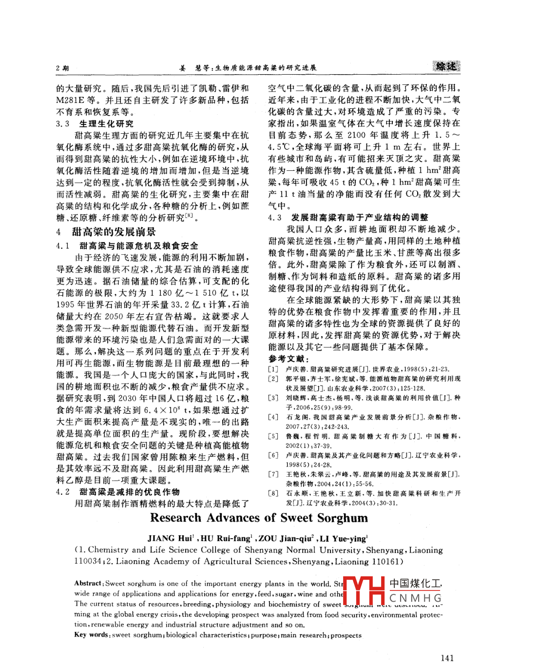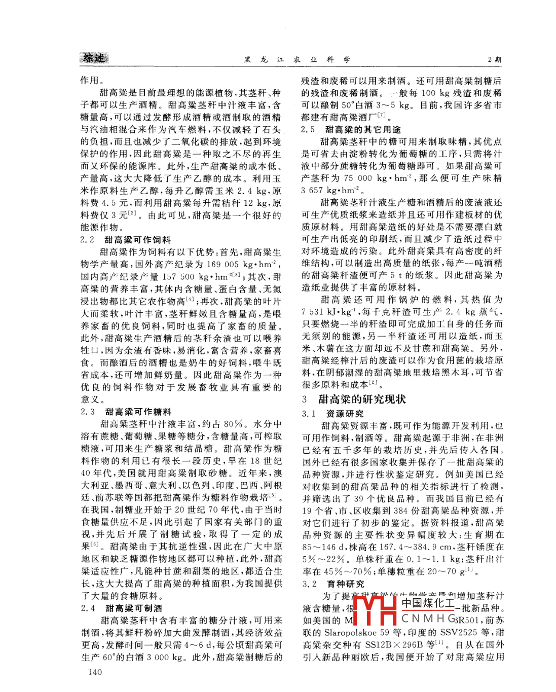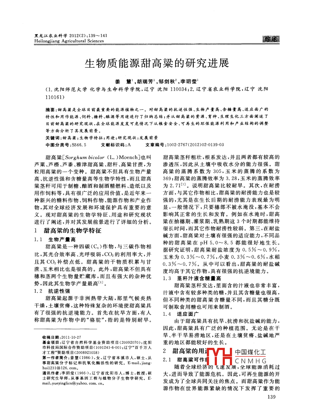 黑龍江農(nóng)業(yè)科學(xué)2012(2):139~141Heilongjiang Agricultural Sciences生物質(zhì)能源甜高粱的研究進(jìn)展姜慧,胡瑞芳',鄒劍秋2,李玥瑩(1.沈陽師范大學(xué)化學(xué)與生命科學(xué)學(xué)院,遼寧沈陽110034;2.遼寧省農(nóng)業(yè)科學(xué)院,遼寧沈陽110161)摘要:甜高梁是全球目前最重要的能源植物之一。對(duì)甜高粱的抗逆性強(qiáng)、生物產(chǎn)量高、含糖量高、適應(yīng)面廣的特性和用作能源、飼料、糖料、釀酒等用途進(jìn)行了歸納總結(jié);并從甜高梁的資源、育種、生理生化三方面闡述了目前甜高粱的研究現(xiàn)狀,在全球能源岌岌可危情況下從糧食安全、可再生的環(huán)保能源利用和產(chǎn)業(yè)結(jié)構(gòu)的調(diào)整等方面分析了其發(fā)展前景關(guān)鍵詞:甜高梁;生物學(xué)特征;用途;研究現(xiàn)狀;發(fā)展前景中圖分類號(hào):S566.5文獻(xiàn)標(biāo)識(shí)碼:A文章編號(hào):1002-2767(2012)02-013903甜高粱[ Sorghum bicolor(L.) Moench]也叫甜高粱莖稈粗壯,根系發(fā)達(dá),并且兩者都有較高的蘆粟、蘆檫、蘆黍、雅津甜高粱、甜稈、高粱甘蔗,為滲透壓,因此從土壤中吸收水分的能力很強(qiáng)。甜粒用高粱的一個(gè)變種。甜高粱不但具有生物產(chǎn)量高粱的蒸騰系數(shù)為305,玉米的蒸騰的系數(shù)為高、抗逆性強(qiáng)和含糖量高等生物學(xué)特性,而且甜高369;甜高粱的蒸騰效率為3.28,玉米的蒸騰效率粱莖稈可用于制糖、釀酒和制酒精燃料、造紙以及為2.7101。說明甜高粱比較耐旱。其次,在耐澇用作飼料等,具有很廣泛的應(yīng)用價(jià)值,是近年來一方面,與其它作物相比,甜高粱的耐澇能力也是較種新興的糖料作物、飼料作物、能源作物和產(chǎn)業(yè)作強(qiáng)的,尤其是在生長后期的耐澇能力表現(xiàn)最為明物,其對(duì)全球經(jīng)濟(jì)發(fā)展和環(huán)境保護(hù)具有重要的意顯,一般情況下,只要穗部不被水淹沒,基本不會(huì)義?,F(xiàn)對(duì)甜高粱的生物學(xué)特征、用途和研究現(xiàn)狀影響其正常的生長和發(fā)育。例如在水淹時(shí),甜高進(jìn)行了闡述,并對(duì)其發(fā)展前景進(jìn)行了詳細(xì)的分析。粱在抽穗期、灌漿期、乳熟期這3個(gè)時(shí)期都能維持甜高粱的生物學(xué)特征很長時(shí)間,而其它作物耐澇性較弱。第三,在耐鹽1.1生物產(chǎn)量高堿方面,甜高粱對(duì)土壤有很強(qiáng)的適應(yīng)能力,不同品種的甜高粱在pH5.0~8.5都能很好地生長甜高粱是一種四碳(C)作物,與三碳作物相據(jù)研究證明,甜高梁耐鹽濃度為0.5%~0.9%,比,其光合效率高光呼吸弱,CO2的利用率大,并玉米為0.3%~0.7%,小麥0.3%~0.6%,水稻且其CO2補(bǔ)償點(diǎn)低。甜高粱的干物質(zhì)積累與甘0.3%~0.7%。從中可以看出,甜高粱的耐鹽堿蔗、玉米相比也是很高的。此外,甜高粱不但具有度均高于其它作物,具有很強(qiáng)的抗逆境能力。穗和莖兩個(gè)生物量貯藏庫,而且有強(qiáng)大的雜種優(yōu)1.3莖稈汁液含糖量高勢(shì),因此其生物學(xué)產(chǎn)量最高(。甜高粱莖稈發(fā)達(dá),里面含的汁液也非常豐富,1.2抗逆性強(qiáng)汁液中含有較多種類的糖,并且其含糖量也很高,甜高粱起源于非洲熱帶大陸,那里氣候炎熱但不同種類的甜高粱含糖量不同,而且其糖分既干燥,土壤貧瘠,這種特殊復(fù)雜的環(huán)境使甜高粱具可制取食用糖也可用來制酒。有了很強(qiáng)的抗逆境能力。首先在抗旱方面,有人1.4適應(yīng)面廣稱甜高粱為作物中的“駱駝”,指的是特別耐旱。由于甜高粱具有抗旱、抗?jié)澈涂果}堿的能力,因此,甜高粱具有廣泛的種植范圍。無論是在干收稿日期:2011-10-2旱、半干旱易澇地區(qū),還是在土壤貧瘠、鹽堿地嚴(yán)基金項(xiàng)目:遼寧省自然科學(xué)基金資助項(xiàng)目(20092070);沈陽重的地區(qū)都能較好的生長。市科技局國際合作資助項(xiàng)目(1091241-6-00);遼寧“百千萬人才工程”資助項(xiàng)目(2008921058)2甜高粱的用V凵中國煤化工第一作者簡介:姜慧(198),女,江寧省本溪市人,碩士,從2.1甜高粱可作隼事甜高架分子標(biāo)記和抗氧化酶活性的研究。 E-mail: jiangCNMHGhu1231@126.cm。隨著全球經(jīng)濟(jì)的飛速發(fā)展,全球能源消耗過通訊作者:李玥瑩(1966),遼寧省沈陽市人,博土,教授,碩大,進(jìn)而導(dǎo)致了能源危機(jī)。因此,可再生能源的開土研究生導(dǎo)師,從事基因工程與植物分子生物學(xué)研究。E-mail:yueyinglicn@yahoo.com.cr發(fā)成為了全球共同關(guān)注的焦點(diǎn)。而甜高粱作為能源作物在世界能源緊缺的情況下發(fā)揮了重要的139綜述農(nóng)業(yè)科學(xué)作用。殘?jiān)蛷U稀可以用來制酒。還可用甜高粱制糖后甜高粱是目前最理想的能源植物,其莖稈、種的殘?jiān)蛷U稀制酒。一般每100kg殘?jiān)蛷U稀子都可以生產(chǎn)酒精。甜高粱莖稈中汁液豐富,含可以釀制50°白酒3~5kg。目前,我國許多省市糖量高,可以通過發(fā)酵形成酒精或酒制取的酒精都建有甜高粱酒廠t與汽油相混合來作為汽車燃料,不僅減輕了石頭2.5甜高粱的其它用途的負(fù)擔(dān),而且也減少了二氧化碳的排放,起到環(huán)境甜高粱莖稈中的糖可用來制取味精,其優(yōu)點(diǎn)保護(hù)的作用,因此甜高粱是一種取之不盡的再生是可省去由淀粉轉(zhuǎn)化為葡萄糖的工序,只需將汁而又環(huán)保的能源庫。此外,生產(chǎn)甜高粱的成本