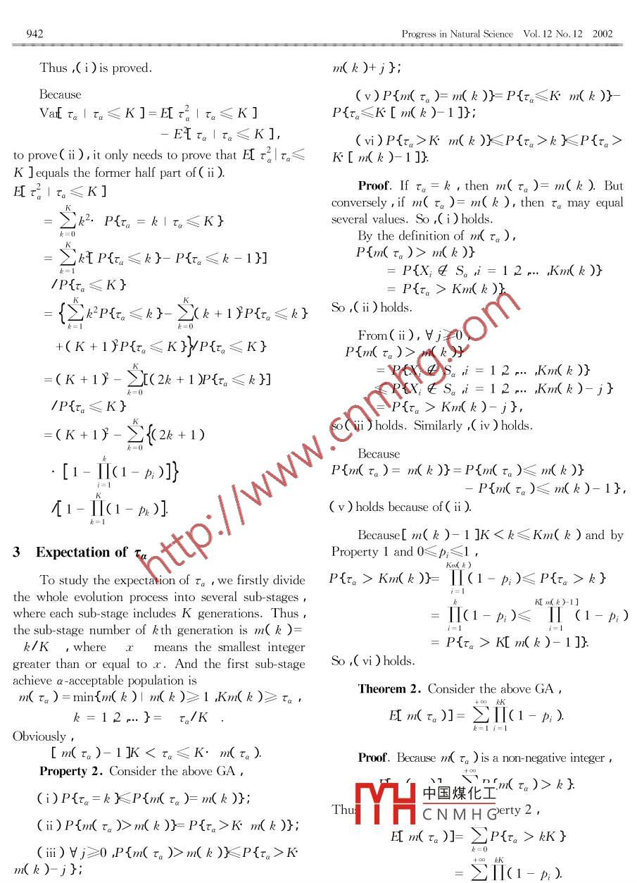 PROGRESS IN NATURAL SCIENCEVol. 12 ,No. 12 , December 2002Finite-time performance analysis for genetic algorithms'WANG Ling* and ZHENG Dazhong( Department of Automation , Tsinghua University , Bejing 100084 , China )Received May 17 ,2002 ;revised June 24 , 2002between evolution generation and the quality of the solution found best so far is analyzed. The estimating formulations of the expectationvalue as well as upper bound and lower bound for the evolution generation earliest achieving specific performance are provided.Keywords : genetic algorithm , finite-time performance , earliest achieving time.Performance analysis is one of the important the-space , in which 02 is the search space x∈∩is a so-oretical issues for genetic algorithms( GA{1~6] ,in-lution,f( x ) a bounded objective function andcluding convergence ability ,convergence rate , pa-|f(x )|<∞. Let X( k )be the population in the kthrameter selection and stopping criteria design and sogeneration ( suppose the population size is fixed ason. RudolpHt 21 used Markov chain theory to analyzen ),and let f( X( k ))= minf( x; ) be the objectivethe convergence property of canonical GA , and em-phasized the importance of elitism strategy for globalvalue of the population. The elitist GA studied in thisconvergence. Based on the eigenvalue analysis of thepaper can be described as follows , where" elitist'transition matrix , Suzukf 3] derived a lower bound formeans the best individual that will be reserved andsimple GA. He et al.L4) provided the convergencepassed to the next generation.conditions and convergence rate for generic GA. InStep 1 : Randomly generate initial population ,Ref. [ 1 ], Schmitt systematically reviewed the theoryof GAs. Guo et al.t51 presented a unified method toand evaluate all the individuals.Step 2 : Perform elitist selection.analyze the GAs' convergence. Although there areStep 3 : Repeat the following steps until themany results on convergence analysis , to our knowl-edge there is hardly any result on finite time perfor-stopping criterion is satisfied :( i ) perform elitist mu-mance analysis except for Aytug et al.' s study ontation and elitist crossover separately ,( ii ) evaluate allstopping criteria design of finite length GAL61 Withthe individuals ,( ii ) perform elitist selection.respect to the study on convergence ability with infi-Considering Step 3,essentially it performs anite time ,it is very important to analyze GAs' finite-time performance. In this paper , the finite-time per-probabilistic state transition in every generation ,soformance of elitist GA in finite search space is stud-Markov chain has been widely used to study the con-ied , and the relationship between the evolution gener-vergence of GA. In Ref.[4 ],it was pointed out thatation and the quality of the solution found best so farthe GA is convergent with probability 1 if all the ge-is analyzed. Finally , the estimating formulations ofnetic operators have elitist property and the global op-the expectation value as well as upper bound and low-timum is accessible from any initial population afterer bound for evolution generation earliest achievingfinite probabilistic transitions. Similar to Ref. [ 4 ],specific performance are provided.in this paper we suppose that the GA has such proper-1 Description of the elitist GA and some def-ties中國煤化工equirement on operatorsandinitionsMHCNMHG( onsider a mrnmuzation problem,a-acceptableConsider a minimization problem on finite searchpopulation space is defined as* Supported by the National Natural Science Foundation of China( Grant Nos.60074012 and 60174022 ) , and Basic Research Program of TsinghuaUrverivi,¥* To whotdence should be addressed. E-mail : wangling@ mail. tsinghua. edu. cnProgress in Natural Science Vol. 12 No.12 2002941S。= {X1X∈Q",f(X)≤a}(ii)P{r。= K}= μK a)II[1-Kk a)]Obviously ,if a=f*( best value), there must be op-k=1timal solution in the population of Sa. To considerthe finite- time performance , we define an event asProof. Property( i ) can be proved by the defini-Eq.( 1 ) that means GA can achieve a - acceptable pop-tionofτa.Then,letK=+∞,wecanget(i).ulation within K generations , and its complementaryFurthermore,by P{ta= K }= P{ra> K- 1 }-event is defined as Eq.( 2).P{tx>K }we can get( ii ).E(K ,a)={X; X2- Xk)| Xk∈Q”,Next, we will provide the expectation of Tak = 1.. ,K ,3kXk∈S.}, (1)when P{ra≤K }>0 ,K=1 2...E(K a)={X1 X2 r.. Xk)| Xk∈Q”,Theorem 1. Consider the above GA , given a >k=1..K,VkXptS。}(2)f* ,and P{ra≤K}>0 ,K=1 2... holds ,then :Due to the elitist property of theGA ,E(K ,a )(i)E[ra1 τa≤K]= KSE( K + 1 ,a ) obviously holds. And , the one step{1-I[1- Ki a)]}Ya -acceptable transition probability can be defined asEq.( 3 ), and the minimum generation to achieve a-acceptable population can be defined as Eq.(4 ).{1-T[1- (ke a)]},pK(Ka)=P{E(K,a)|E(K-1ra)}(i)Var[ ra1 τa≤K]=(K+ 1尸= P{(X1 ,Xz ..Xx)1Xpt S。,k =1. ,K-1 ;Xk∈S。}-之{(2k+1) [1- I[(1-p;)]}yk=0/P{E(K-1 ra )},(3)Ta=min{k≥1|X∈S。}(4 )[1-1[(1-px)]ETr。Iτ.≤K]Proof. For convenience ,denote μk ,a )= Pk.Obviously,the smaller Ta , the faster GA canachieve a -acceptable performance. In the next sec-By the definition of expectation and Property 1 ,tion , the relationship between p( K ,a ) and Ta willwe getbe discussed.E τ。| ra≤K]2 Conditional expectation of Ta and its rela-: 2k. P{ra = k |τa≤K}tionship with one step acceptable probability2k. P{r。= kYP{r?!躃}According to the definition of one step a -accept-able probability.1- p(K a)= P{E(K a)| E(K-1 a)}之k [i(1-p;)- 1(1-p,)]i=1= P{E( K a)}P{E( K- 1 ra )}.Thus,/[1-11(1-px)]P{E'(K a)YP{E(0a)}= [1- f(k a)]Because po=0 ,If GA' s initialization cannot get a -acceptable popula-Zk[i(1-p;)- 1(1-p;)]tion ,i.e. P{E(0 ra )}=0 , then= 1-1[(1- p;)+2H[(1- p;)P{E(K xa)}= 1-1[1- μ(k a)]We keep this supposition in this paper.2J[(1- p;)+..-KI[(1- p;)中國煤化工Property 1. Consider the above GA ,MHCN MHG)- kI[(1- p;)k=1 i=1(i)P{