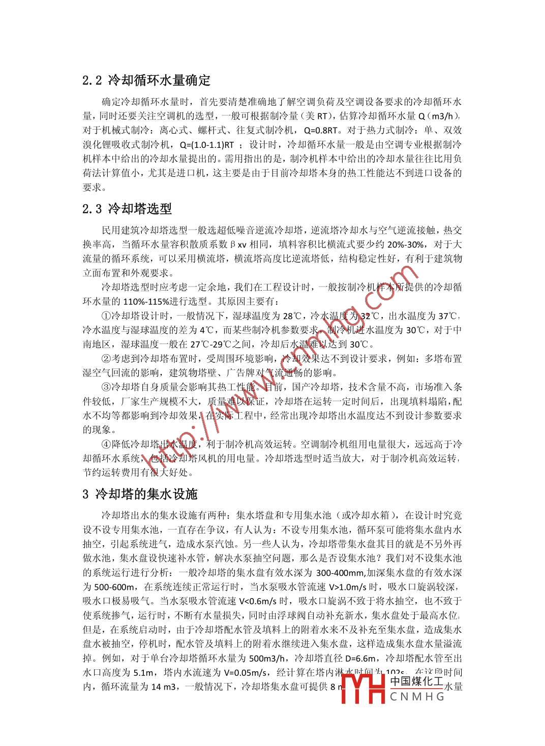 淺談民用建筑空調(diào)冷卻循環(huán)水系統(tǒng)設(shè)計(jì)霍忠文吉林鐵道勘察設(shè)計(jì)院有限公司吉林132001摘要:民用建筑空調(diào)冷卻循環(huán)水系統(tǒng)設(shè)計(jì)時(shí)具有- -些特點(diǎn),造成冷卻水溫度降不下來(lái),系統(tǒng)能耗大,運(yùn)轉(zhuǎn)操作不便等問(wèn)題。本文對(duì)冷卻循環(huán)水系統(tǒng)經(jīng)常出現(xiàn)的問(wèn)題,淺談自己的設(shè)計(jì)體會(huì),旨在引起大家的進(jìn)一步討論, 達(dá)到共同認(rèn)識(shí)共同提高的目的。關(guān)鍵詞:冷卻水系統(tǒng);循環(huán)水量;冷卻塔Abstract: Civil air conditioning cooling water circulation system design hassome characteristics, causing the temperature of the cooling water does notdrop down, the energy consumption of the system, and to maneuver operationproblems. Talking own design experience recurring problems in cooling watercirculation system, intended to cause all further discussion to reach a commonunderstanding of the purpose of jointly improve.Key words: cooling water system; circulating water; cooling tower中圖分類(lèi)號(hào): U664.81+4 文獻(xiàn)標(biāo)識(shí)碼: A文章編號(hào):1引言隨著城市建設(shè)的發(fā)展,生活水平的提高以及對(duì)舒適性的要求,越來(lái)越多的公共建筑、高級(jí)住宅設(shè)置了中央空調(diào)系統(tǒng),空調(diào)循環(huán)冷卻水系統(tǒng)成為建筑必不可少一部分 。多年運(yùn)轉(zhuǎn)實(shí)踐證明,民用建筑空調(diào)冷卻循環(huán)水系統(tǒng)相對(duì)于工業(yè)冷卻循環(huán)水系統(tǒng),設(shè)計(jì)具有一些特點(diǎn):循環(huán)水量較小,設(shè)備為定型產(chǎn)品,水質(zhì)要求較低,季節(jié)性運(yùn)轉(zhuǎn)等。加上民用建筑設(shè)計(jì)周期短,設(shè)計(jì)人員往往根據(jù)以往的經(jīng)驗(yàn),形成定式思維,對(duì)- -些具體的細(xì)節(jié)問(wèn)題,關(guān)注不夠,造成空調(diào)循環(huán)冷卻水系統(tǒng)運(yùn)行中出現(xiàn)諸如停機(jī)、停泵、噪聲大、振動(dòng)大、冷卻塔虧水或溢流、冷卻水系統(tǒng)水溫降不下來(lái),系統(tǒng)能耗過(guò)大,運(yùn)轉(zhuǎn)操作不便等問(wèn)題。造成整個(gè)空調(diào)系統(tǒng)不能正常工作,未能滿(mǎn)足建筑功能需求,對(duì)整個(gè)設(shè)計(jì)造成不良影響。分析產(chǎn)生上述現(xiàn)象的原因,除了施工、安裝、調(diào)試等原因外,還存在著設(shè)計(jì)上的缺陷。下面就結(jié)合循環(huán)冷卻水系統(tǒng)經(jīng)常出現(xiàn)的問(wèn)題,對(duì)影響循環(huán)冷卻水系統(tǒng)運(yùn)行的幾個(gè)主要因素作進(jìn)一步討論。2冷卻循環(huán)水系統(tǒng)設(shè)備的合理選型2.1設(shè)計(jì)基礎(chǔ)資料為保證冷卻塔的冷卻效果,必須注重氣象參數(shù)的收集,氣象 參數(shù)應(yīng)包括空氣干球溫度θ (°C), 空氣濕球溫度τ ("C), 大氣壓力P(104Pa),夏季主導(dǎo)風(fēng)向,風(fēng)速或風(fēng)壓,冬季最低氣溫等。根據(jù)《采暖通風(fēng)與空氣調(diào)節(jié)設(shè)計(jì)規(guī)范》和《建筑給水排水設(shè)計(jì)規(guī)范》,冷卻塔設(shè)計(jì)計(jì)算所選用的空氣干球溫度和濕球溫度,應(yīng)與所服務(wù)的空調(diào)等系統(tǒng)的設(shè)計(jì)空氣干球溫度和濕球溫度相吻合,應(yīng)采用歷年平均不保證50小時(shí)的干球溫度和濕球中國(guó)煤化工MHCNMHG2.2冷卻循環(huán)水量確定確定冷卻循環(huán)水量時(shí),首先要清楚準(zhǔn)確地了解空調(diào)負(fù)荷及空調(diào)設(shè)備要求的冷卻循環(huán)水量,同時(shí)還要關(guān)注空調(diào)機(jī)的選型,一般可 根據(jù)制冷量(美RT),估算冷卻循環(huán)水量Q (m3/h),對(duì)于機(jī)械式制冷:離心式、螺桿式、往復(fù)式制冷機(jī),Q=0.8RT。 對(duì)于熱力式制冷:單、雙效溴化鋰吸收式制冷機(jī),Q=(1.0-1.1)RT;設(shè)計(jì)時(shí),冷卻循環(huán)水量--般是由空調(diào)專(zhuān)業(yè)根據(jù)制冷機(jī)樣本中給出的冷卻水量提出的。需用指出的是,制冷機(jī)樣本中給出的冷卻水量往往比用負(fù)荷法計(jì)算值小,尤其是進(jìn)口機(jī),這主要是由于目前冷卻塔本身的熱工性能達(dá)不到進(jìn)口設(shè)備的要求。2.3冷卻塔選型民用建筑冷卻塔選型一般選超低噪音逆流冷卻塔,逆流塔冷卻水與空氣逆流接觸,熱交換率高,當(dāng)循環(huán)水量容積散質(zhì)系數(shù)β xv相同,填料容積比橫流式要少約20%-30%,對(duì)于大流量的循環(huán)系統(tǒng),可以采用橫流塔,橫流塔高度比逆流塔低,結(jié)構(gòu)穩(wěn)定性好,有利于建筑物立面布置和外觀(guān)要求。冷卻塔選型時(shí)應(yīng)考慮一定余地,我們?cè)诠こ淘O(shè)計(jì)時(shí),-般按制冷機(jī)樣本所提供的冷卻循環(huán)水量的110% 115%進(jìn)行選型。其原因主要有:①冷卻塔設(shè)計(jì)時(shí),一-般情況下,濕球溫度為28°C,冷水溫度為32°C,出水溫度為37°C,冷水溫度與濕球溫度的差為4C,而某些制冷機(jī)參數(shù)要求,制冷機(jī)進(jìn)水溫度為30°C,對(duì)于中南地區(qū),濕球溫度一般在27°C -29°C之間,冷卻后水溫難以達(dá)到30C。②考慮到冷卻塔布置時(shí),受周?chē)h(huán)境影響,冷卻效果達(dá)不到設(shè)計(jì)要求,例如:多塔布置濕空氣回流的影響,建筑物塔壁、廣告牌對(duì)氣流通暢的影響。③冷卻塔自身質(zhì)量會(huì)影響其熱工性能。目前,國(guó)產(chǎn)